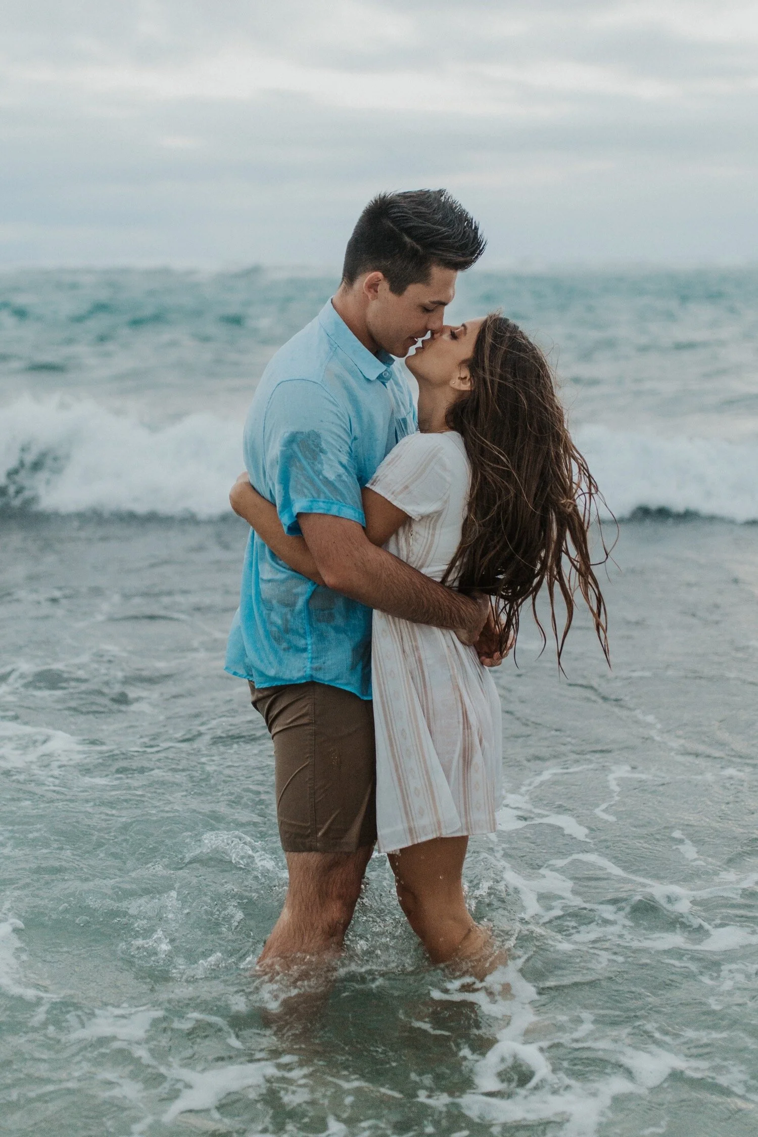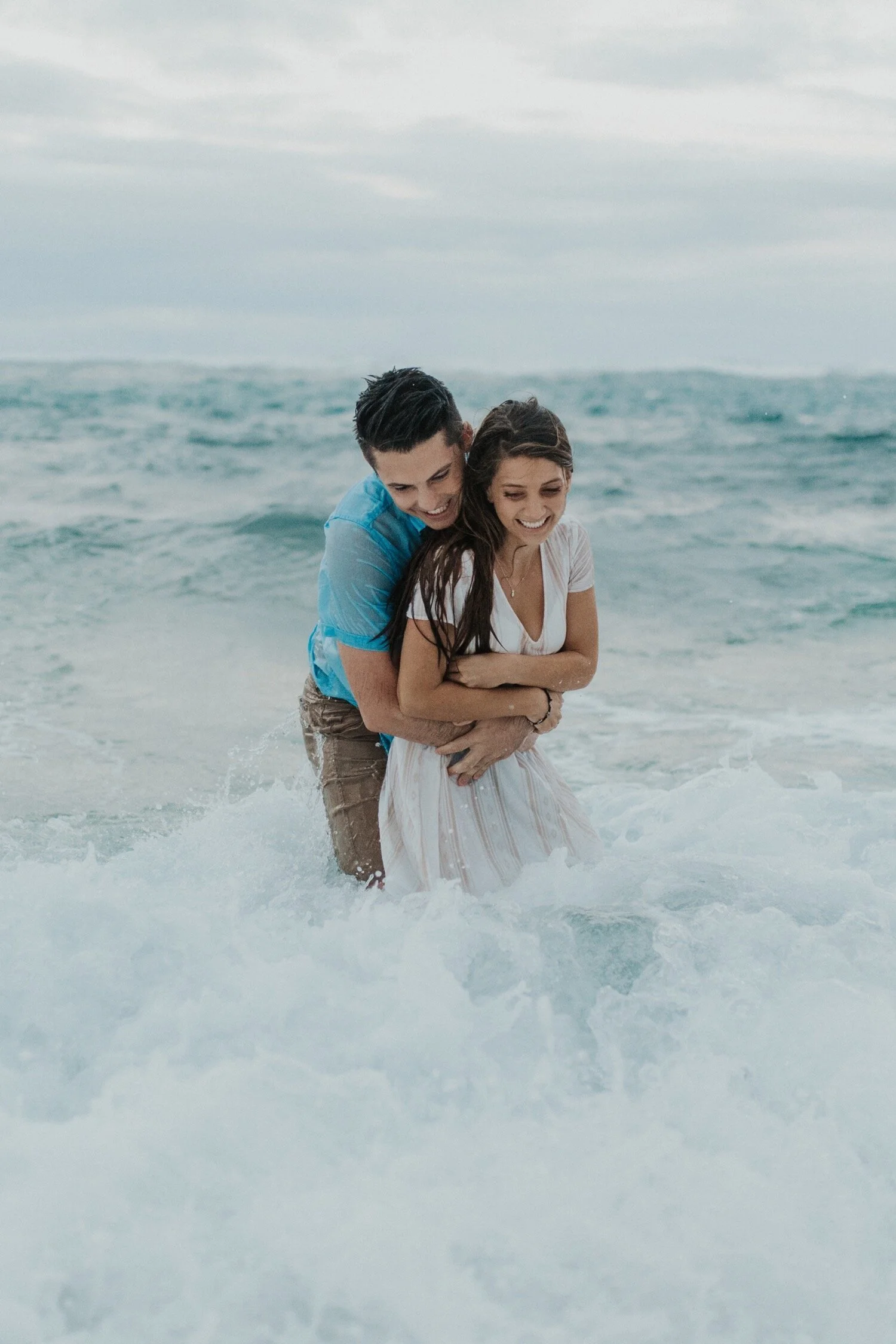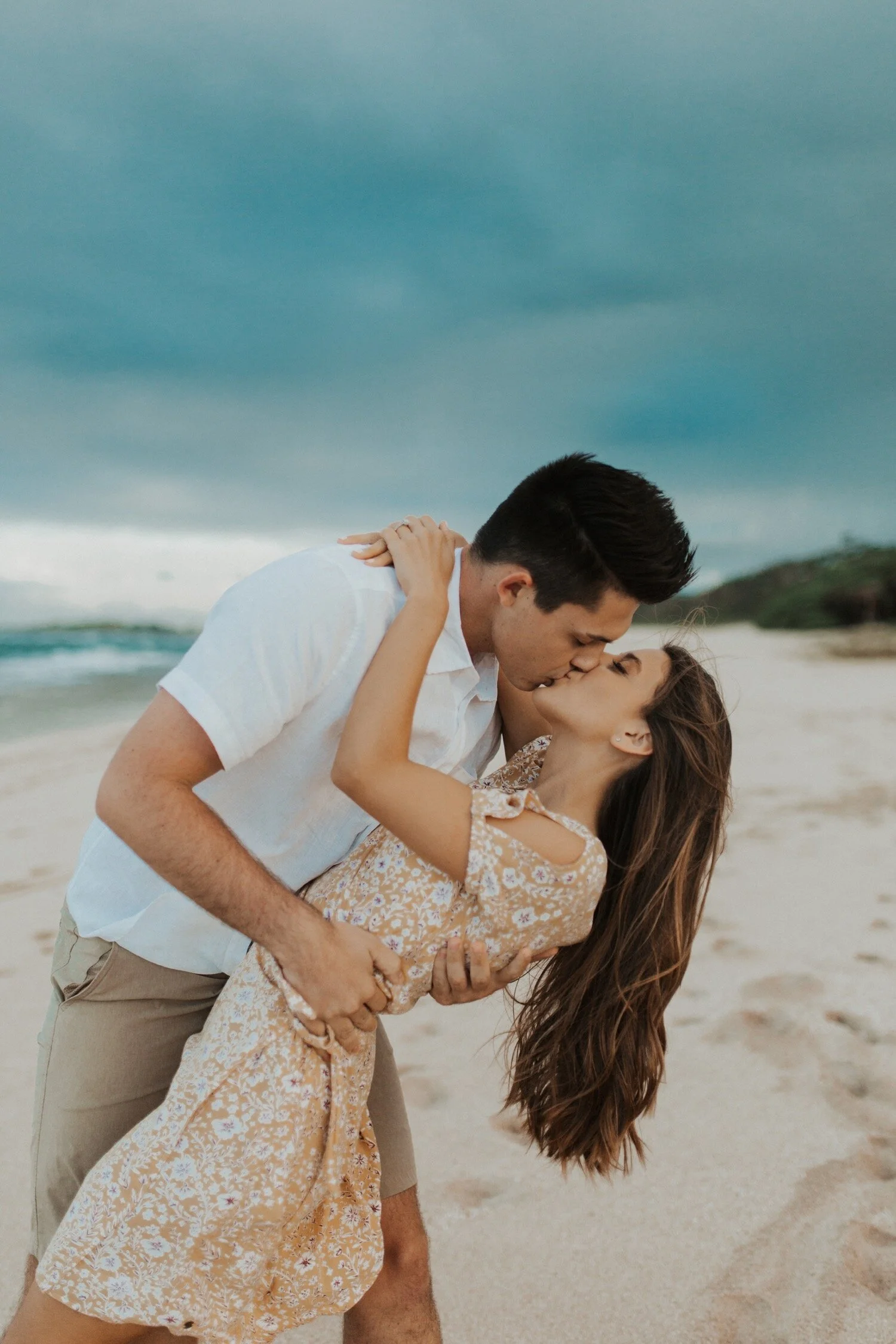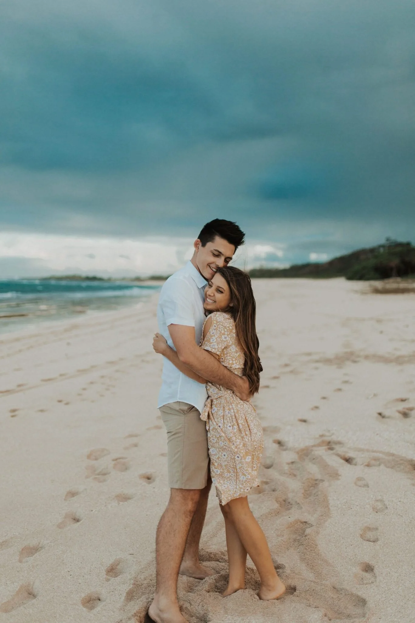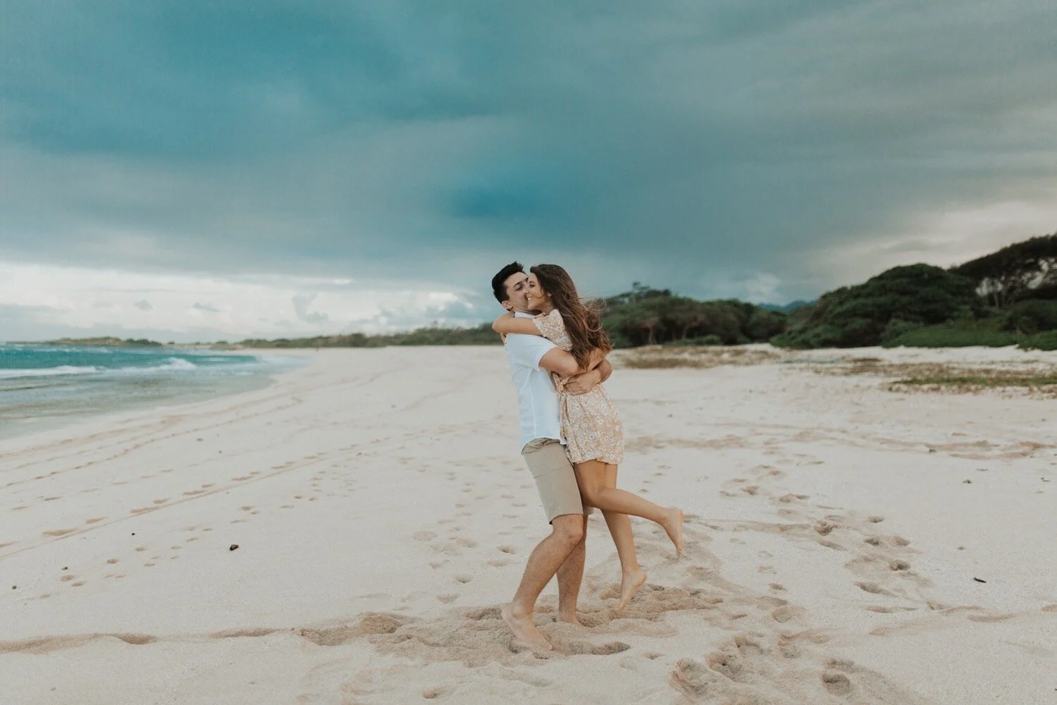 The most gorgeous beach engagement session on the beautiful north shore Oahu with Amanda and Carter. Where can I even begin with these two. The day was gorgeous. rain clouds were all around us and it sure showed up the beautiful north shore of Oahu. These two ran up and down the beach, rolled in the sand, and ended the night in the water. A + C were two of the sweetest most loving individuals ever. You could feel the joy that they brought each other. The island definitely showed off for these two and I couldn’t have asked for a beautiful night on the north shore of Oahu for them. So excited for their wedding and the amazing life these two are going to have together.