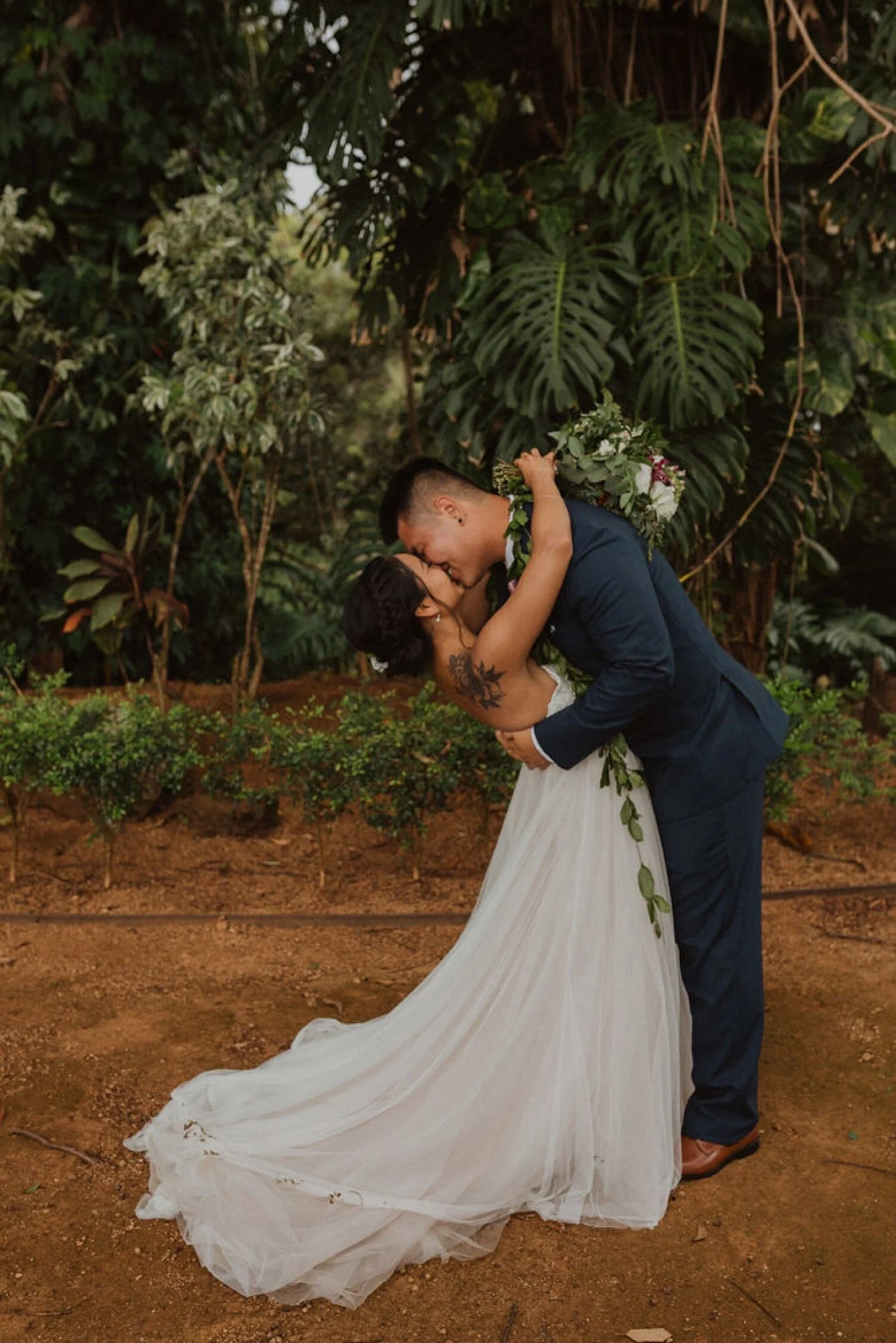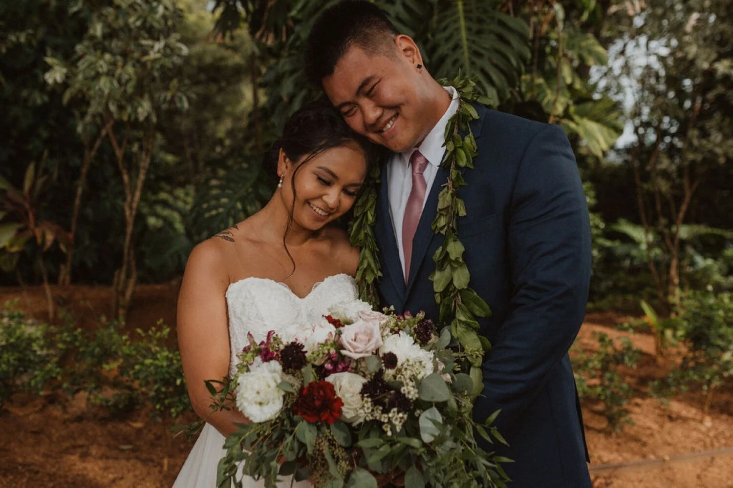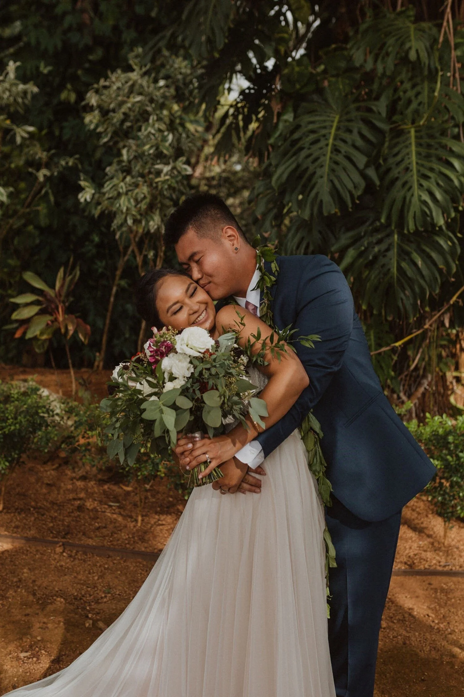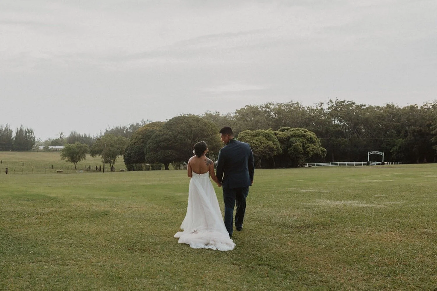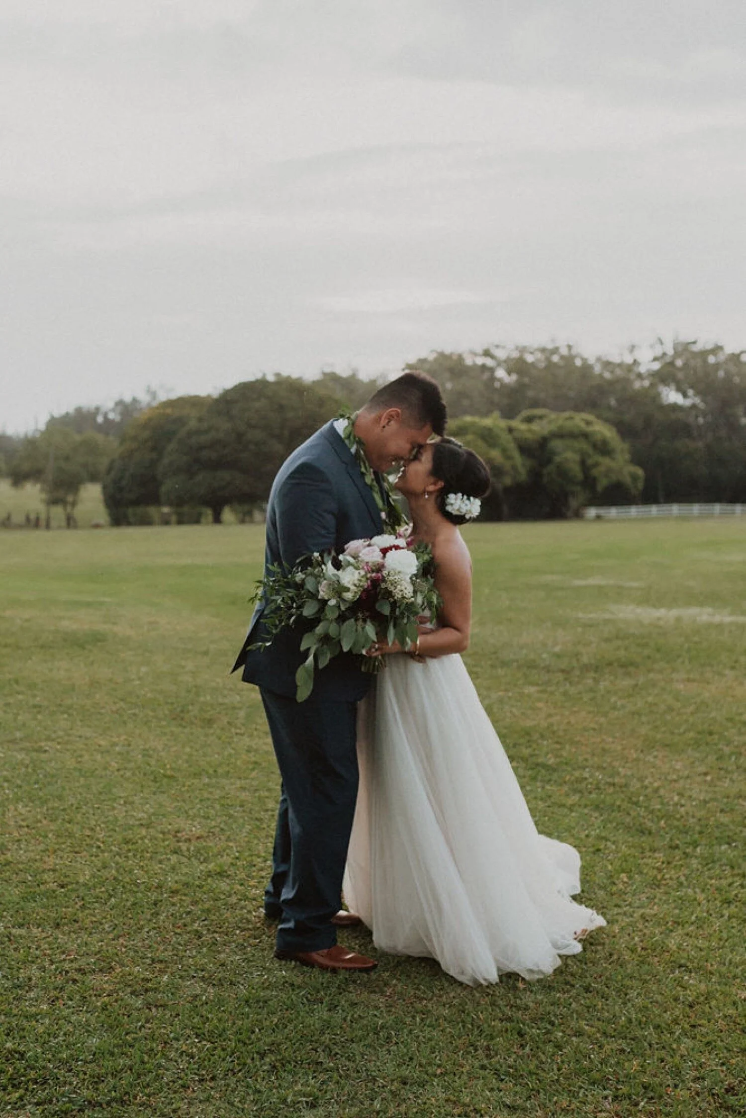 This gorgeous Sunset Ranch Hawaii wedding was the perfect location for an intimate wedding on a gorgeous summer day. Aaron and Kaisha are two local, born and raised Oahu couple that moved to Oregon to go to school. They came back to Hawaii for their small, intimate wedding at the gorgeous sunset ranch located on the north shore of Oahu, Hawaii. They were surrounded by their family, friends, and those they love most. Family from Hawaii all came in as well as friends from Oregon. The weather gods were so kind to us. The day started out so clear and beautiful and right as we went into the barn for the reception it started to rain. A small little break happened around sunset time so we could sneak out and capture the gorgeous Sunset Ranch at sunset. This intimate wedding was so memorable and sweet.