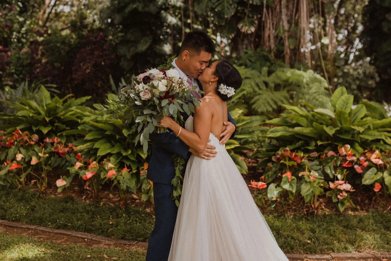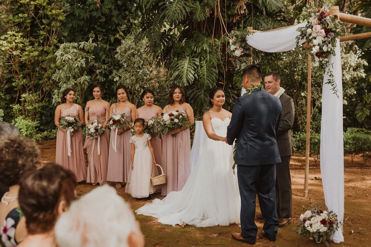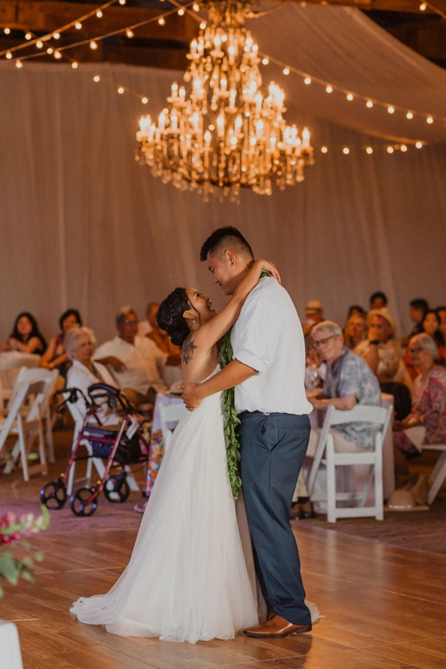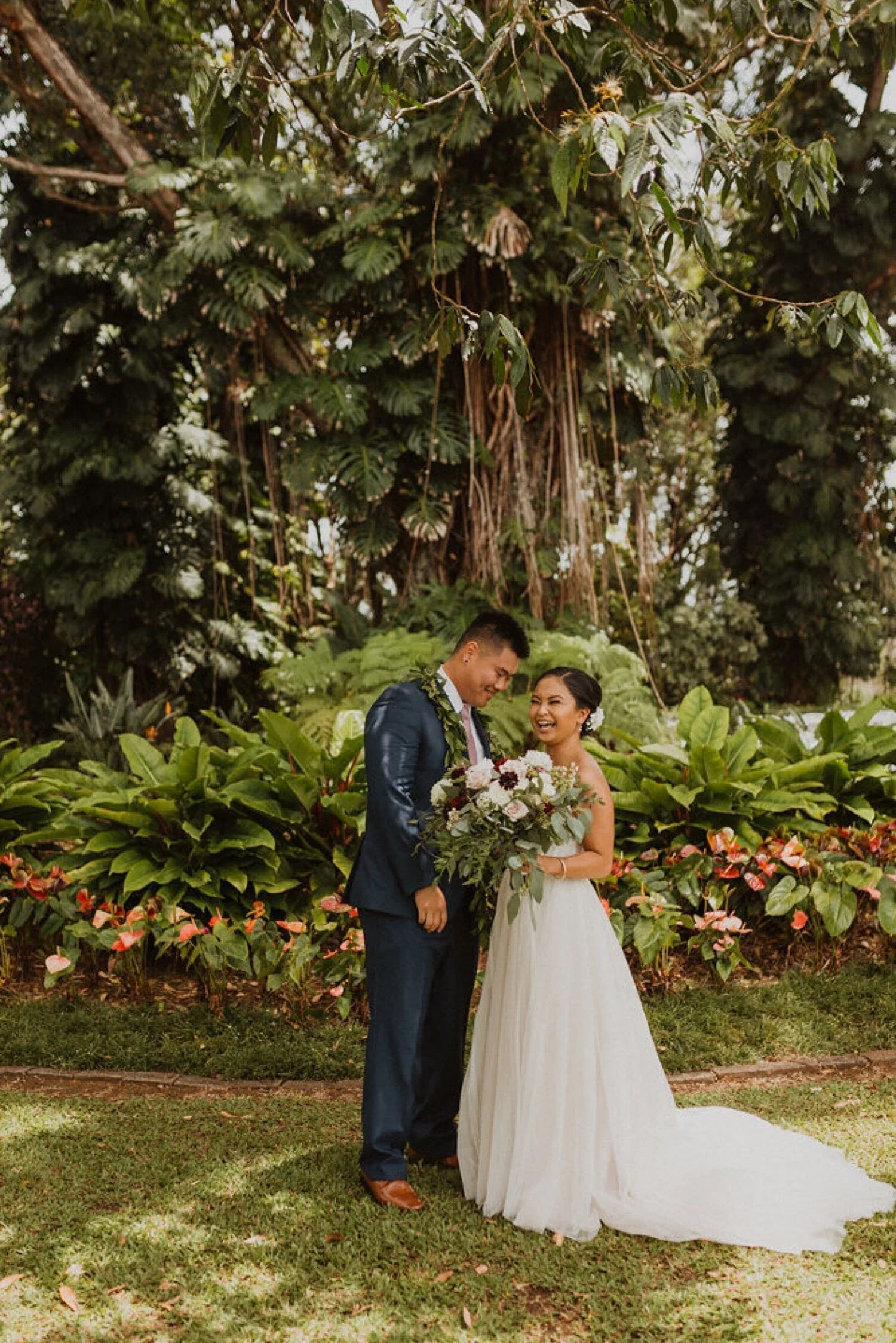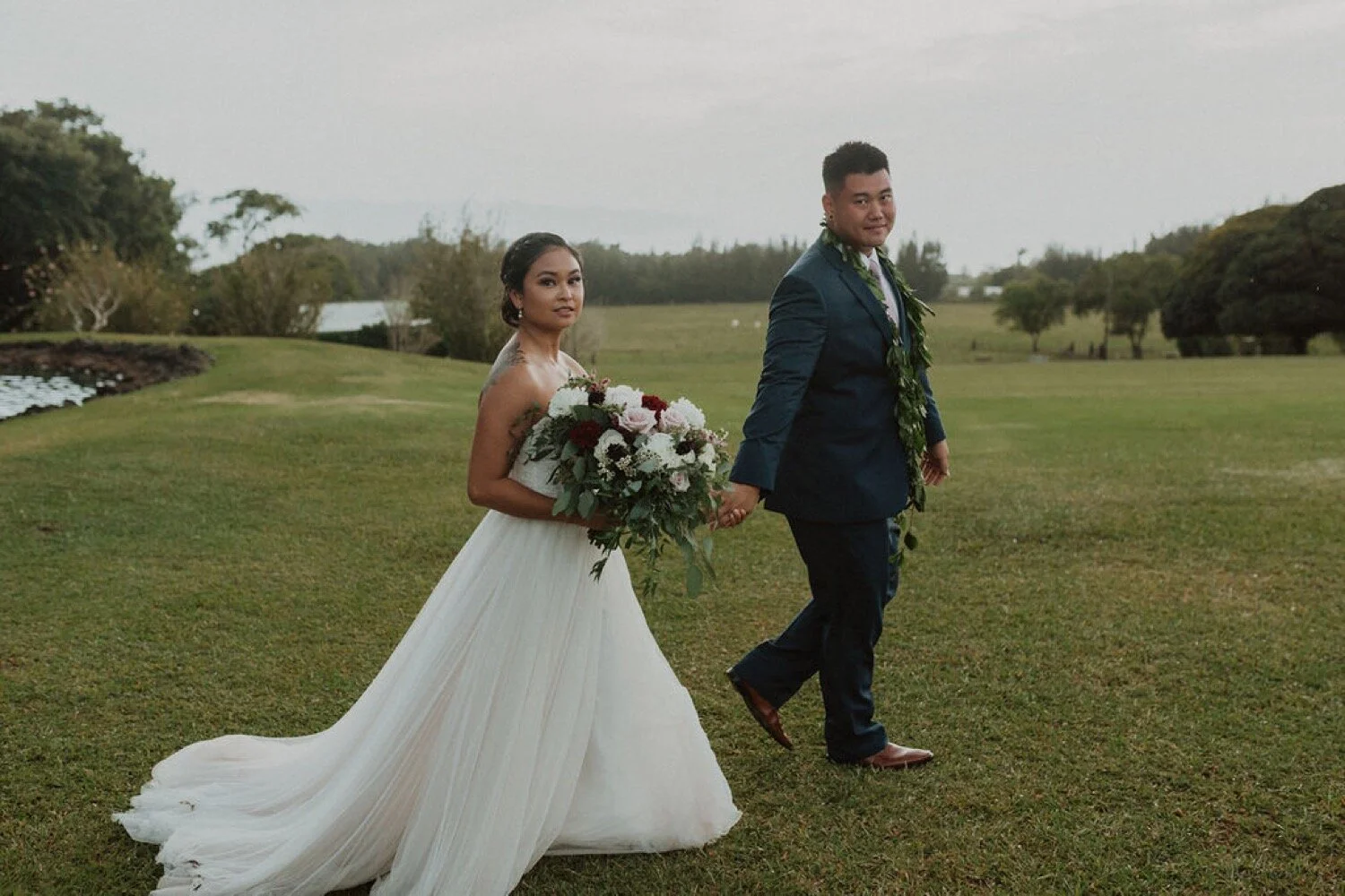 This gorgeous Sunset Ranch Hawaii wedding was the perfect location for an intimate wedding on a gorgeous summer day. Aaron and Kaisha are two local, born and raised Oahu couple that moved to Oregon to go to school. They came back to Hawaii for their small, intimate wedding at the gorgeous sunset ranch located on the north shore of Oahu, Hawaii. They were surrounded by their family, friends, and those they love most. Family from Hawaii all came in as well as friends from Oregon. The weather gods were so kind to us. The day started out so clear and beautiful and right as we went into the barn for the reception it started to rain. A small little break happened around sunset time so we could sneak out and capture the gorgeous Sunset Ranch at sunset. This intimate wedding was so memorable and sweet.