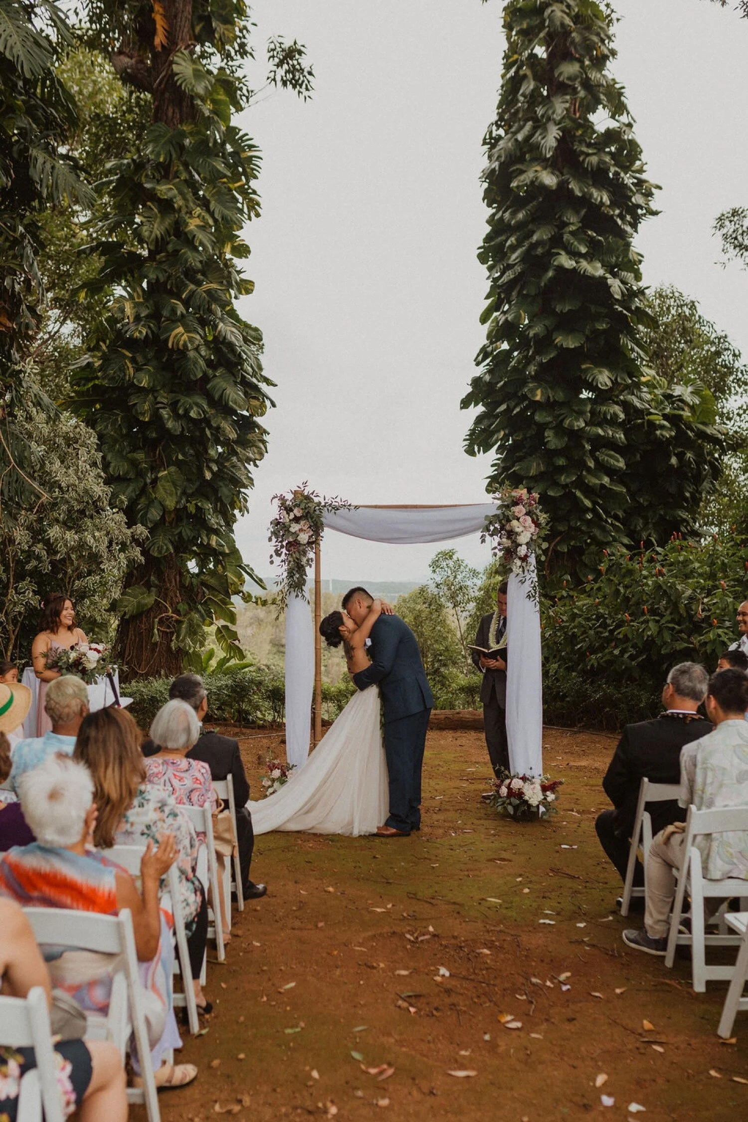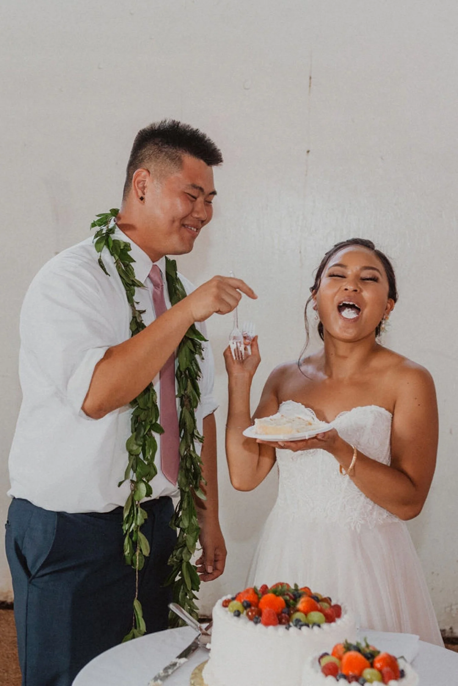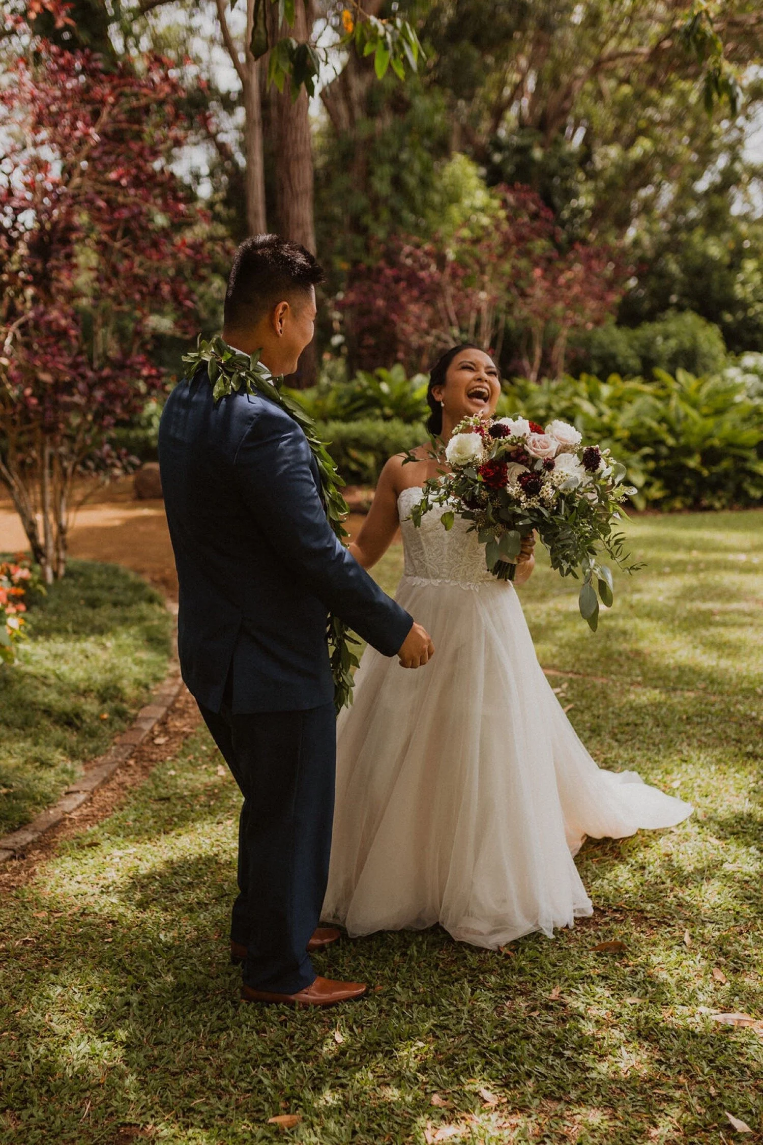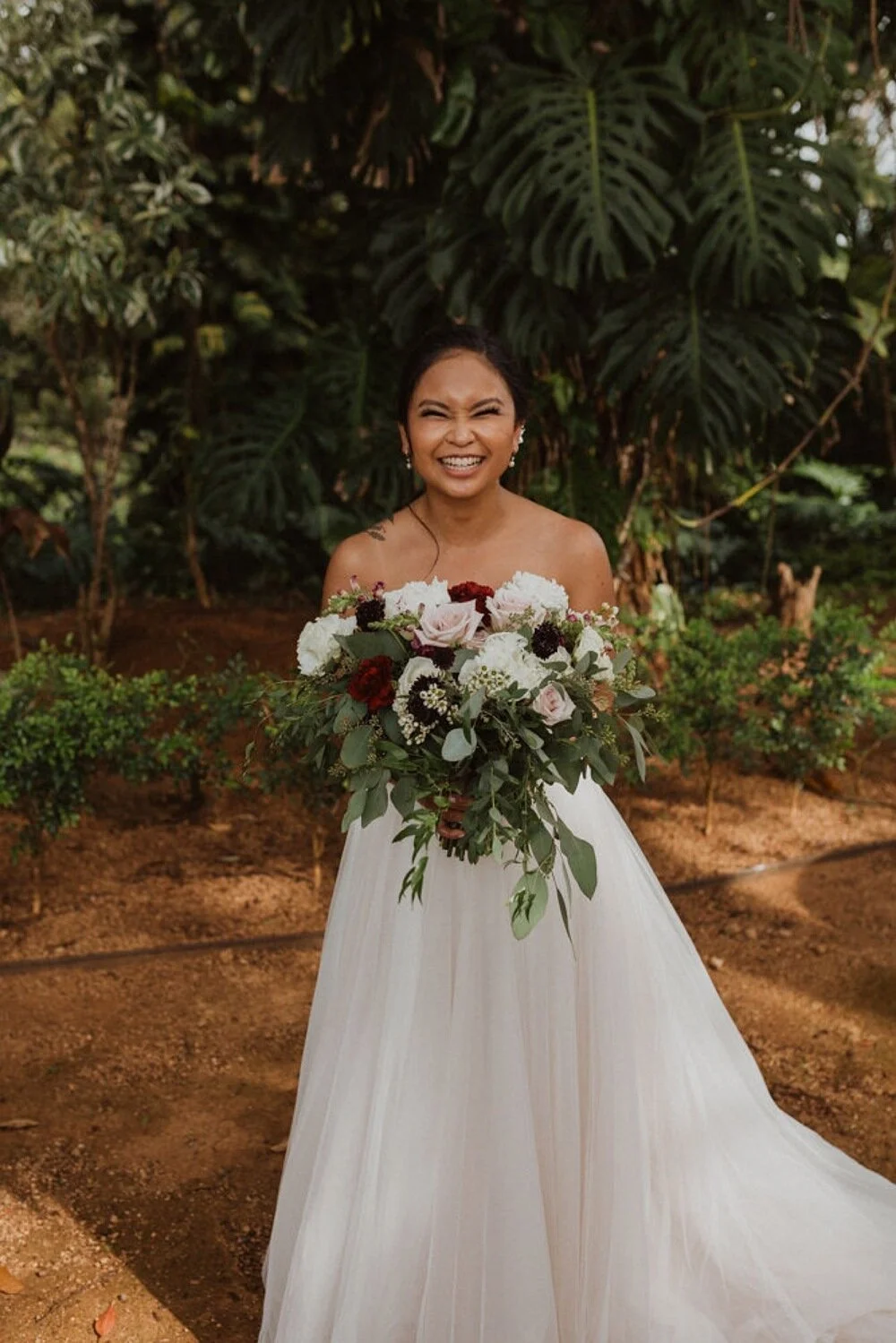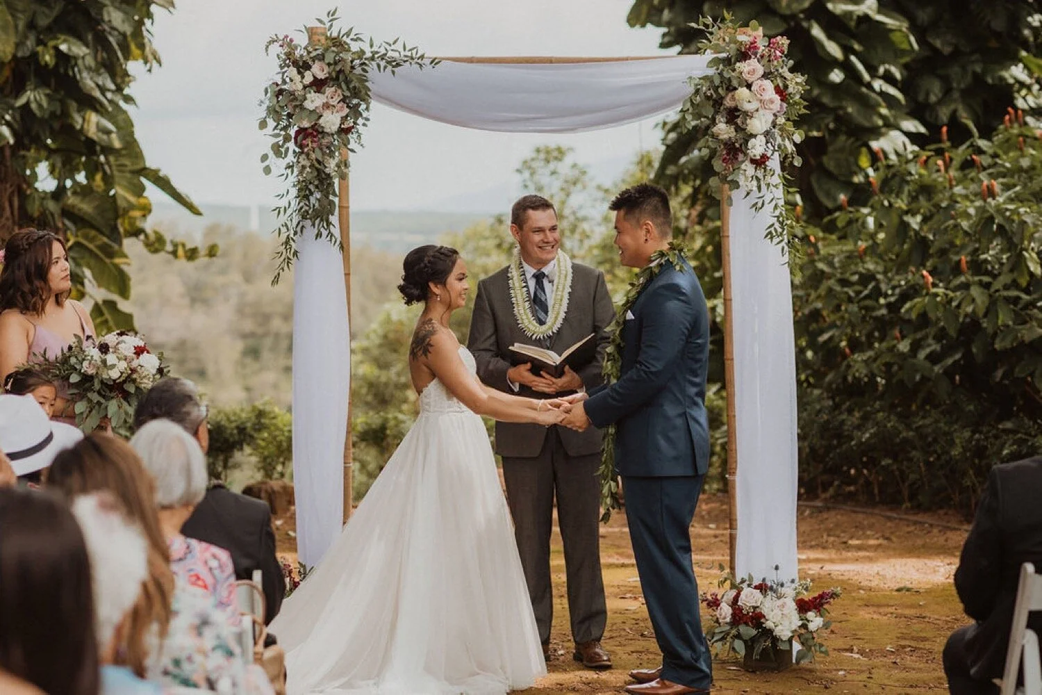 This gorgeous Sunset Ranch Hawaii wedding was the perfect location for an intimate wedding on a gorgeous summer day. Aaron and Kaisha are two local, born and raised Oahu couple that moved to Oregon to go to school. They came back to Hawaii for their small, intimate wedding at the gorgeous sunset ranch located on the north shore of Oahu, Hawaii. They were surrounded by their family, friends, and those they love most. Family from Hawaii all came in as well as friends from Oregon. The weather gods were so kind to us. The day started out so clear and beautiful and right as we went into the barn for the reception it started to rain. A small little break happened around sunset time so we could sneak out and capture the gorgeous Sunset Ranch at sunset. This intimate wedding was so memorable and sweet.