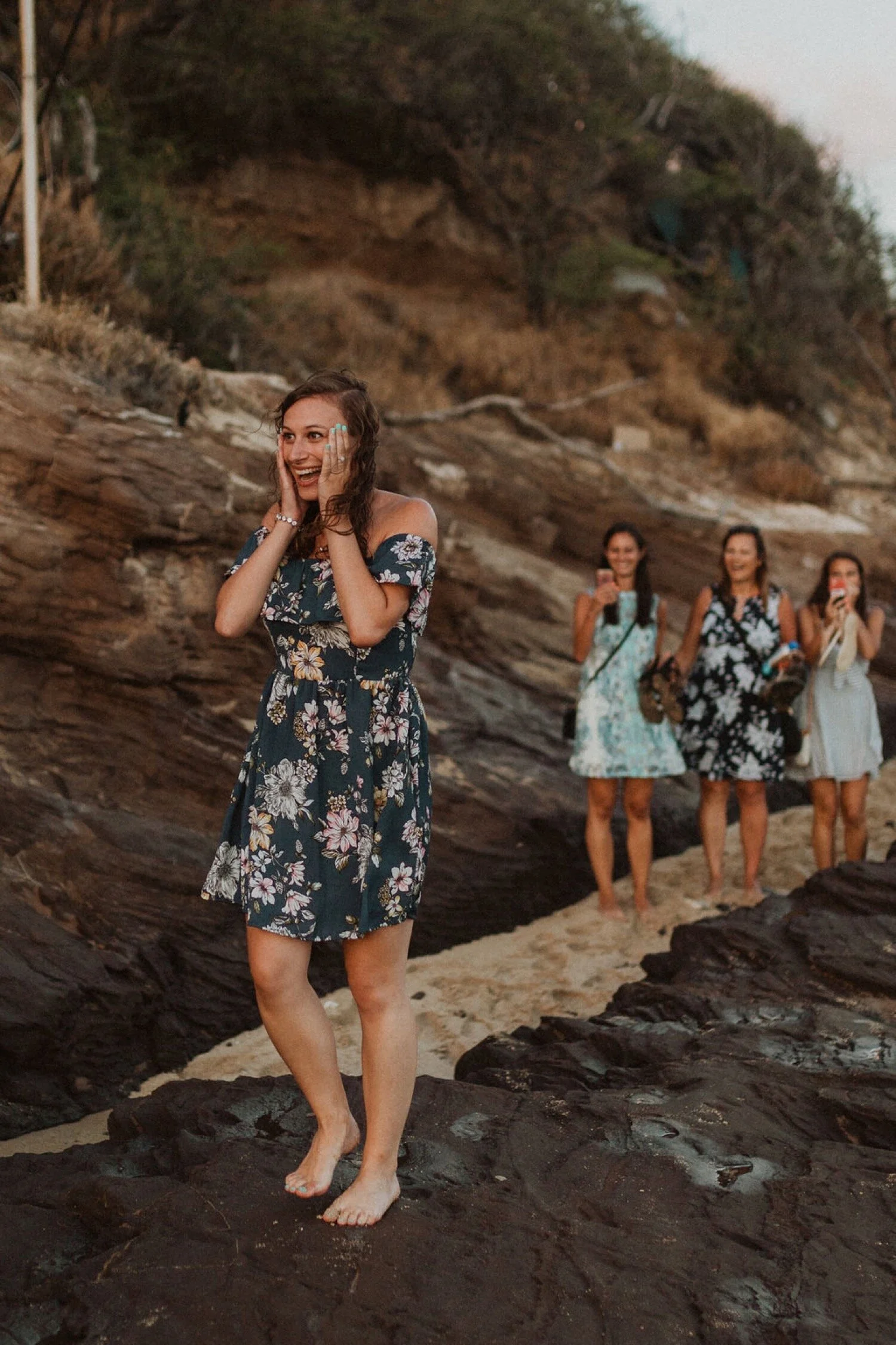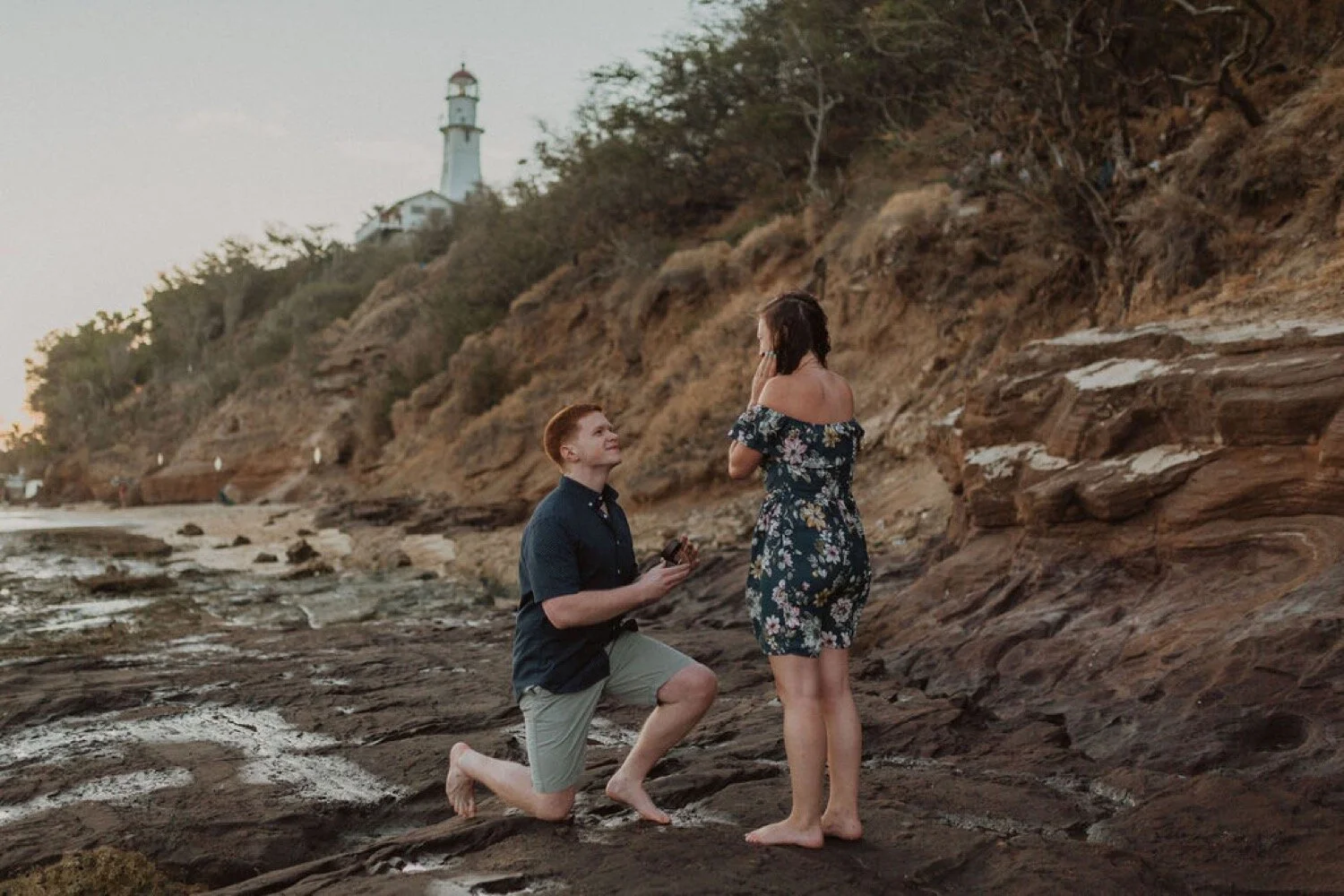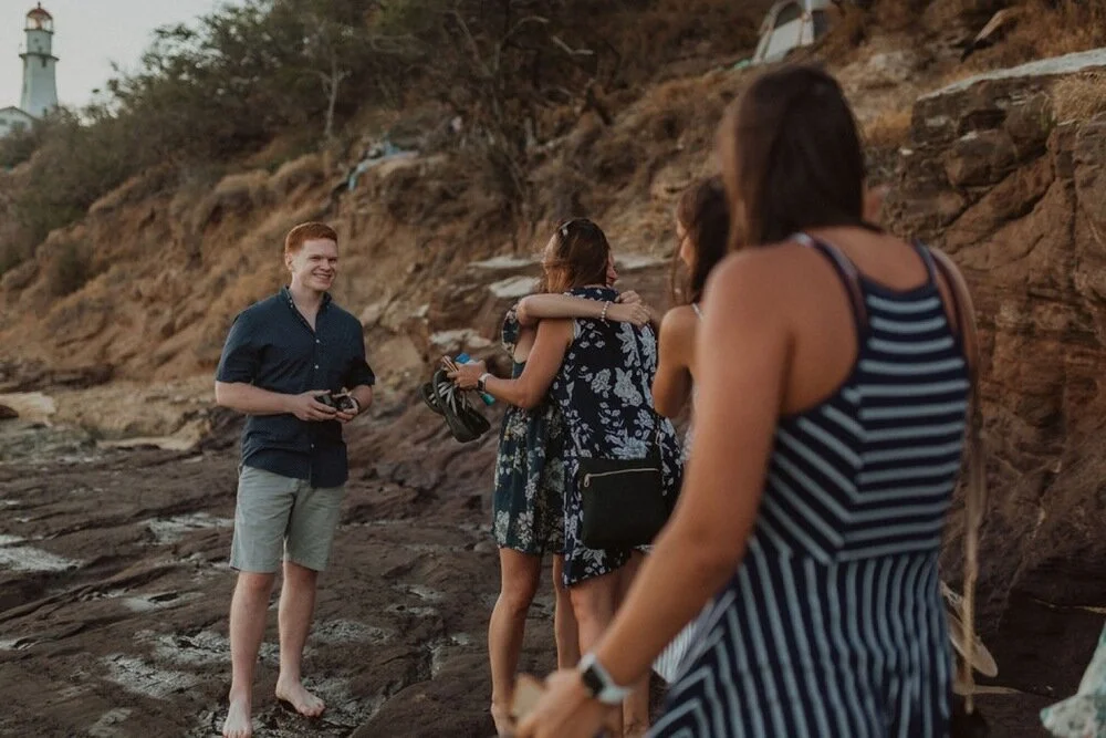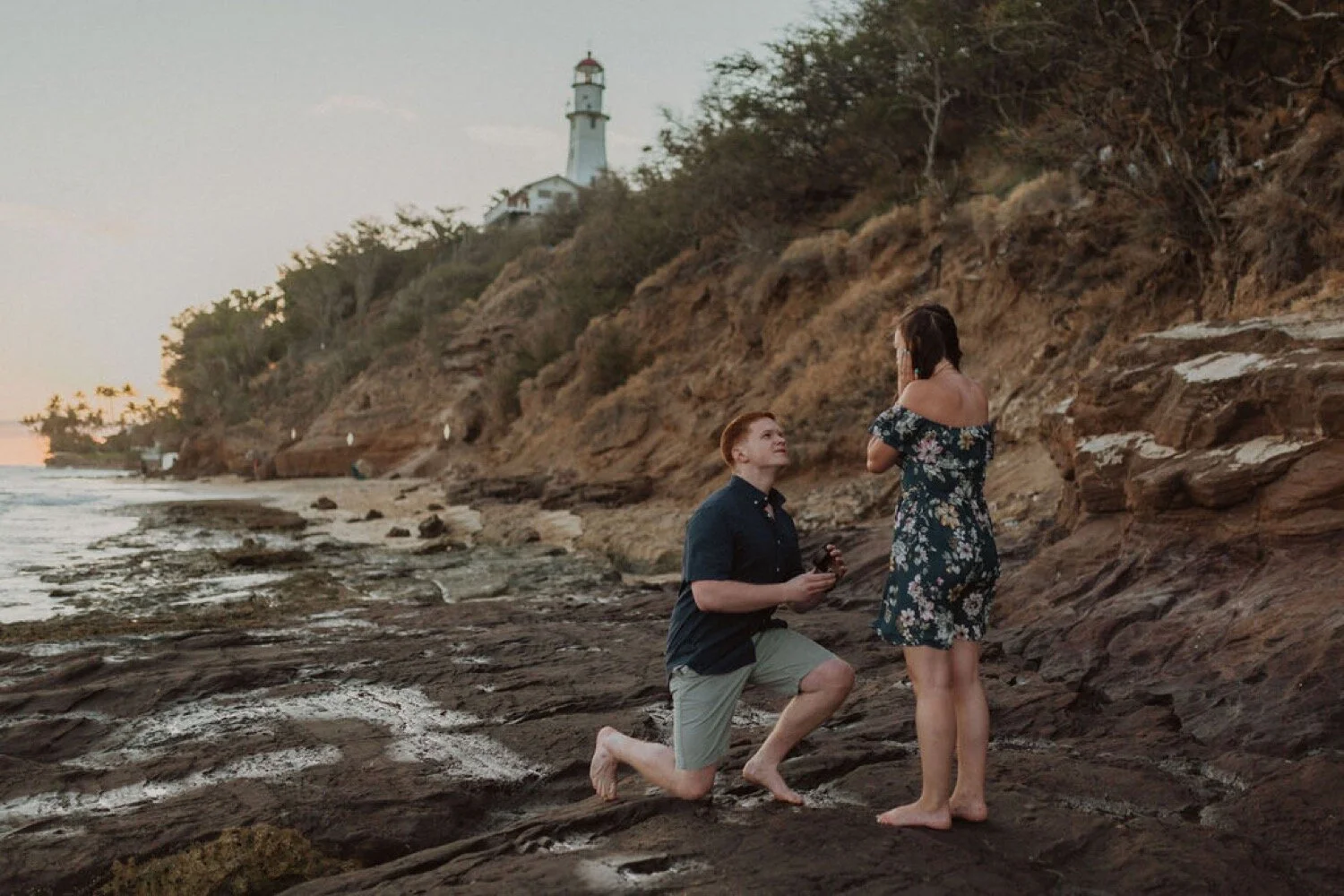 Kara told the bride how they were going to go on a little hike and how they had hired a photographer to take some family pictures. I had hid Bryan, asked them to go and walk out towards the lighthouse and the family slowly stayed behind. Bryan then popped out and the bride was dead. This surprise diamond head beach proposal was one I will never, forget. She was so happy and so surprised. this beach was the perfect spot for this proposal and it could not have turned out any more beautiful!