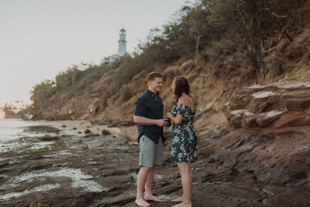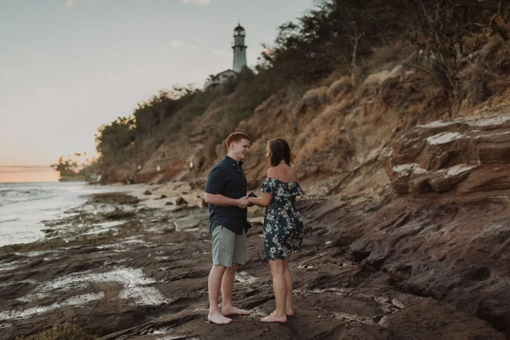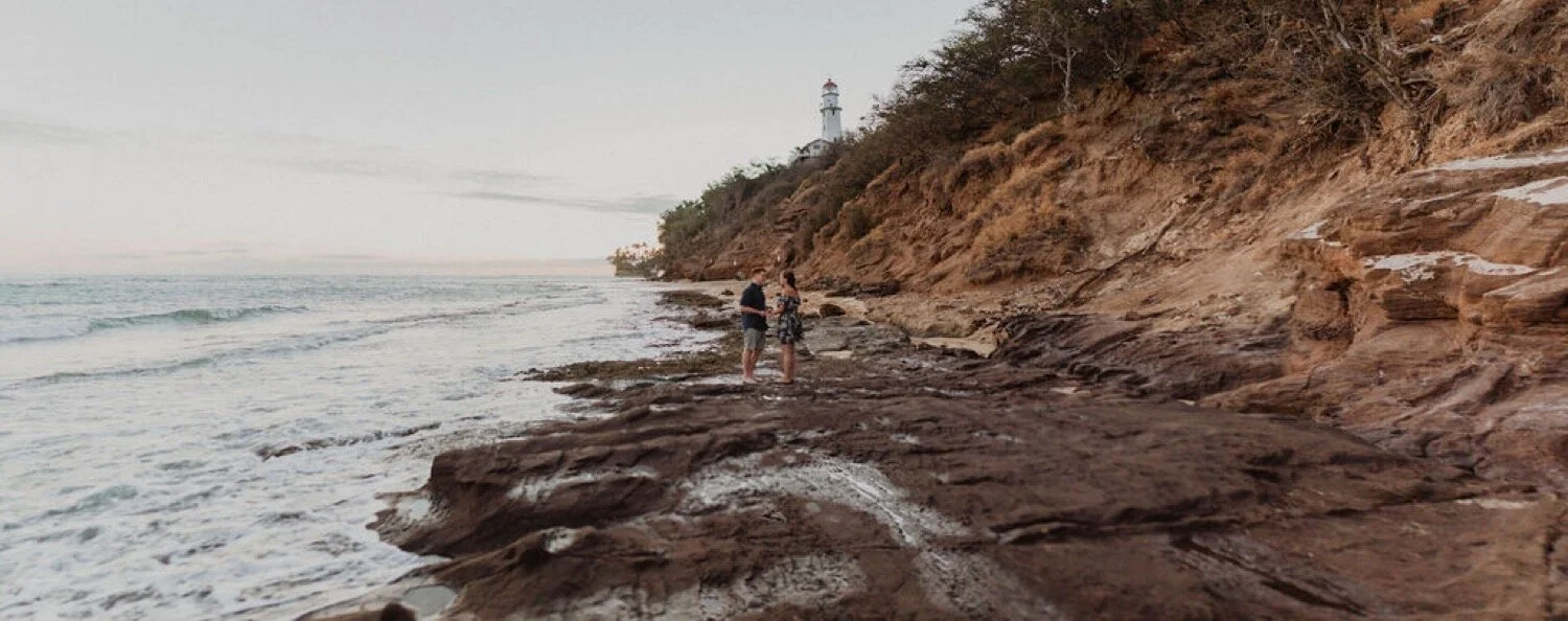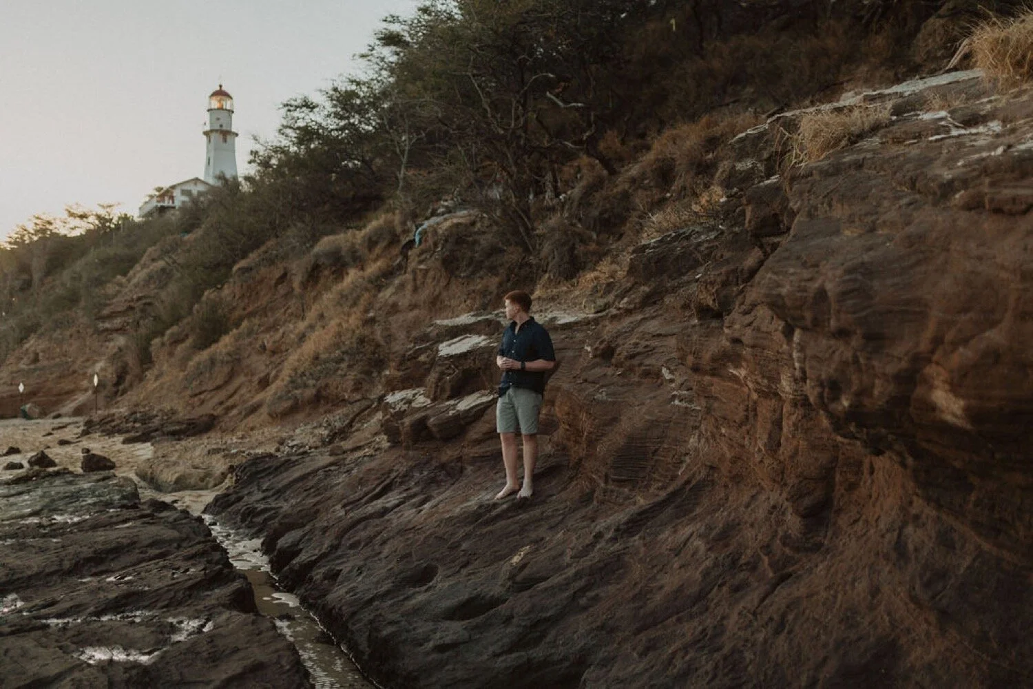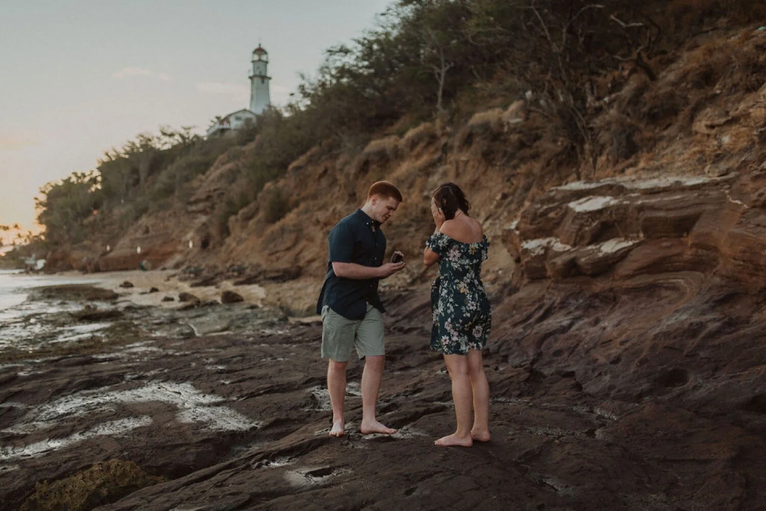 Okayy where to start with this gorgeous diamond head beach proposal. Bryan reached out to me months before coming to Hawaii telling me that he wanted to propose by the Diamond Head Beach lighthouse. We set everything up and he shared how his Fiance was on vacation with her family and that he was going to fly all the way from the mid-west without her knowing to propose. He flew all day, ubered to the location and we hiked down together.