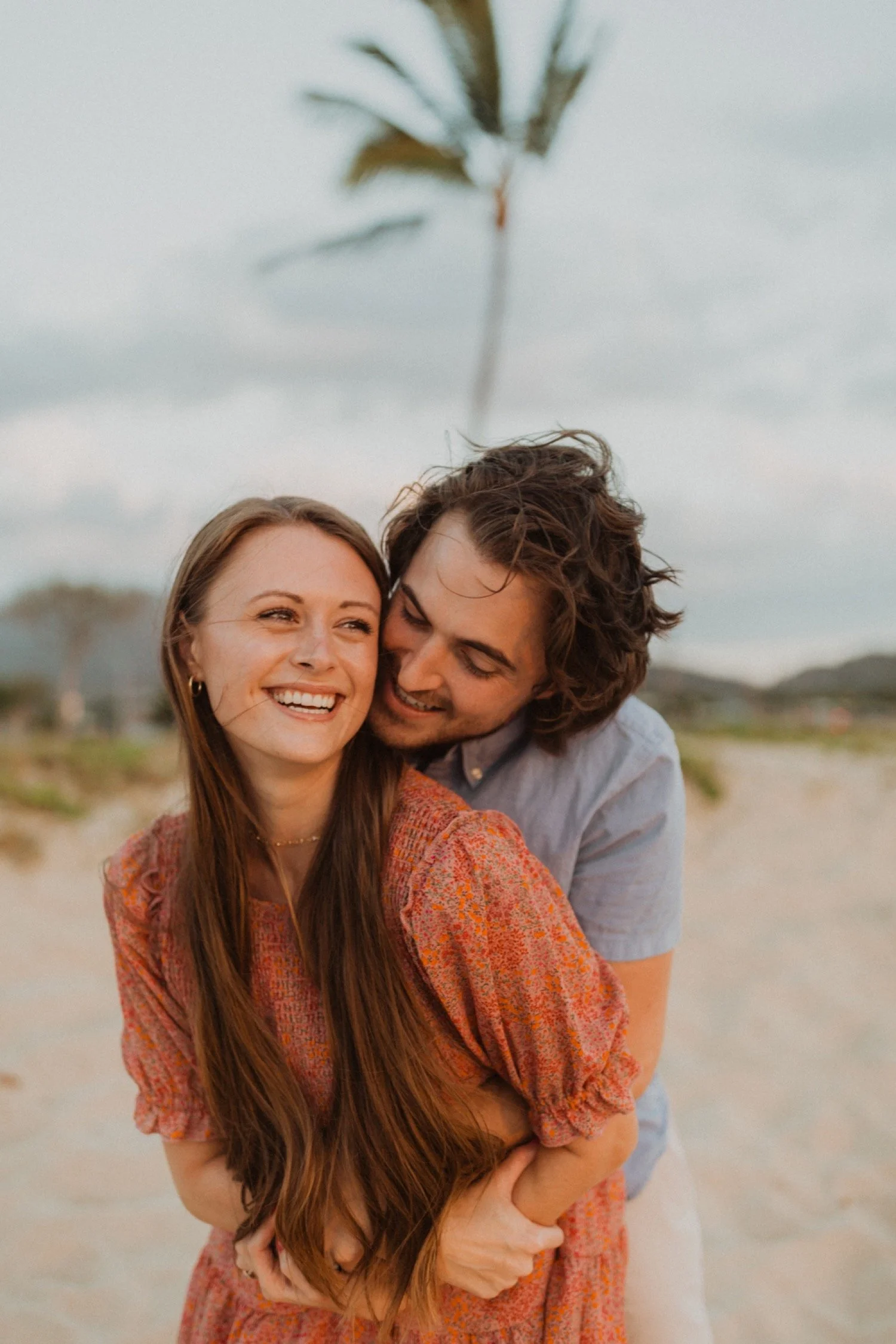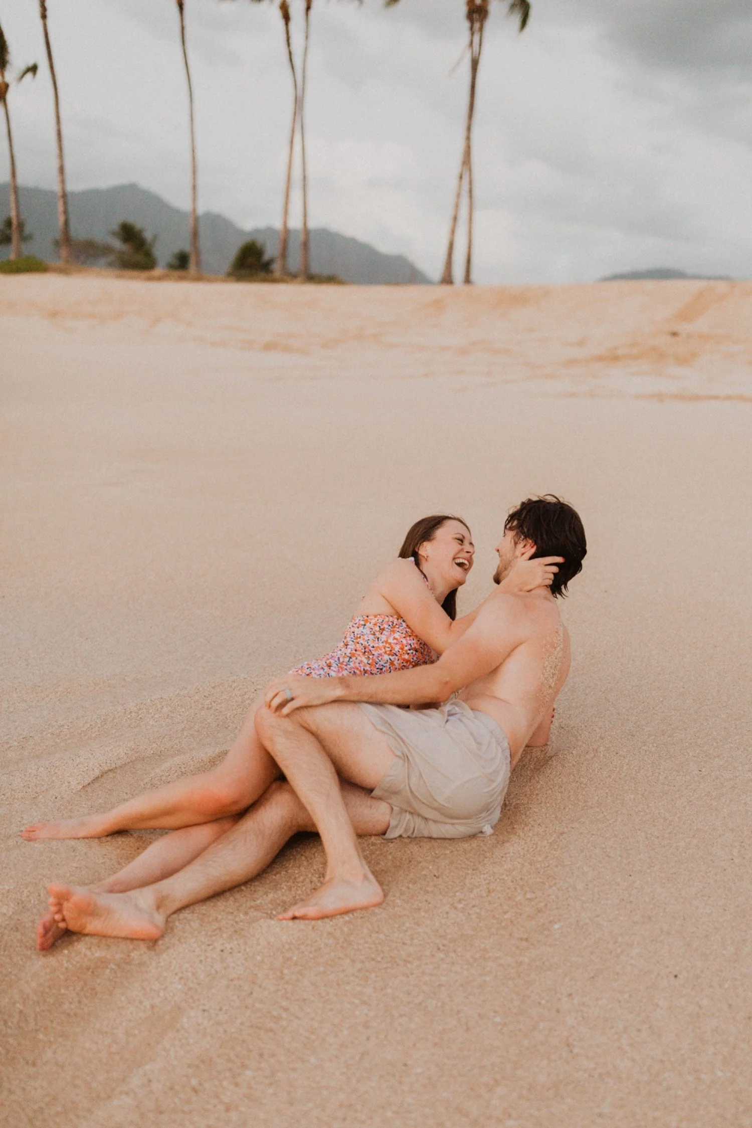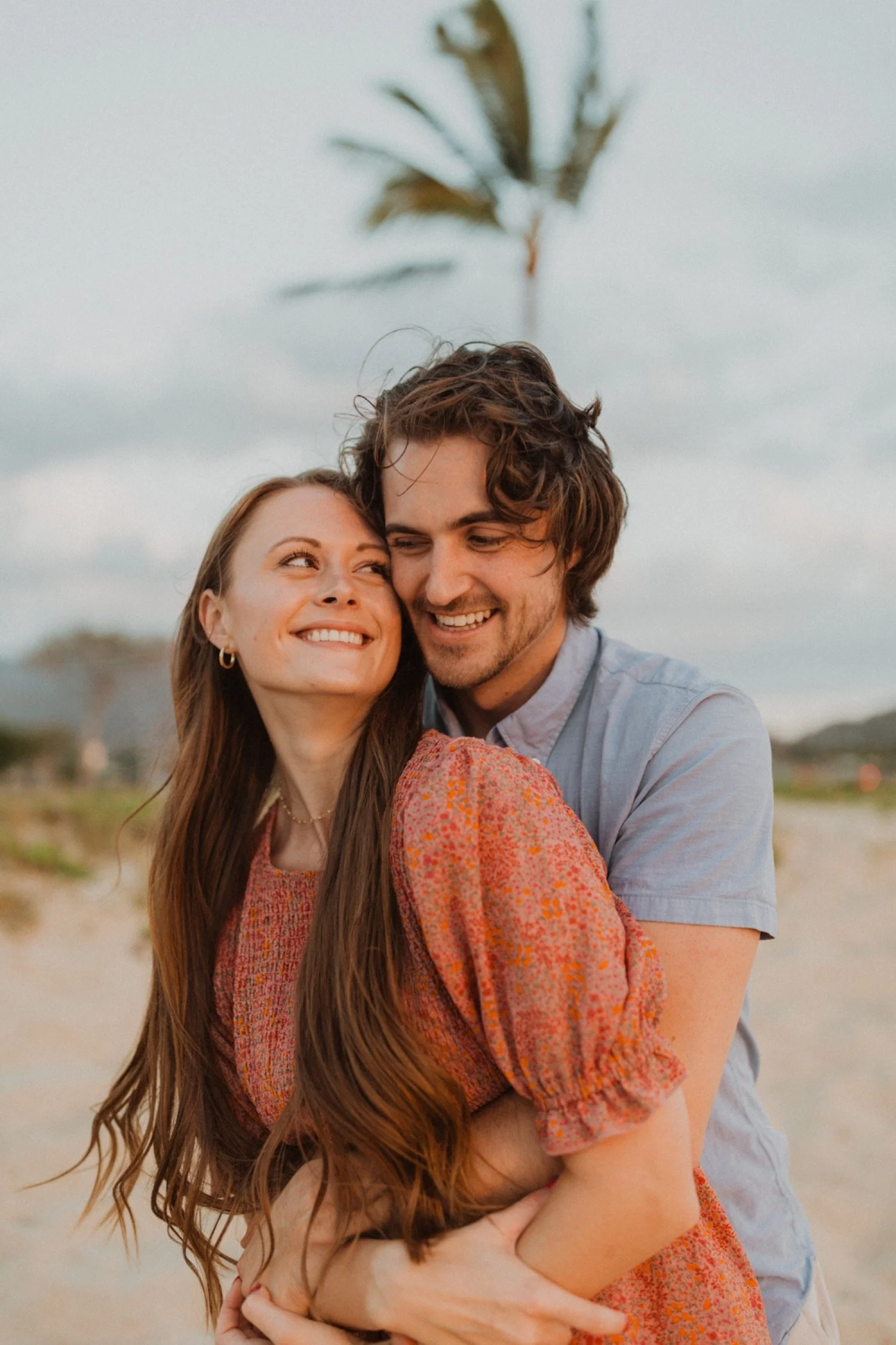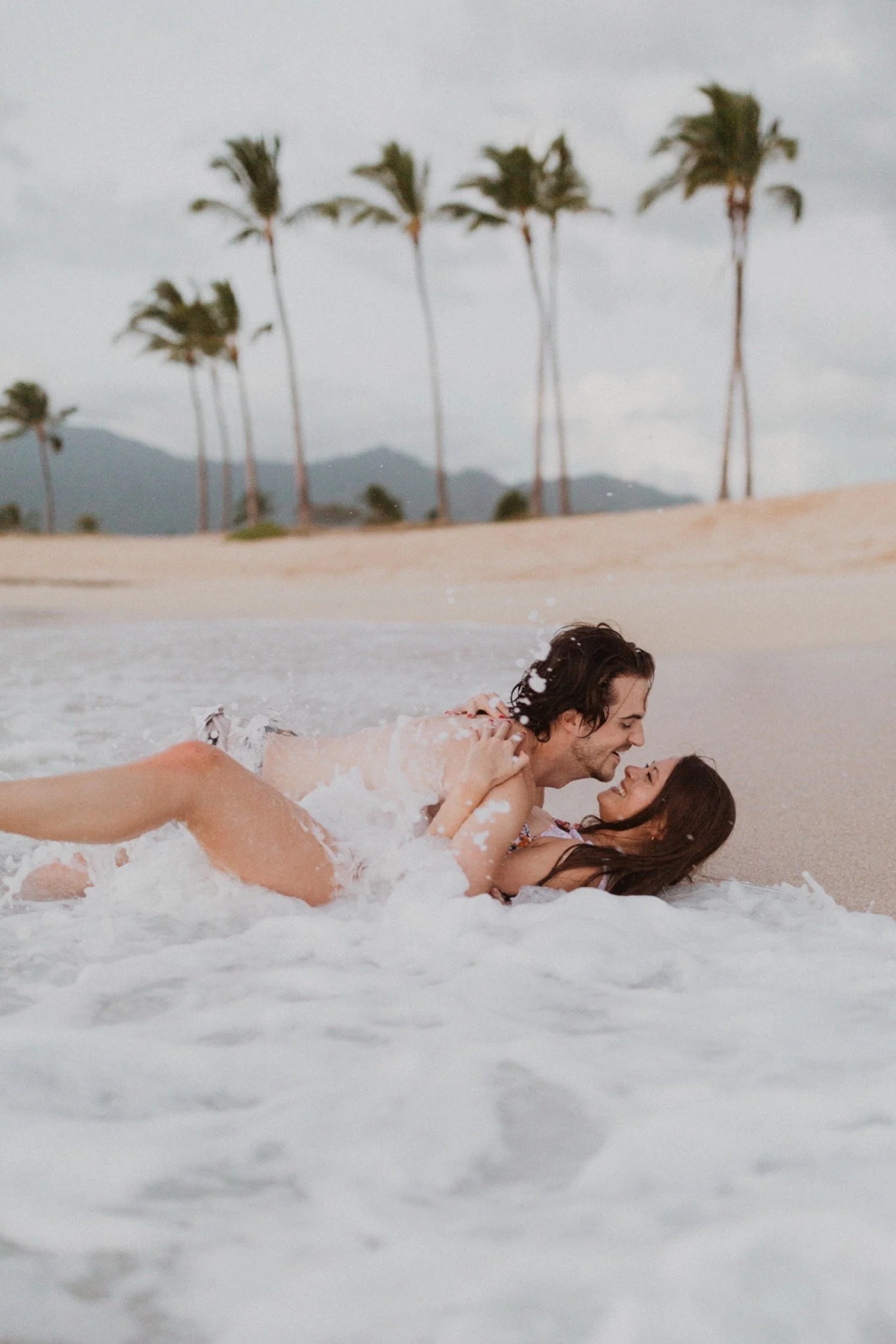 They were living in Hawaii for just a few months and wanted to get some photos before they moved back to the mainland. We went down to the beach on the west side of Oahu at sunset, for their couples session. It was a little overcast this day, but the beach was totally empty. We had so much fun getting shots in the water, and in front of the palm trees that were surrounding the beach. They are such an adventurous couple that radiate kindness and compassion and these photos showcase that perfectly.