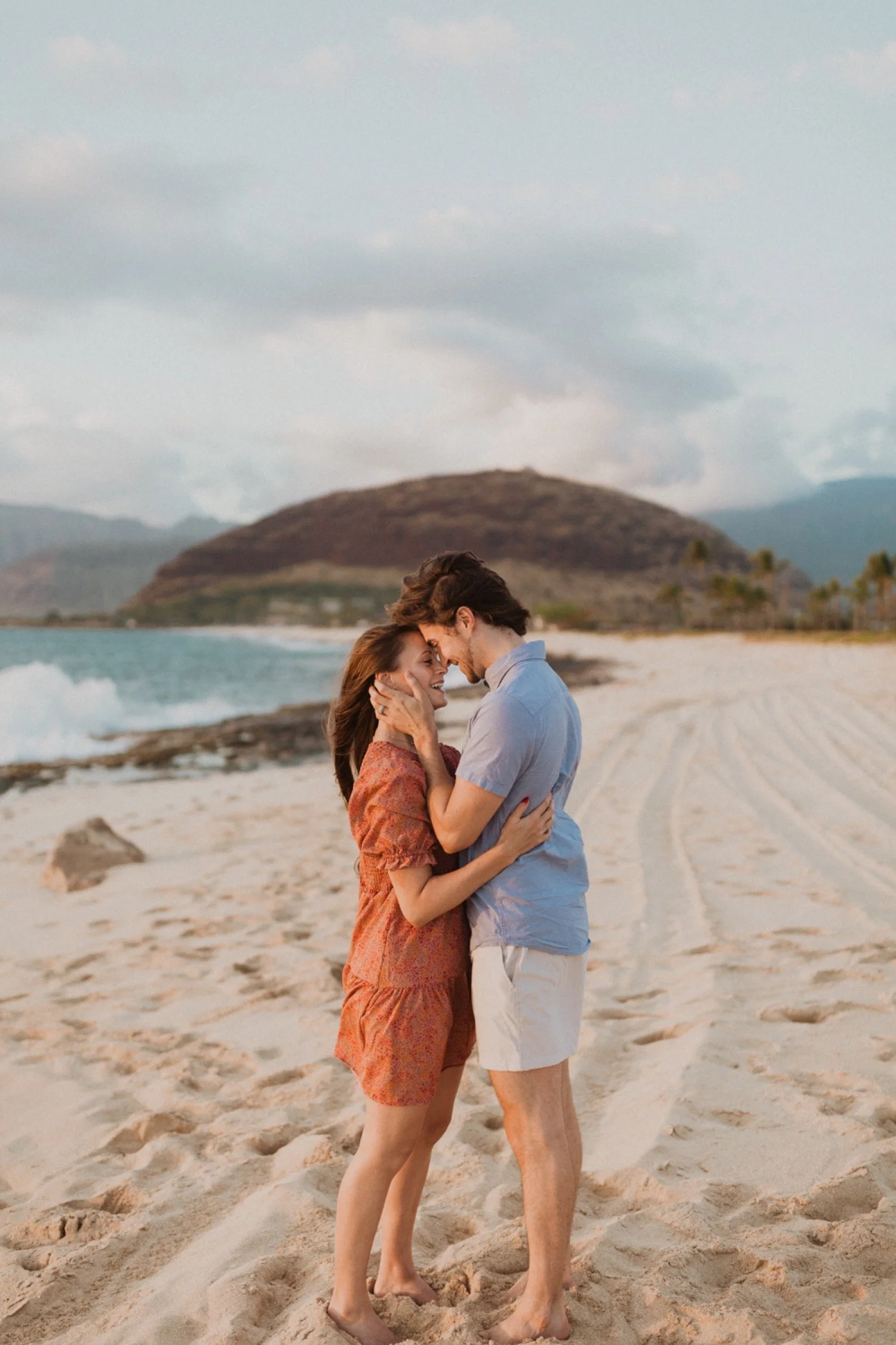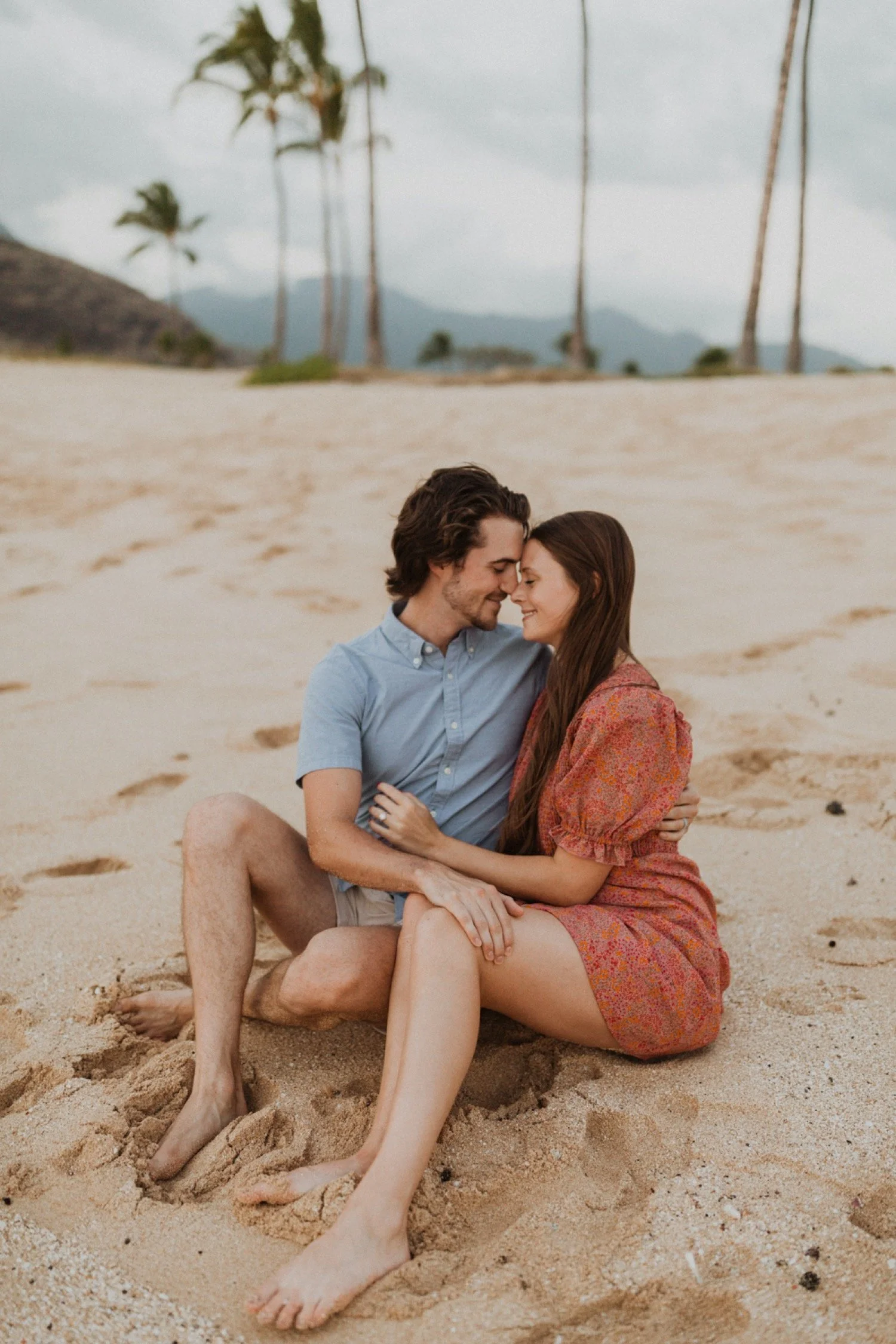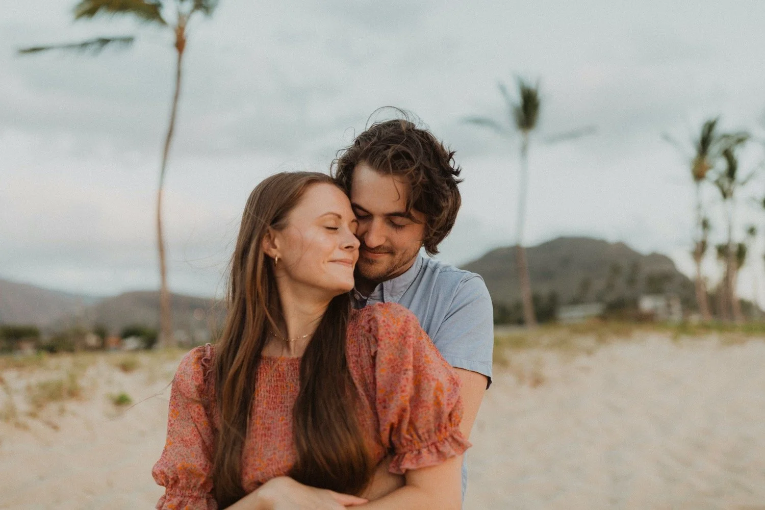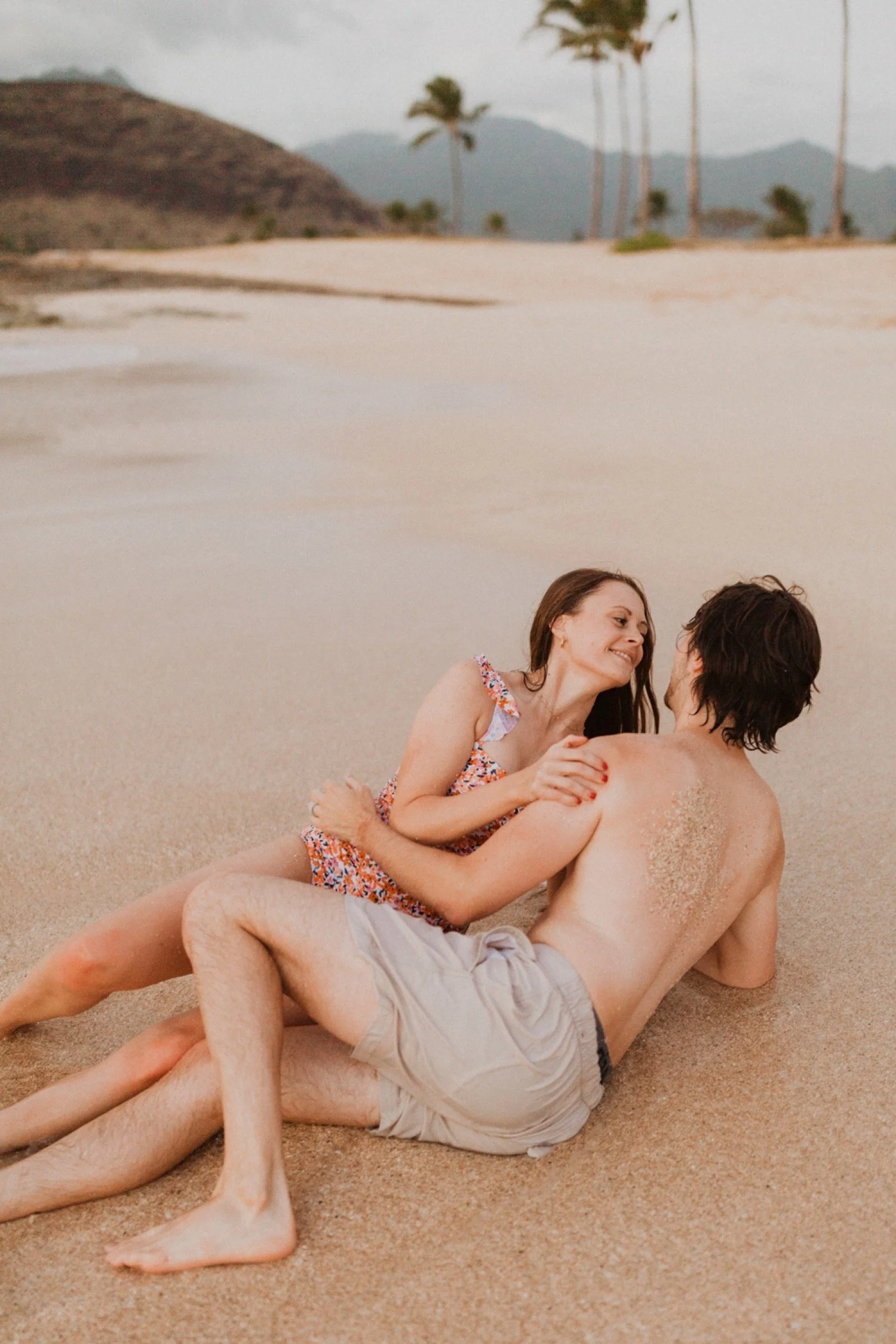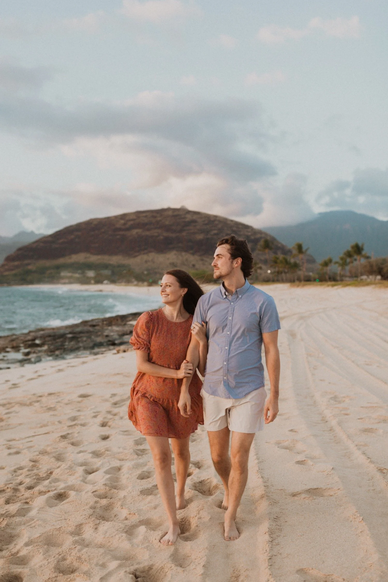 They were living in Hawaii for just a few months and wanted to get some photos before they moved back to the mainland. We went down to the beach on the west side of Oahu at sunset, for their couples session. It was a little overcast this day, but the beach was totally empty. We had so much fun getting shots in the water, and in front of the palm trees that were surrounding the beach. They are such an adventurous couple that radiate kindness and compassion and these photos showcase that perfectly.