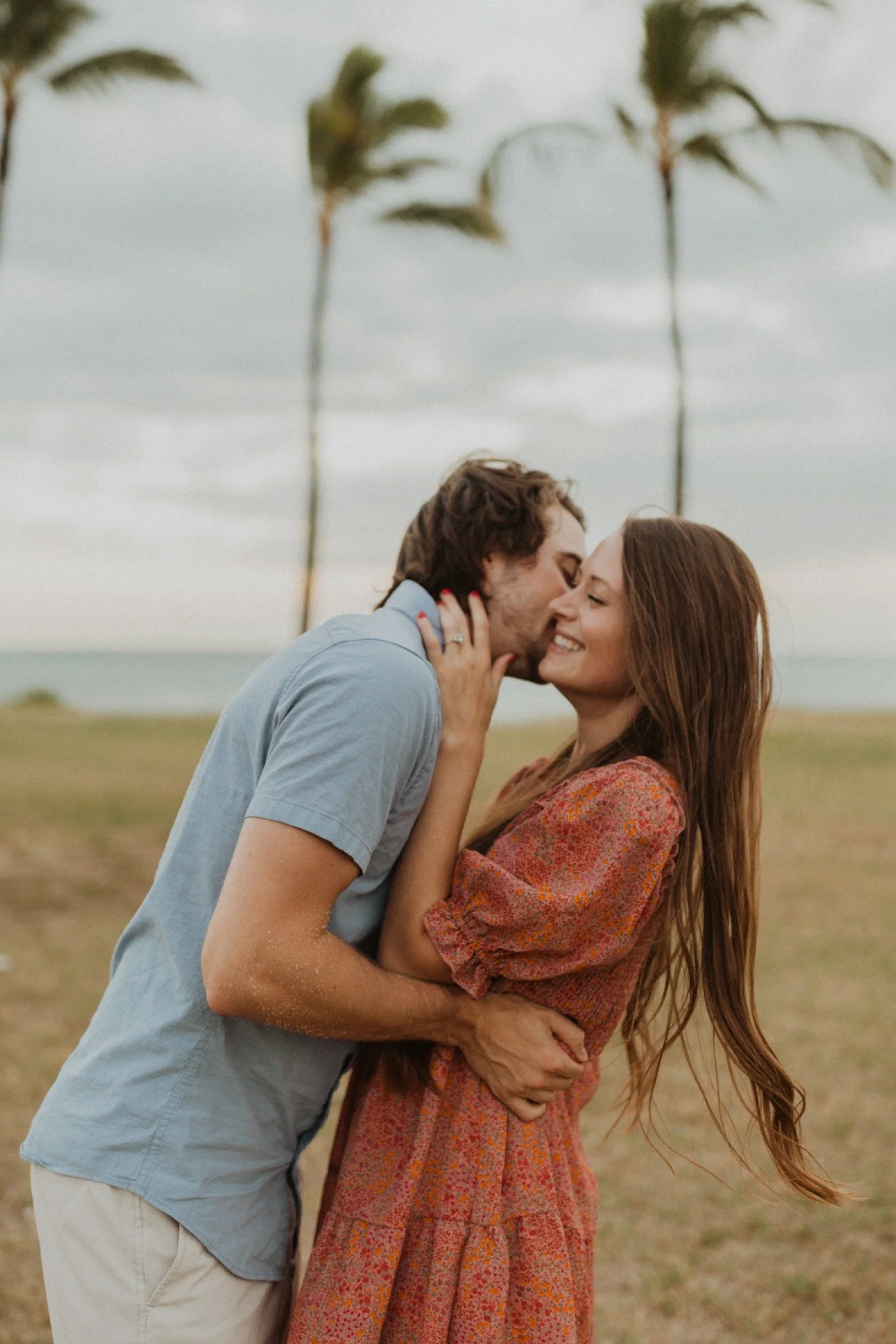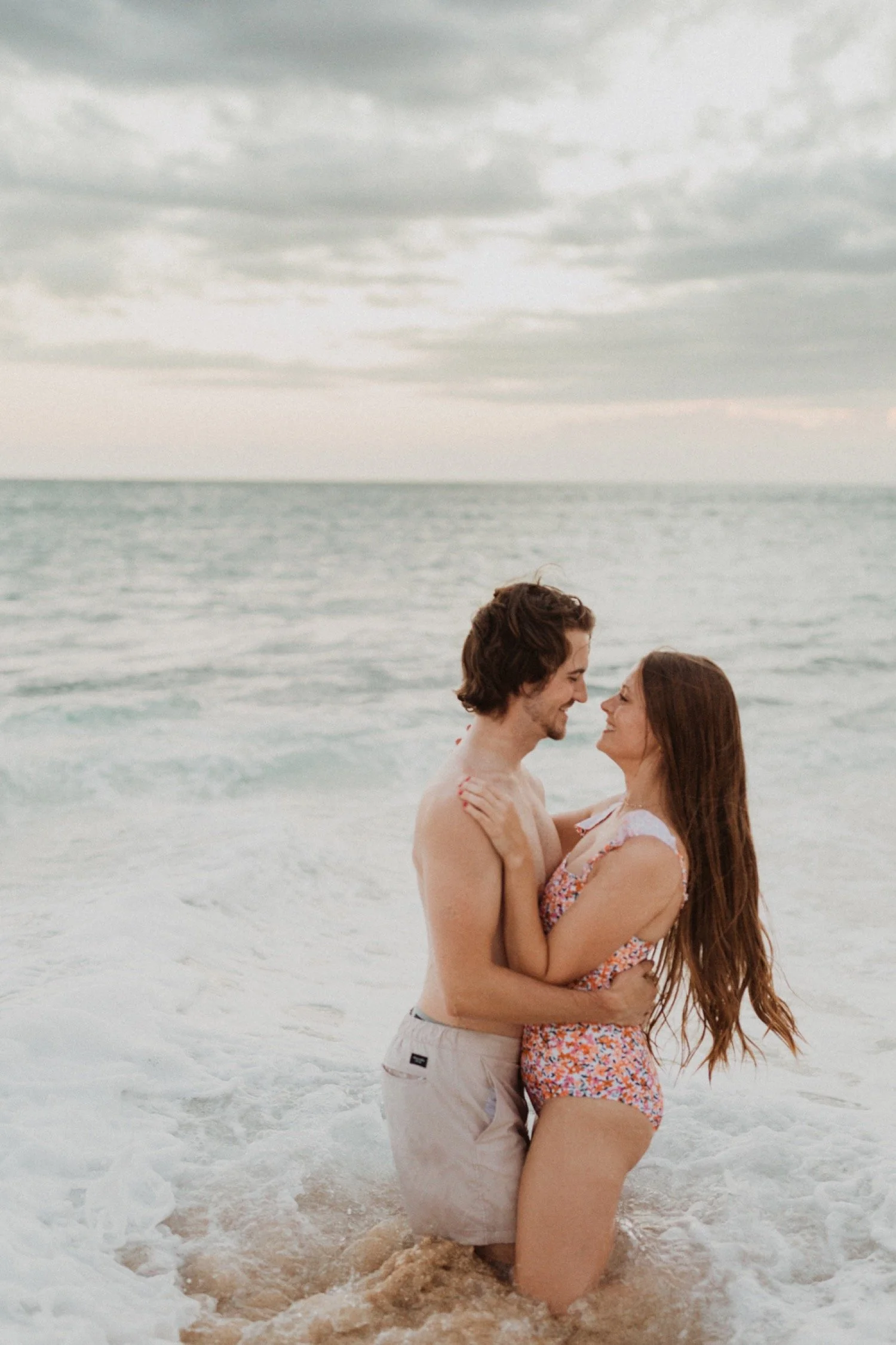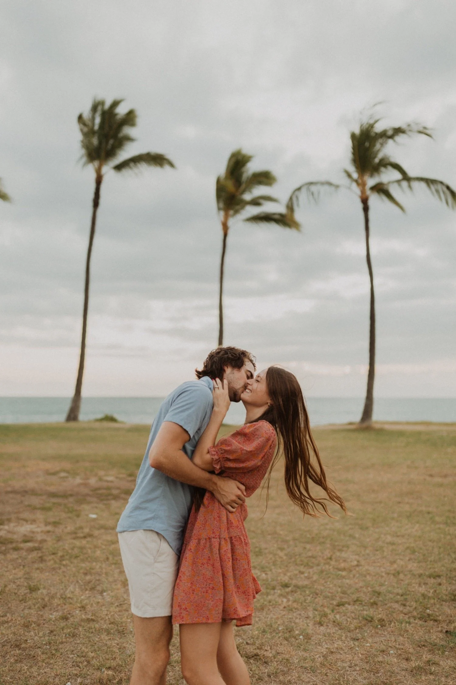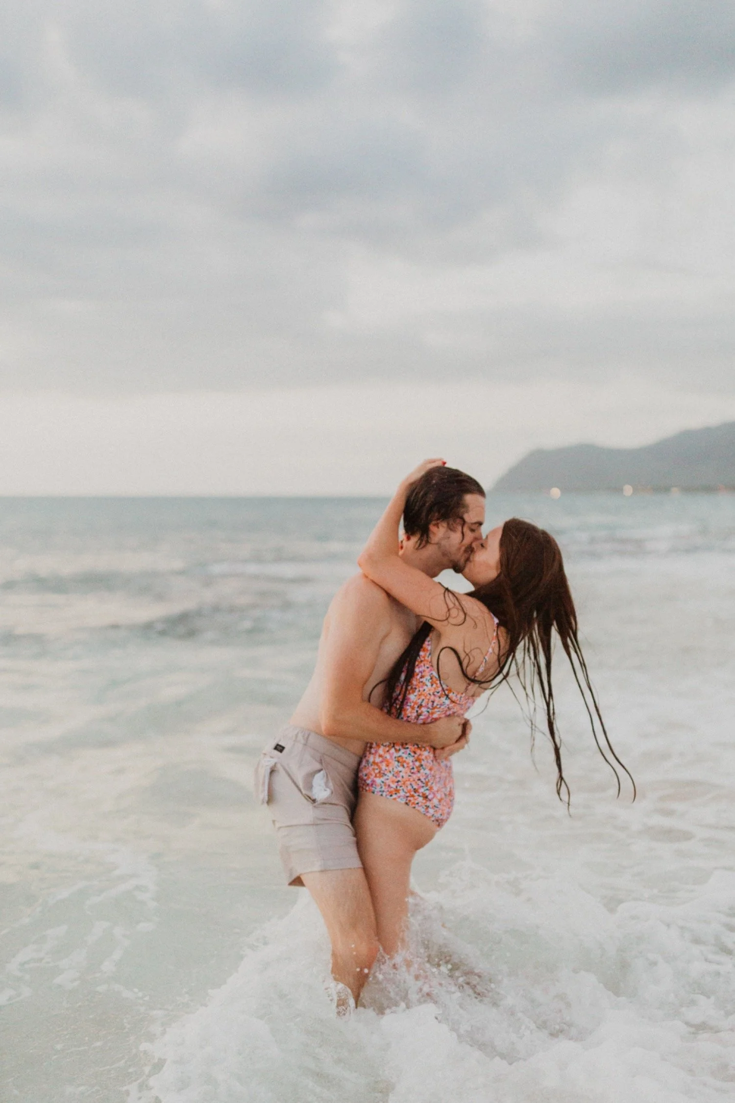 They were living in Hawaii for just a few months and wanted to get some photos before they moved back to the mainland. We went down to the beach on the west side of Oahu at sunset, for their couples session. It was a little overcast this day, but the beach was totally empty. We had so much fun getting shots in the water, and in front of the palm trees that were surrounding the beach. They are such an adventurous couple that radiate kindness and compassion and these photos showcase that perfectly.