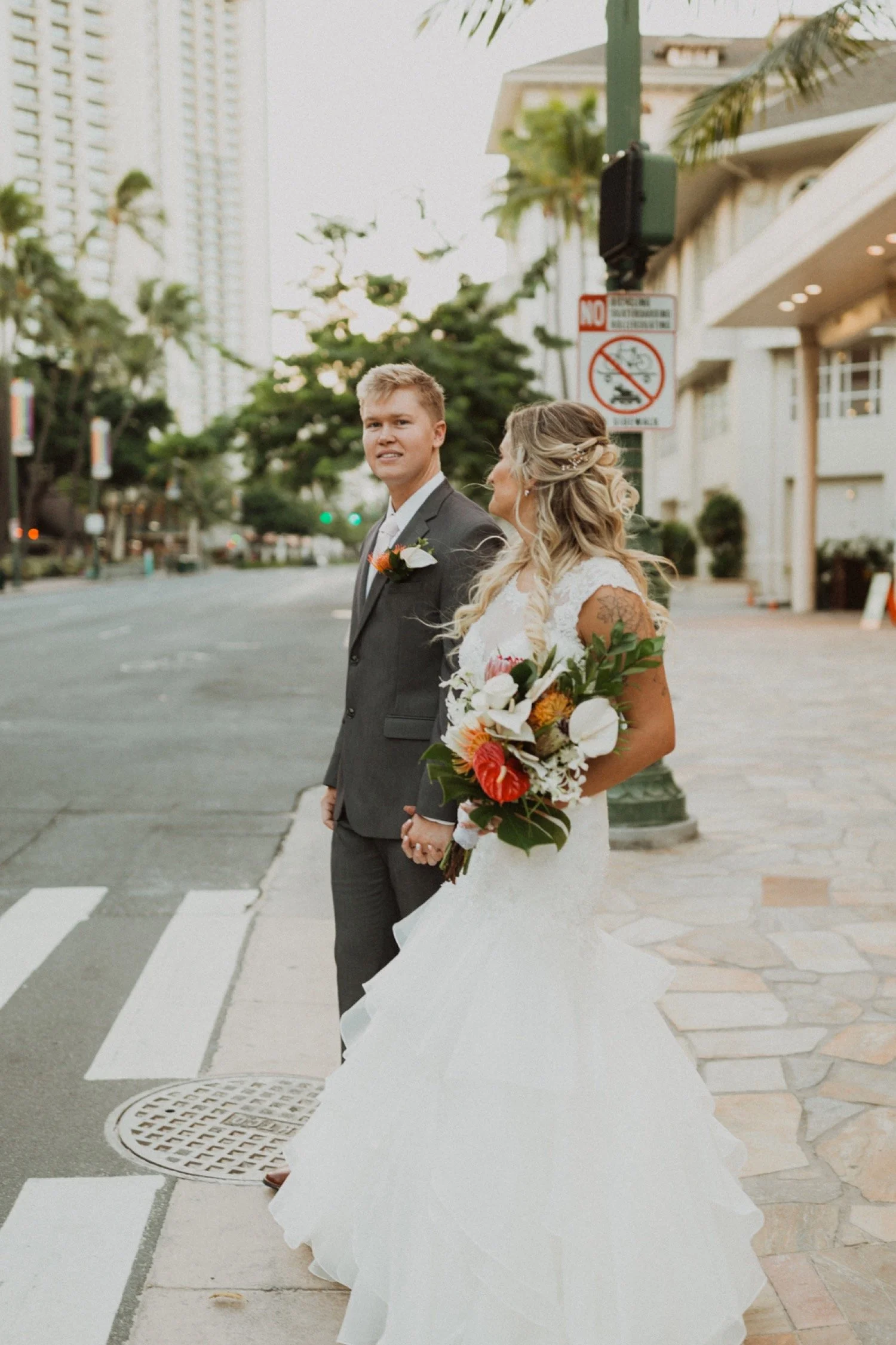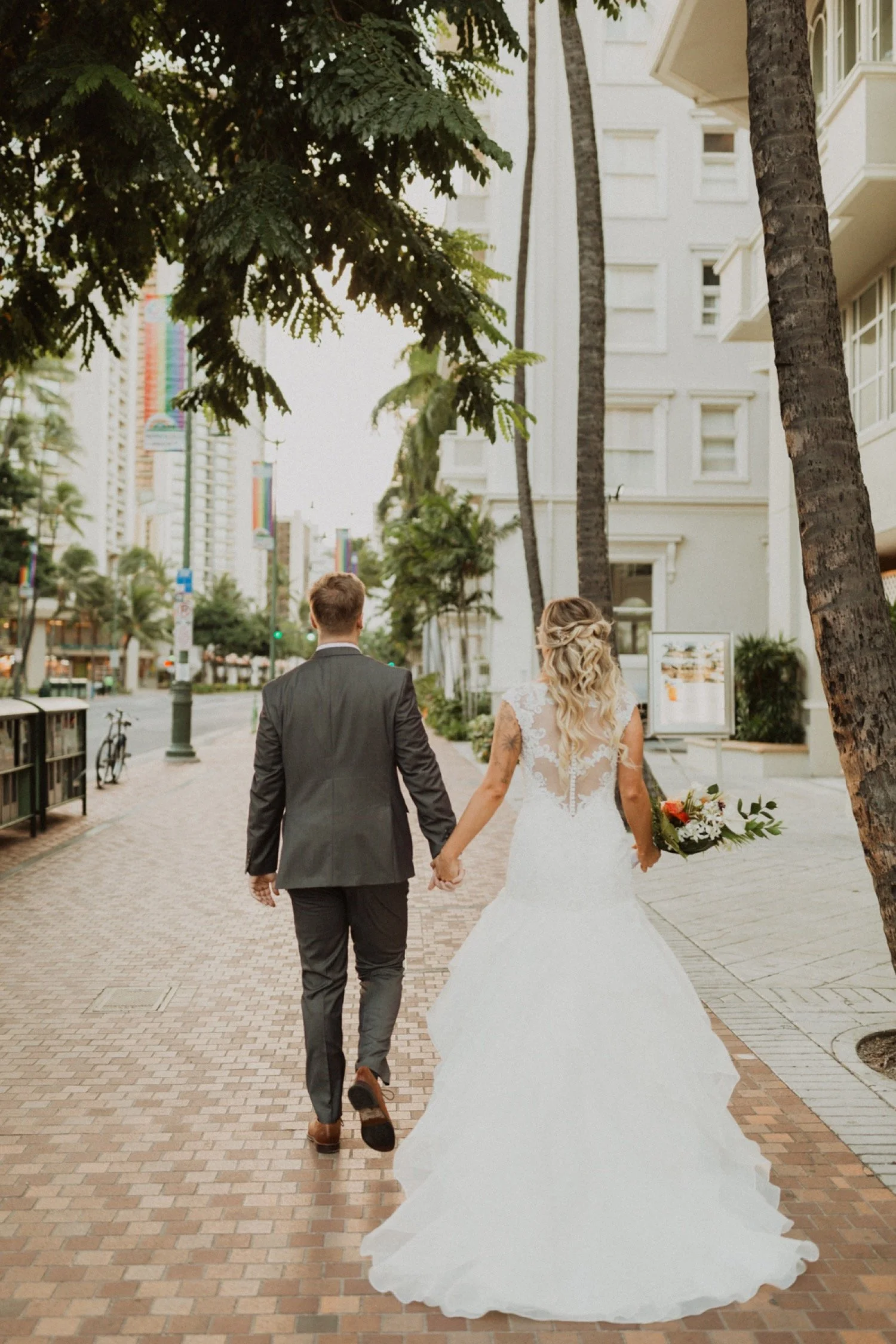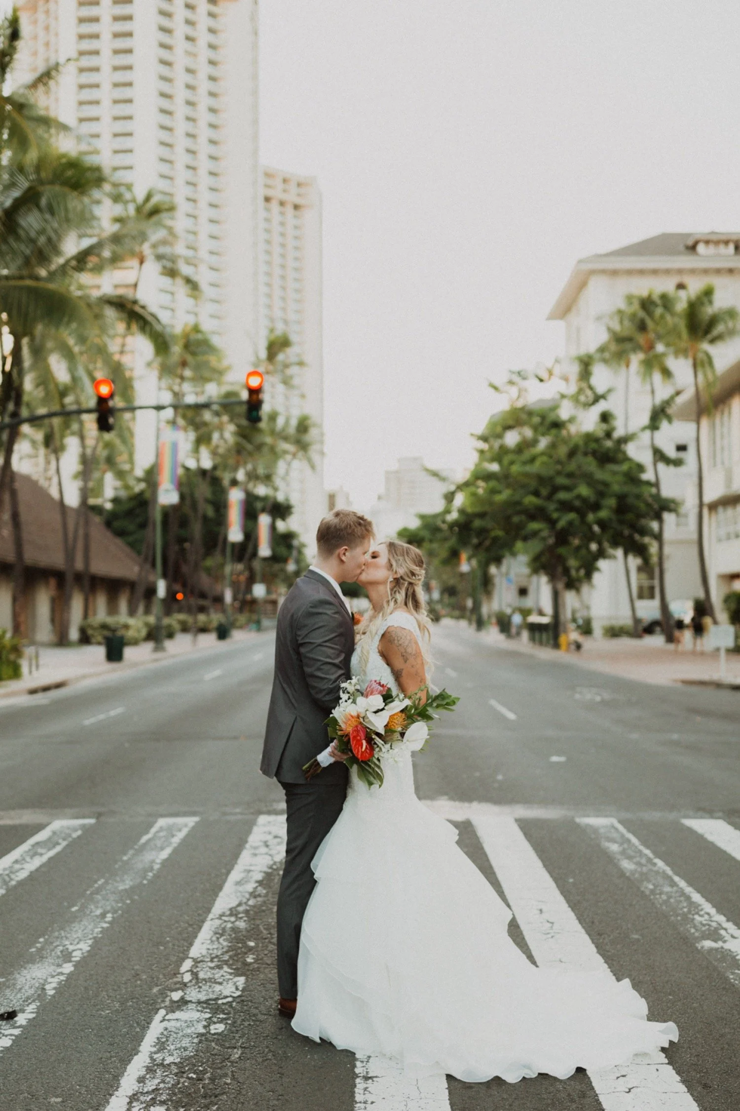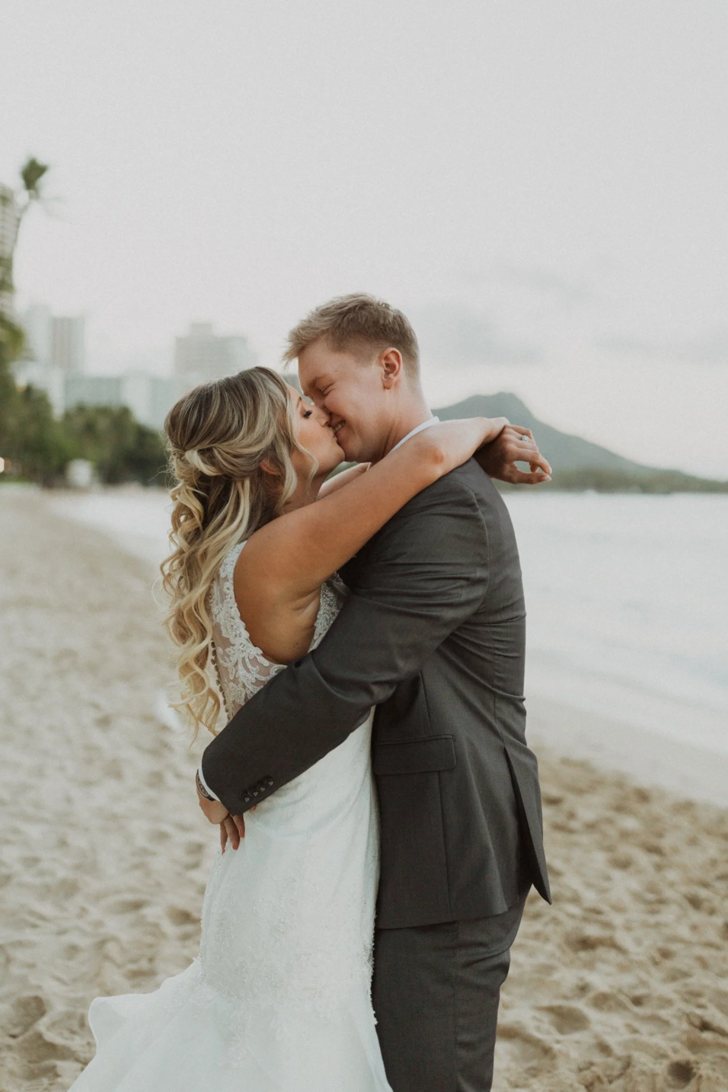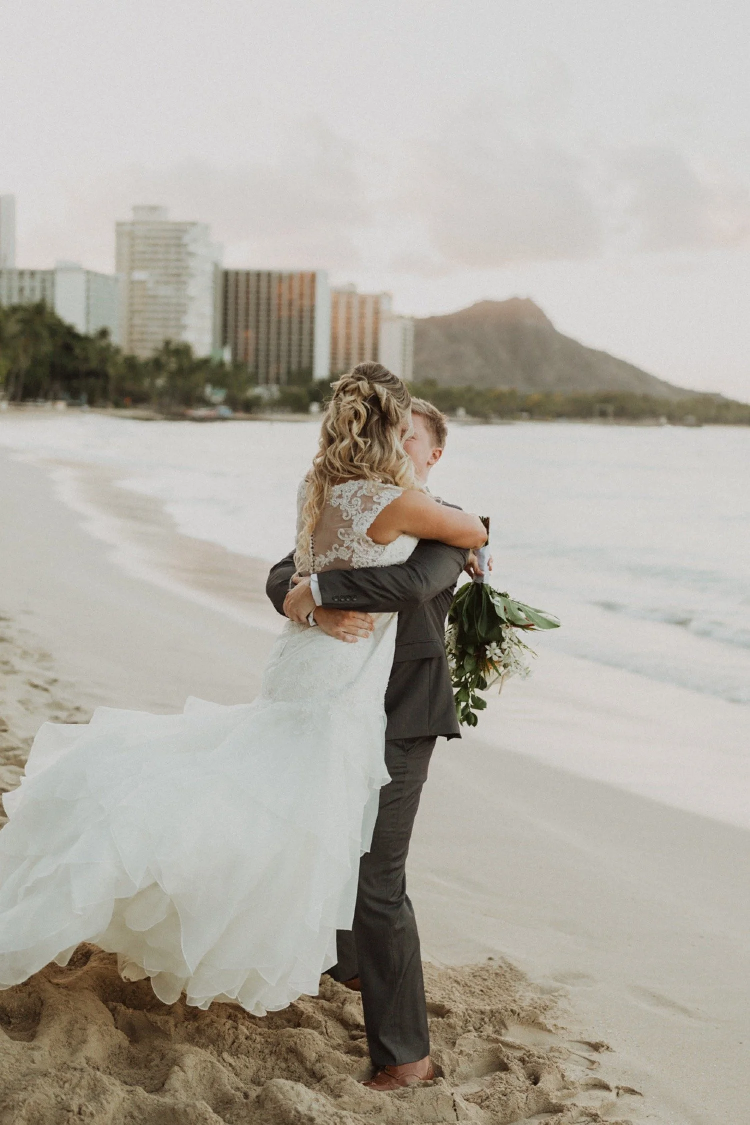 It was such a crazy time in the world, and in Hawaii. Hawaii was on lockdown, so no tourists were allowed to visit Hawaii during the time of their elopement. They had their first look at sunrise in Waikiki. If you’ve ever been to Waikiki, you know how crowded and crazy it can get. It reminds me of Disneyland with thousands of people sunbathing on the beach, and walking around town. It was such a special and unique moment for these two, the beauty of Waikiki and the most amazing view of diamond head, with not another person around. I will never forget the feeling of being at Waikiki, with an empty beach.