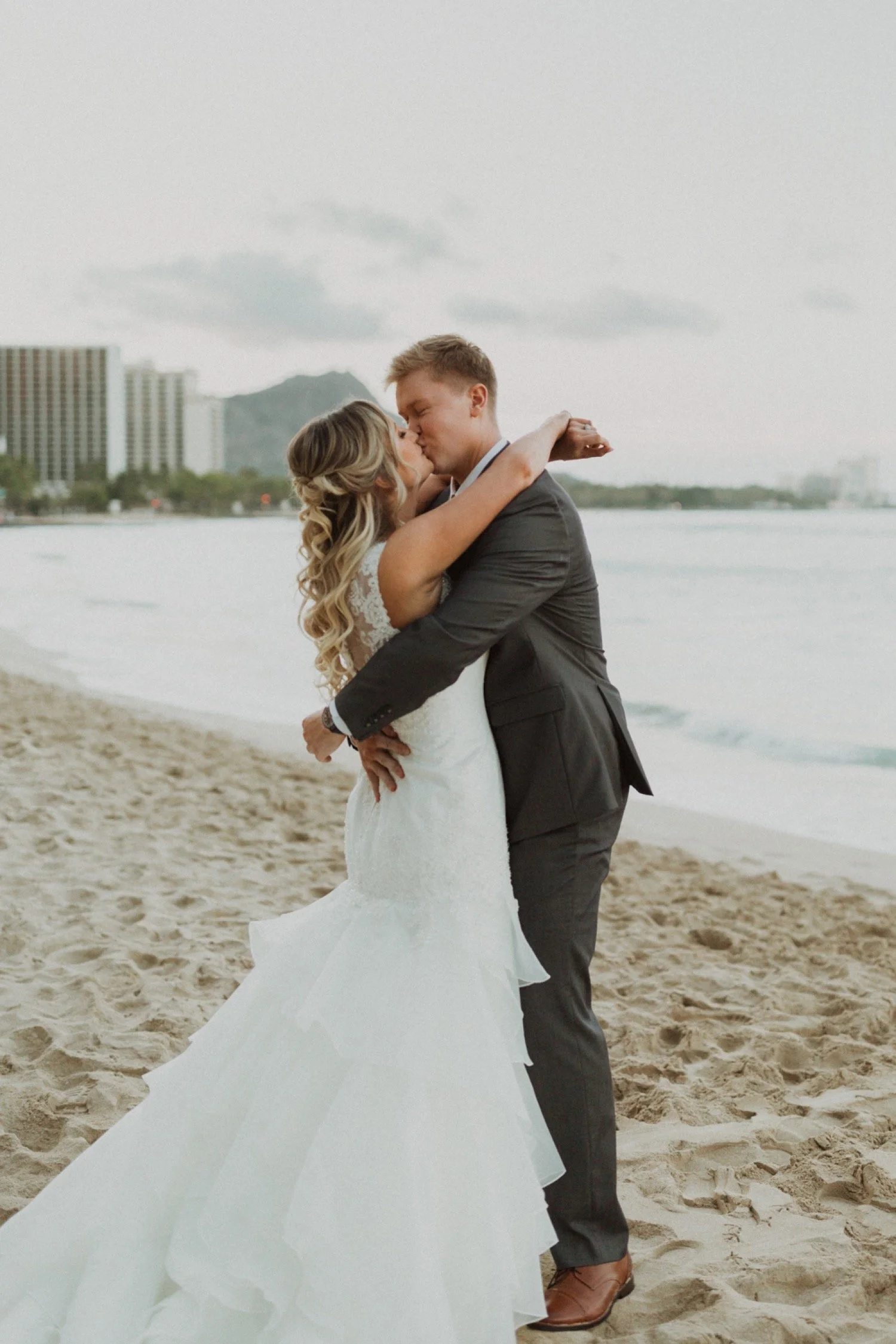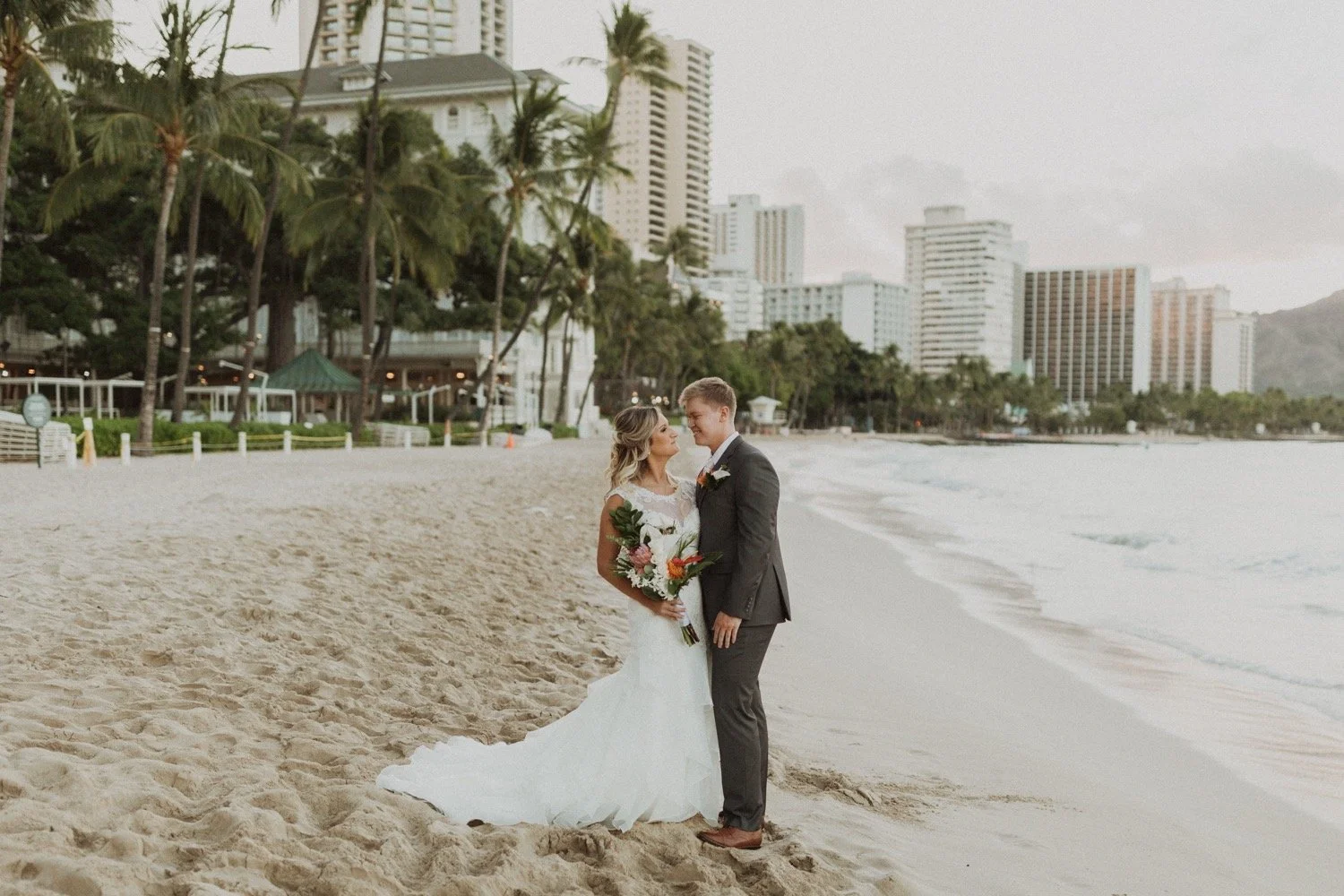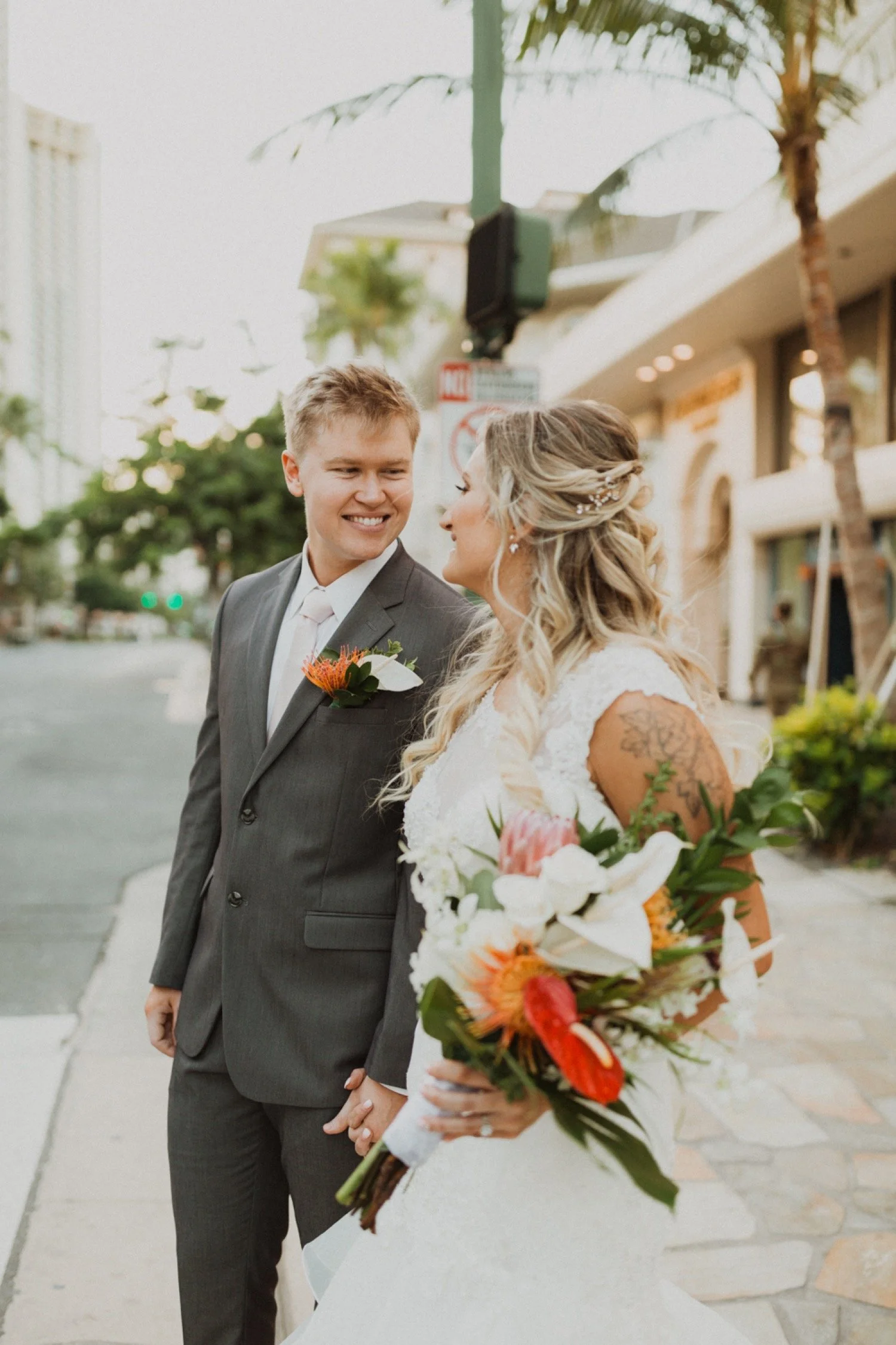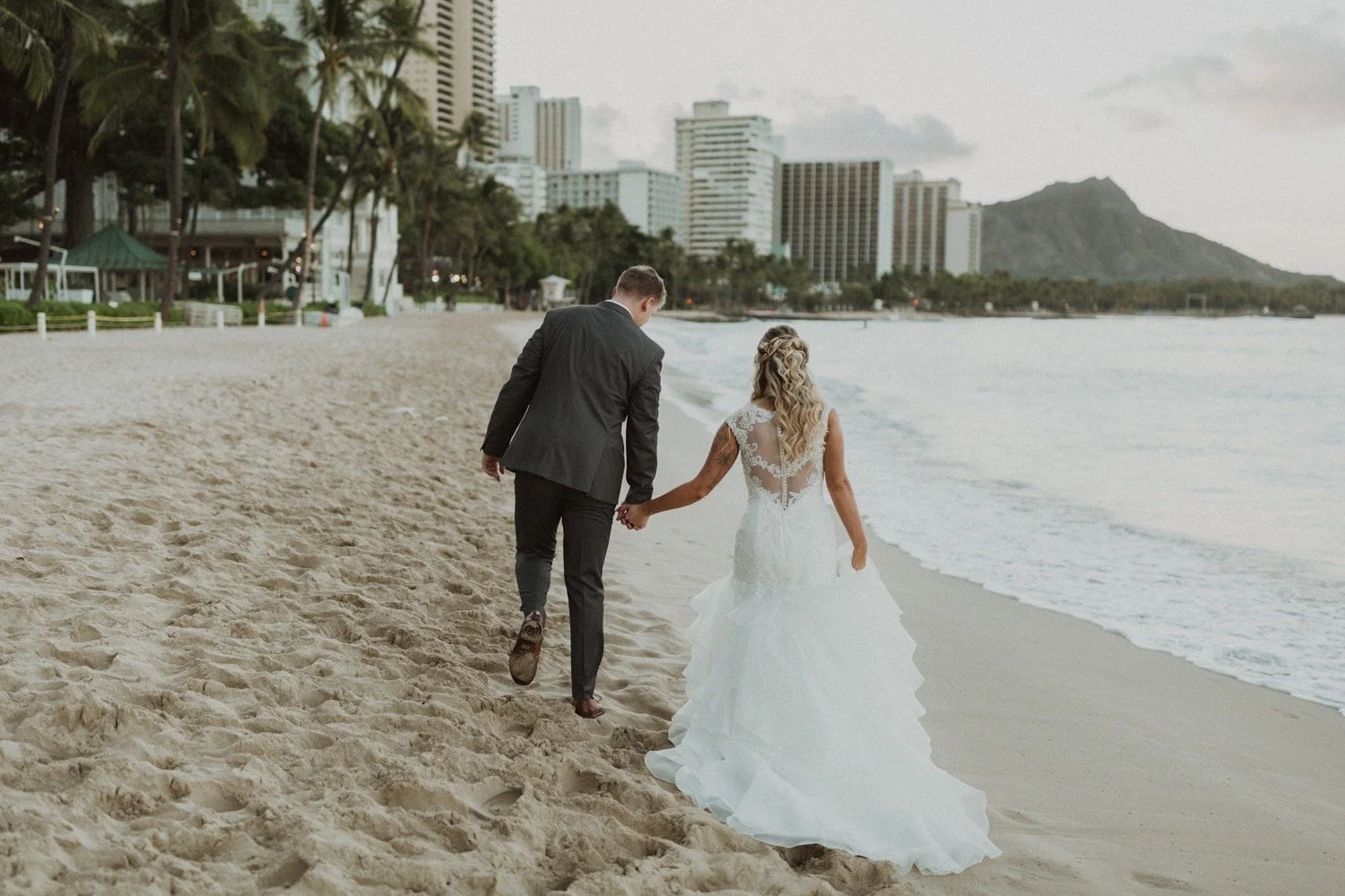 It was such a crazy time in the world, and in Hawaii. Hawaii was on lockdown, so no tourists were allowed to visit Hawaii during the time of their elopement. They had their first look at sunrise in Waikiki. If you’ve ever been to Waikiki, you know how crowded and crazy it can get. It reminds me of Disneyland with thousands of people sunbathing on the beach, and walking around town. It was such a special and unique moment for these two, the beauty of Waikiki and the most amazing view of diamond head, with not another person around. I will never forget the feeling of being at Waikiki, with an empty beach.