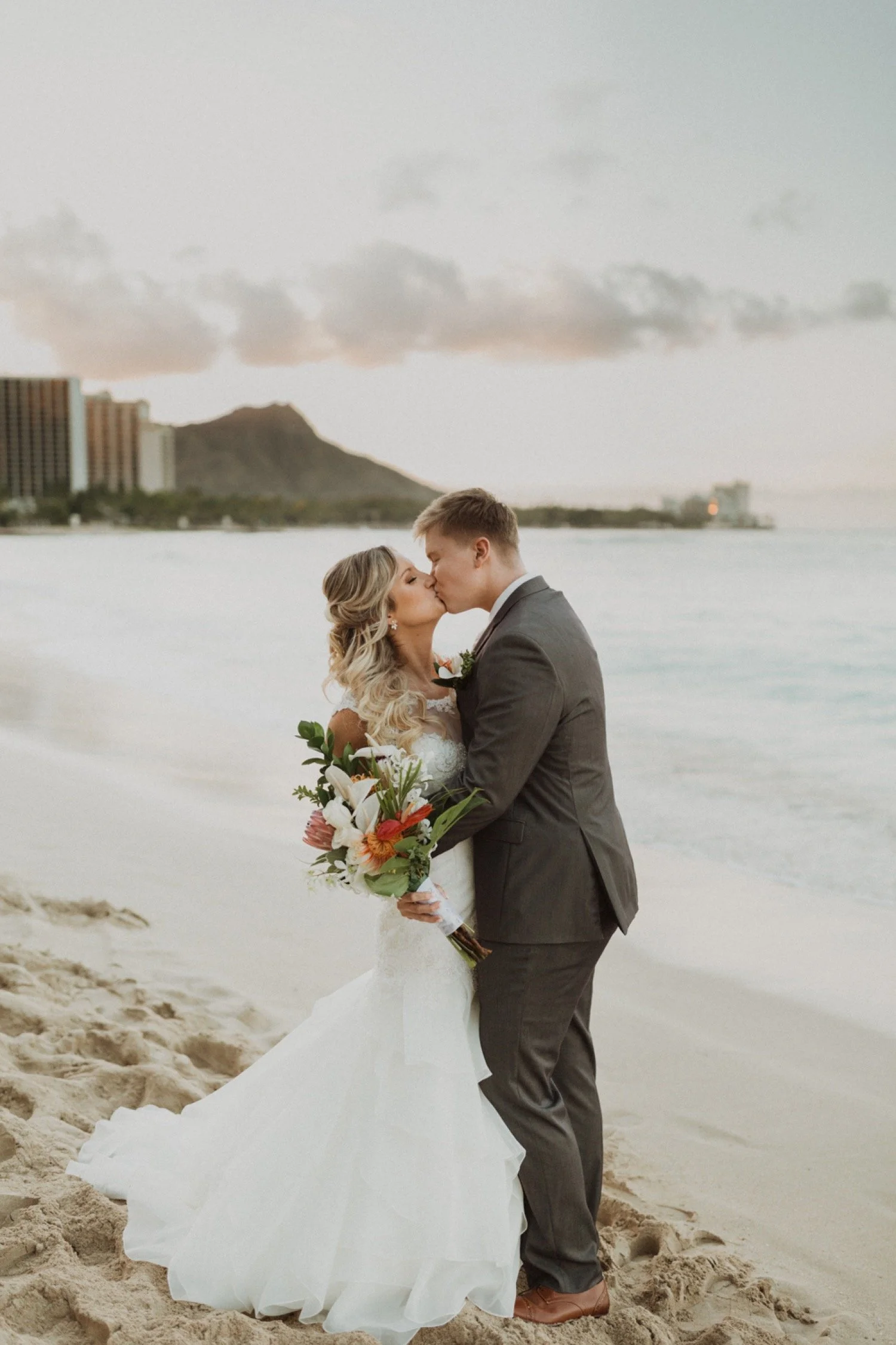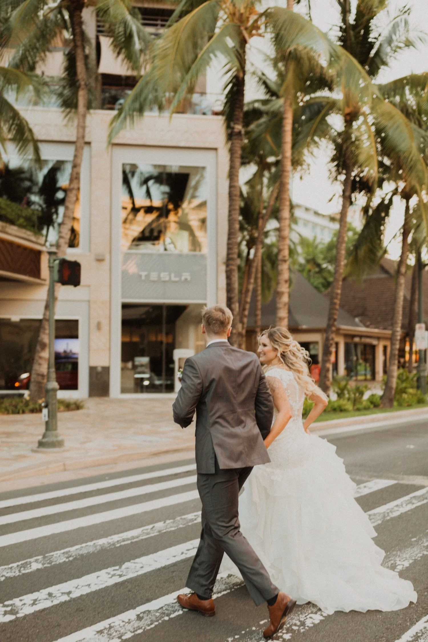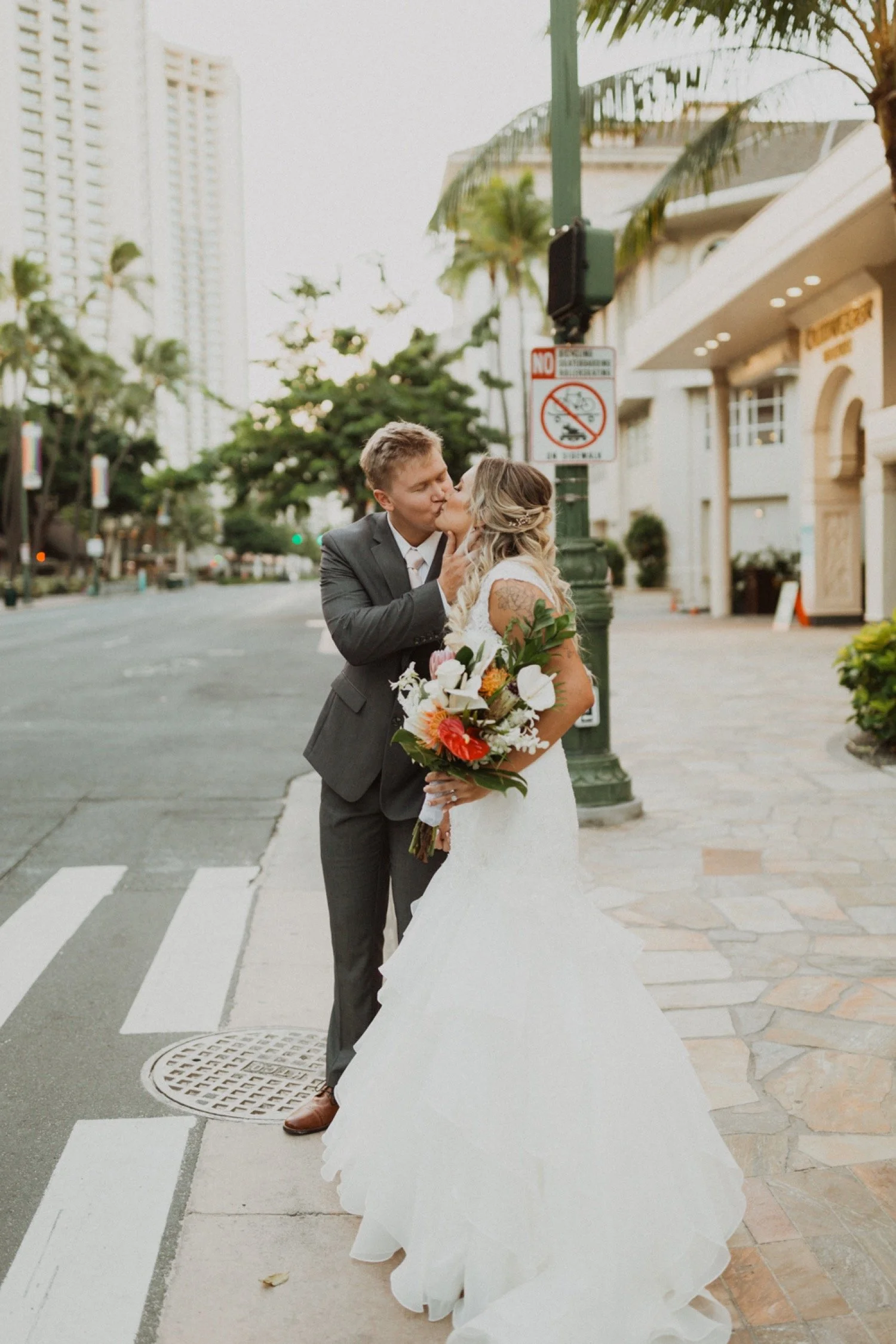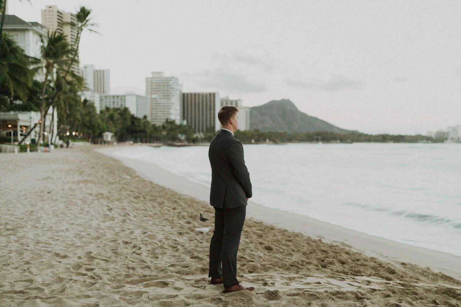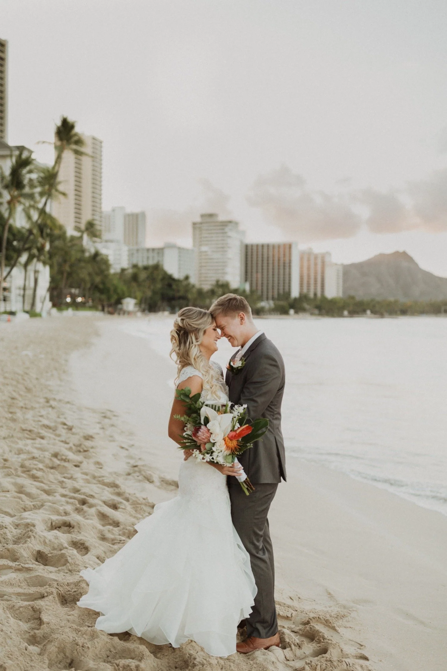 It was such a crazy time in the world, and in Hawaii. Hawaii was on lockdown, so no tourists were allowed to visit Hawaii during the time of their elopement. They had their first look at sunrise in Waikiki. If you’ve ever been to Waikiki, you know how crowded and crazy it can get. It reminds me of Disneyland with thousands of people sunbathing on the beach, and walking around town. It was such a special and unique moment for these two, the beauty of Waikiki and the most amazing view of diamond head, with not another person around. I will never forget the feeling of being at Waikiki, with an empty beach.