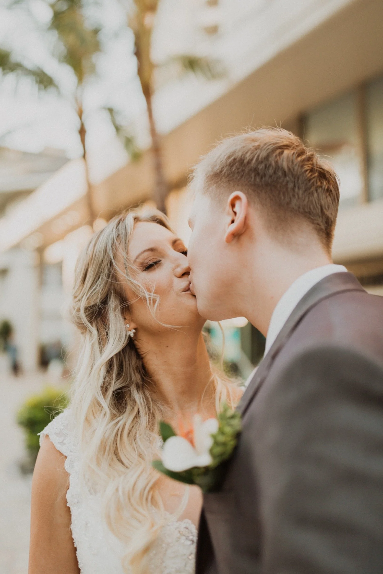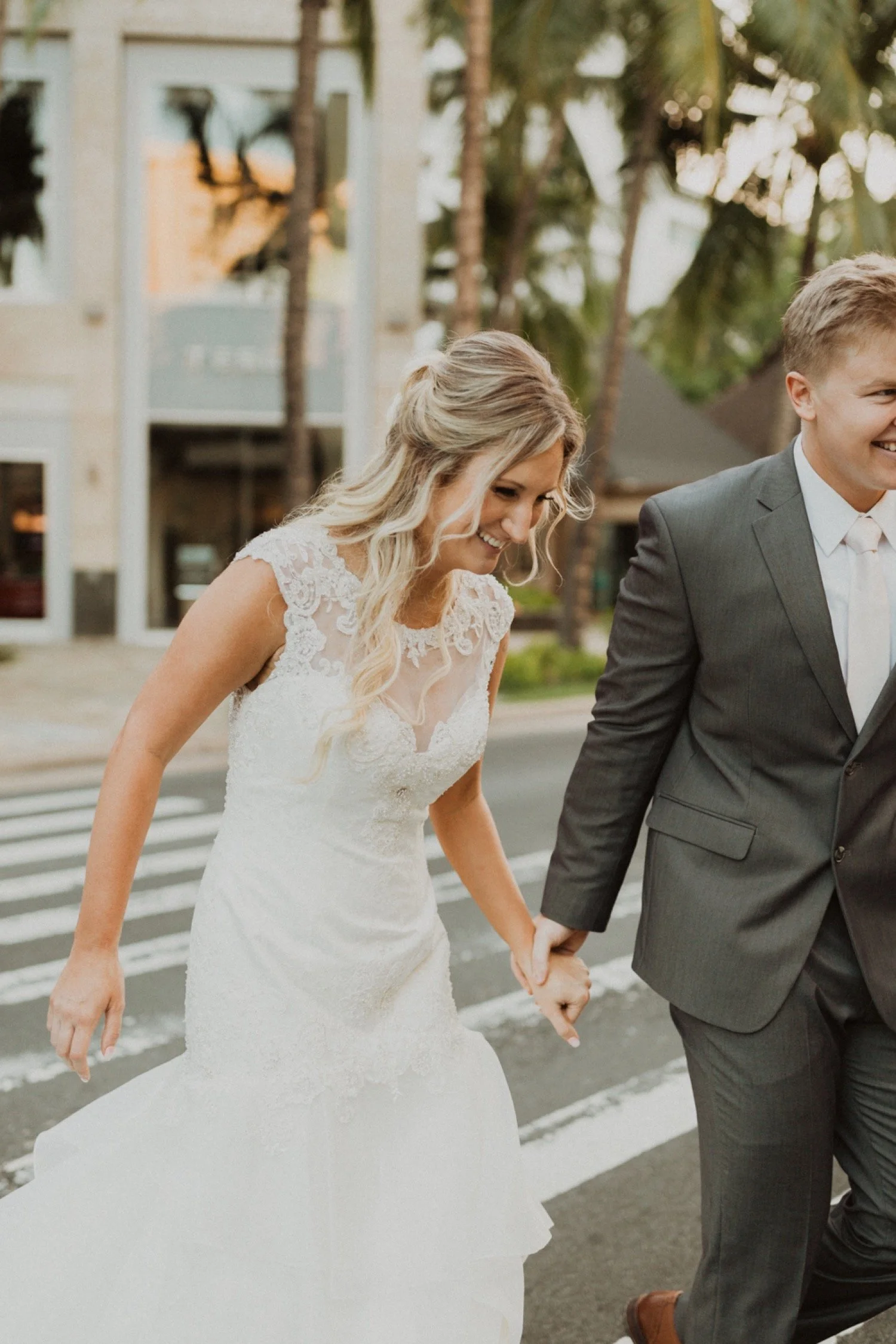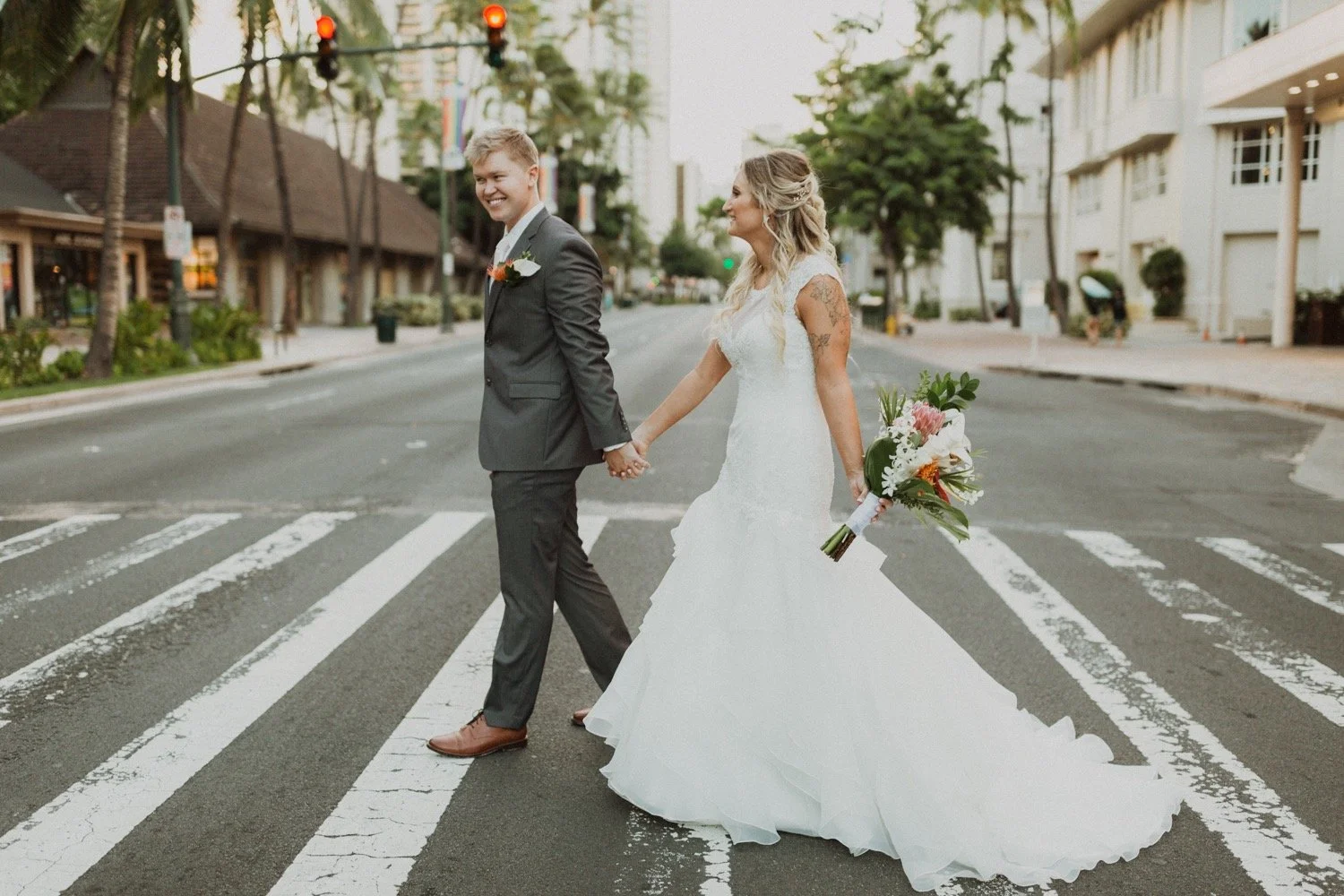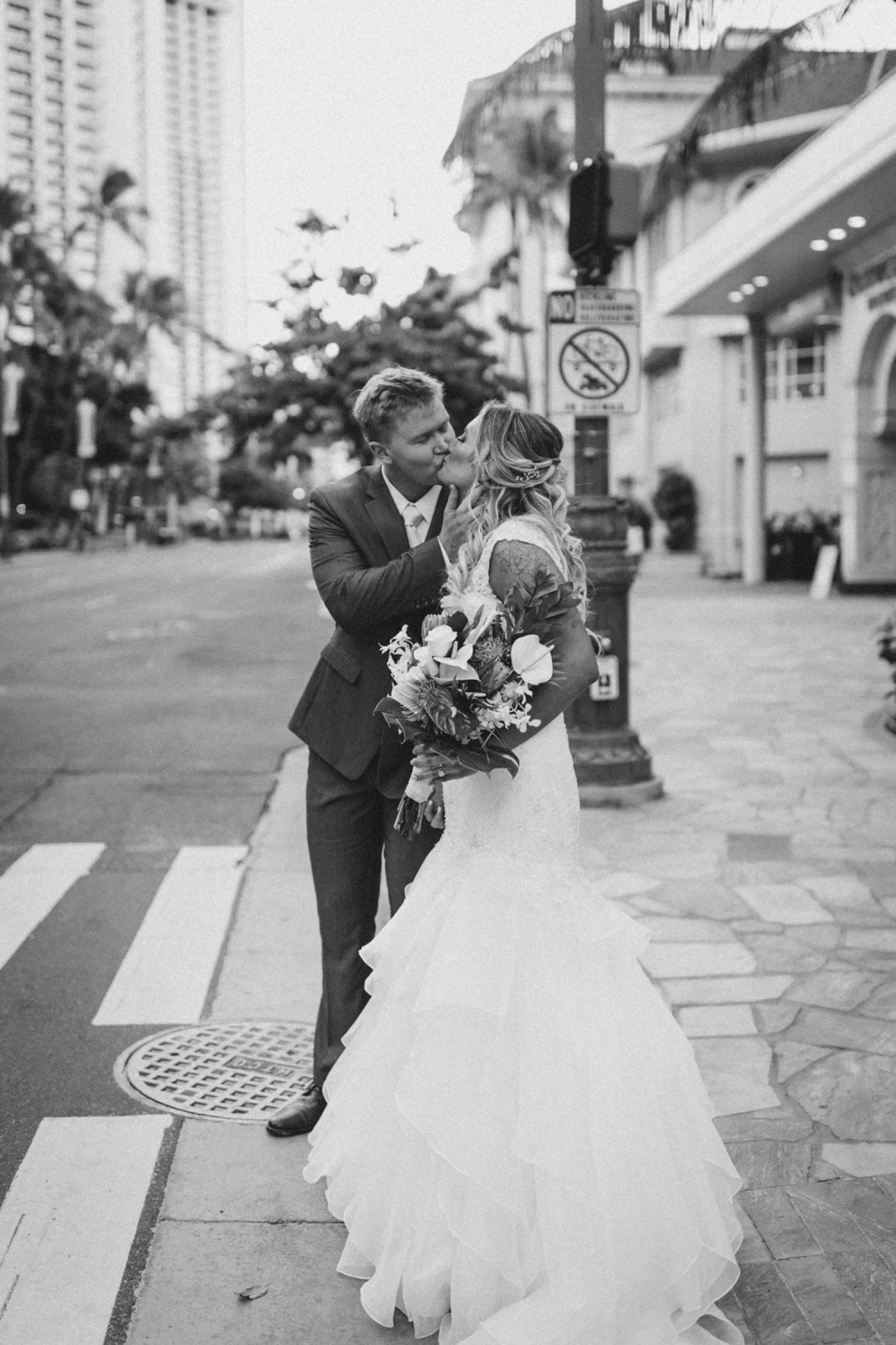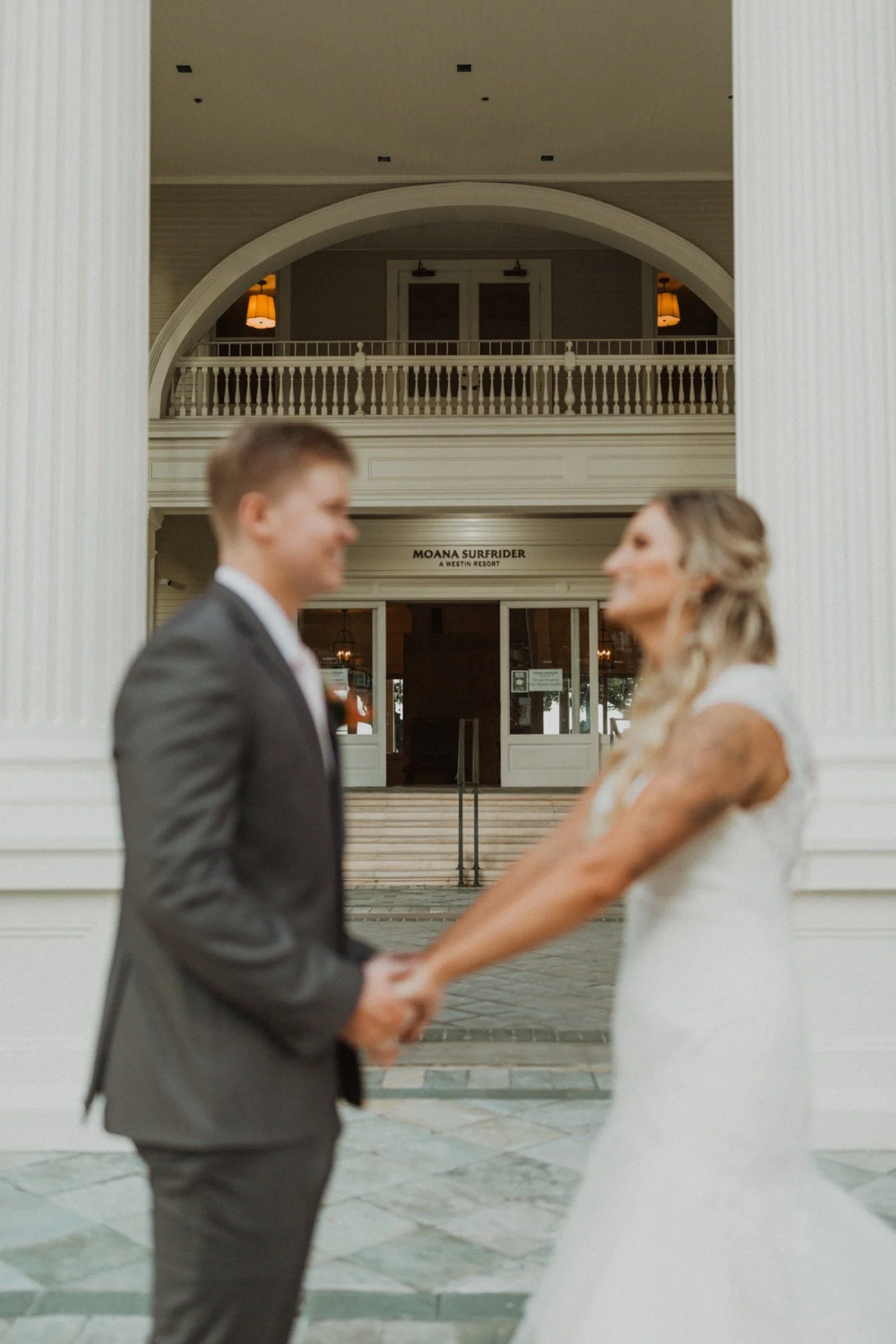 It was such a crazy time in the world, and in Hawaii. Hawaii was on lockdown, so no tourists were allowed to visit Hawaii during the time of their elopement. They had their first look at sunrise in Waikiki. If you’ve ever been to Waikiki, you know how crowded and crazy it can get. It reminds me of Disneyland with thousands of people sunbathing on the beach, and walking around town. It was such a special and unique moment for these two, the beauty of Waikiki and the most amazing view of diamond head, with not another person around. I will never forget the feeling of being at Waikiki, with an empty beach.