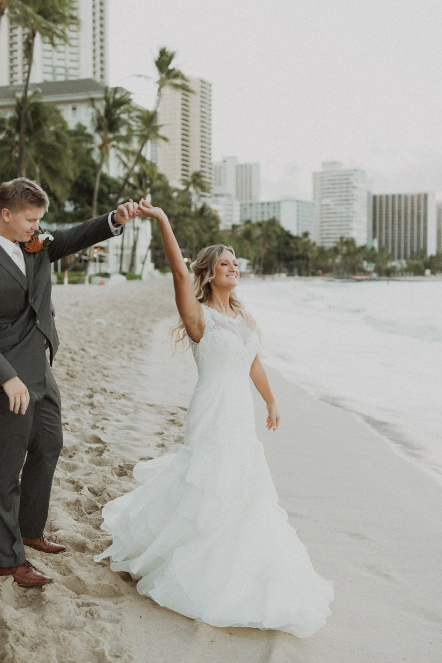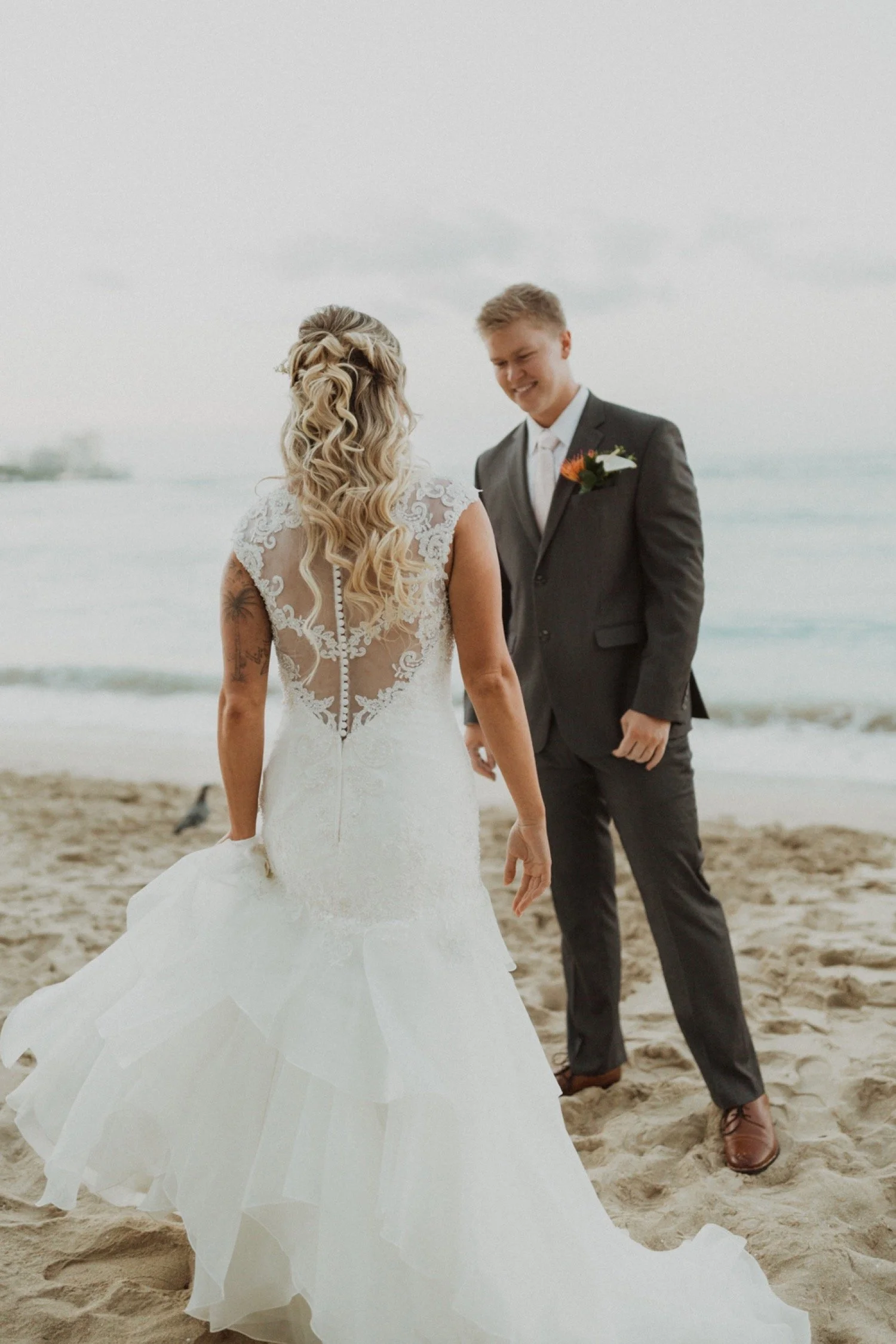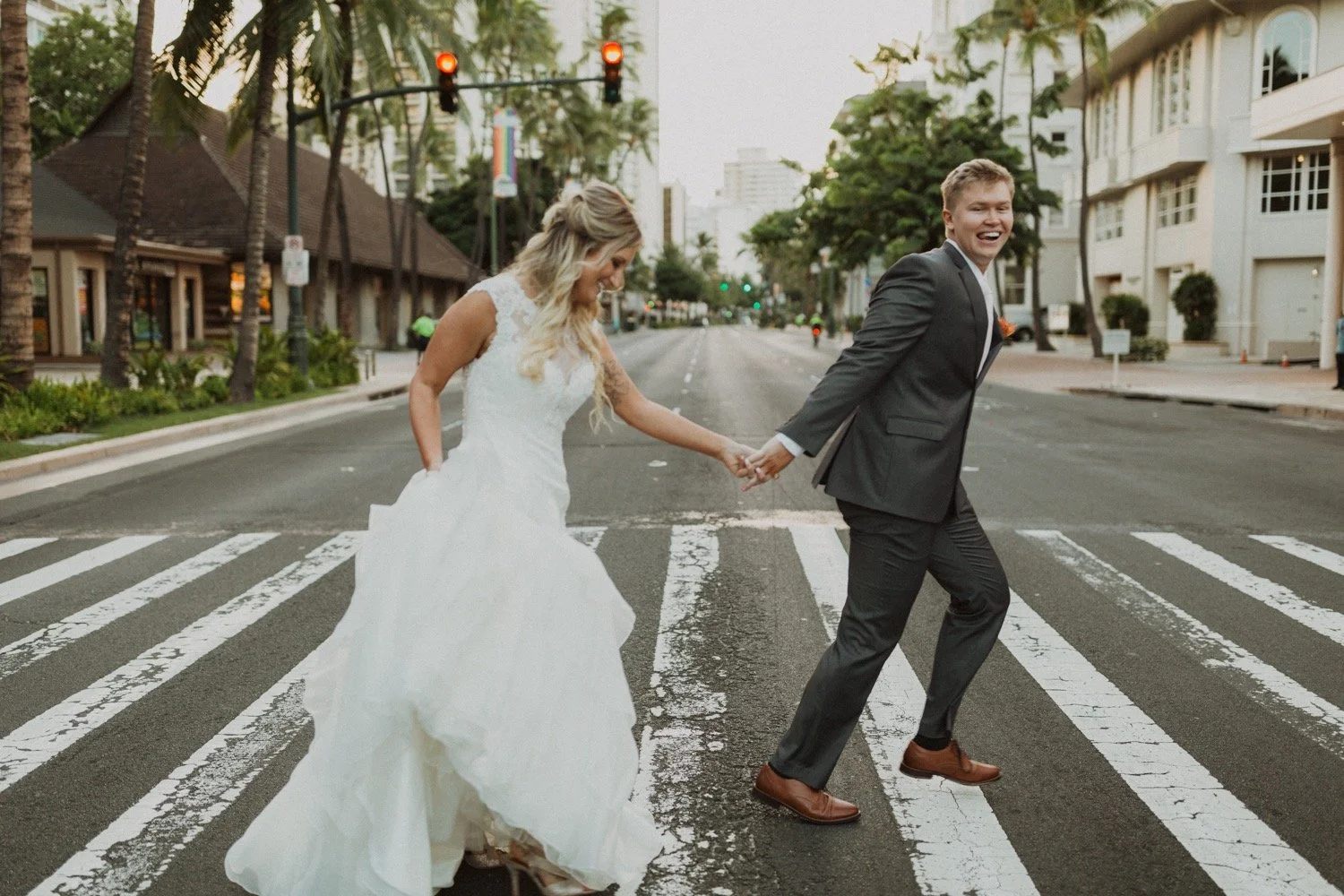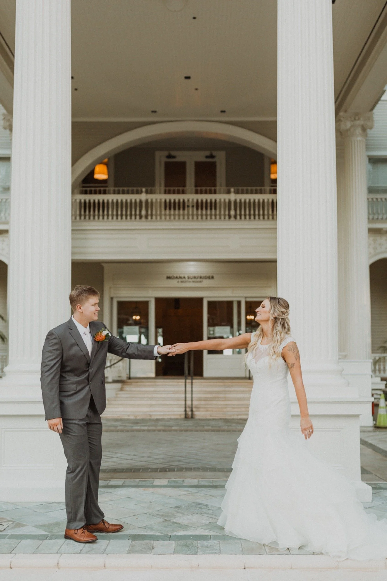 It was such a crazy time in the world, and in Hawaii. Hawaii was on lockdown, so no tourists were allowed to visit Hawaii during the time of their elopement. They had their first look at sunrise in Waikiki. If you’ve ever been to Waikiki, you know how crowded and crazy it can get. It reminds me of Disneyland with thousands of people sunbathing on the beach, and walking around town. It was such a special and unique moment for these two, the beauty of Waikiki and the most amazing view of diamond head, with not another person around. I will never forget the feeling of being at Waikiki, with an empty beach.