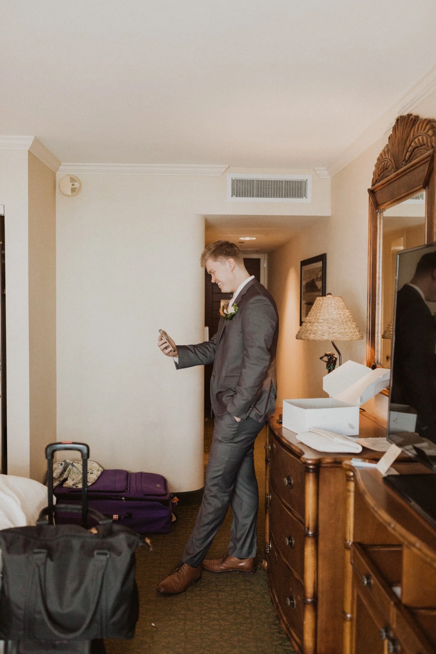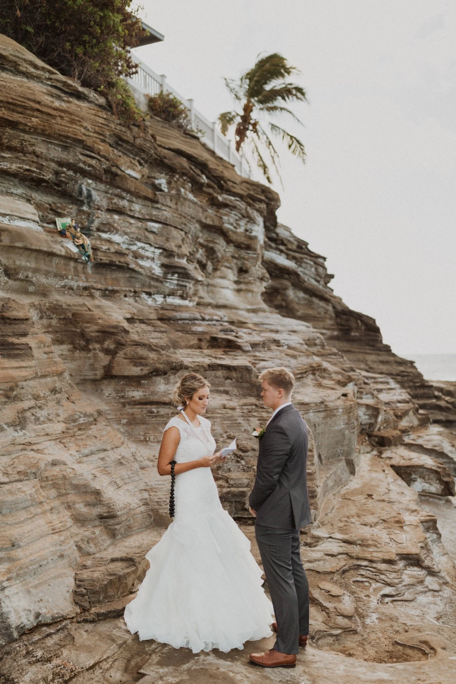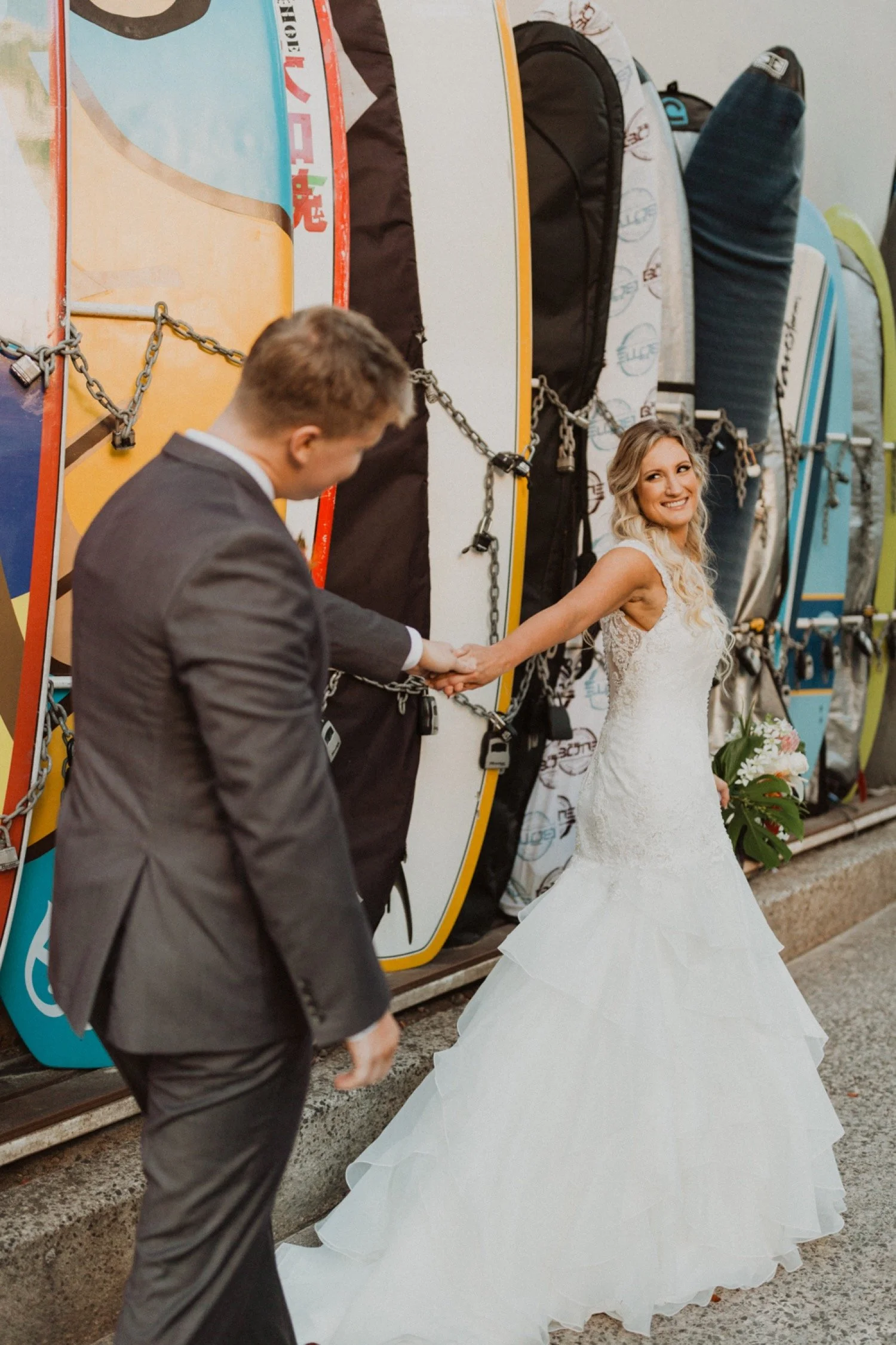 Having the whole city to ourselves was so much fun. We got such amazing photos of the soon to be bride and groom running around town, in the streets, by the local surfboard rental shop and on the secluded beach. After the first look session, Kullen and Kayla headed back to the hotel to get ready for their Cliffside elopement. They got to talk with family, and friends and get out their nerves over FaceTime.