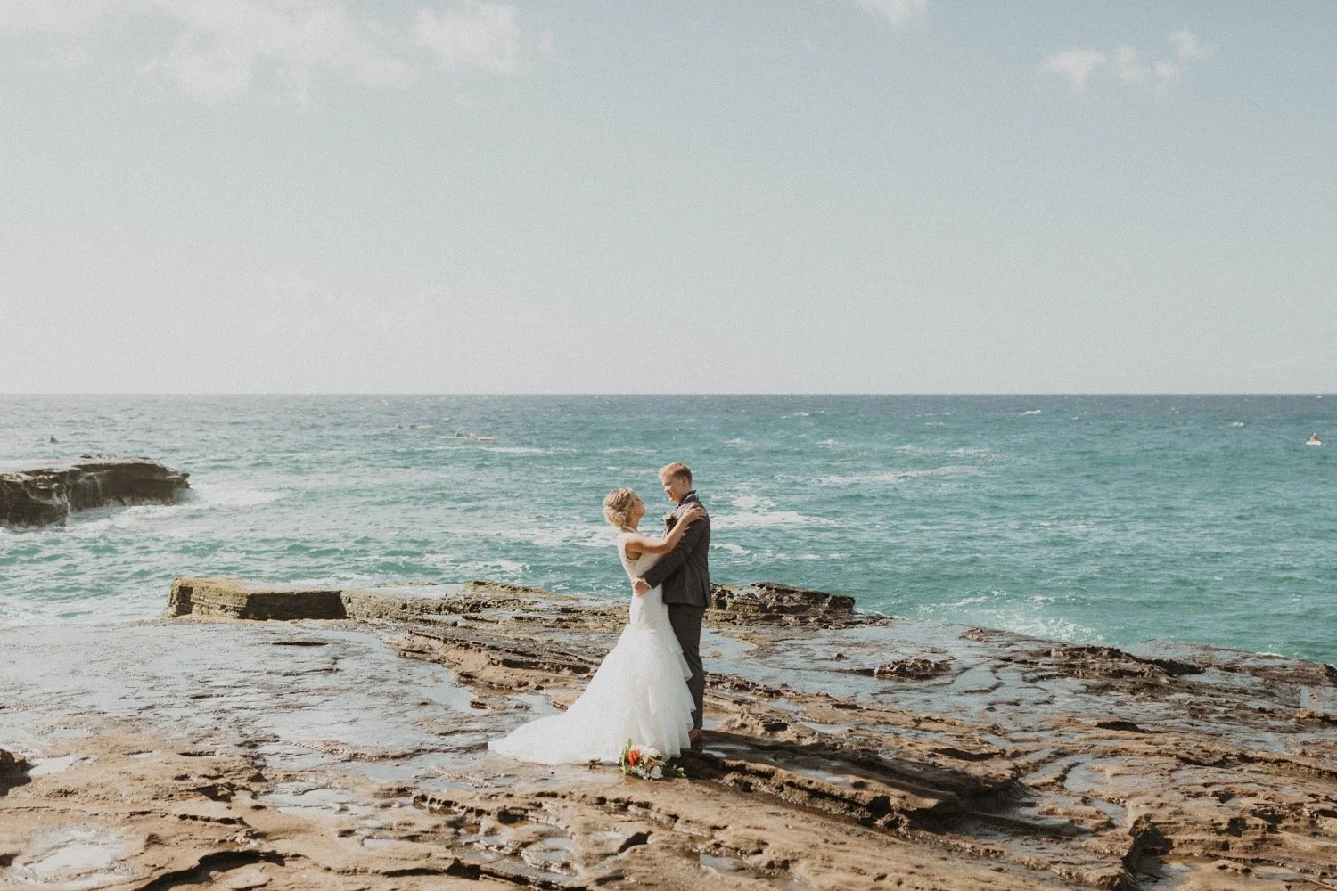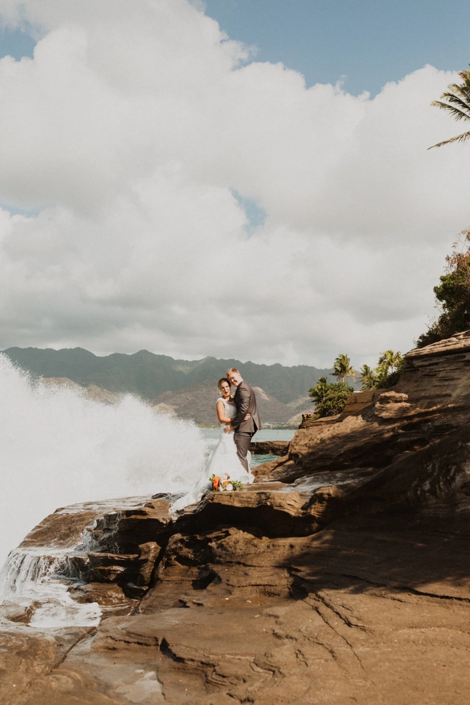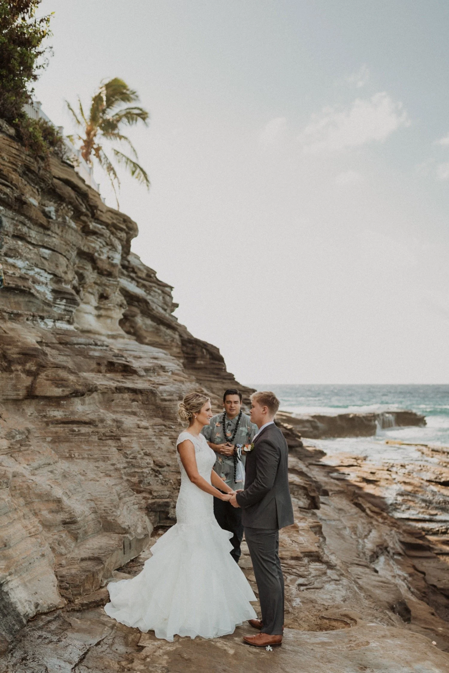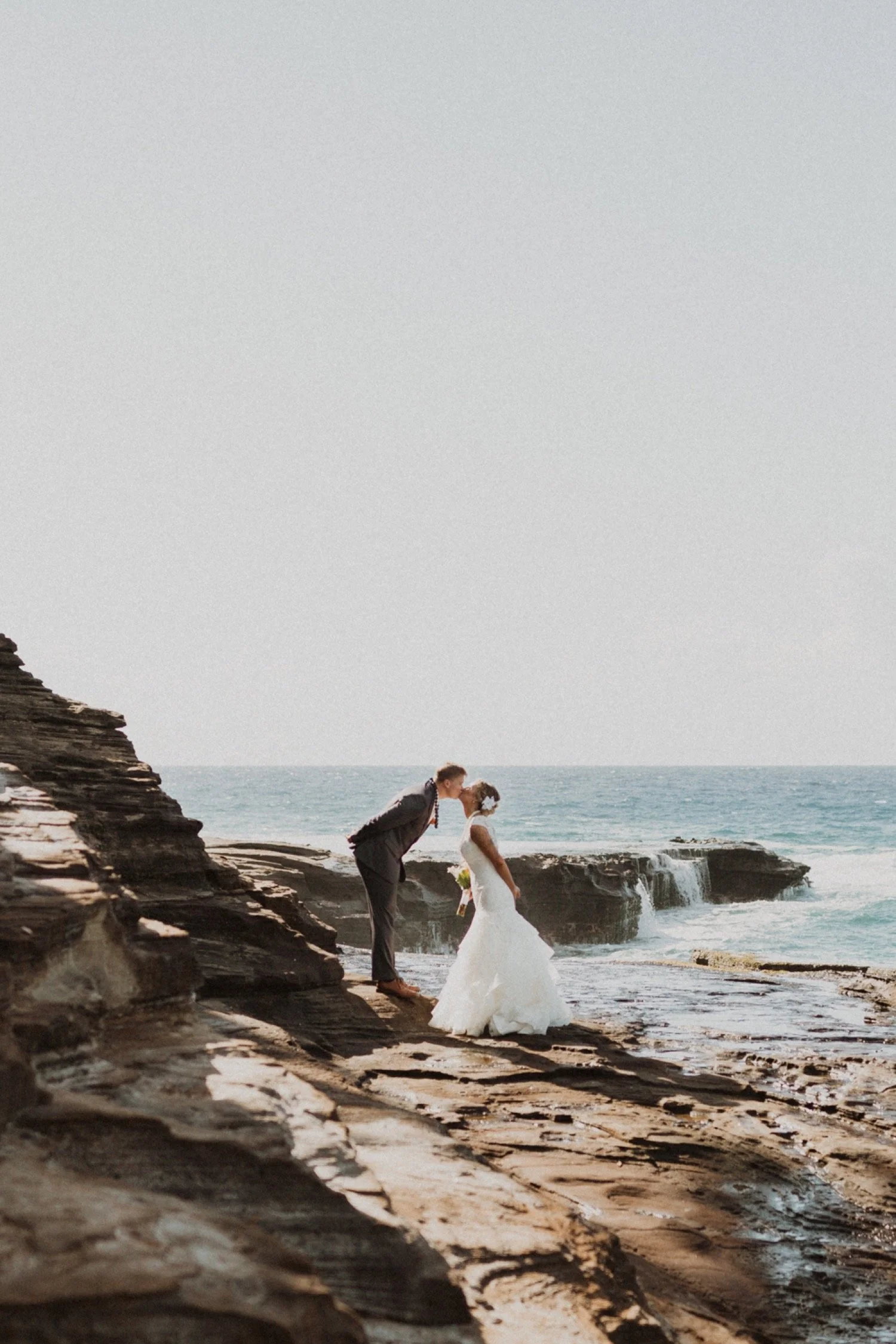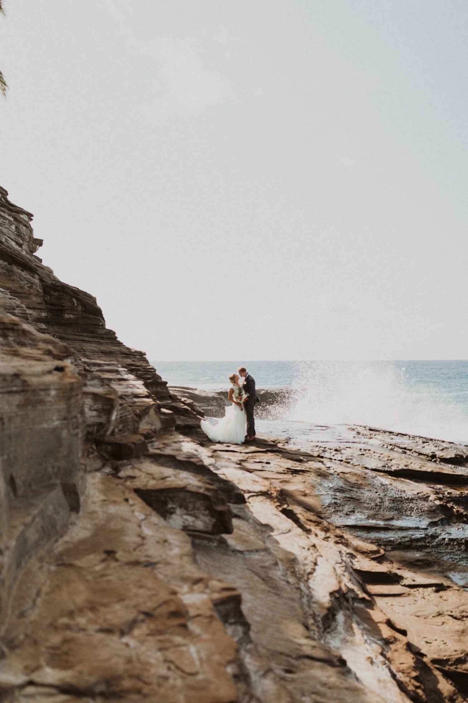 We then, headed to the east side of Oahu, for their cliffside elopement. This side of the Island was also very quiet and intimate for their official elopement. We went to the most beautiful spot, a cliffside beach surrounded by Hawaii’s blue ocean, palm trees and rocky tide pools. It was the perfect place for their day.