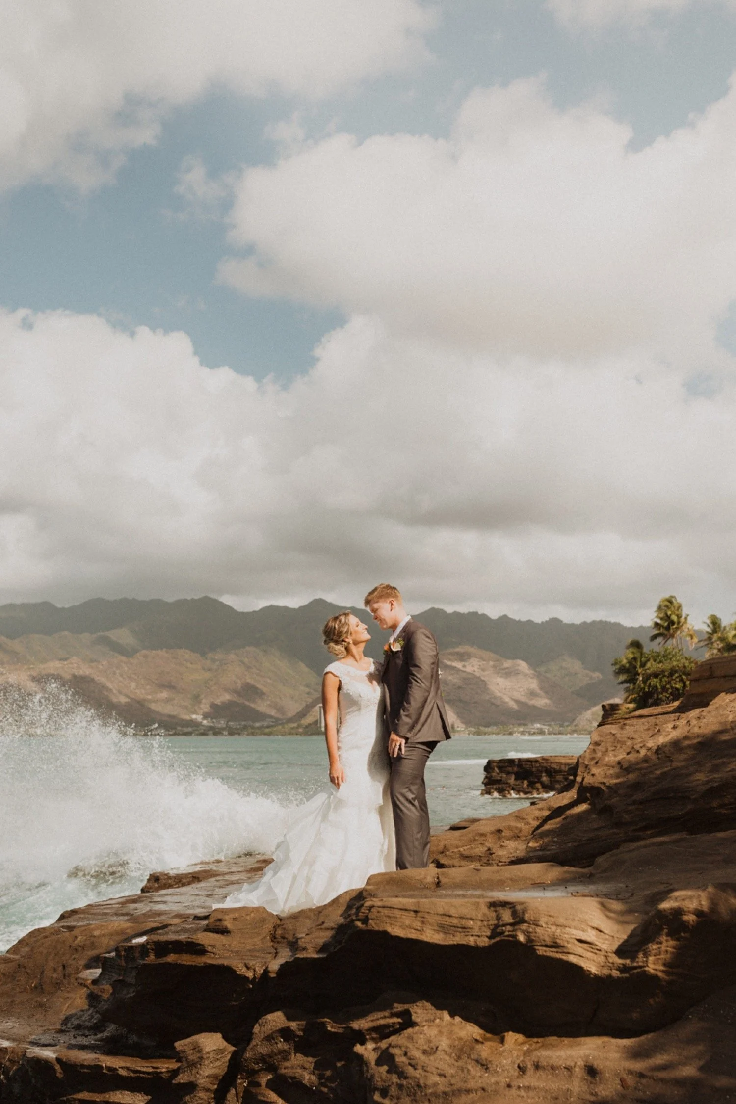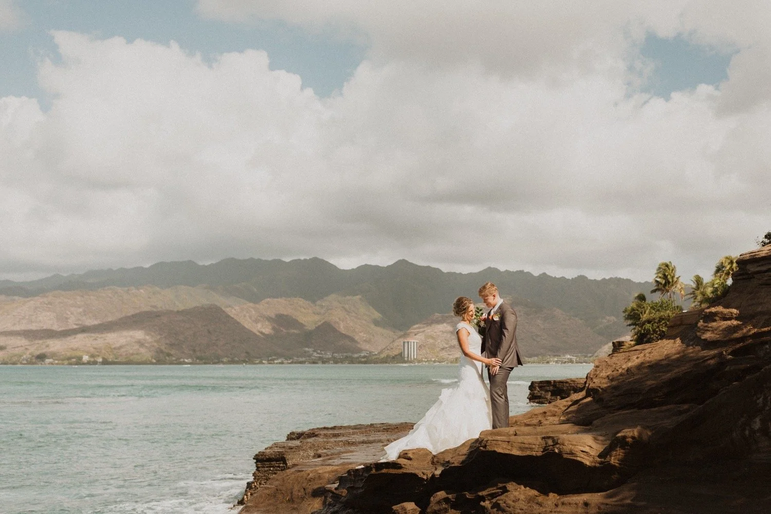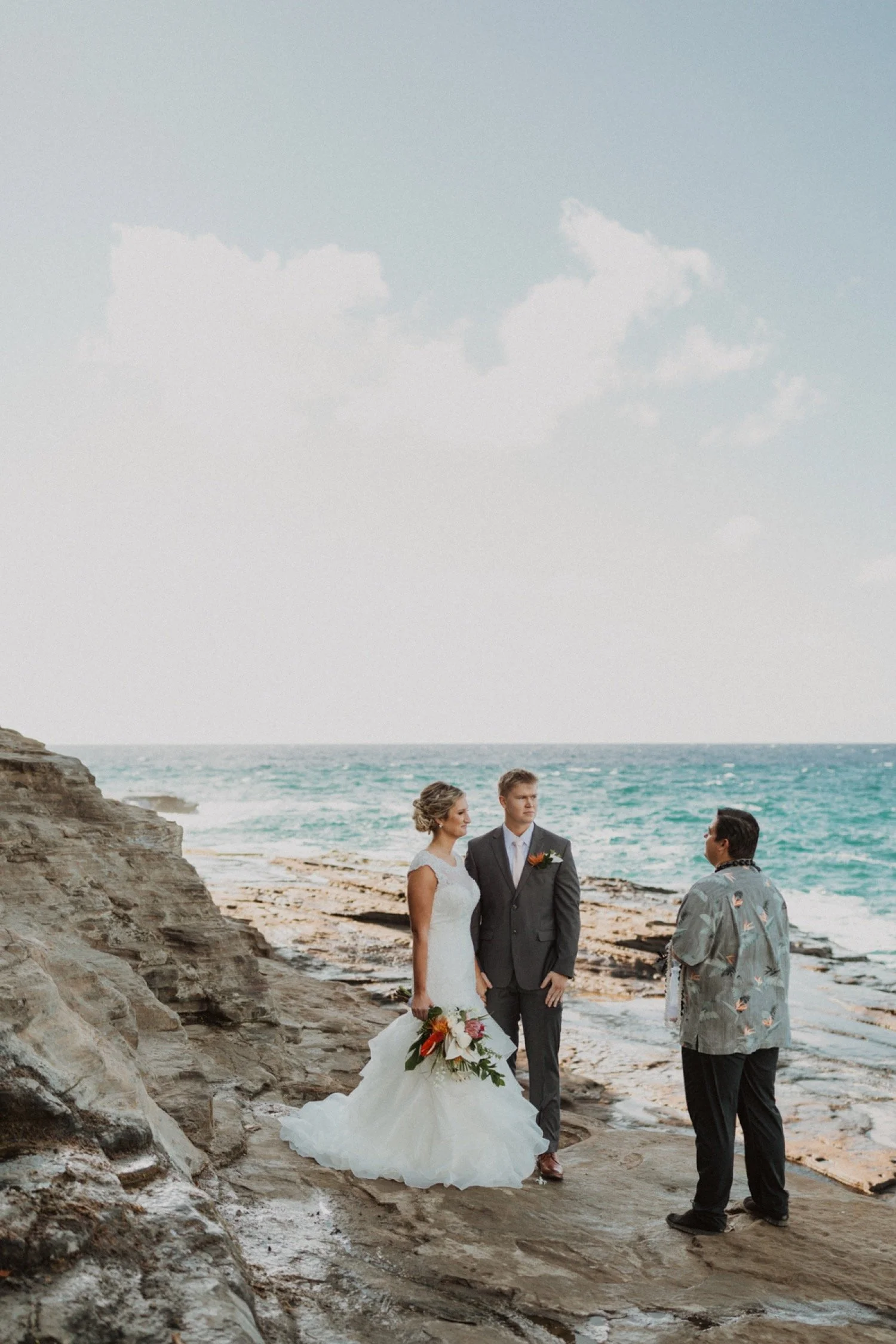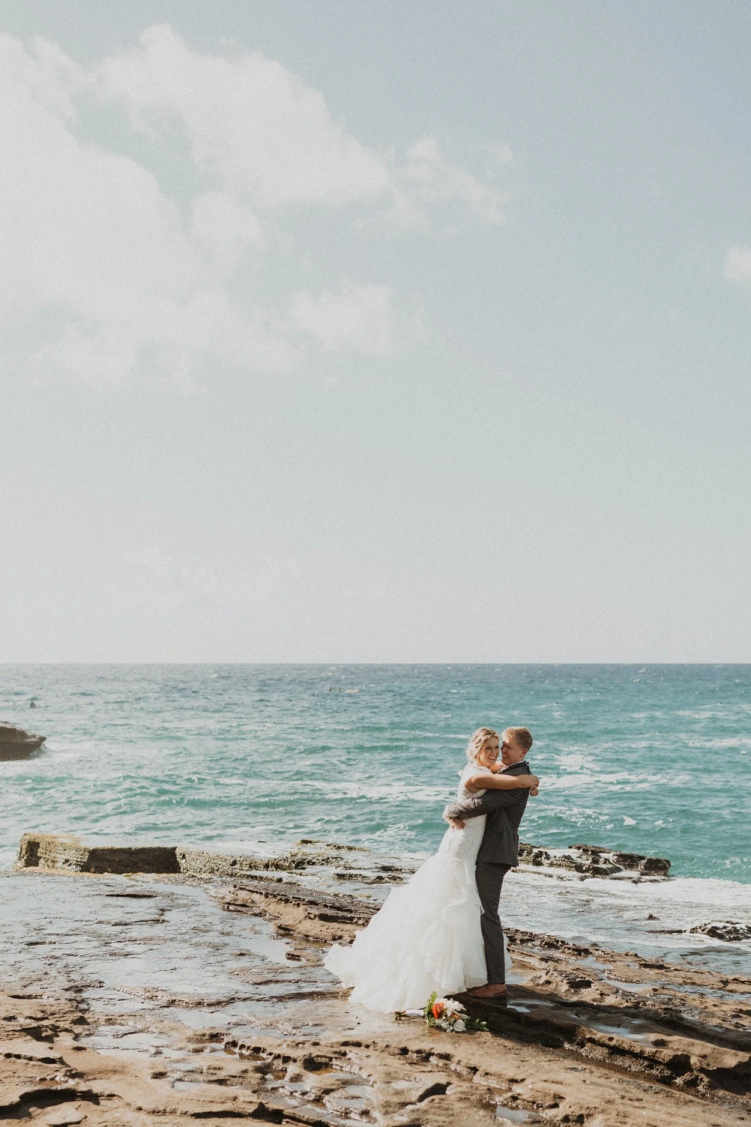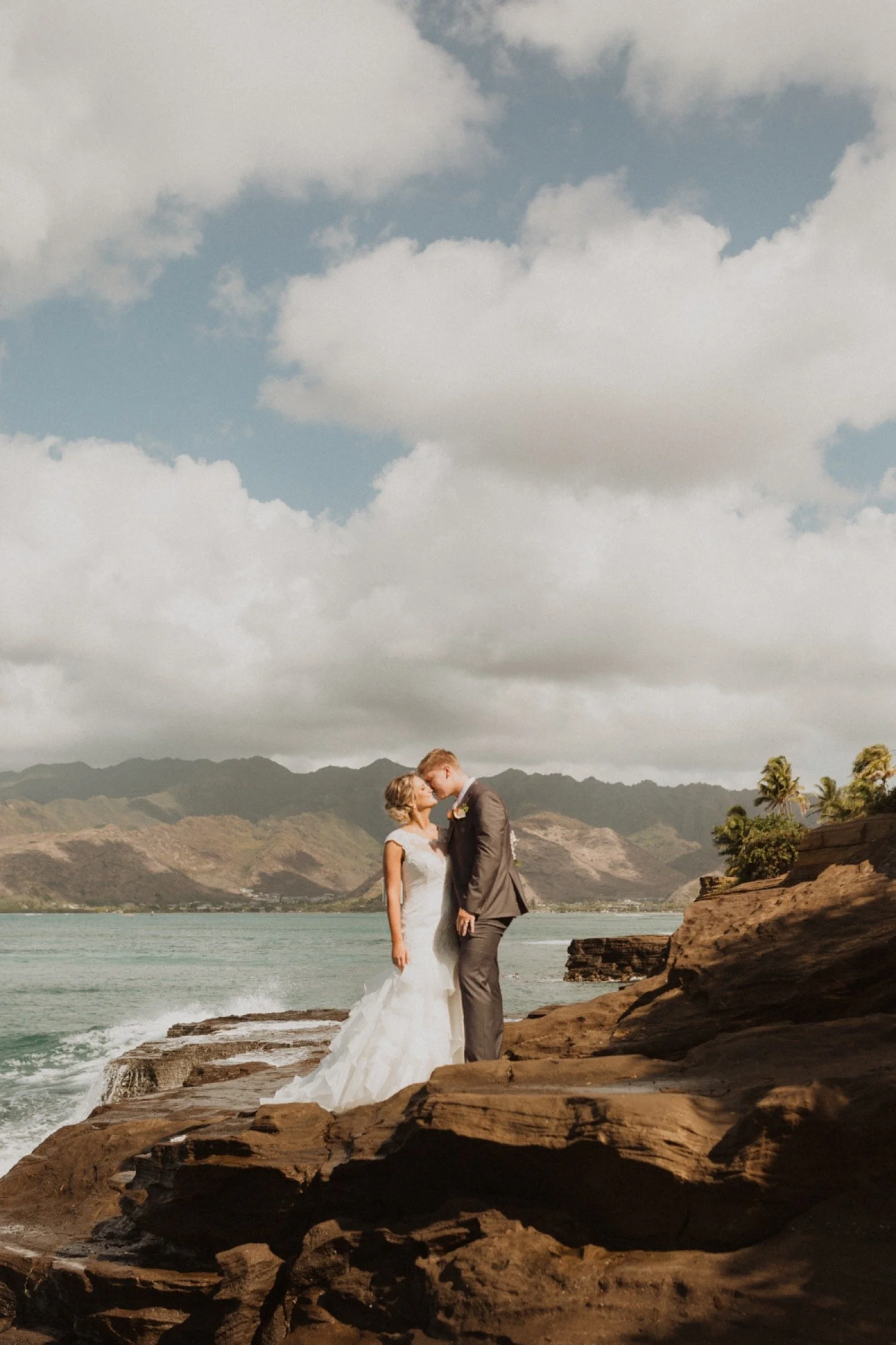 We then, headed to the east side of Oahu, for their cliffside elopement. This side of the Island was also very quiet and intimate for their official elopement. We went to the most beautiful spot, a cliffside beach surrounded by Hawaii’s blue ocean, palm trees and rocky tide pools. It was the perfect place for their day.