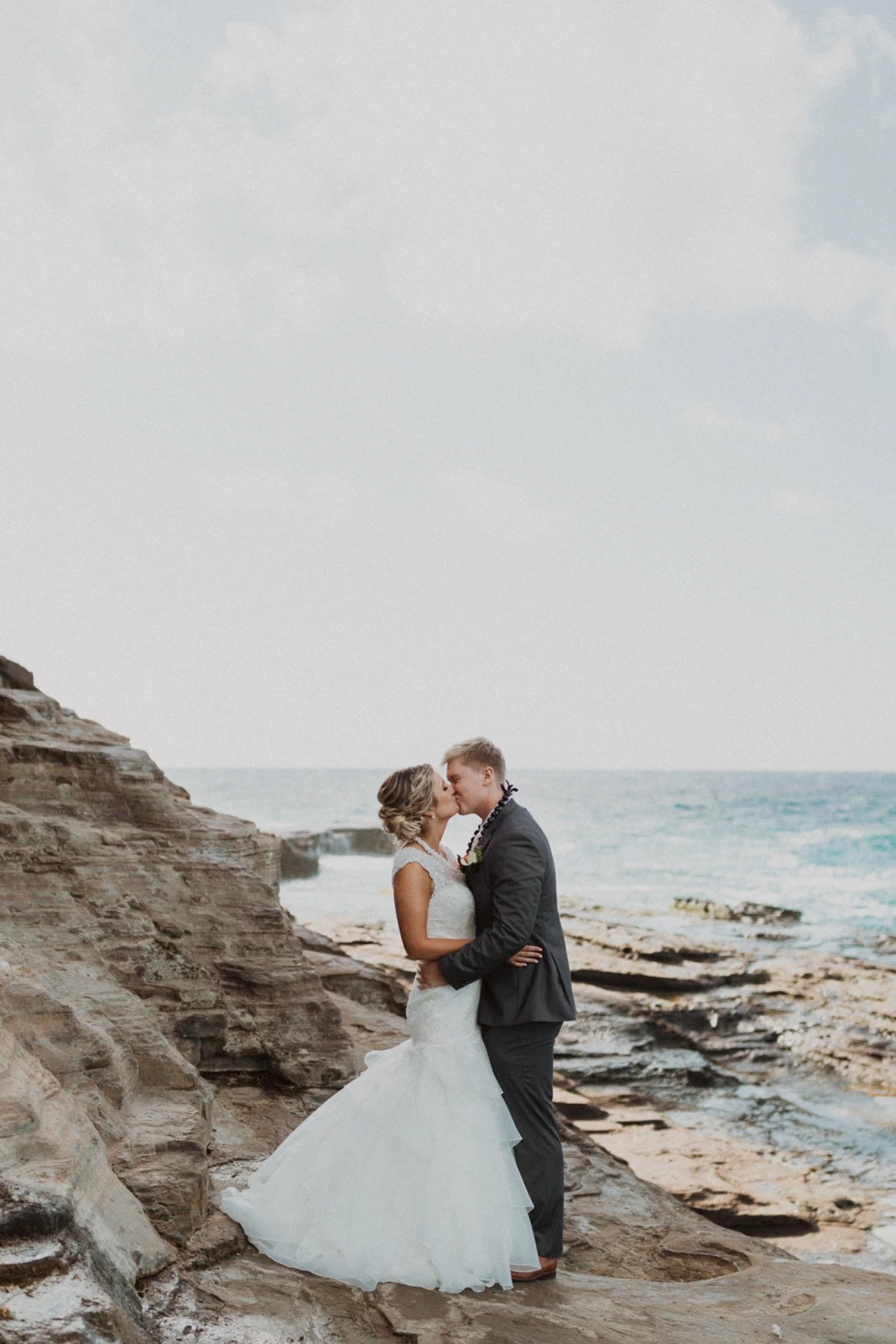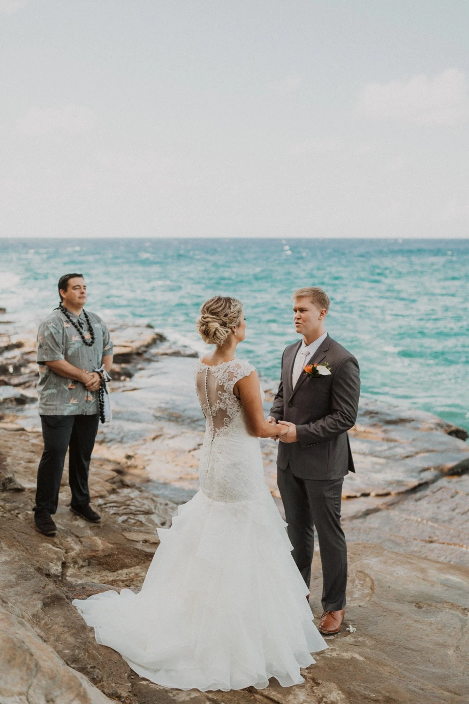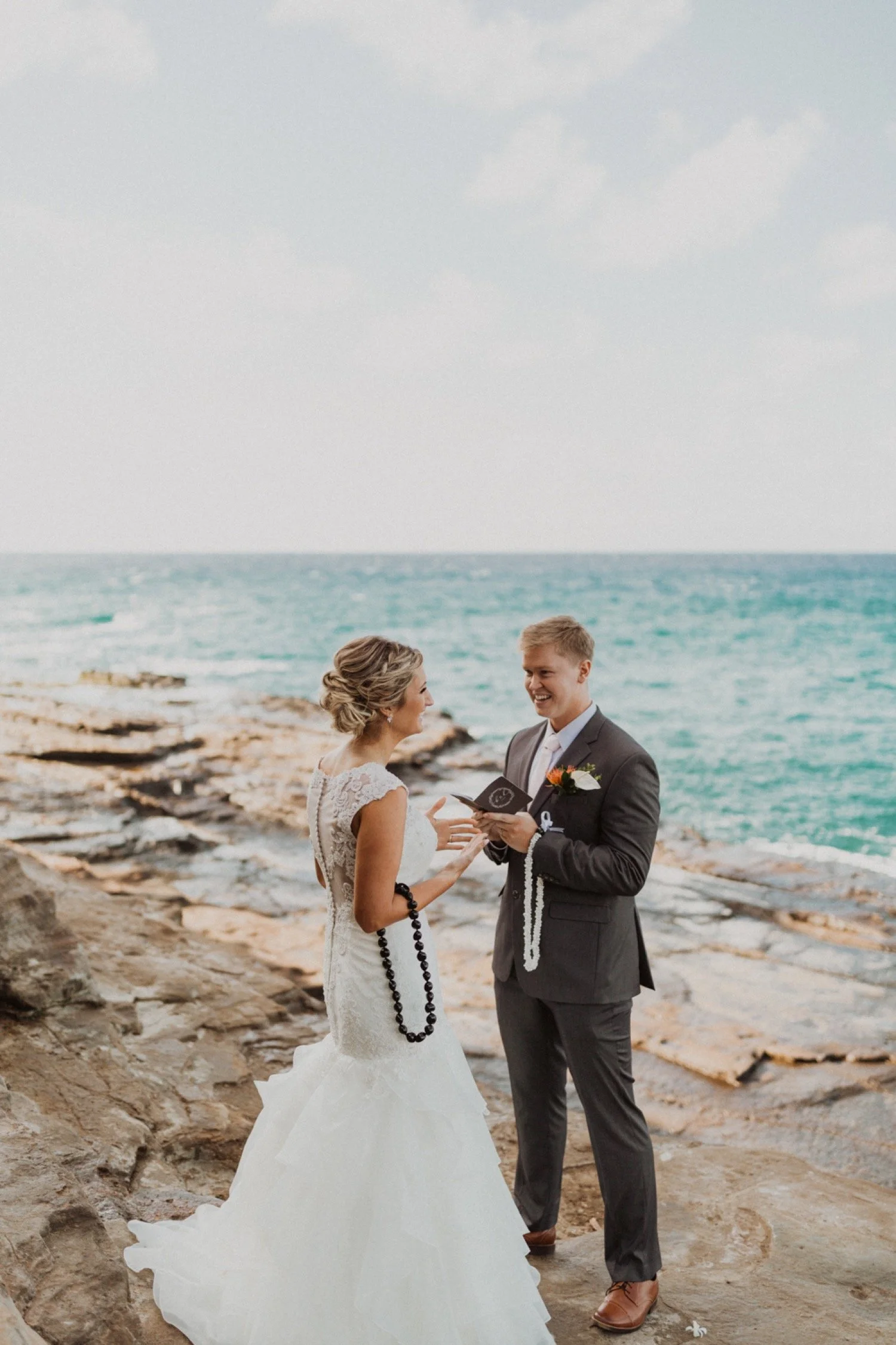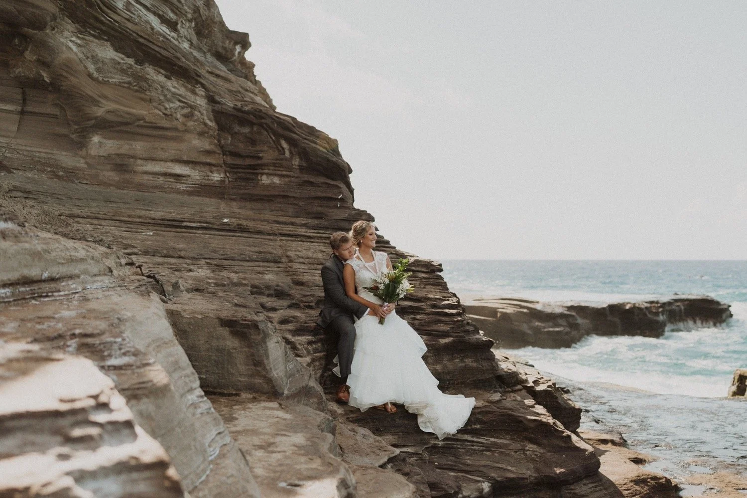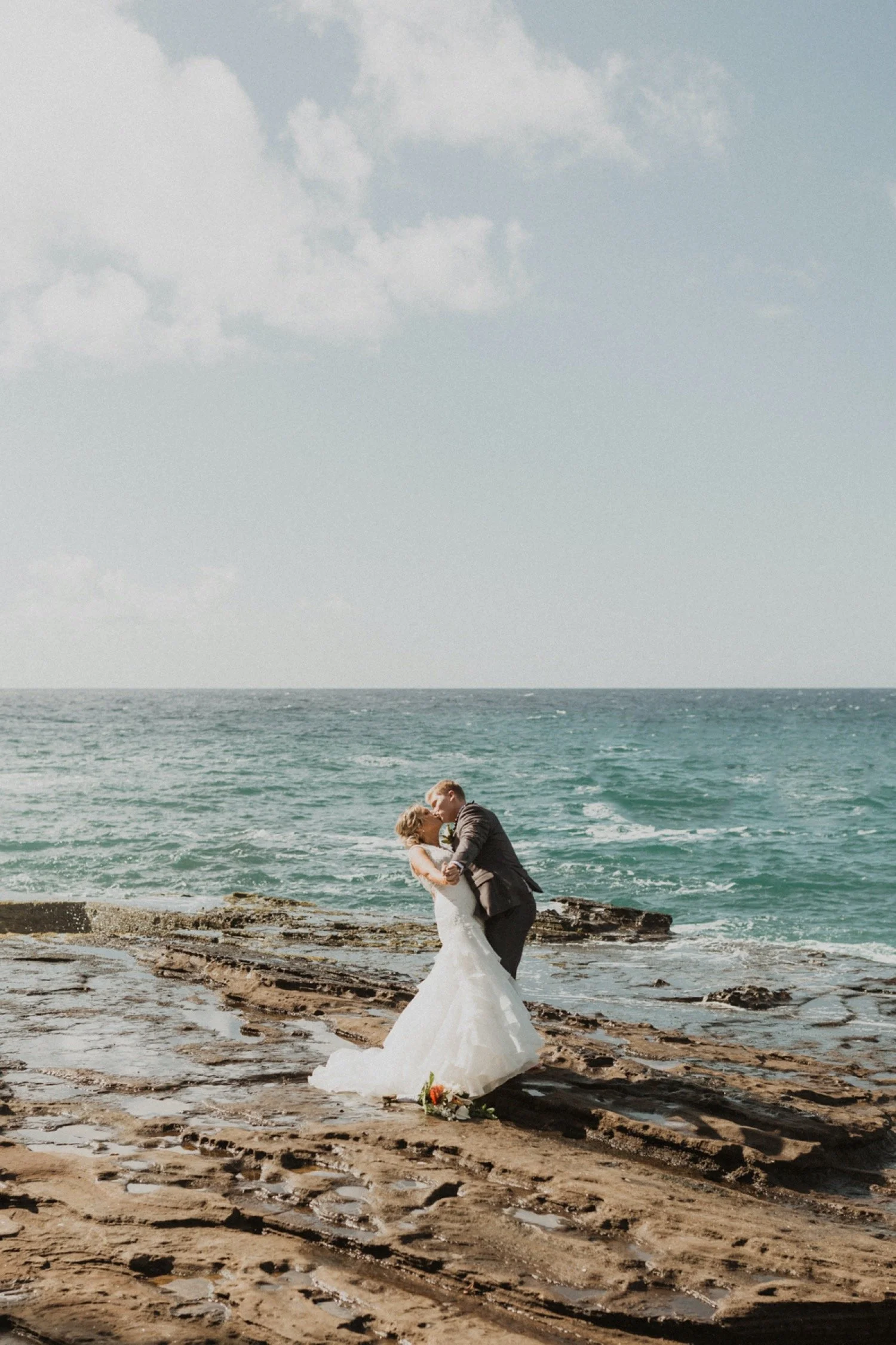 We then, headed to the east side of Oahu, for their cliffside elopement. This side of the Island was also very quiet and intimate for their official elopement. We went to the most beautiful spot, a cliffside beach surrounded by Hawaii’s blue ocean, palm trees and rocky tide pools. It was the perfect place for their day.