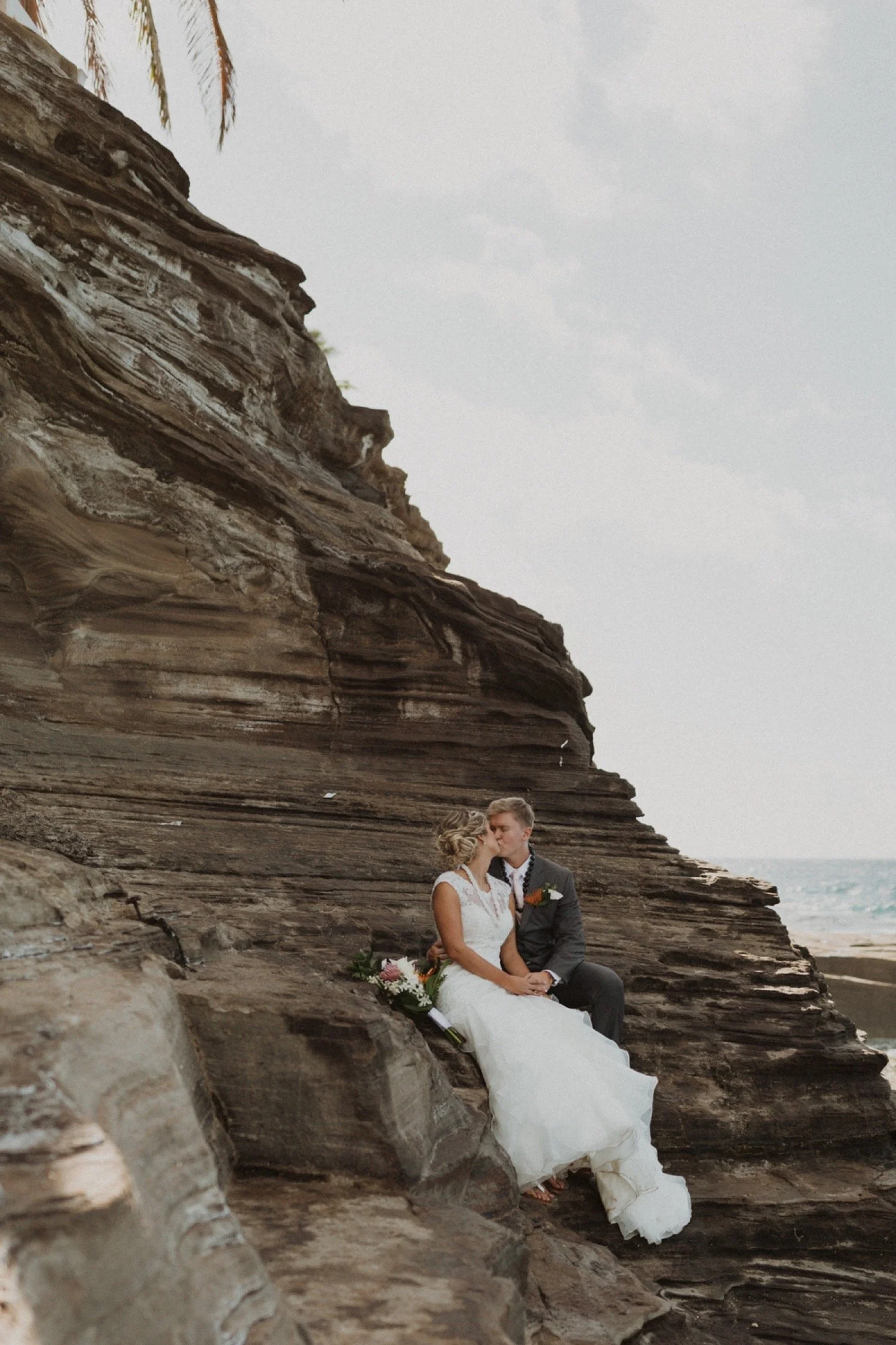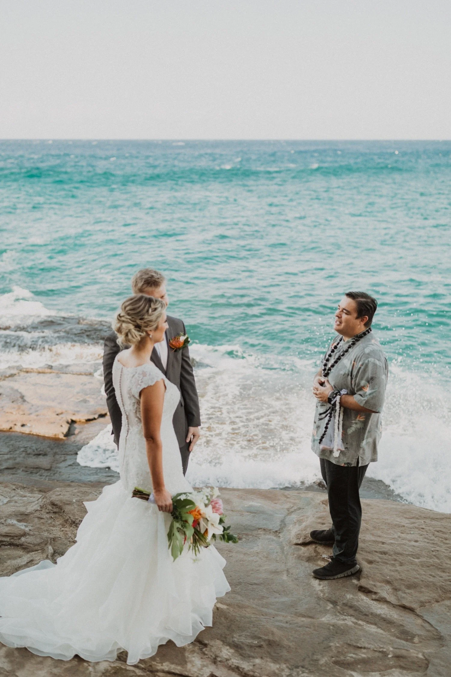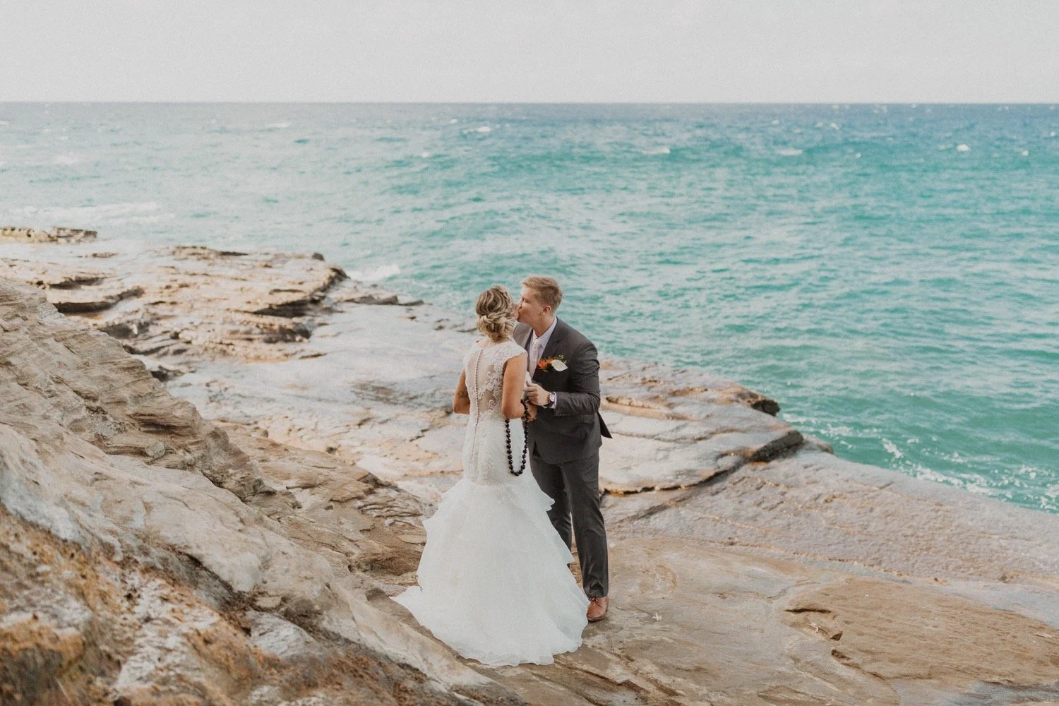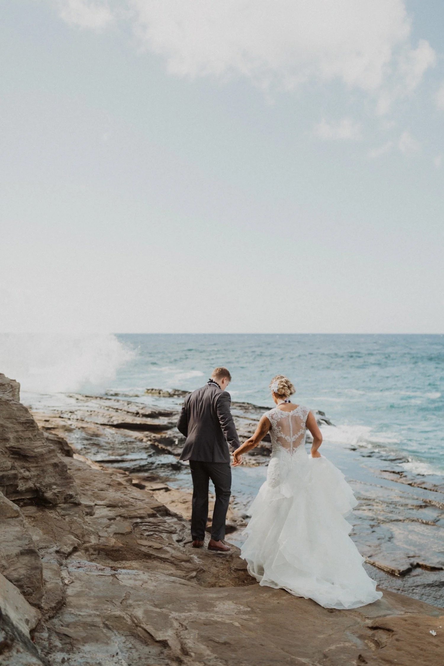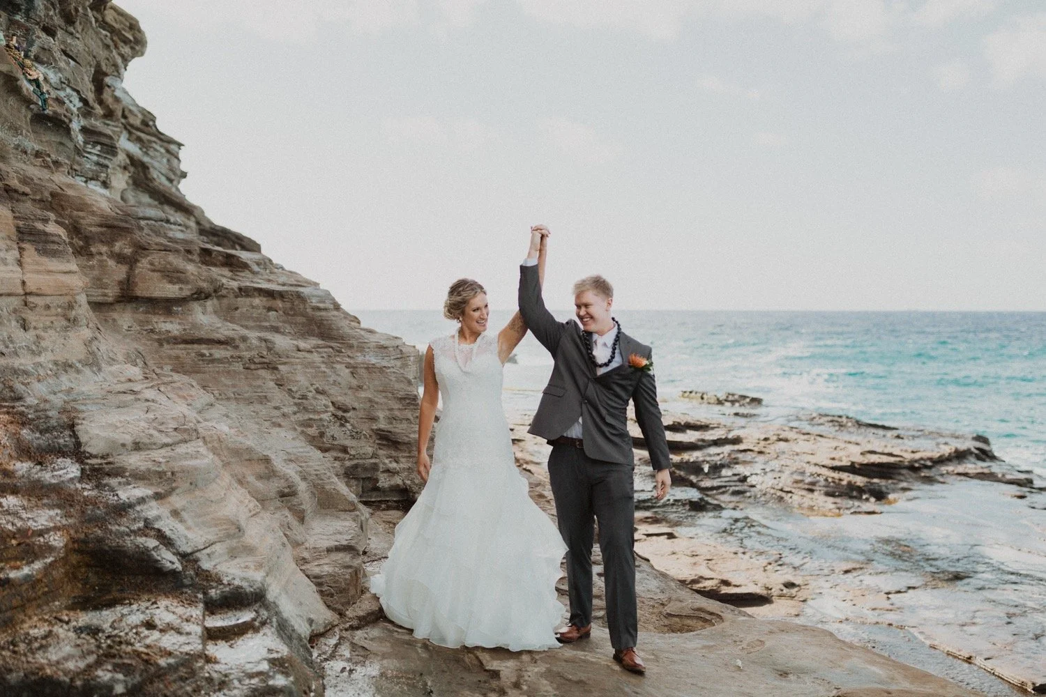 We then, headed to the east side of Oahu, for their cliffside elopement. This side of the Island was also very quiet and intimate for their official elopement. We went to the most beautiful spot, a cliffside beach surrounded by Hawaii’s blue ocean, palm trees and rocky tide pools. It was the perfect place for their day.