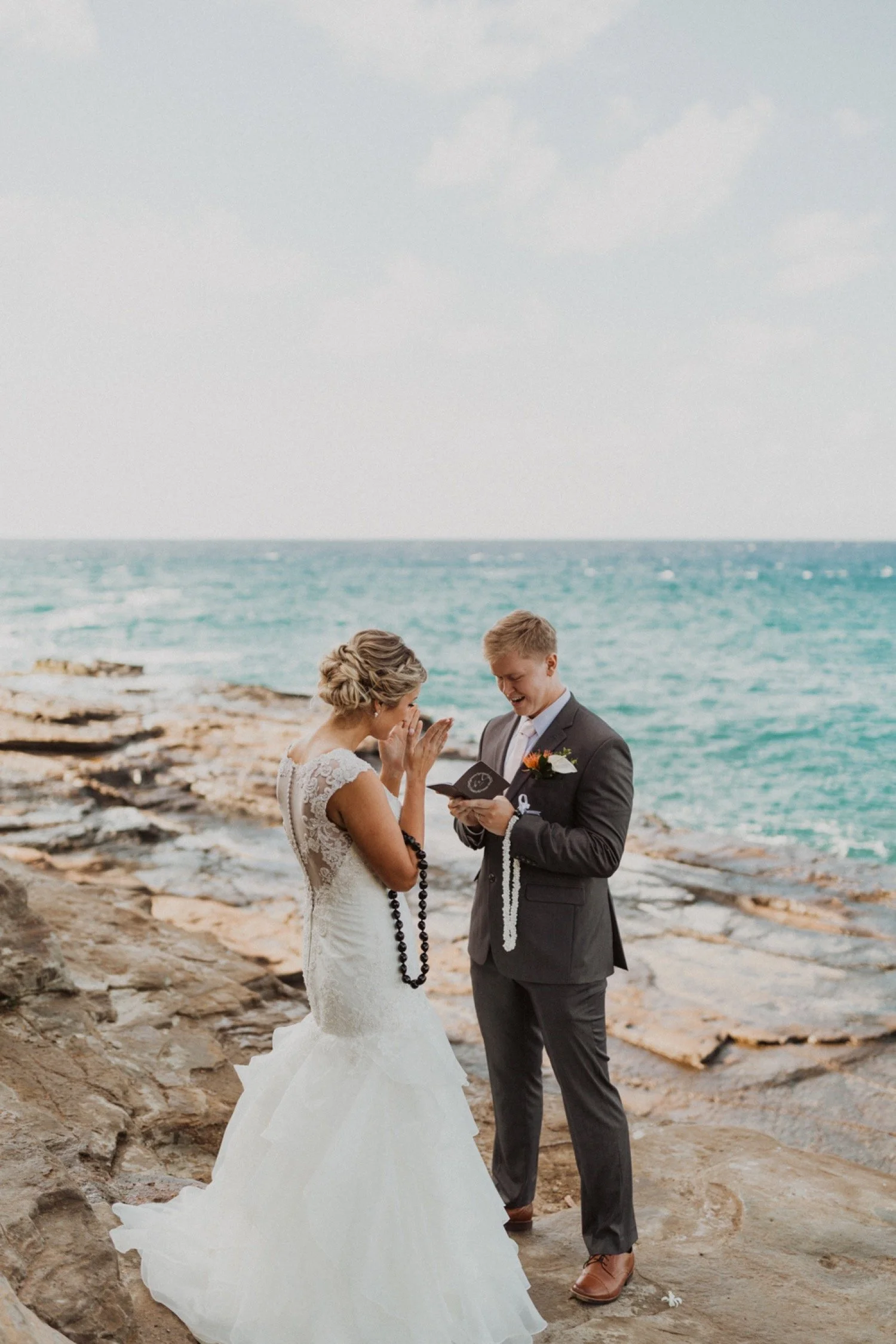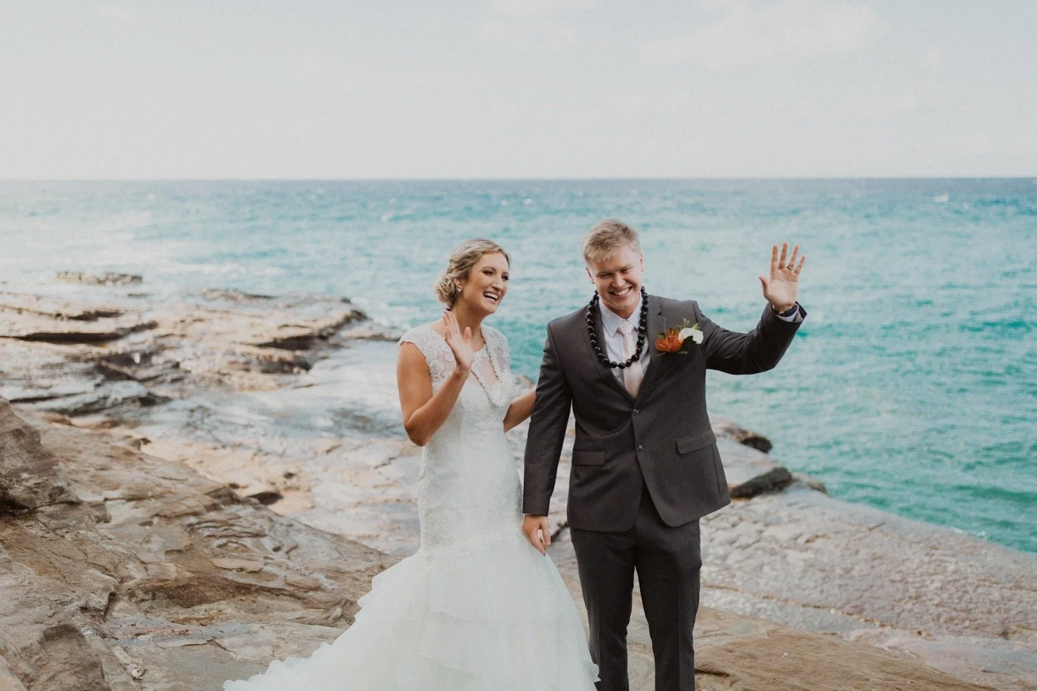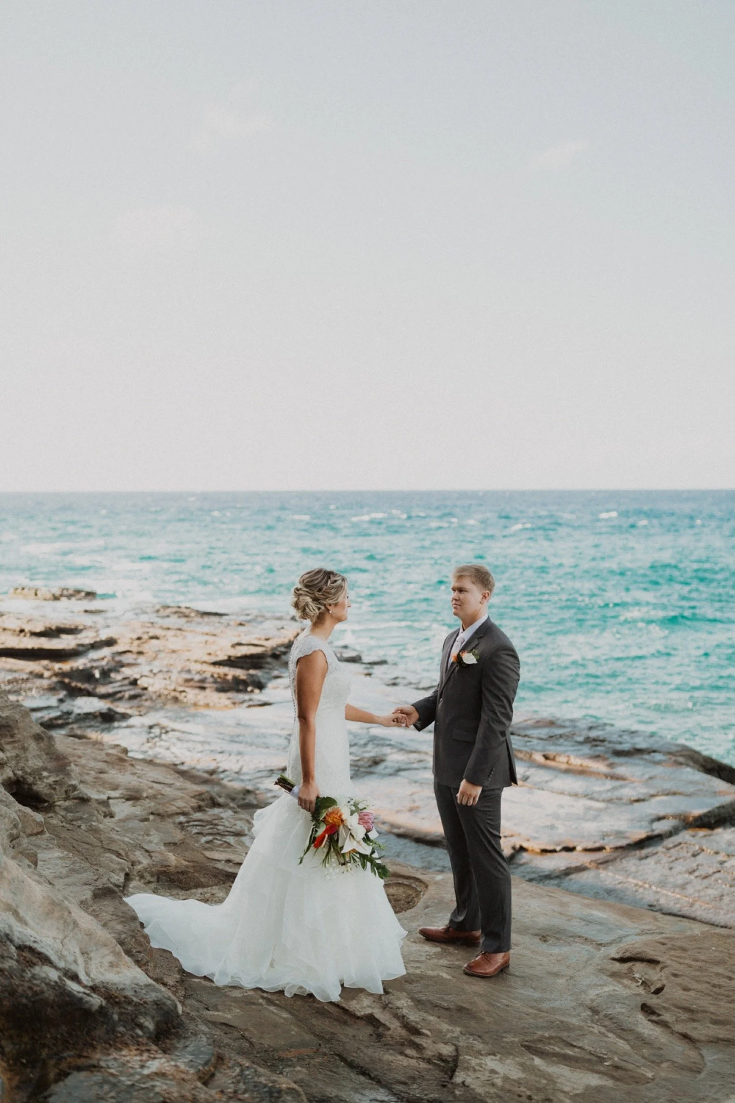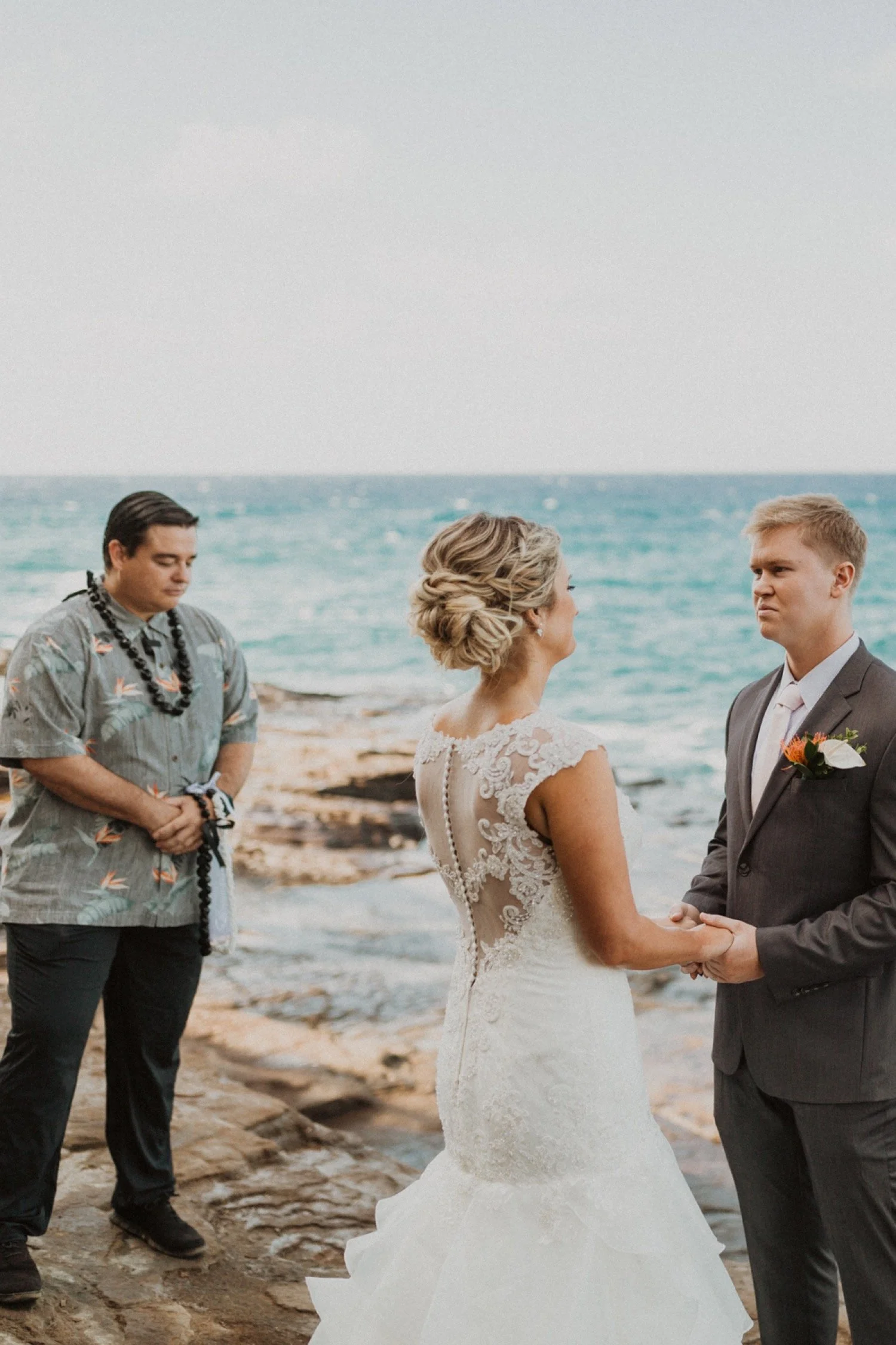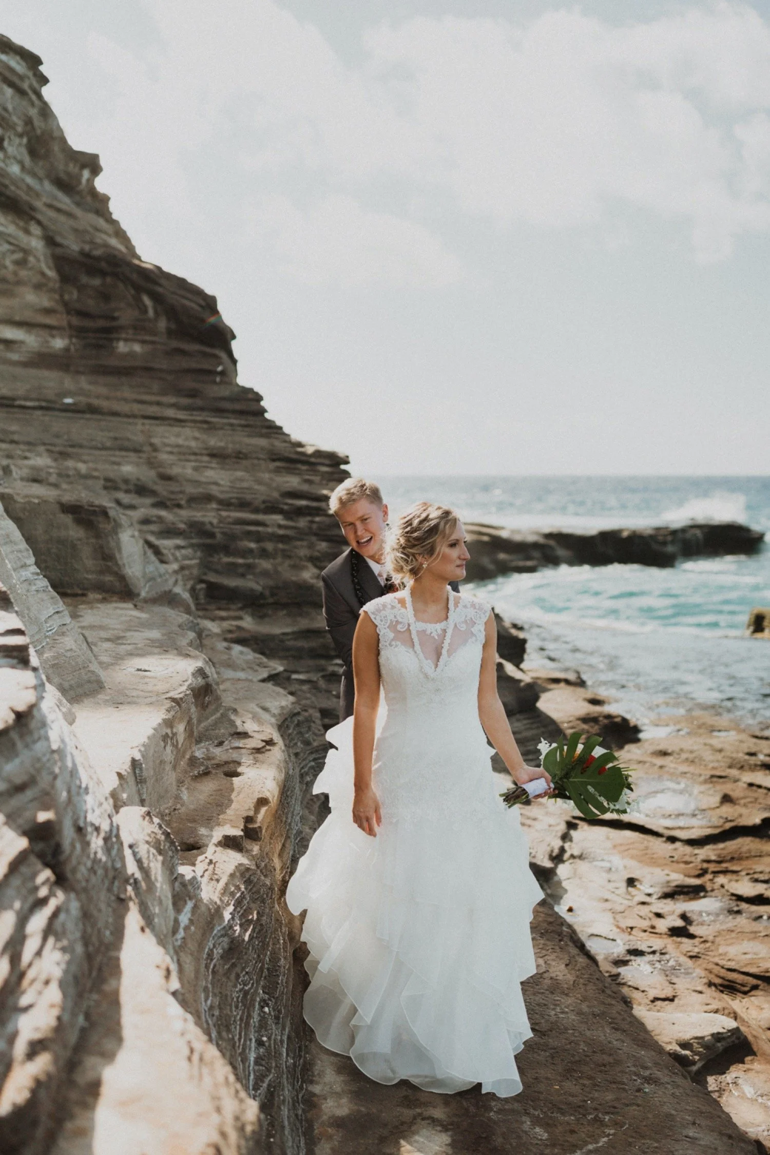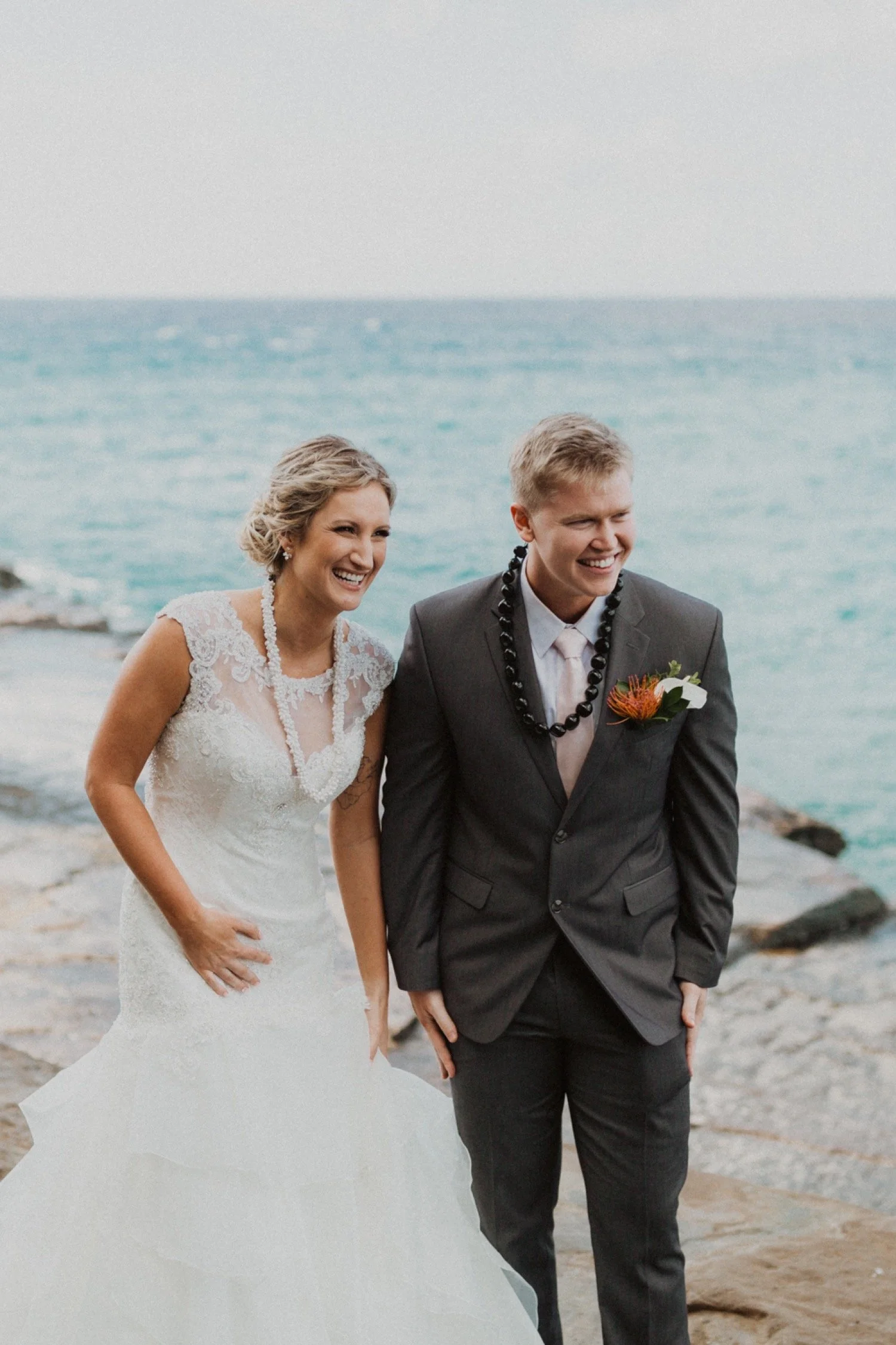 We then, headed to the east side of Oahu, for their cliffside elopement. This side of the Island was also very quiet and intimate for their official elopement. We went to the most beautiful spot, a cliffside beach surrounded by Hawaii’s blue ocean, palm trees and rocky tide pools. It was the perfect place for their day.