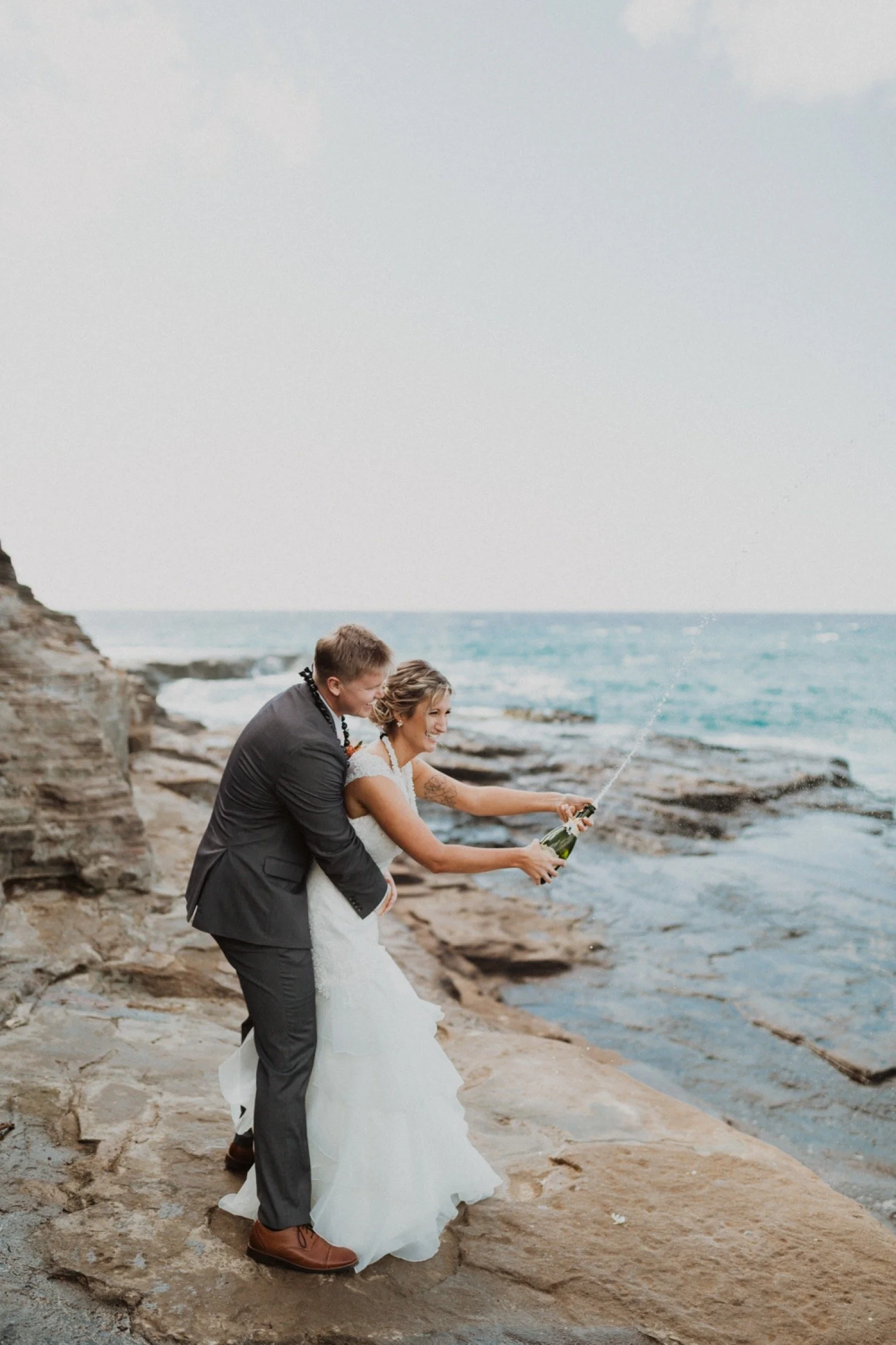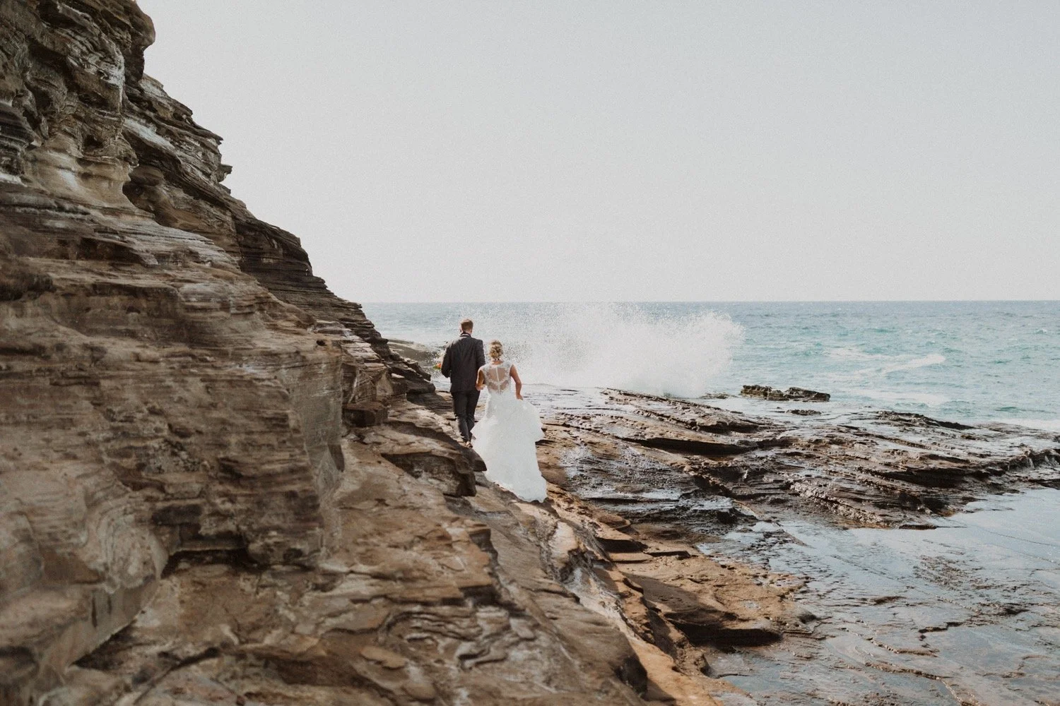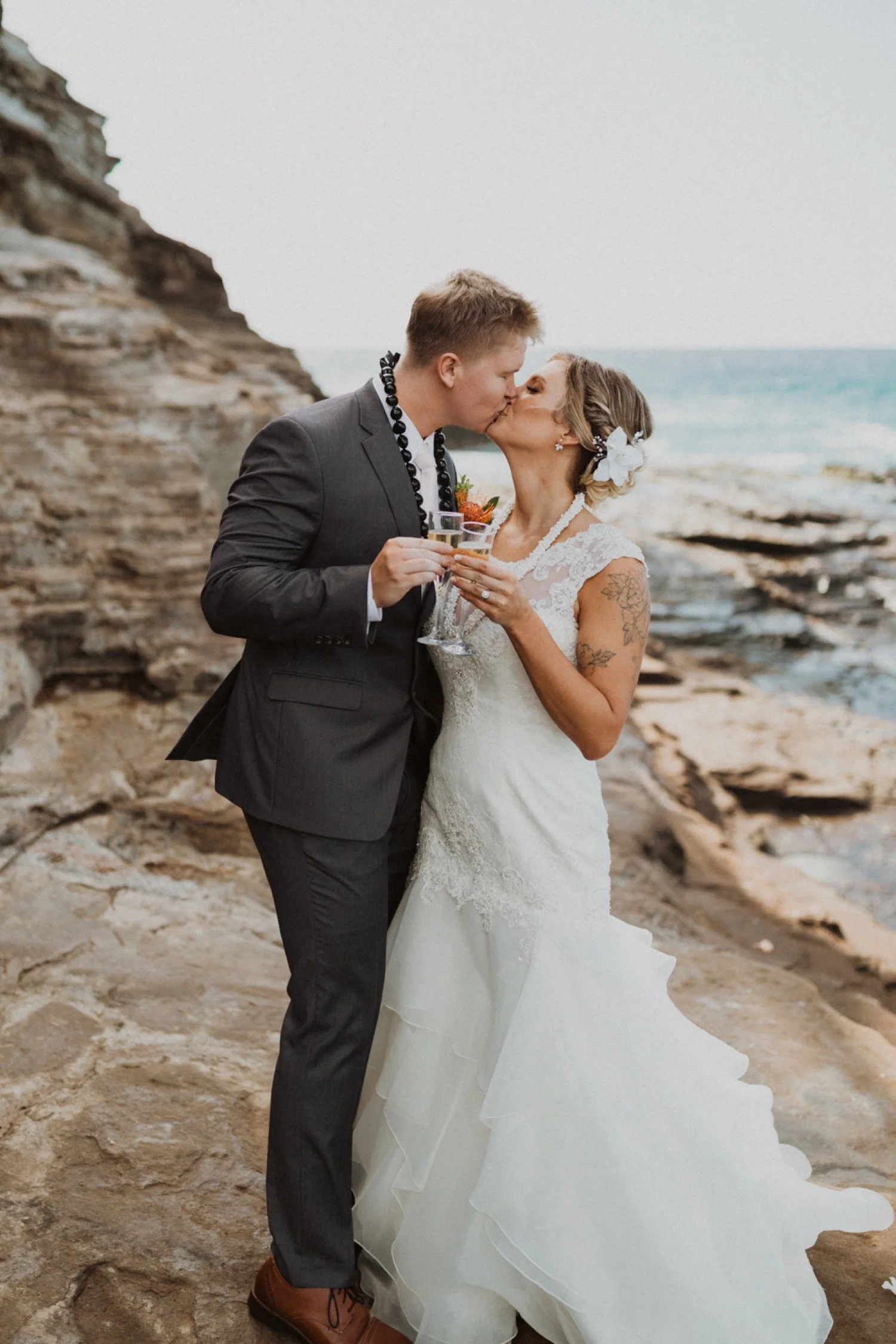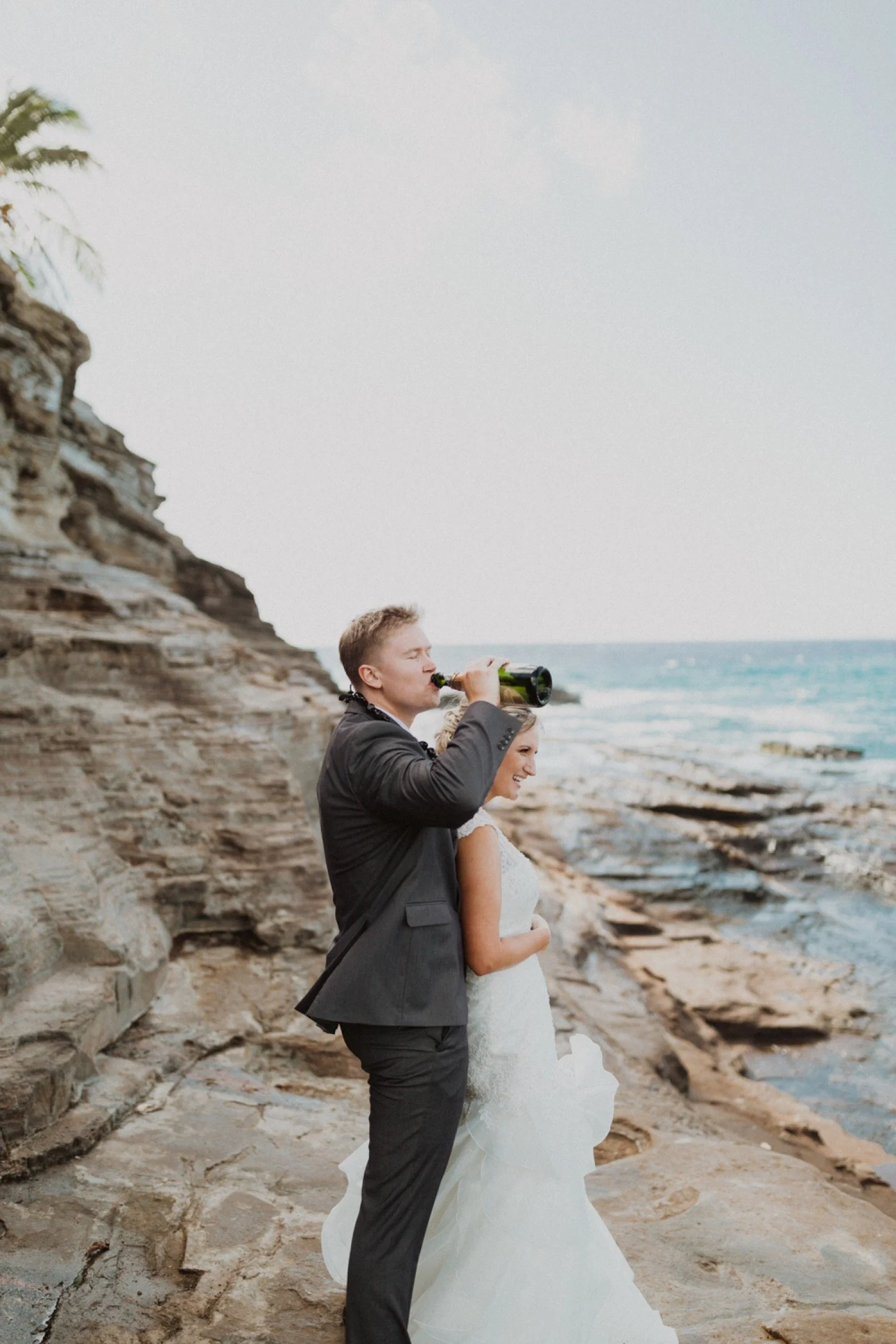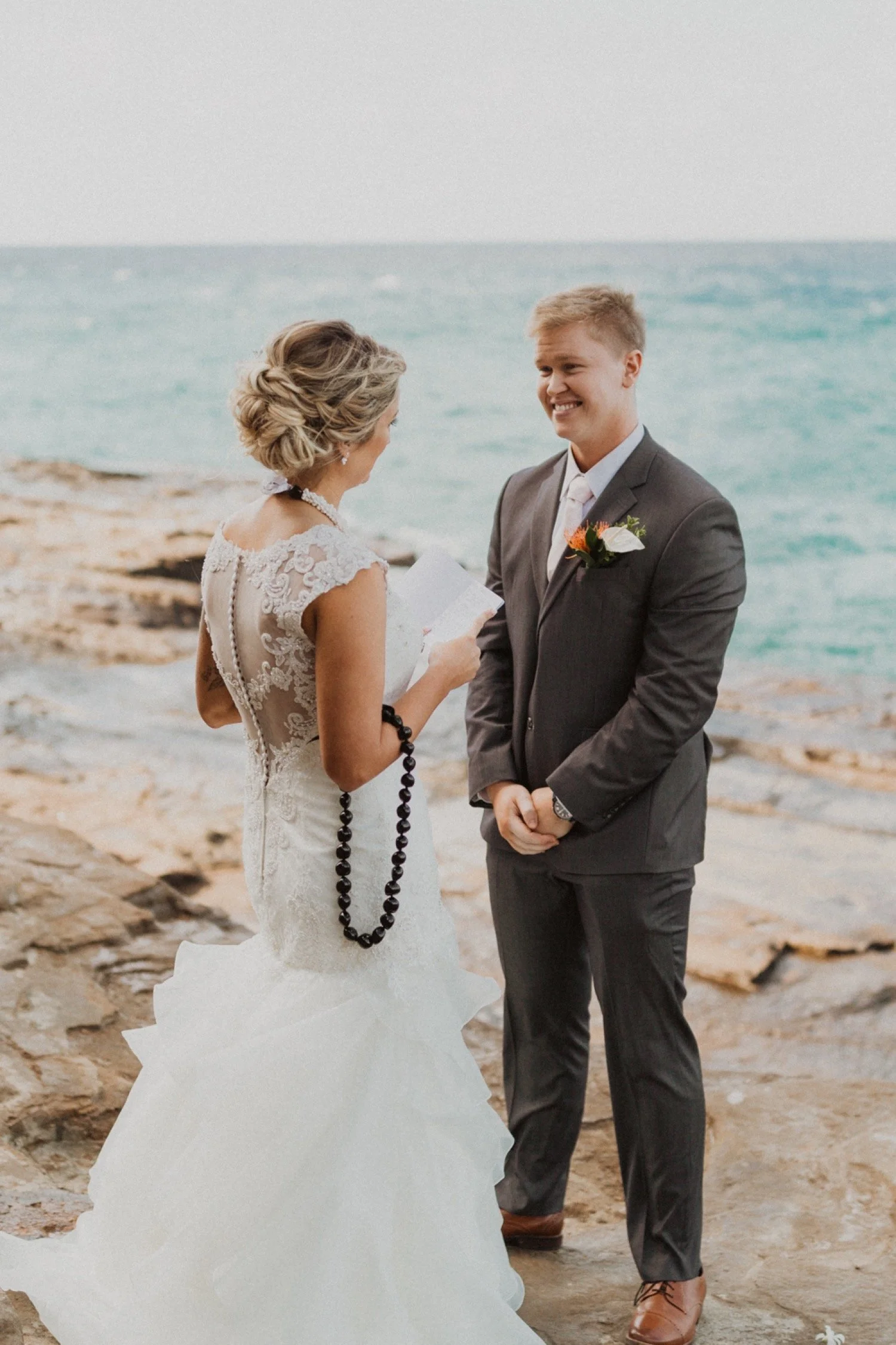 We then, headed to the east side of Oahu, for their cliffside elopement. This side of the Island was also very quiet and intimate for their official elopement. We went to the most beautiful spot, a cliffside beach surrounded by Hawaii’s blue ocean, palm trees and rocky tide pools. It was the perfect place for their day.