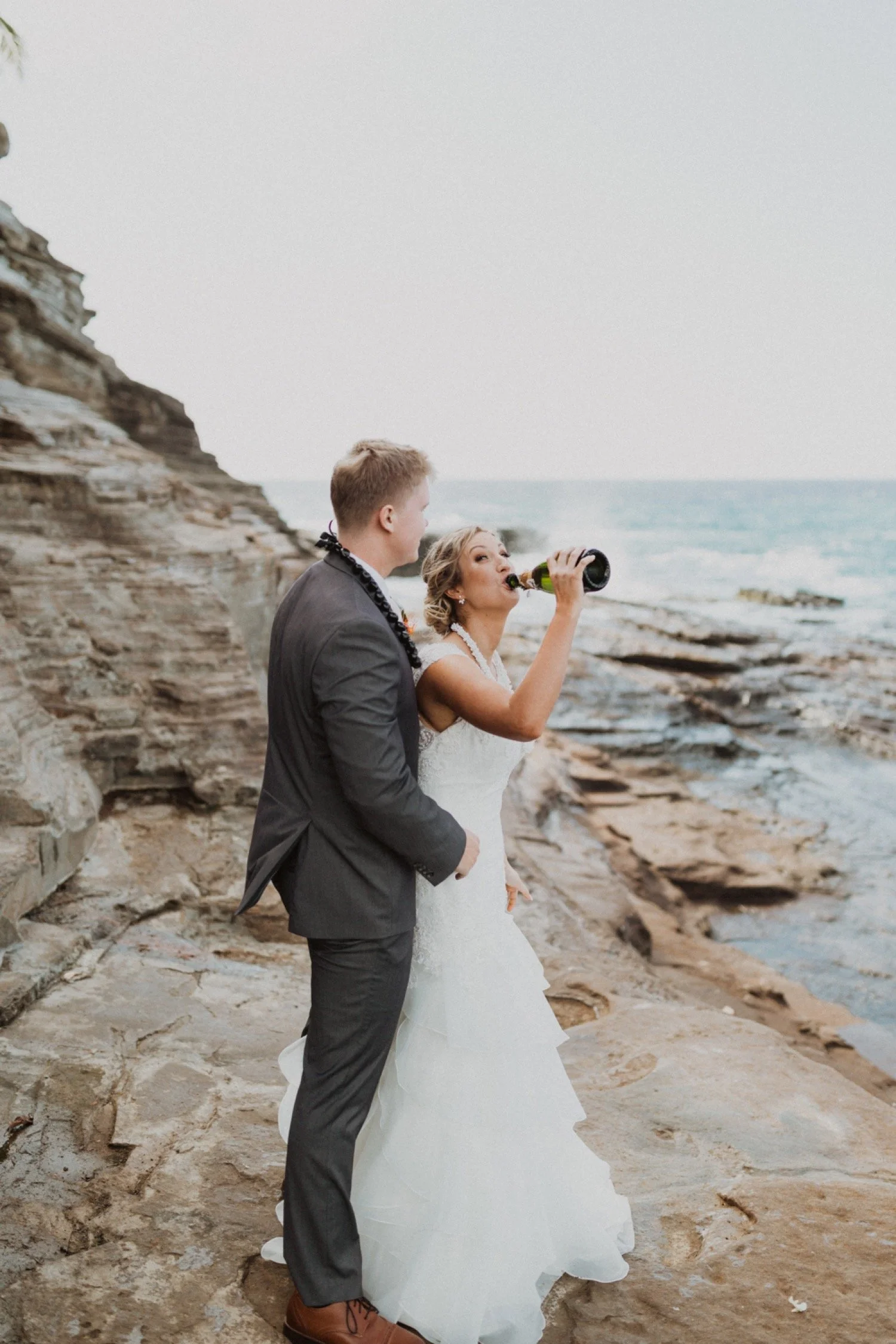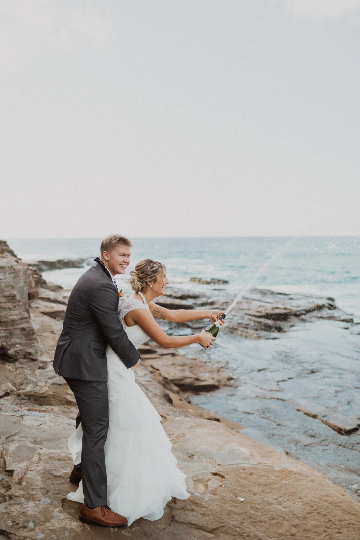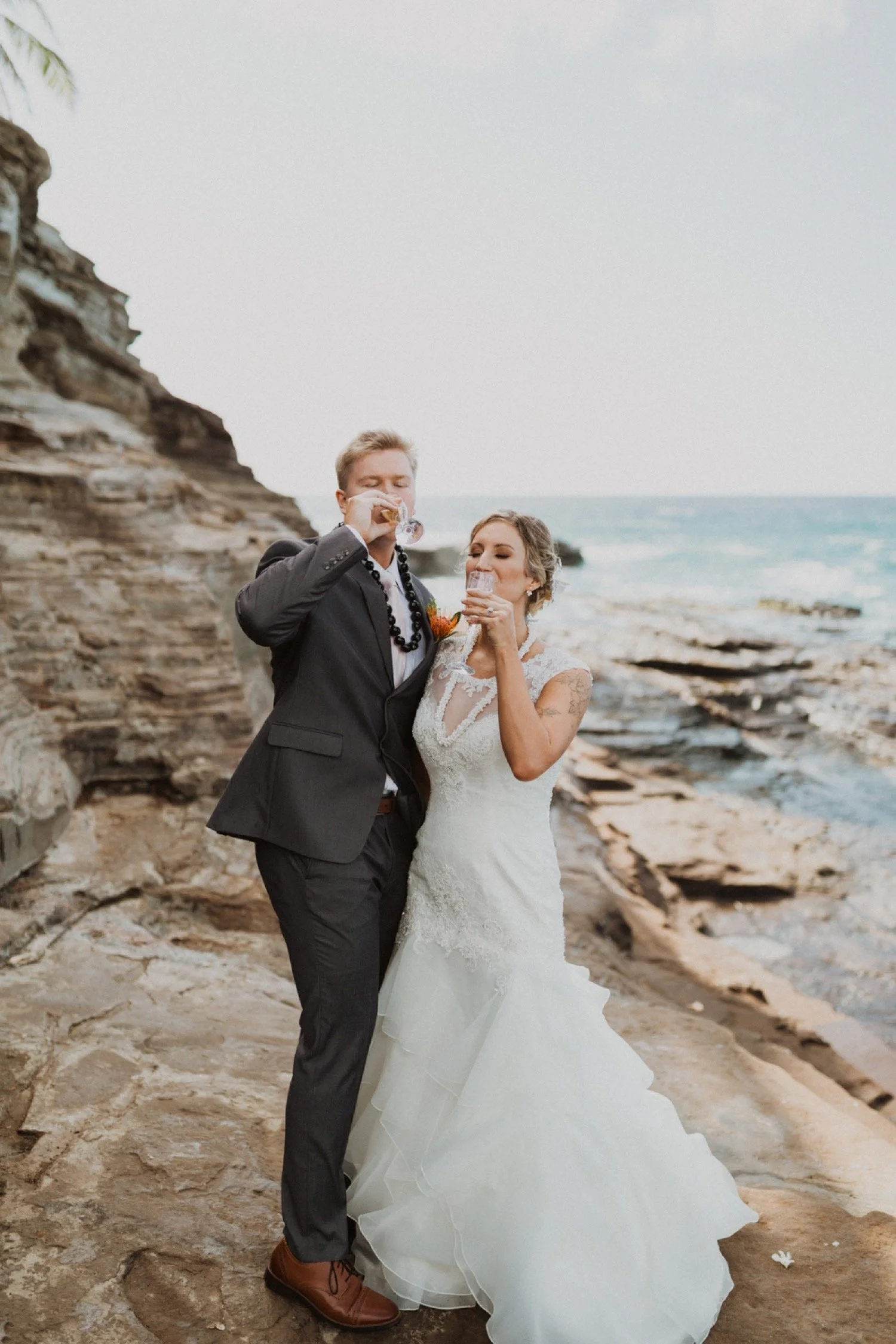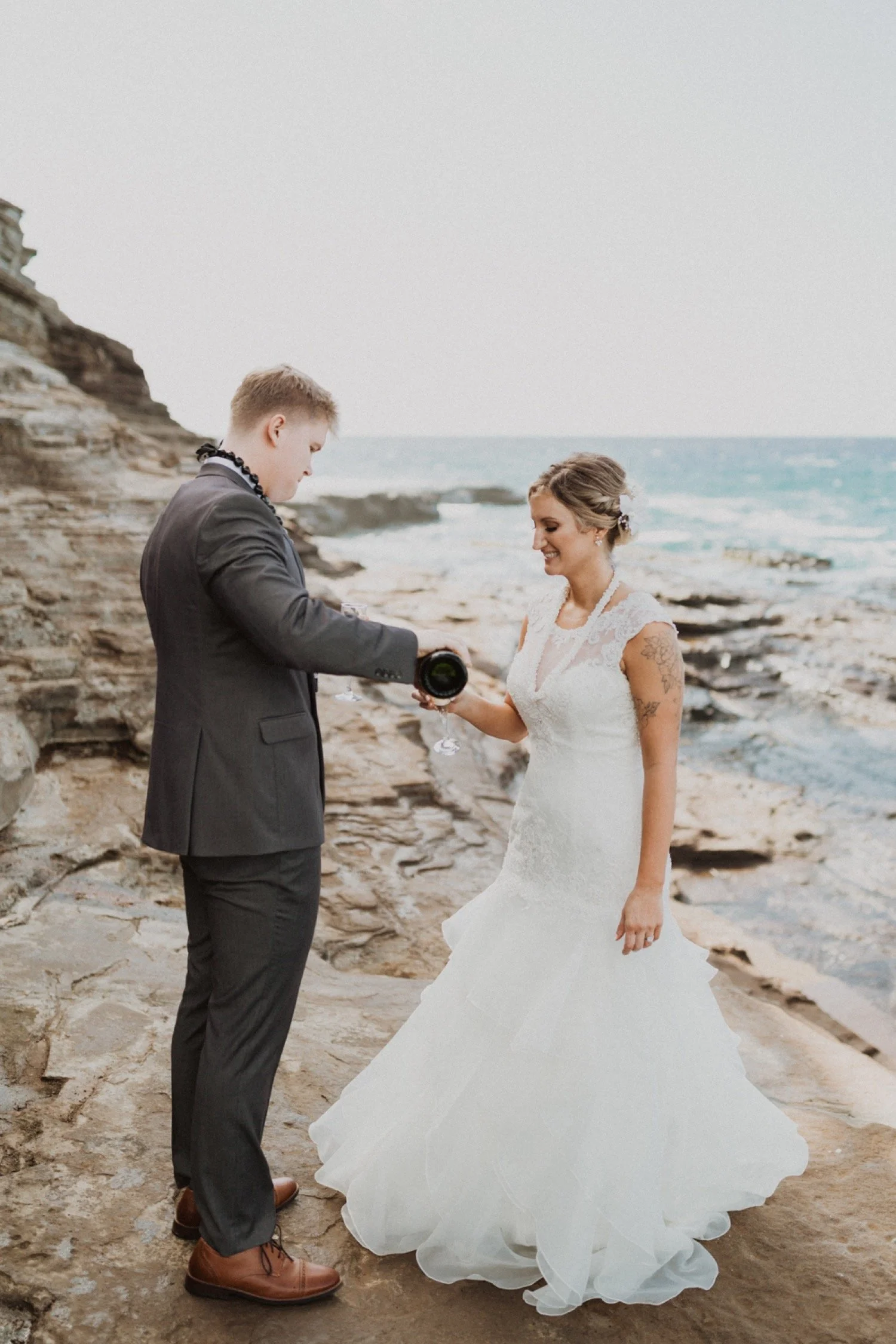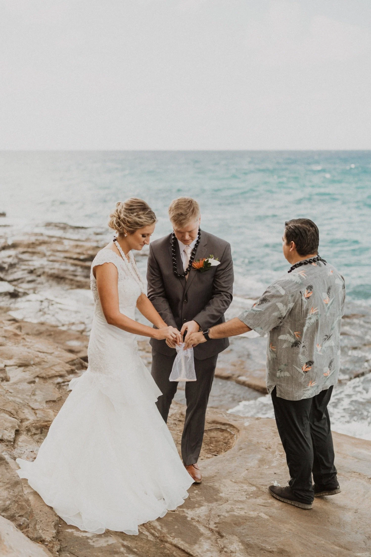 We then, headed to the east side of Oahu, for their cliffside elopement. This side of the Island was also very quiet and intimate for their official elopement. We went to the most beautiful spot, a cliffside beach surrounded by Hawaii’s blue ocean, palm trees and rocky tide pools. It was the perfect place for their day.