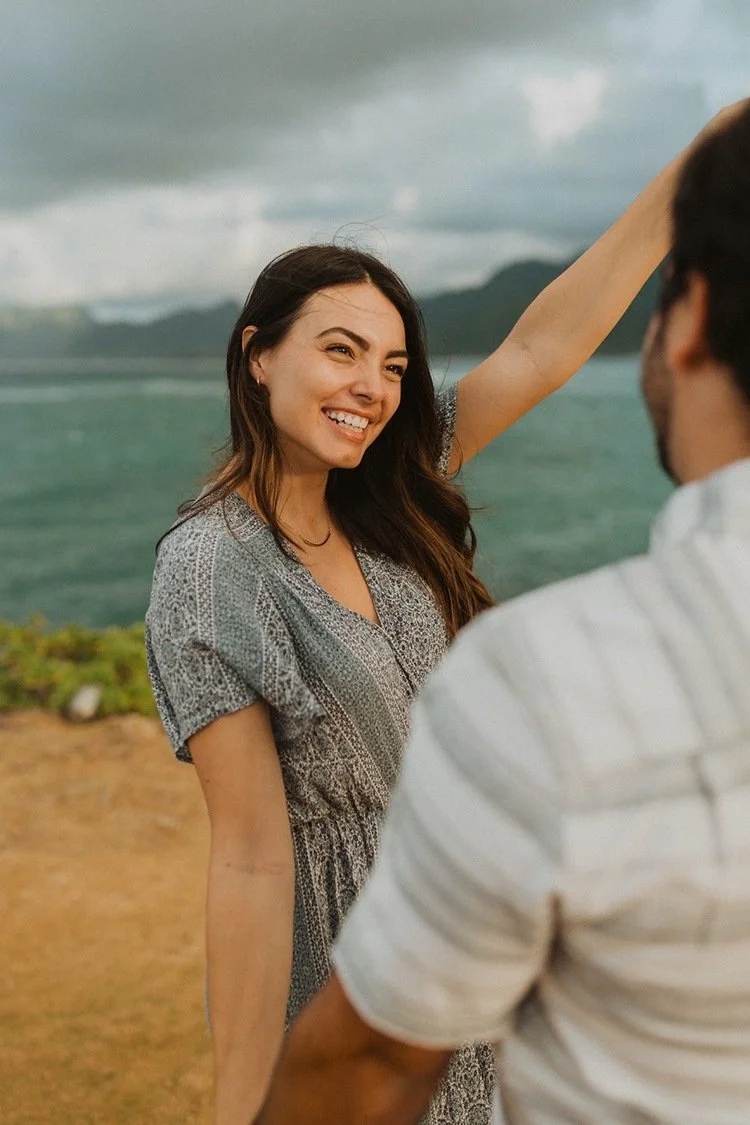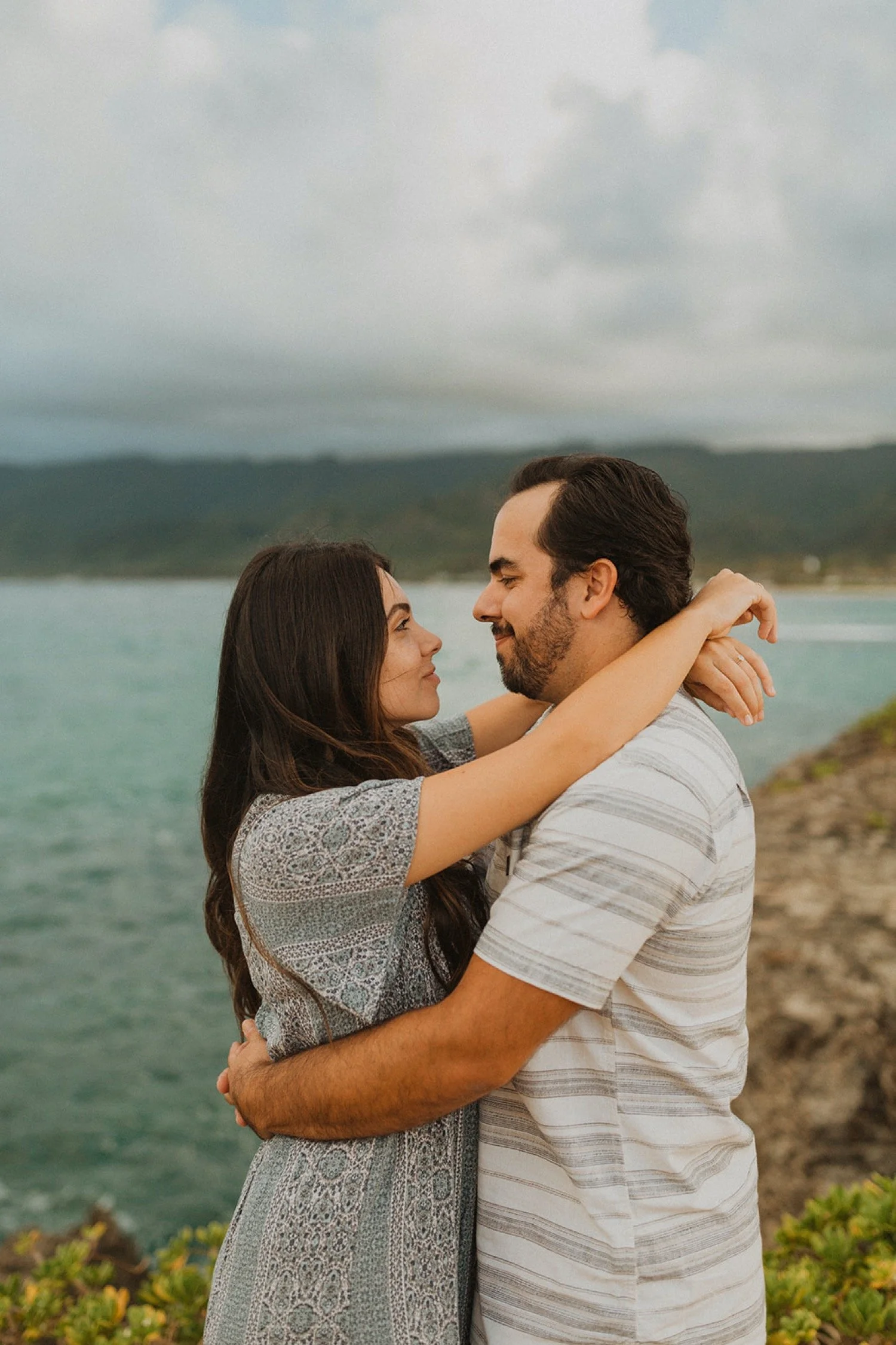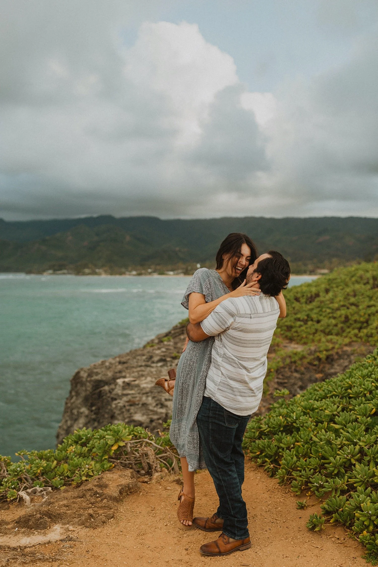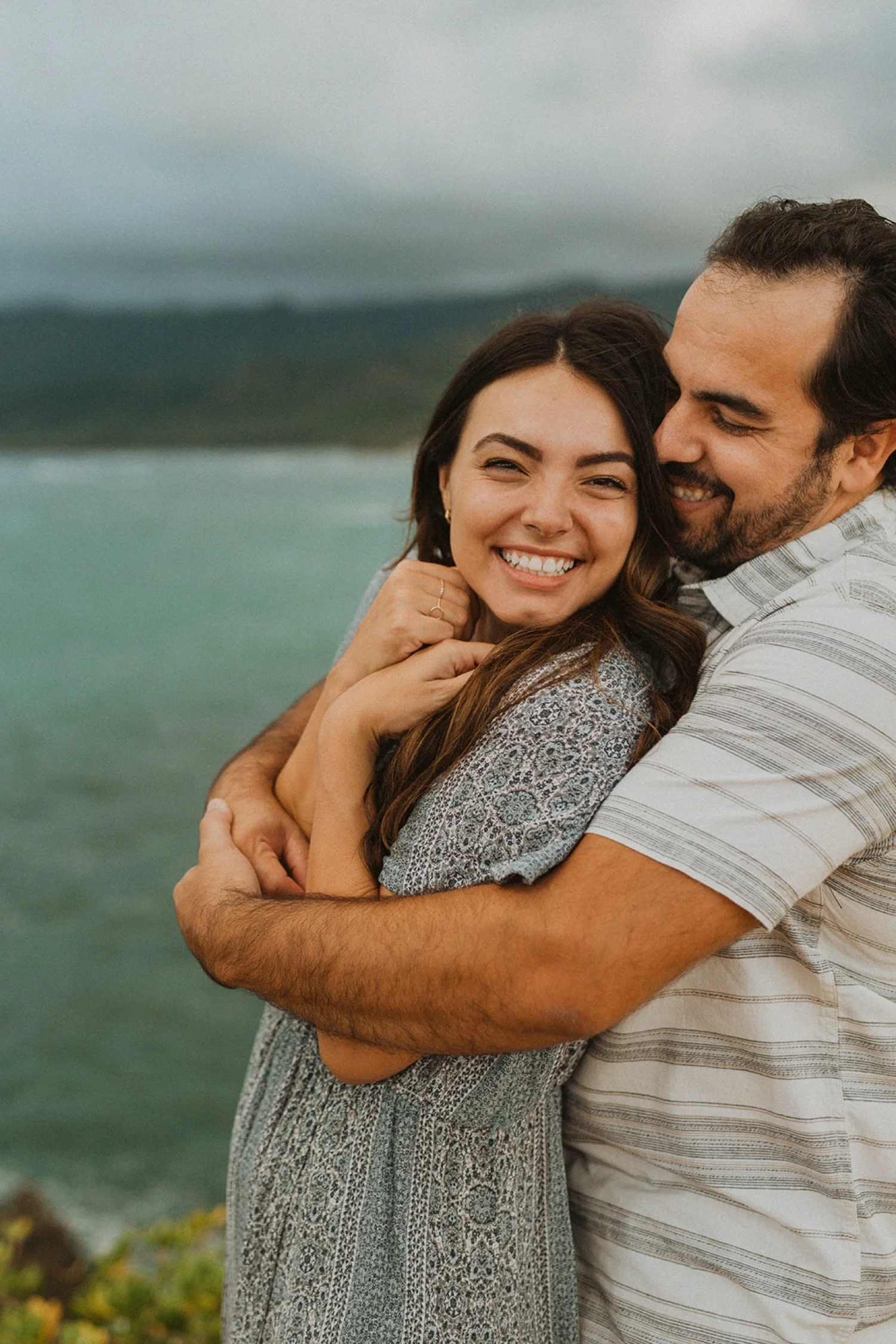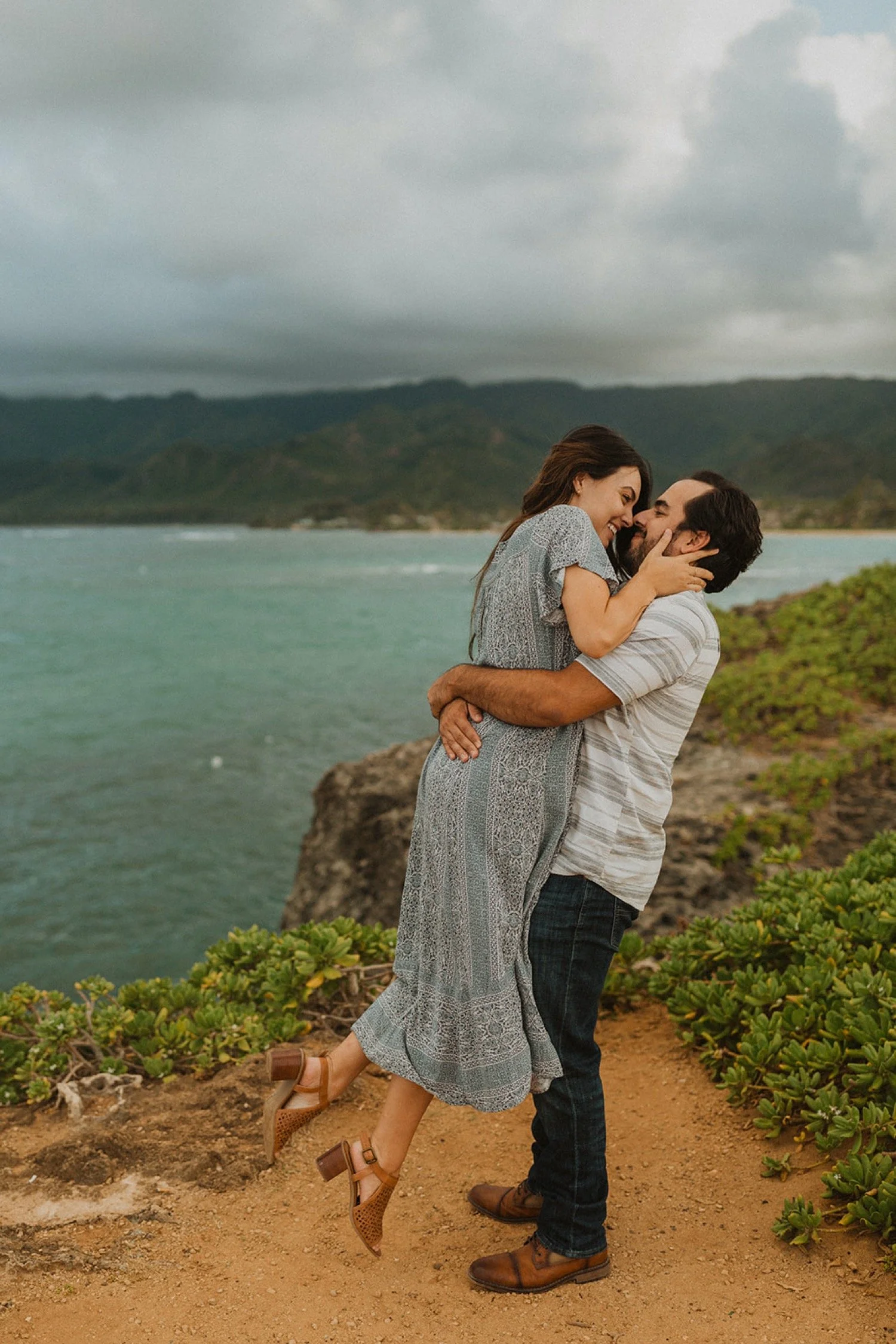 We first, climbed up a cliff and arrived at the most beautiful cliffside spot that overlooked the whole bay, and the prettiest blue ocean (that Hawaii never disappoints with). We got some amazing photos, that truly capture the beauty that this little Hawaiian island brings. Then, we headed down to the beach to play in the waves. I was so glad that Chris + Hanna wanted to get in the ocean for their couples session because it is always so much fun!
