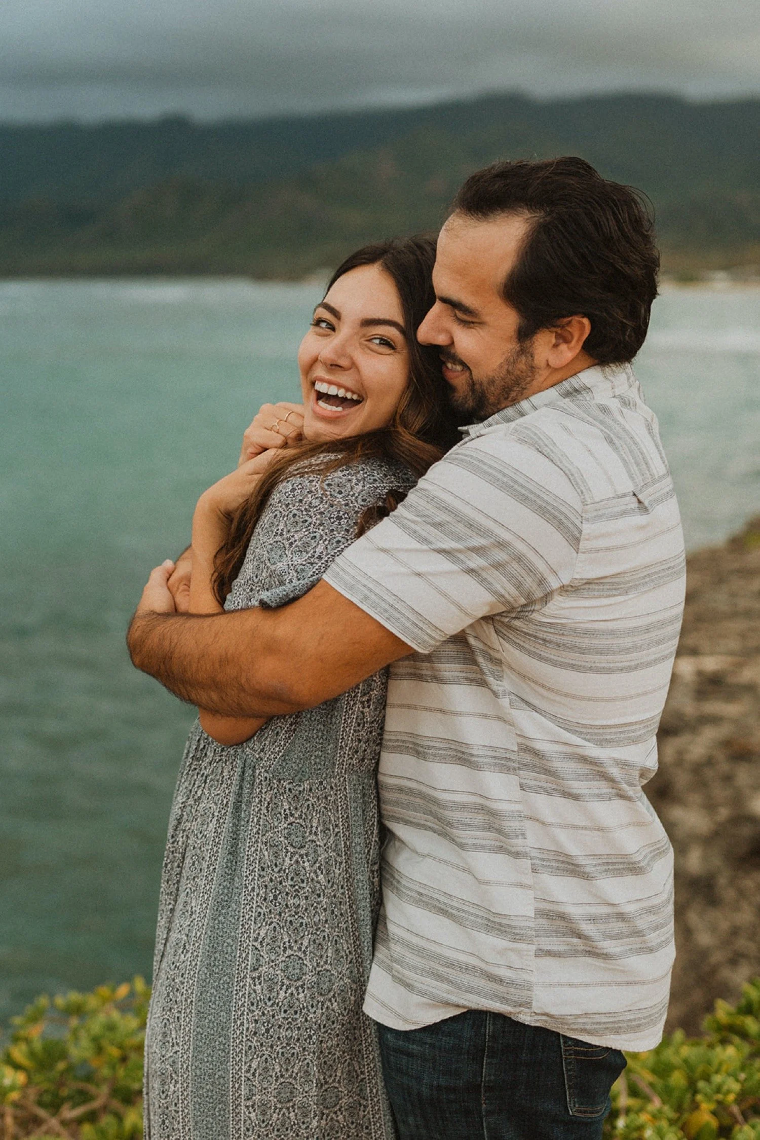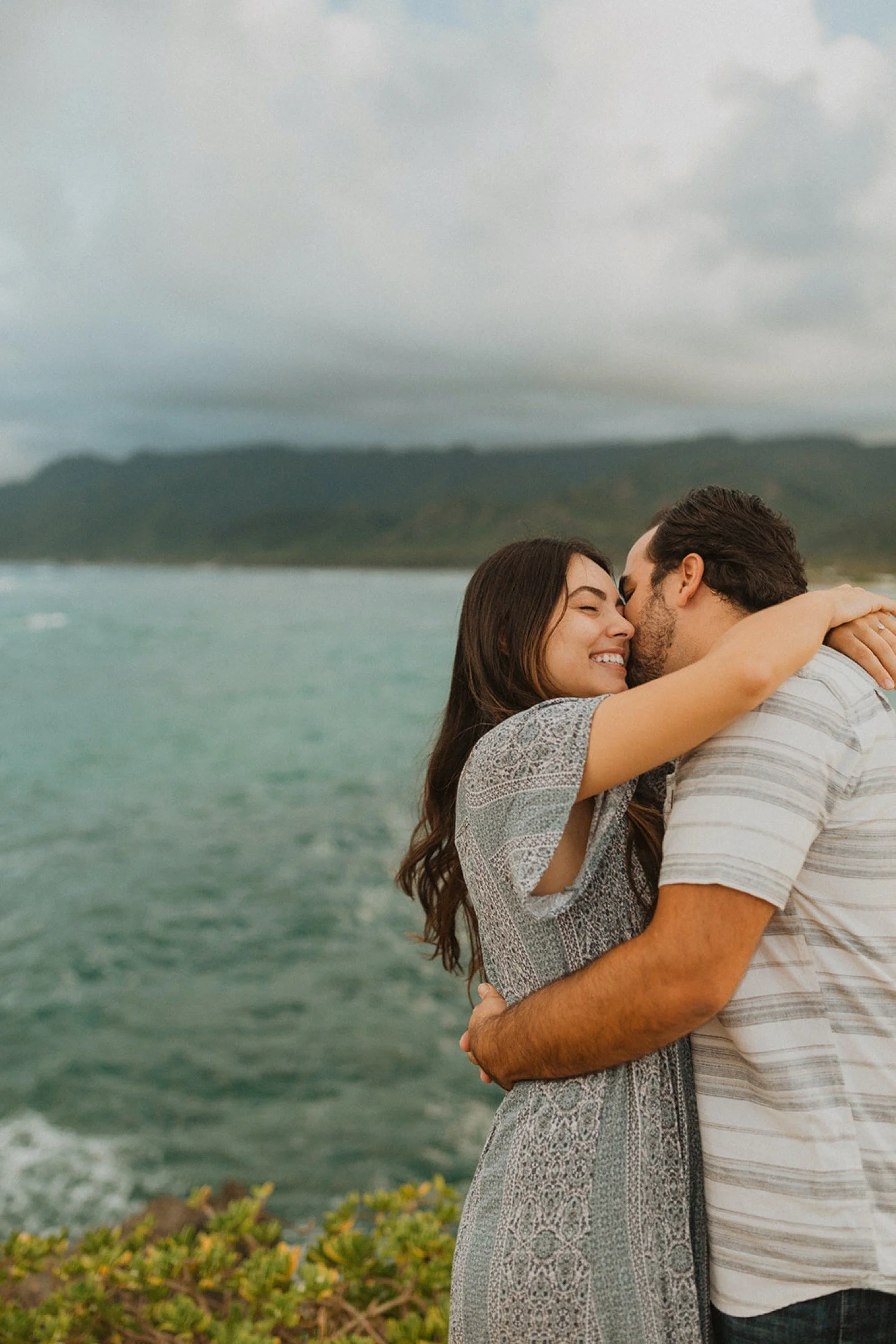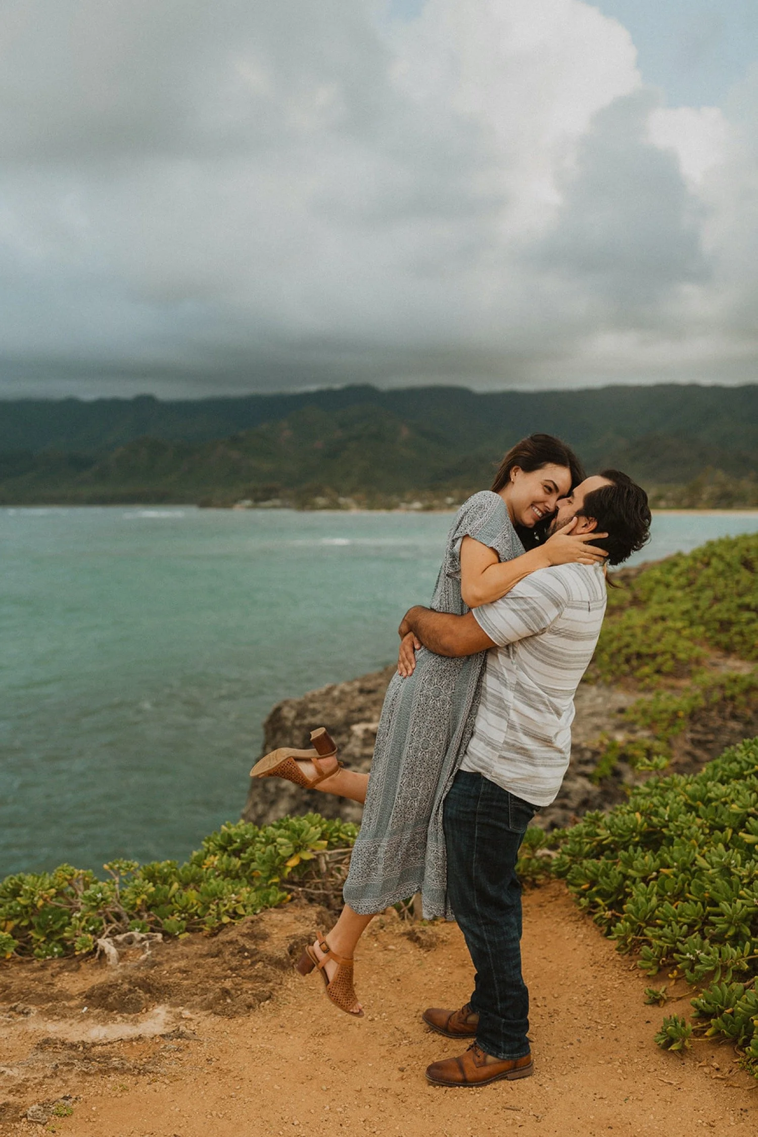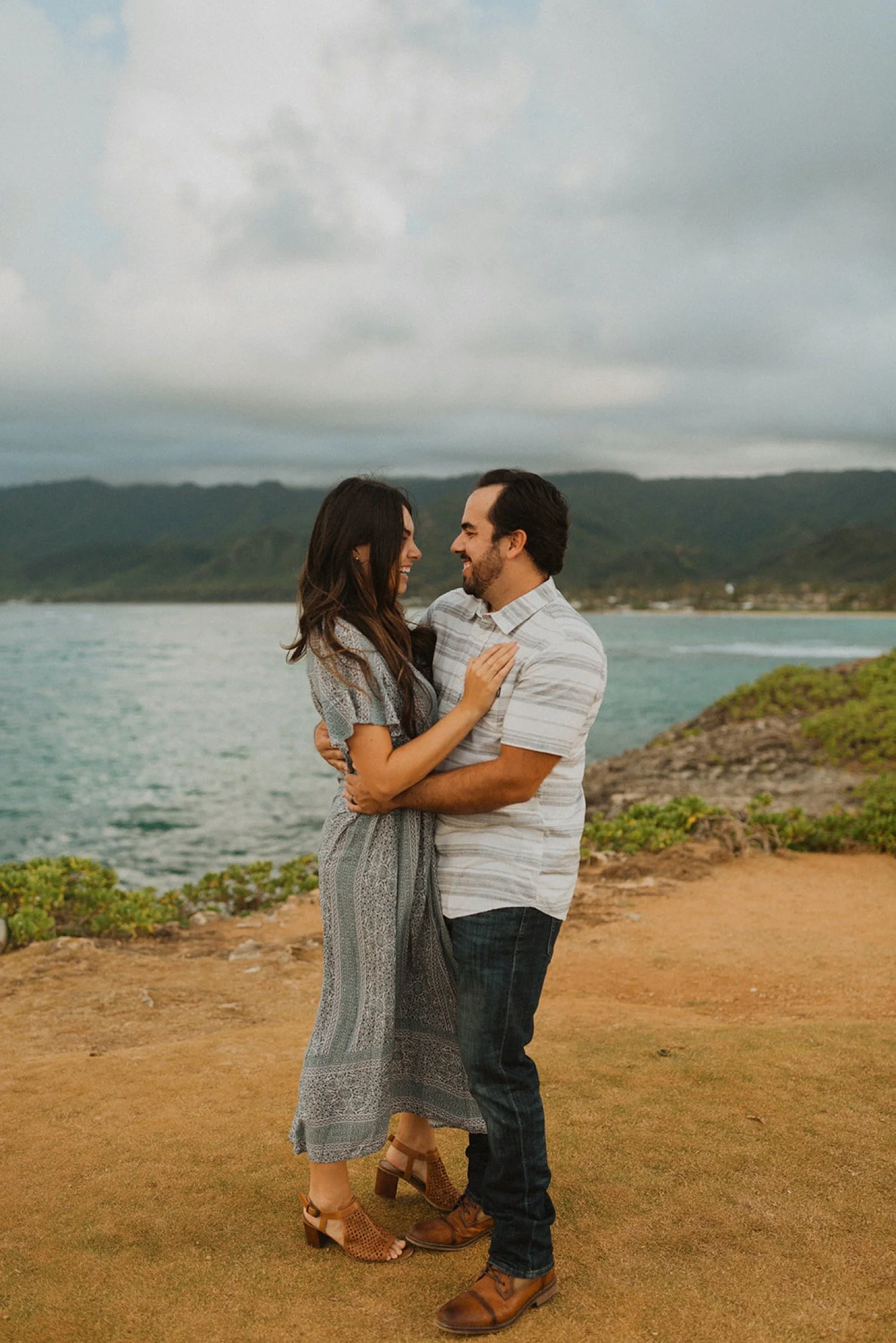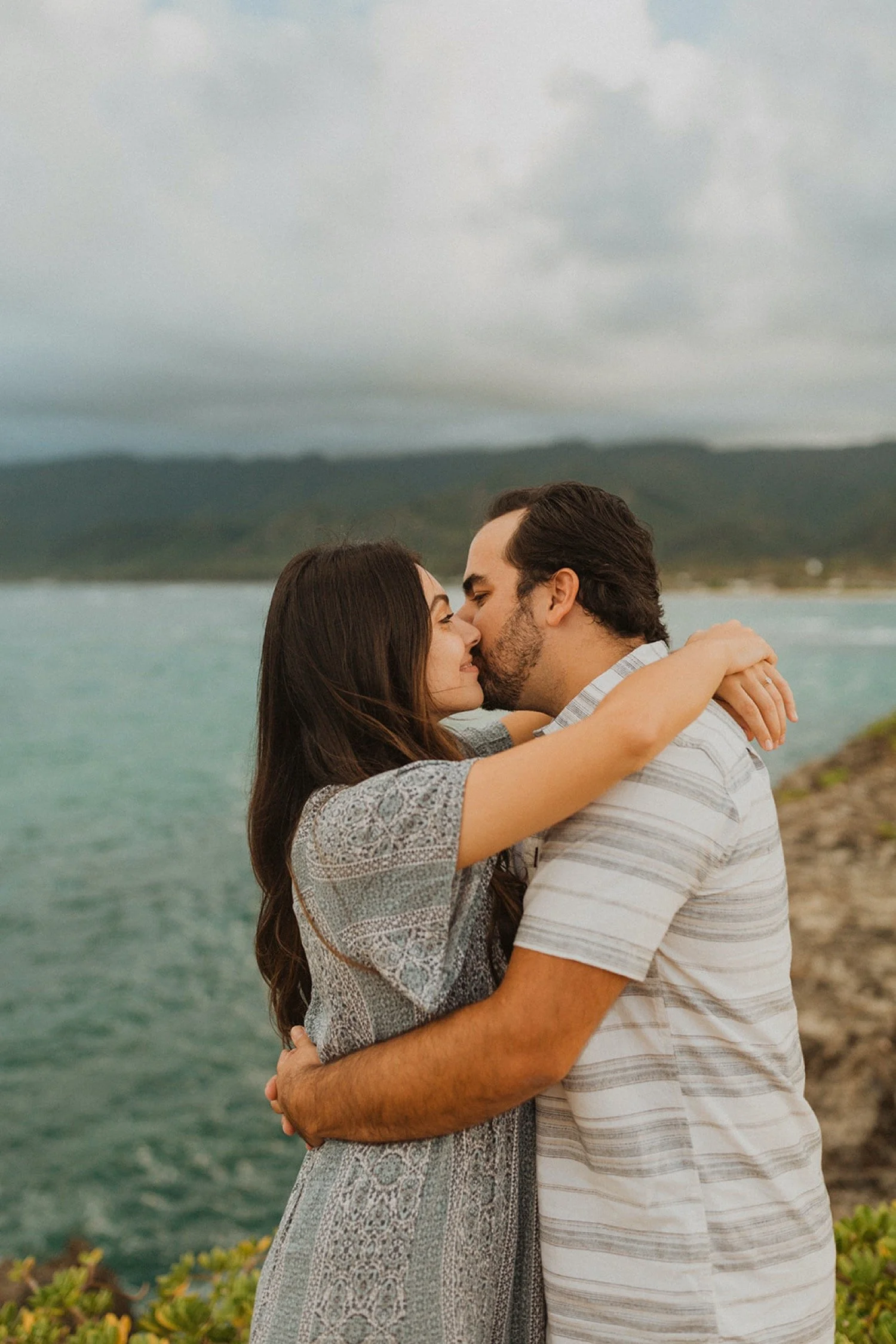 We first, climbed up a cliff and arrived at the most beautiful cliffside spot that overlooked the whole bay, and the prettiest blue ocean (that Hawaii never disappoints with). We got some amazing photos, that truly capture the beauty that this little Hawaiian island brings. Then, we headed down to the beach to play in the waves. I was so glad that Chris + Hanna wanted to get in the ocean for their couples session because it is always so much fun!