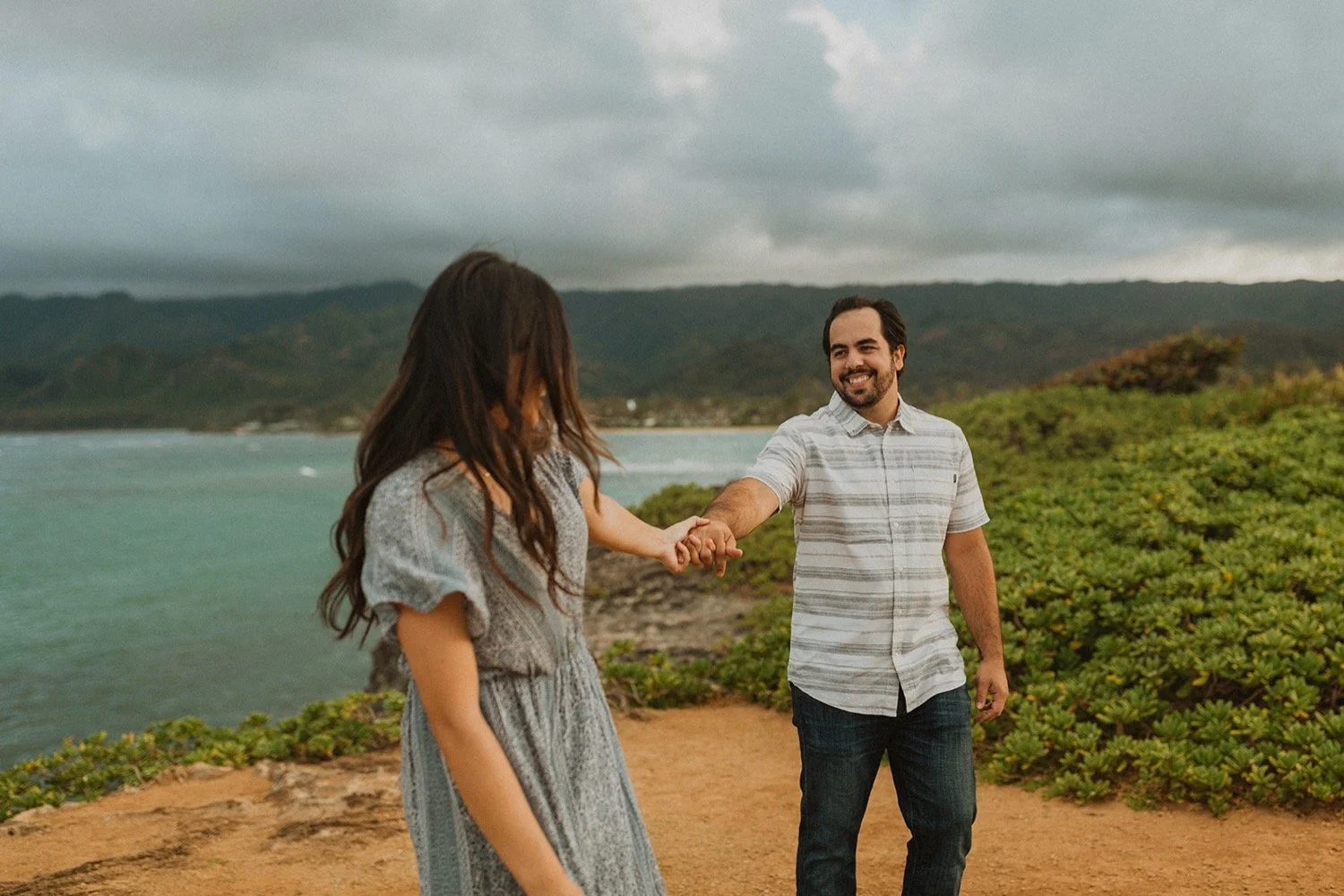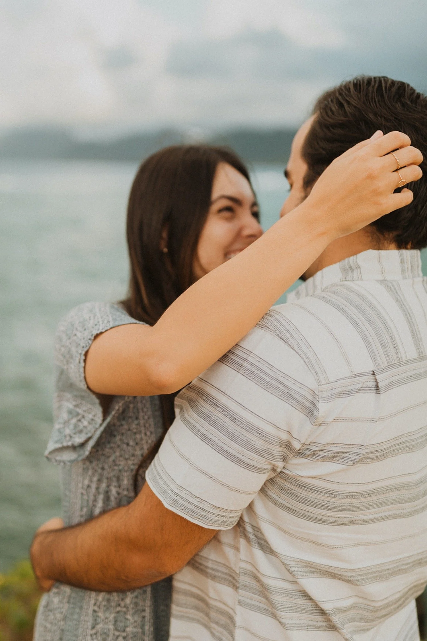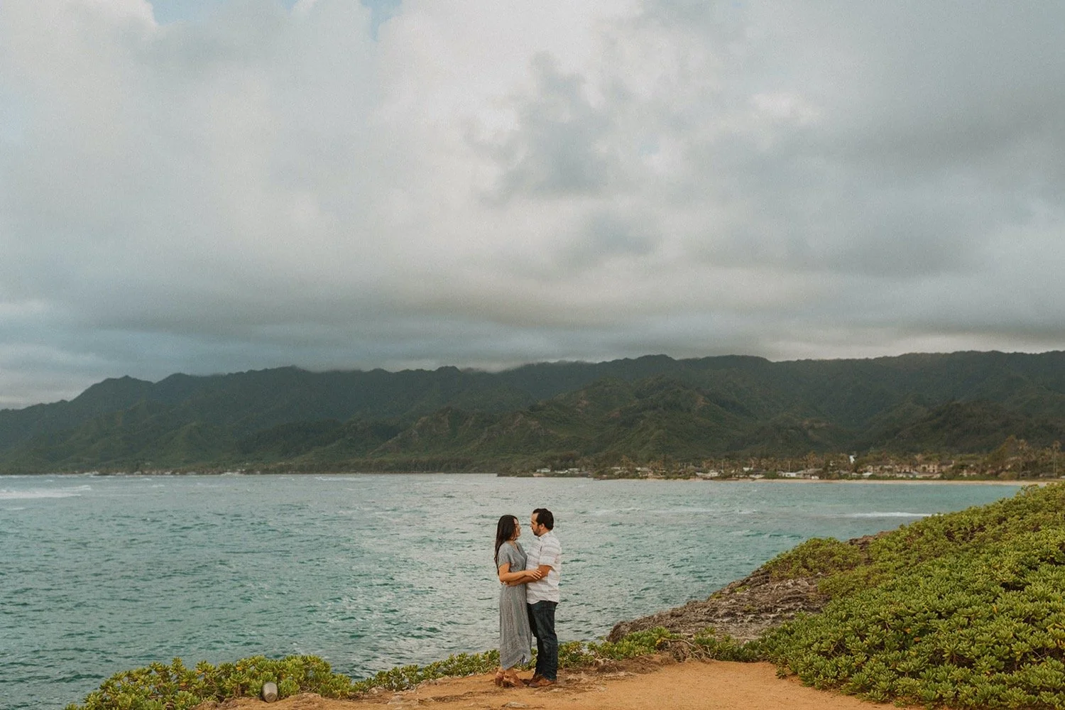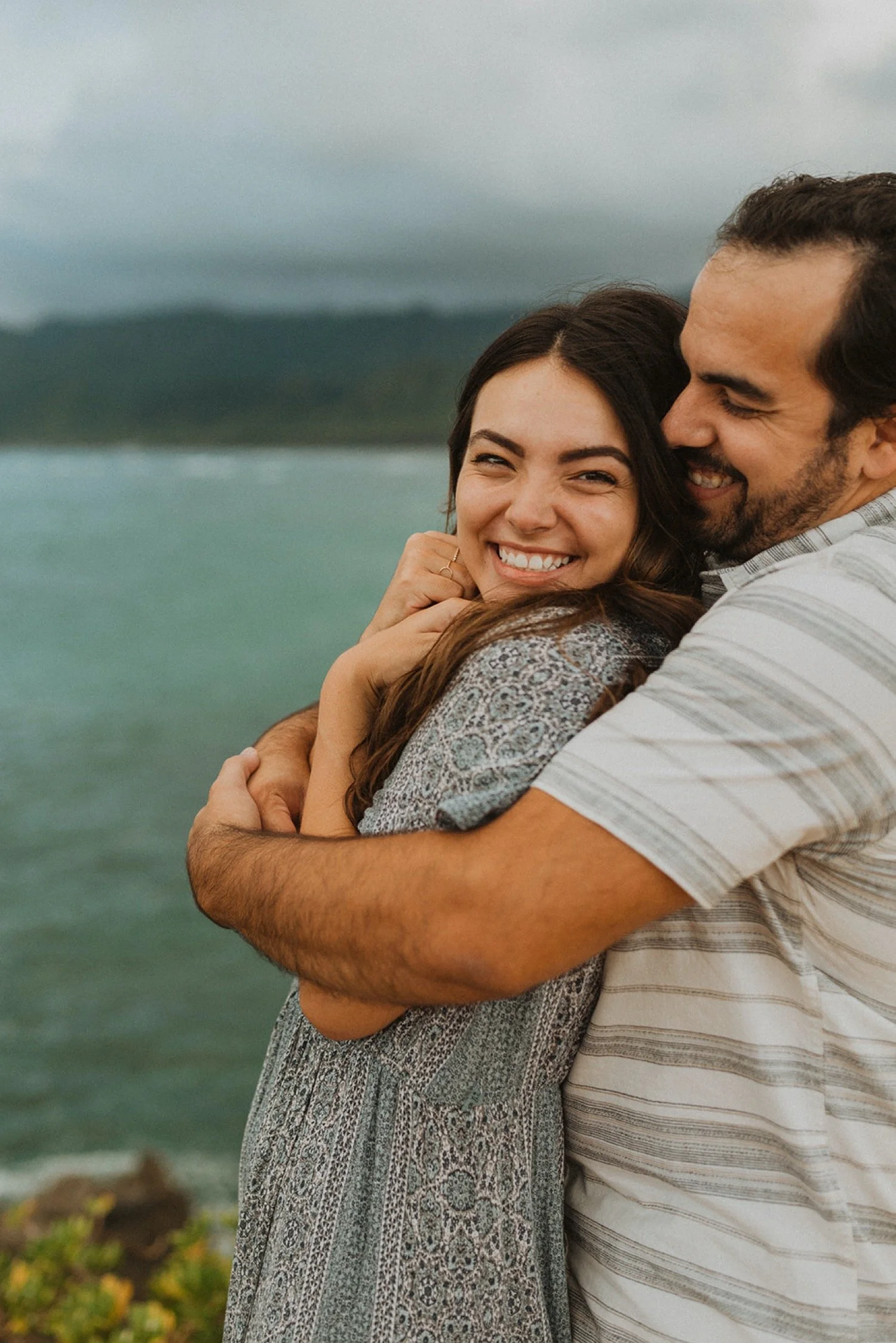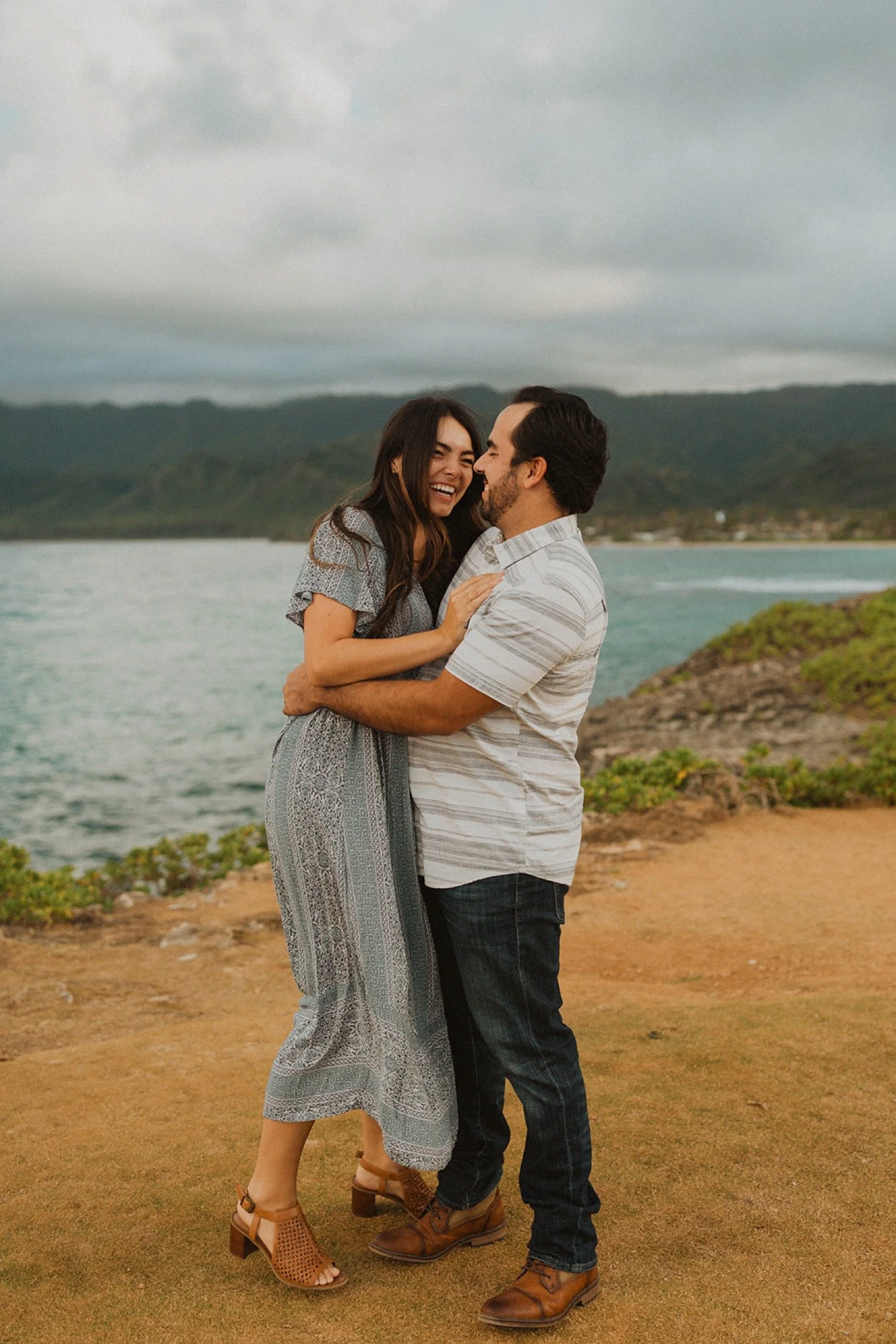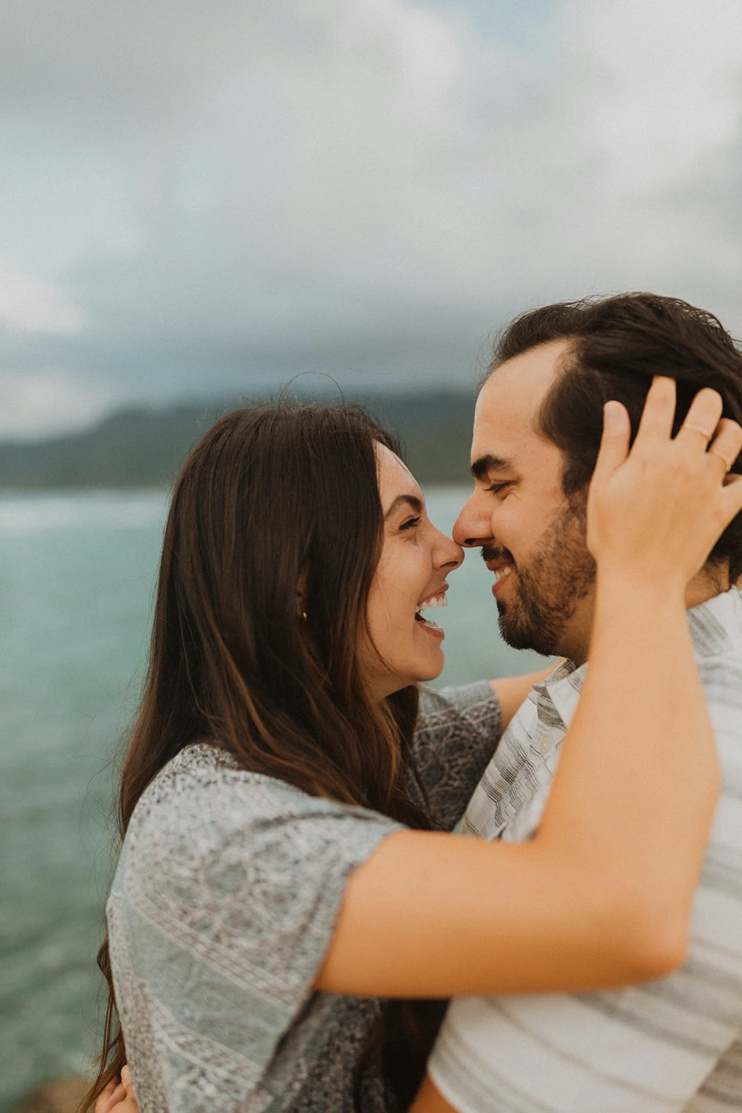 We first, climbed up a cliff and arrived at the most beautiful cliffside spot that overlooked the whole bay, and the prettiest blue ocean (that Hawaii never disappoints with). We got some amazing photos, that truly capture the beauty that this little Hawaiian island brings. Then, we headed down to the beach to play in the waves. I was so glad that Chris + Hanna wanted to get in the ocean for their couples session because it is always so much fun!