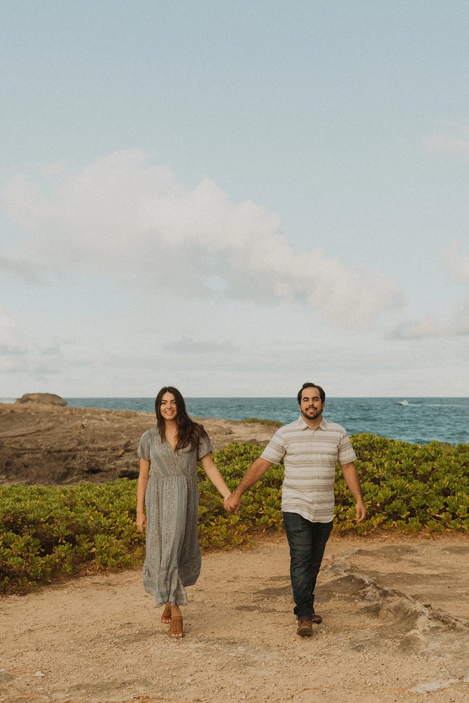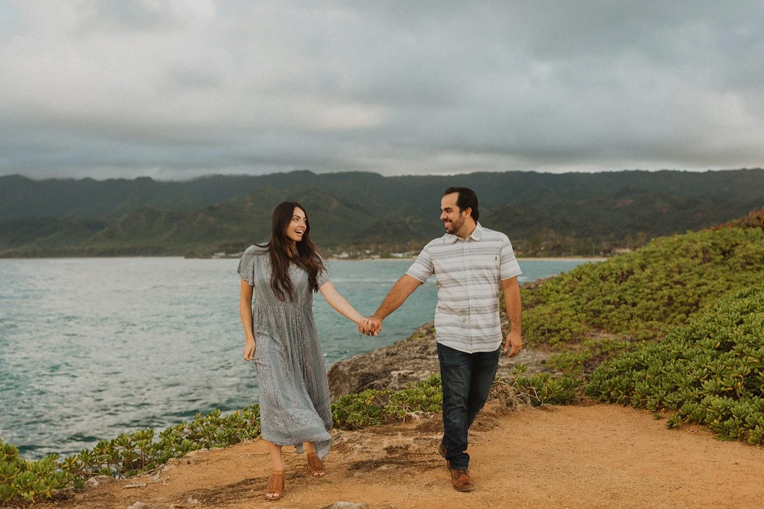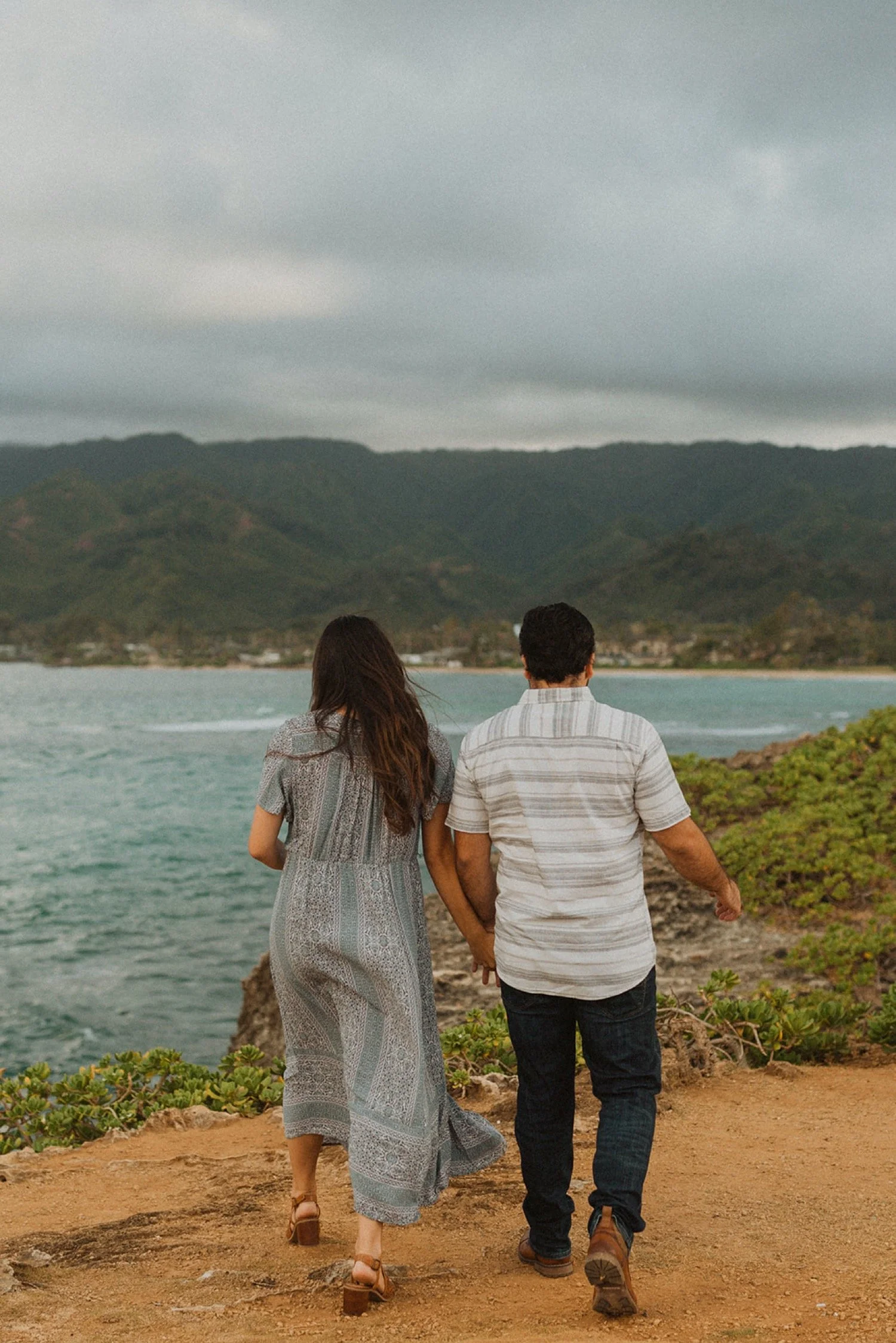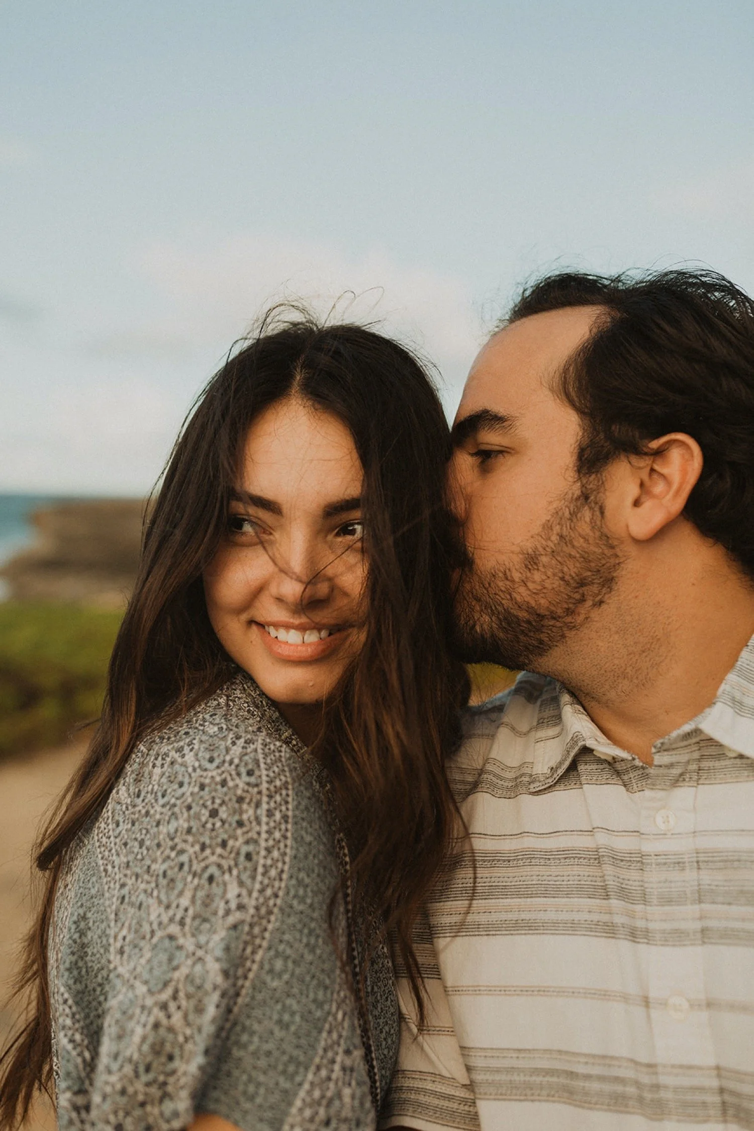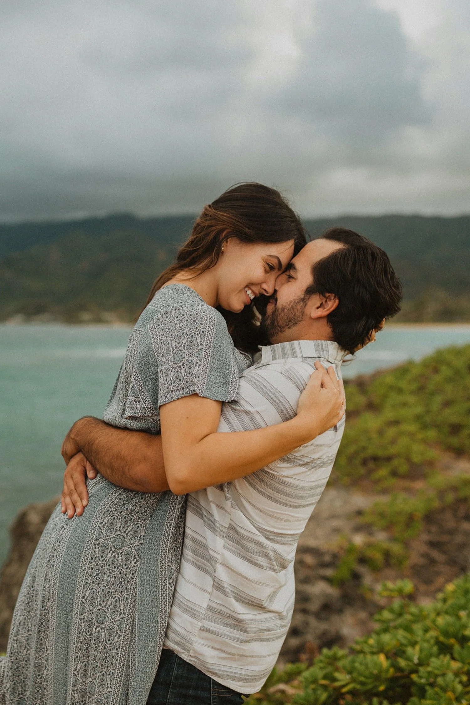 We first, climbed up a cliff and arrived at the most beautiful cliffside spot that overlooked the whole bay, and the prettiest blue ocean (that Hawaii never disappoints with). We got some amazing photos, that truly capture the beauty that this little Hawaiian island brings. Then, we headed down to the beach to play in the waves. I was so glad that Chris + Hanna wanted to get in the ocean for their couples session because it is always so much fun!