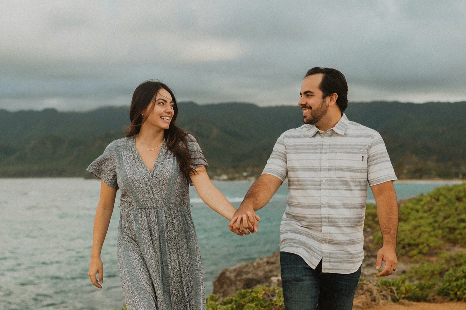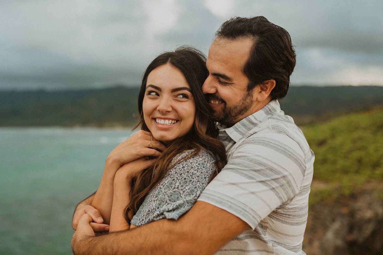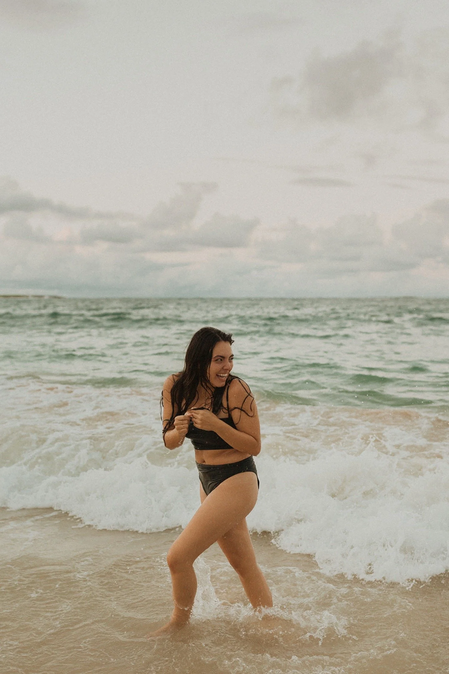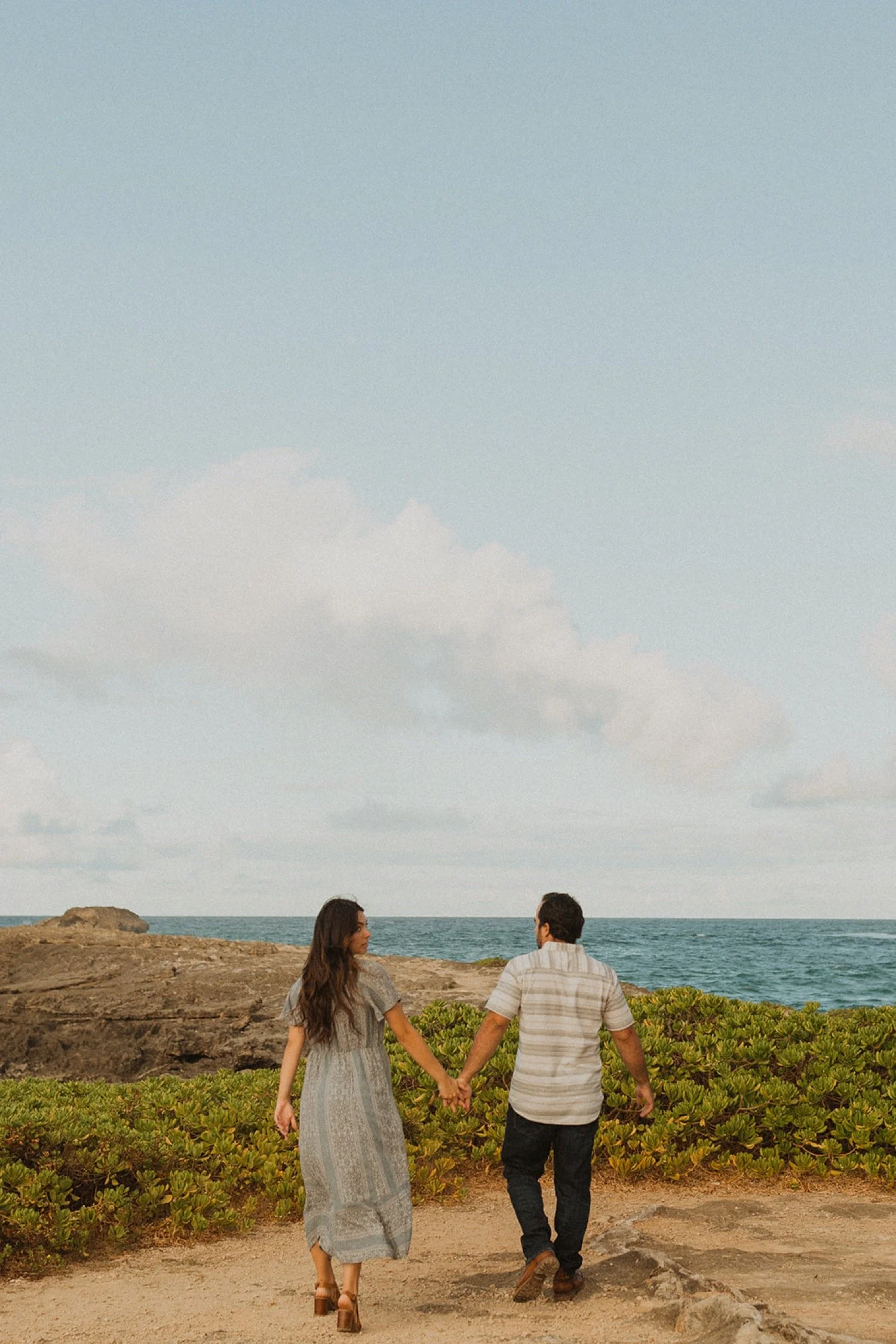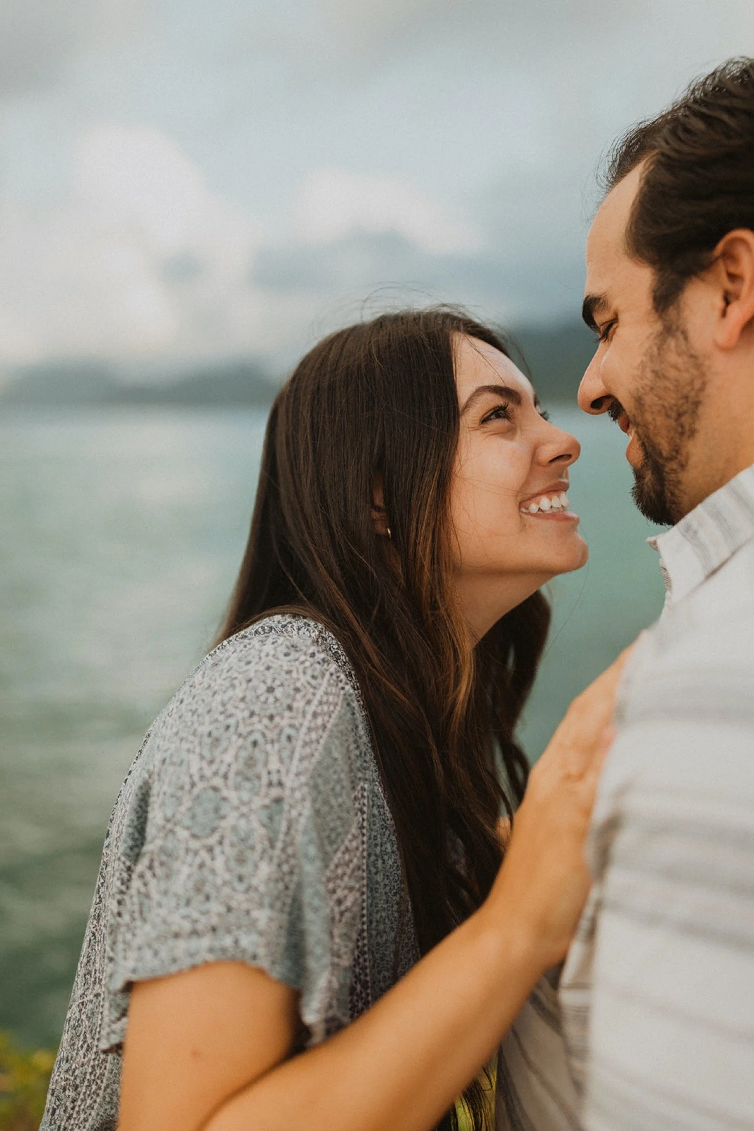 We first, climbed up a cliff and arrived at the most beautiful cliffside spot that overlooked the whole bay, and the prettiest blue ocean (that Hawaii never disappoints with). We got some amazing photos, that truly capture the beauty that this little Hawaiian island brings. Then, we headed down to the beach to play in the waves. I was so glad that Chris + Hanna wanted to get in the ocean for their couples session because it is always so much fun!