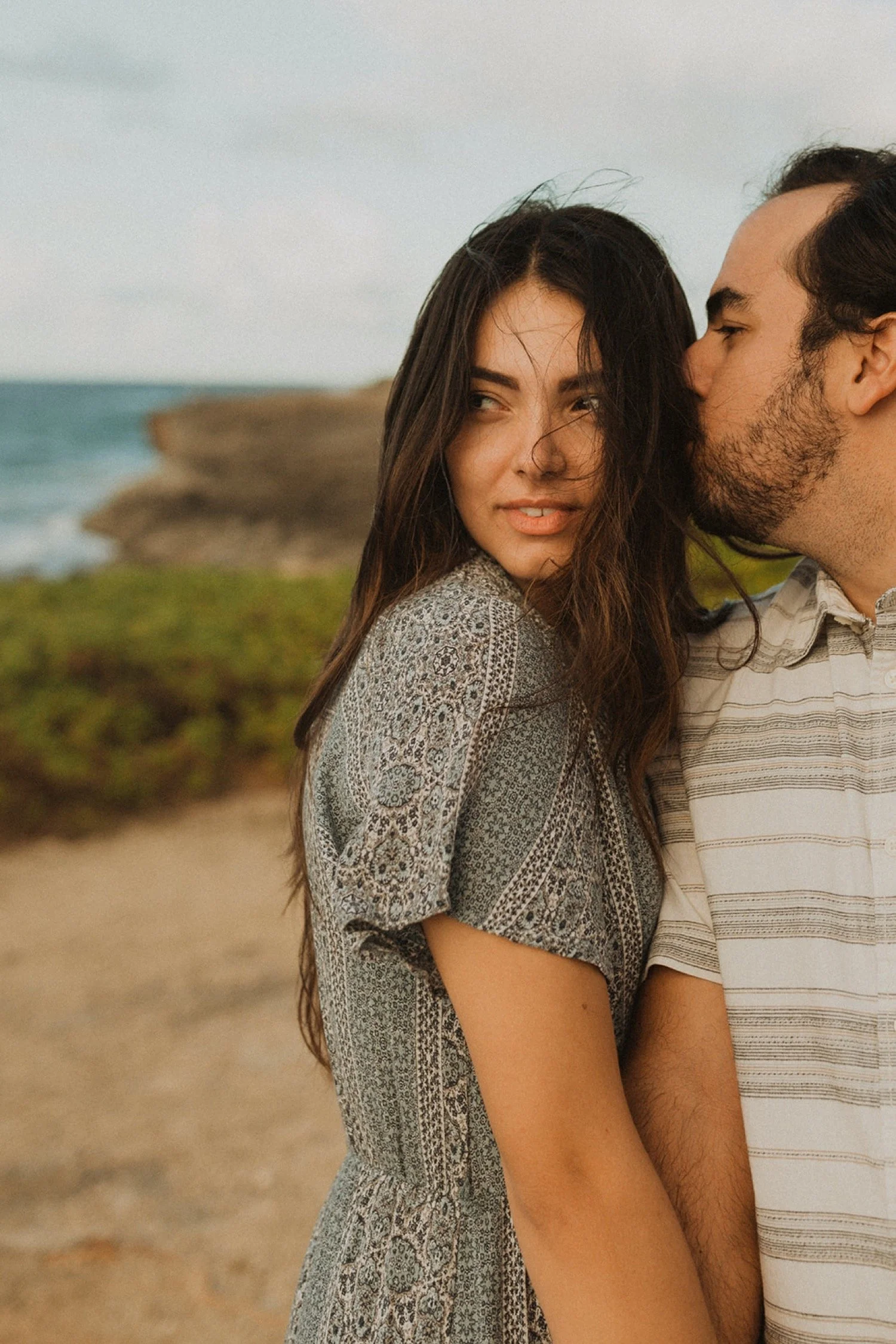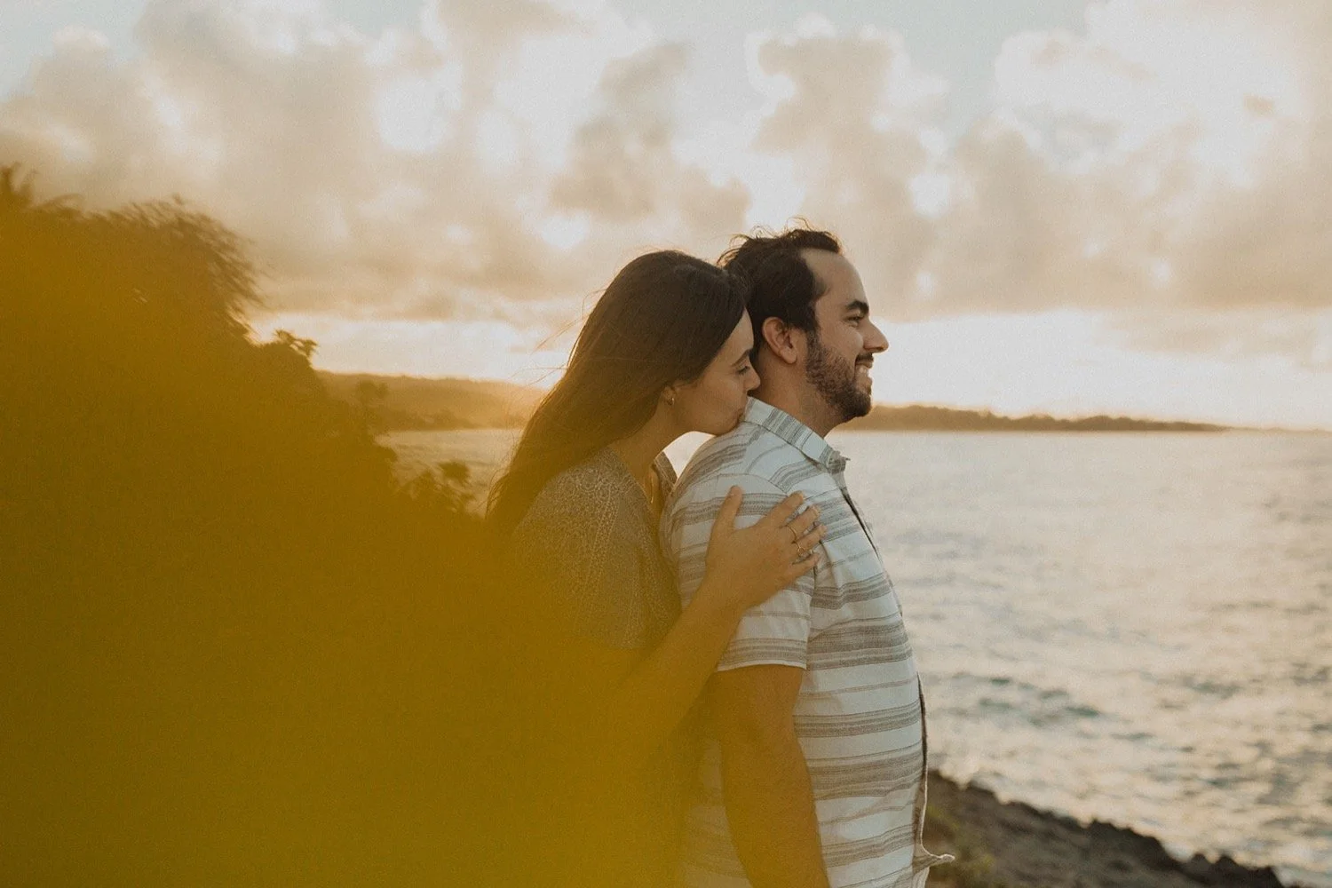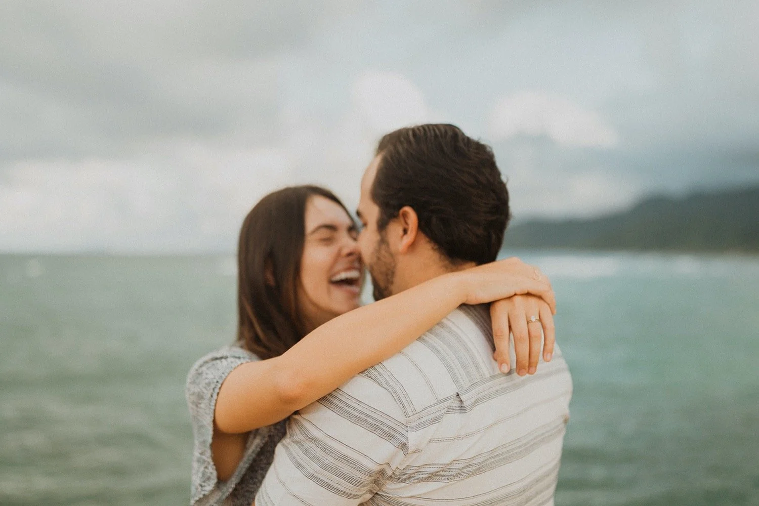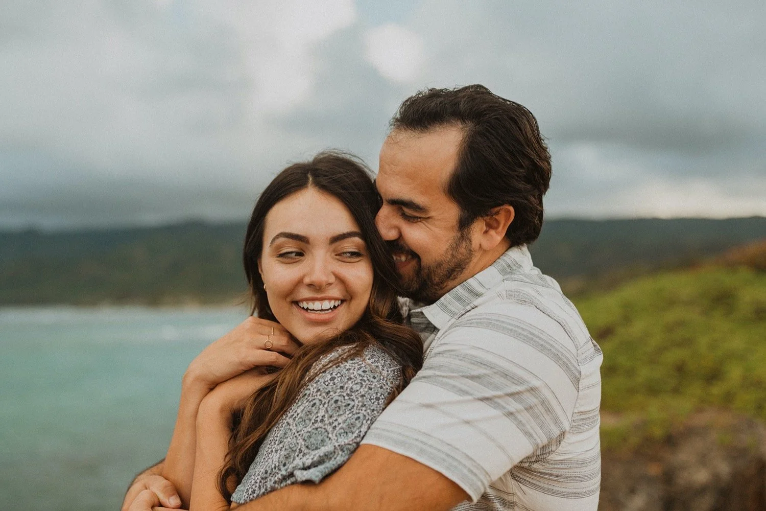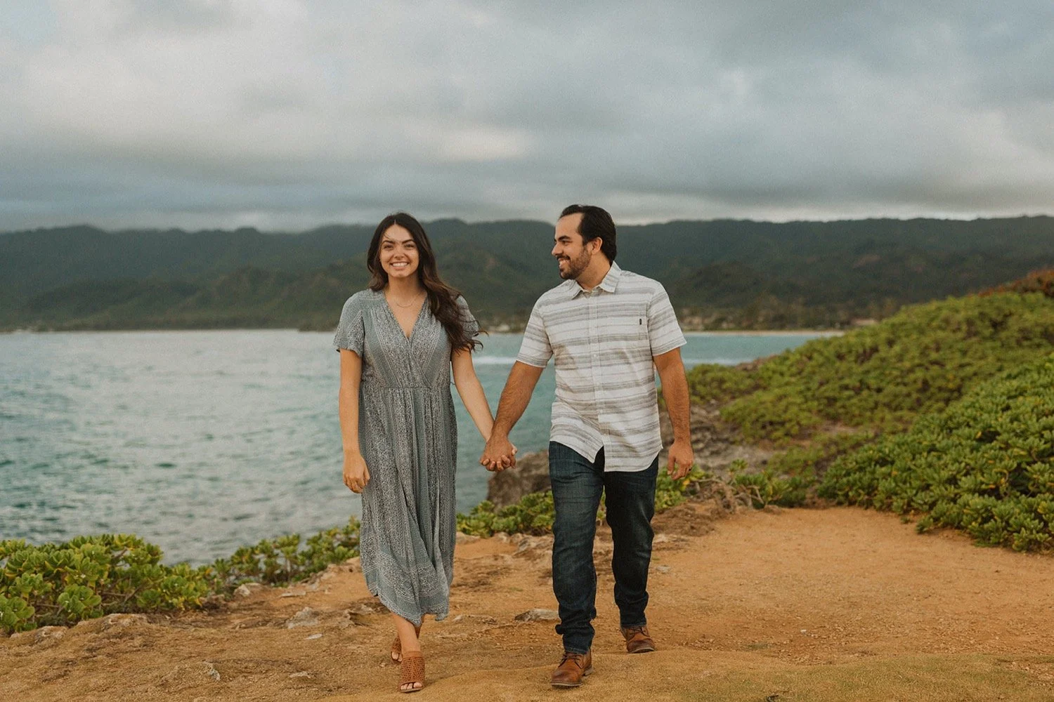 We first, climbed up a cliff and arrived at the most beautiful cliffside spot that overlooked the whole bay, and the prettiest blue ocean (that Hawaii never disappoints with). We got some amazing photos, that truly capture the beauty that this little Hawaiian island brings. Then, we headed down to the beach to play in the waves. I was so glad that Chris + Hanna wanted to get in the ocean for their couples session because it is always so much fun!