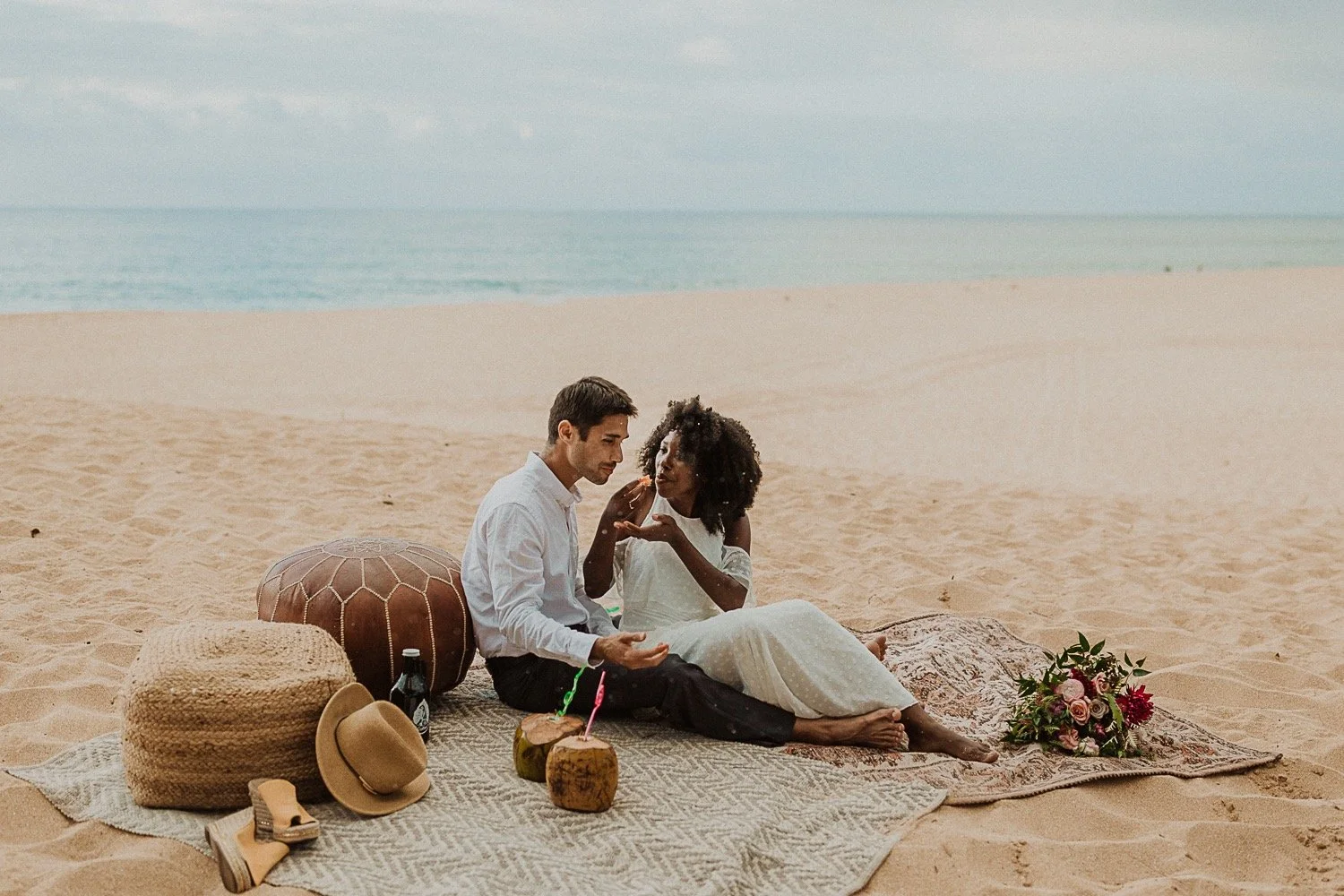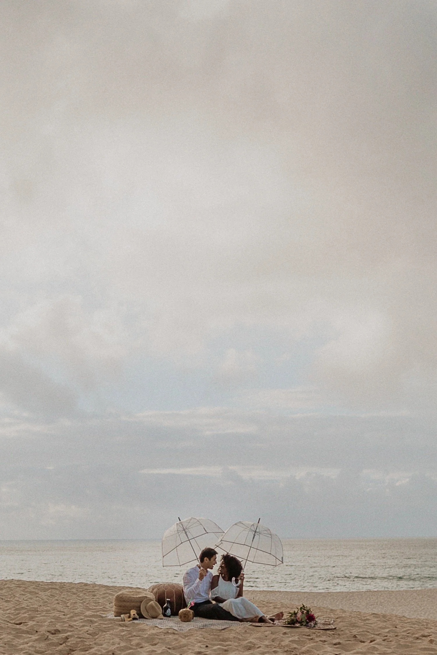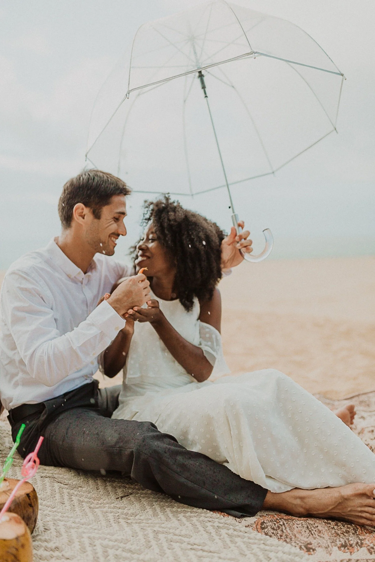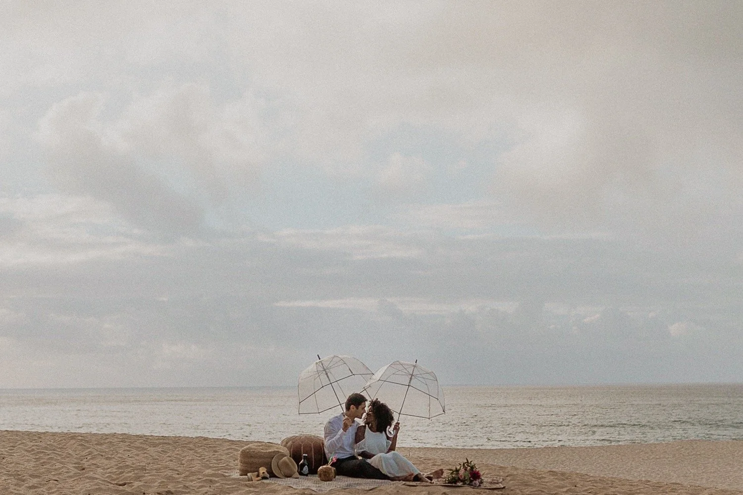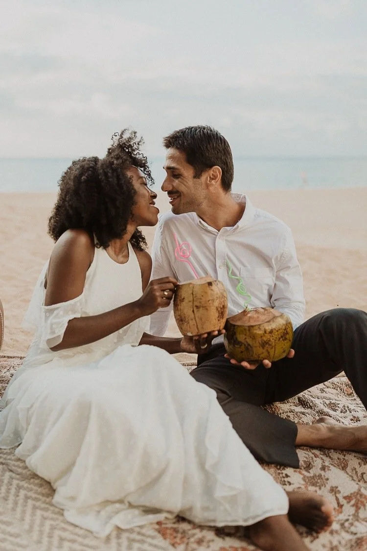 They had a sweet little picnic on the sand with fresh mango and coconuts. It was so simple but made the day feel even more special. Right as they sat down for their picnic it started to rain. They just embraced it and let it happen, and it ended up being so much fun!