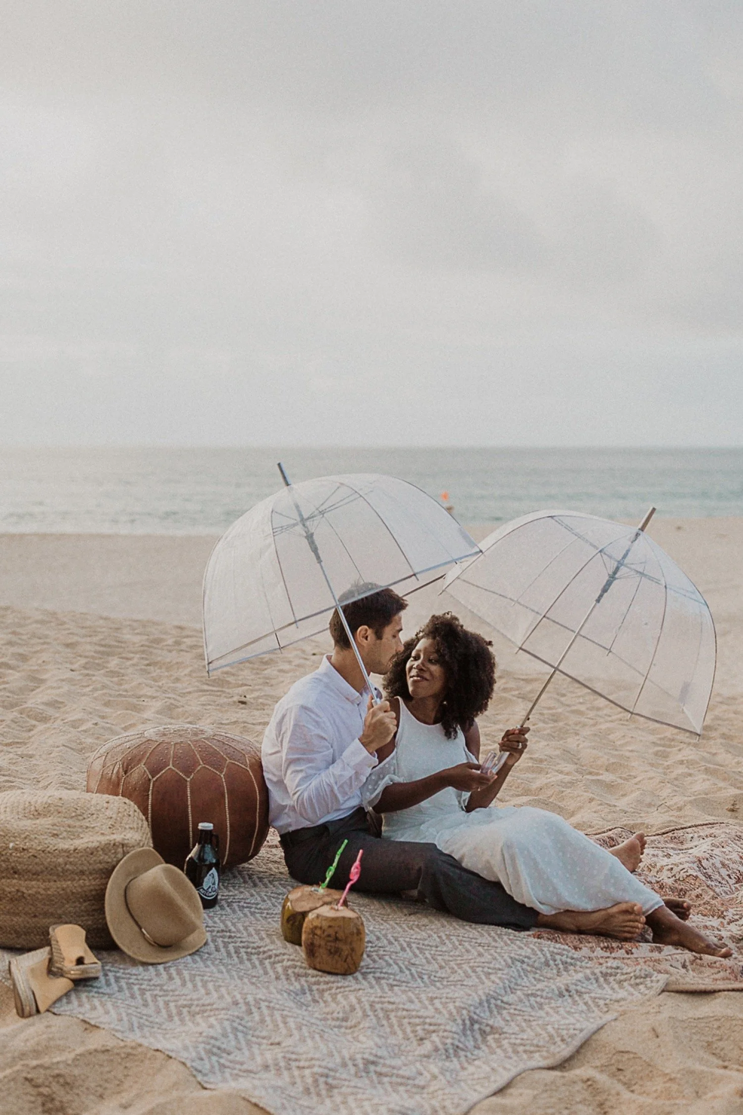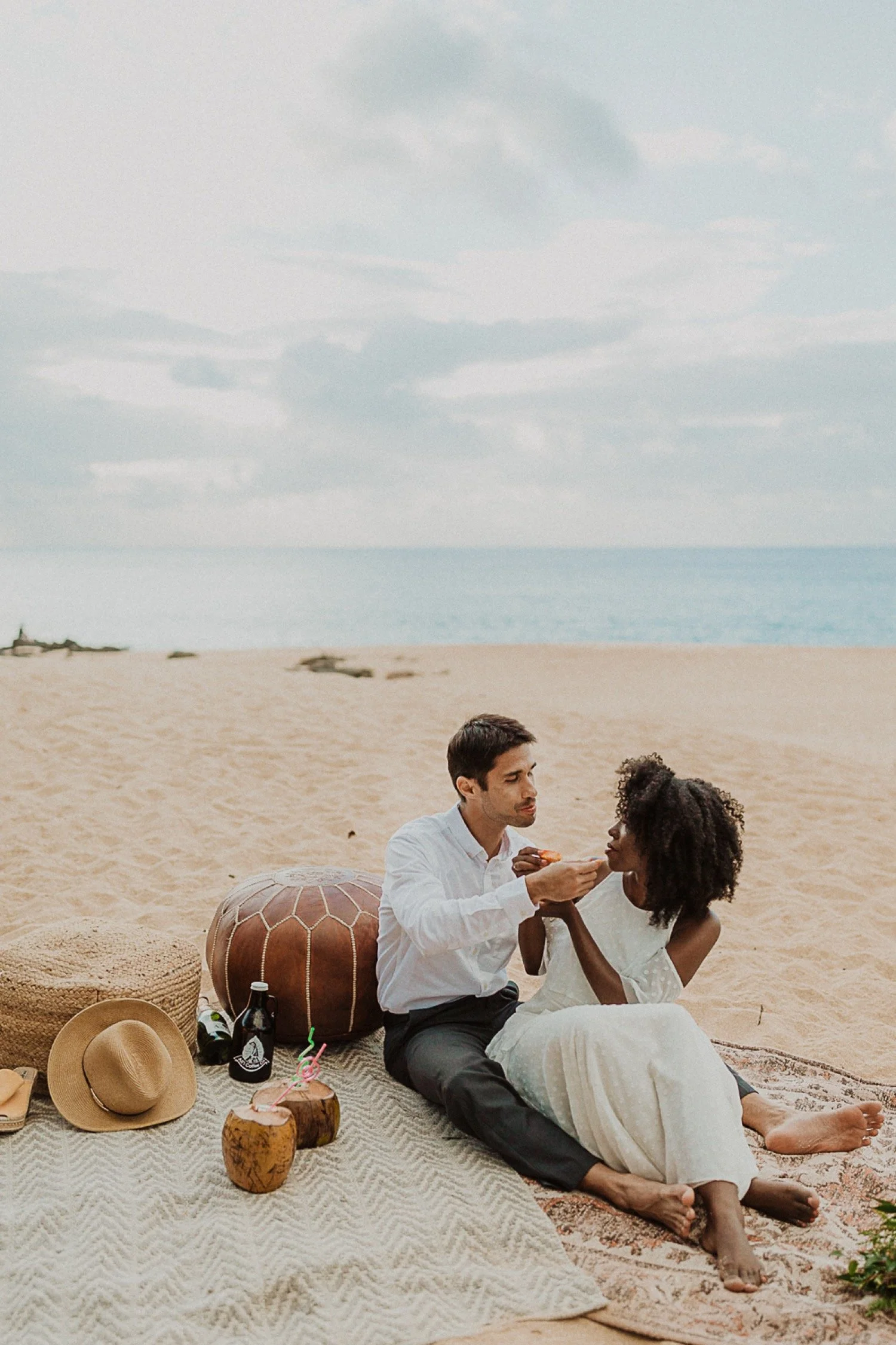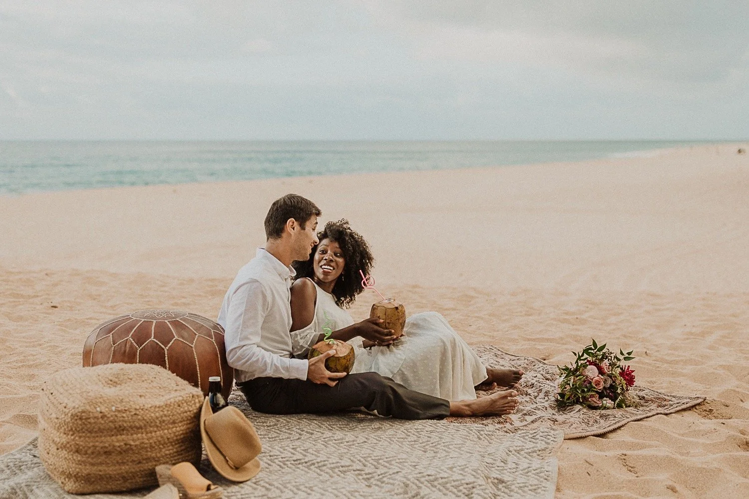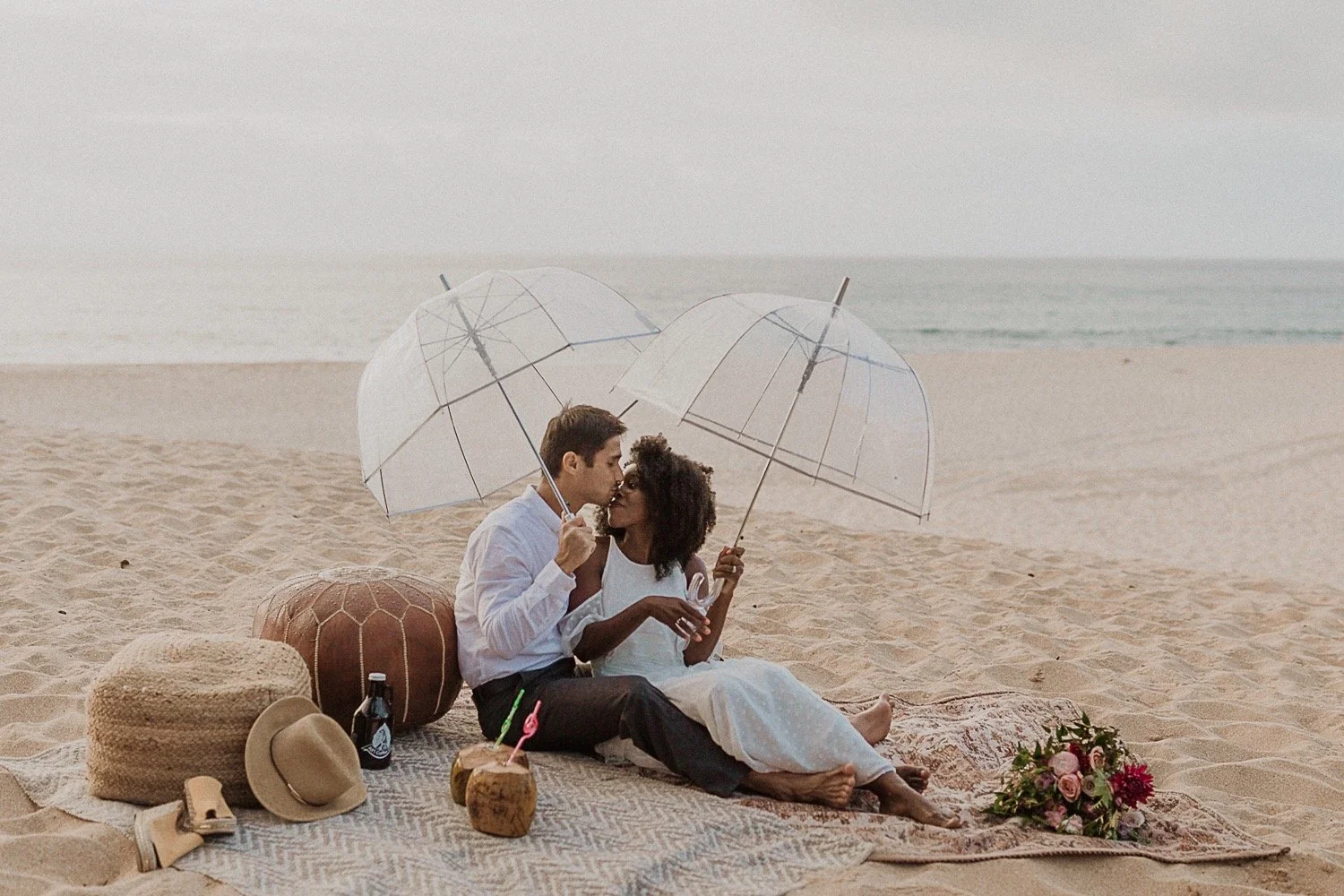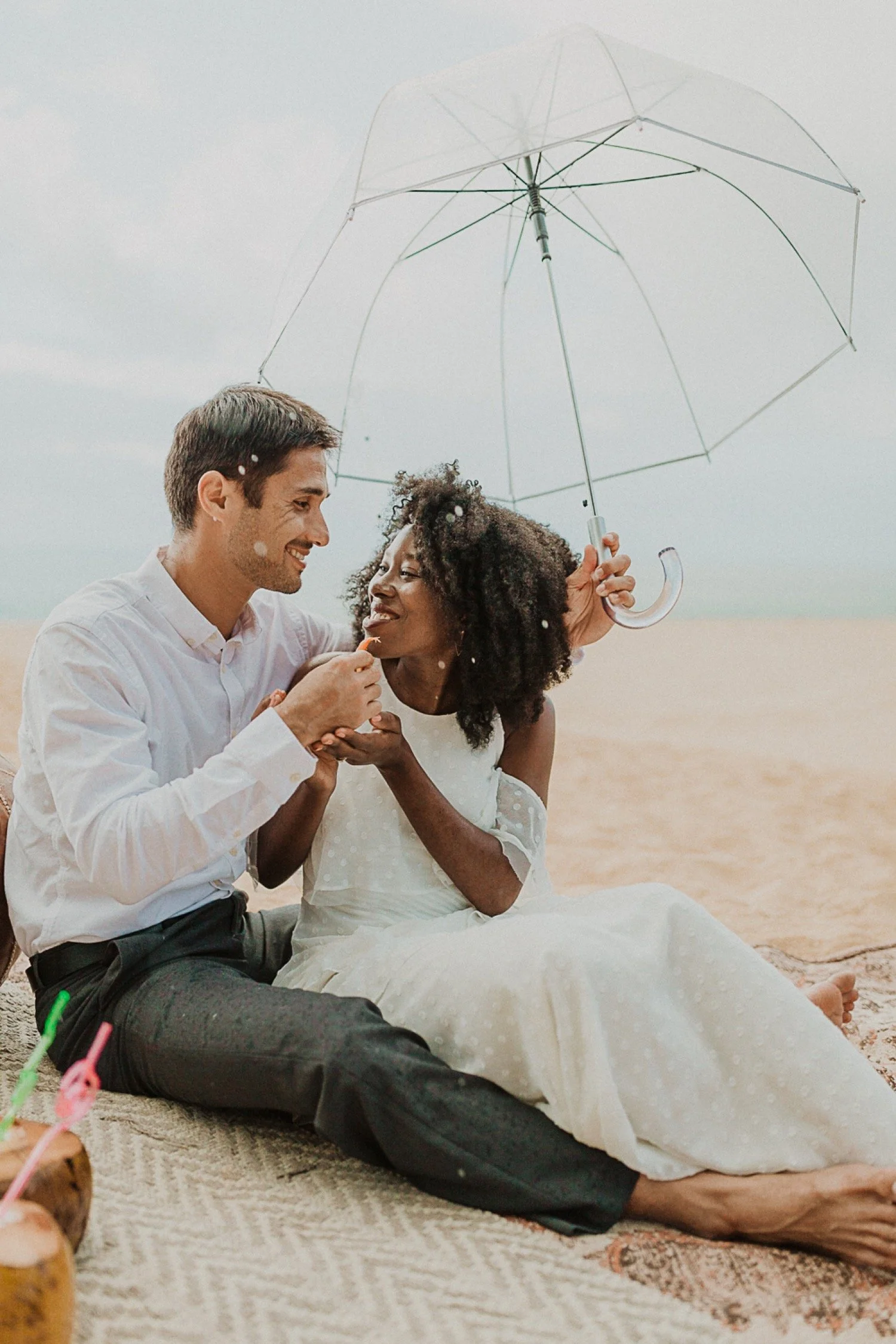They had a sweet little picnic on the sand with fresh mango and coconuts. It was so simple but made the day feel even more special. Right as they sat down for their picnic it started to rain. They just embraced it and let it happen, and it ended up being so much fun!