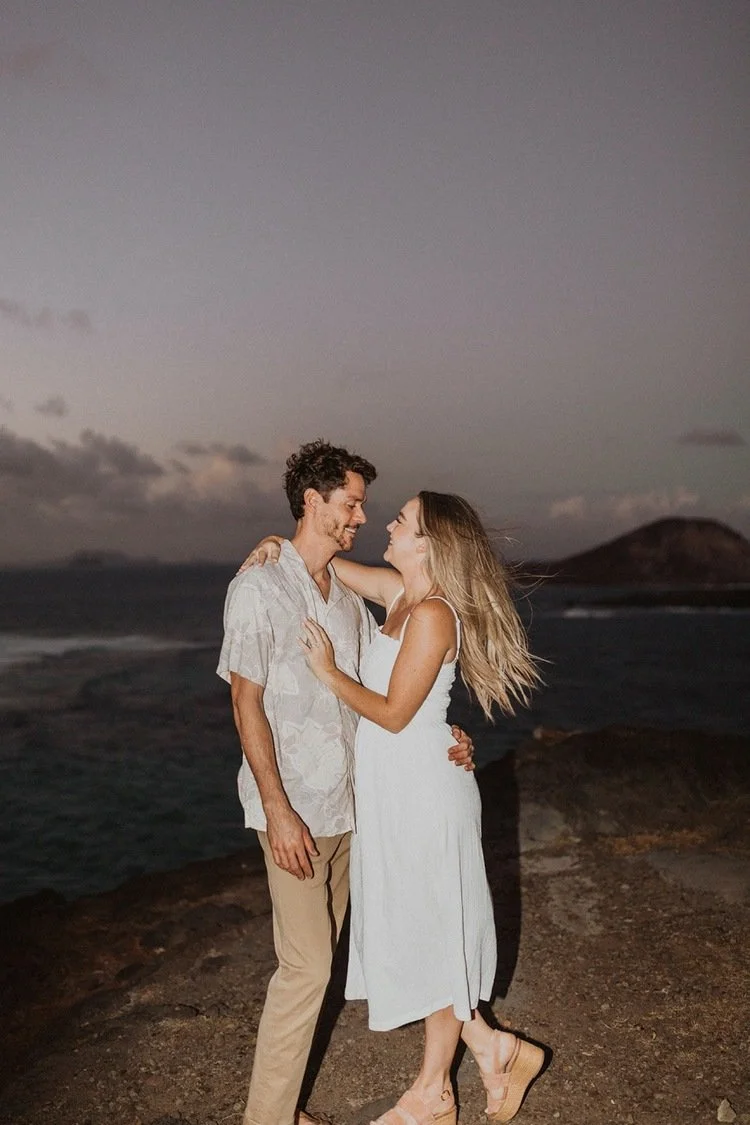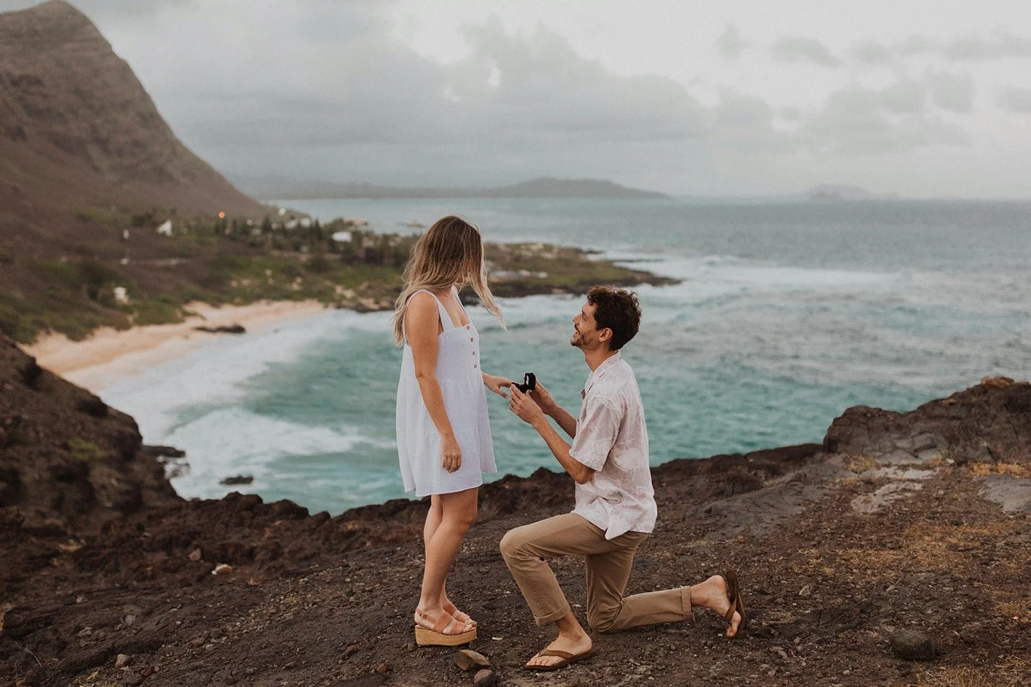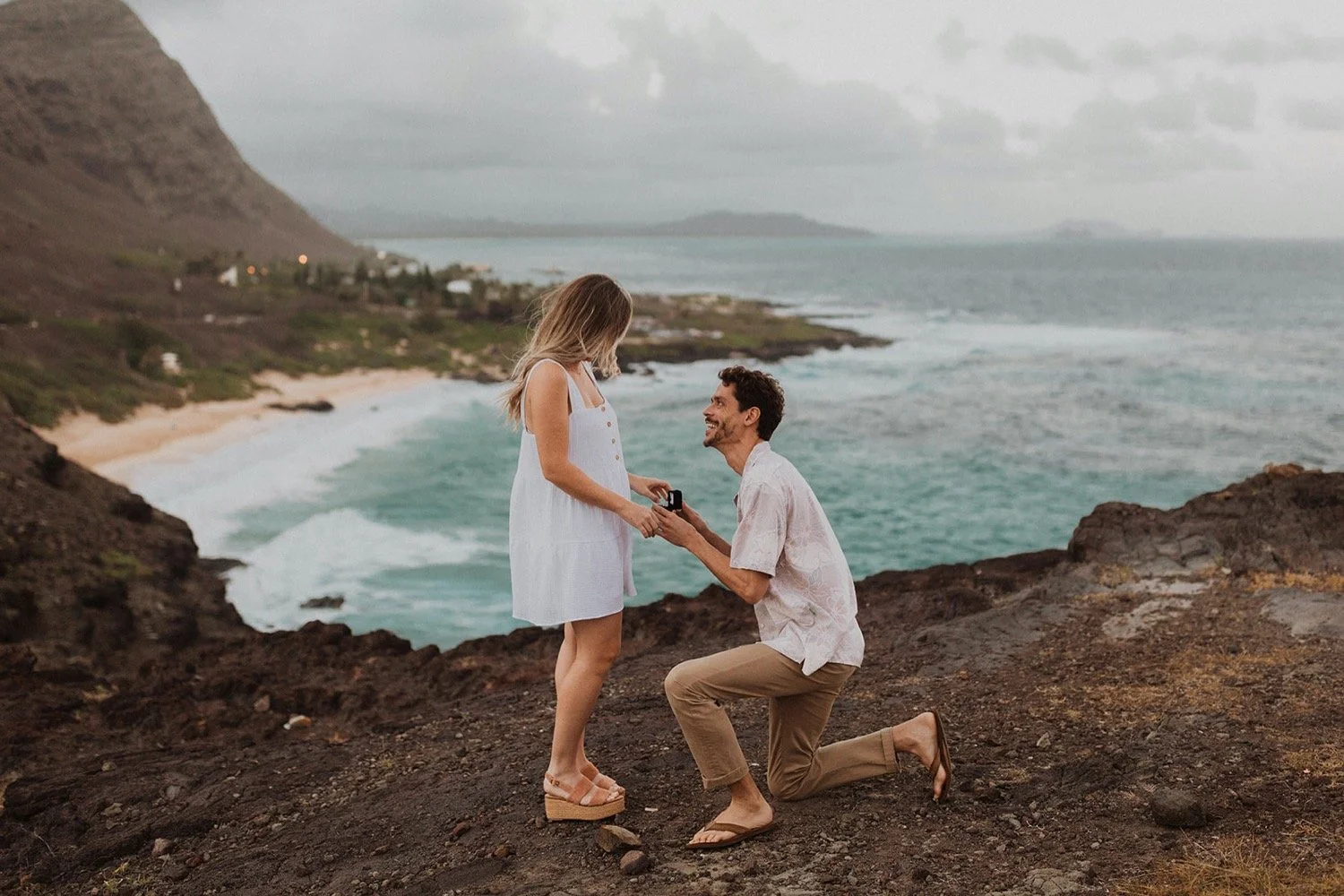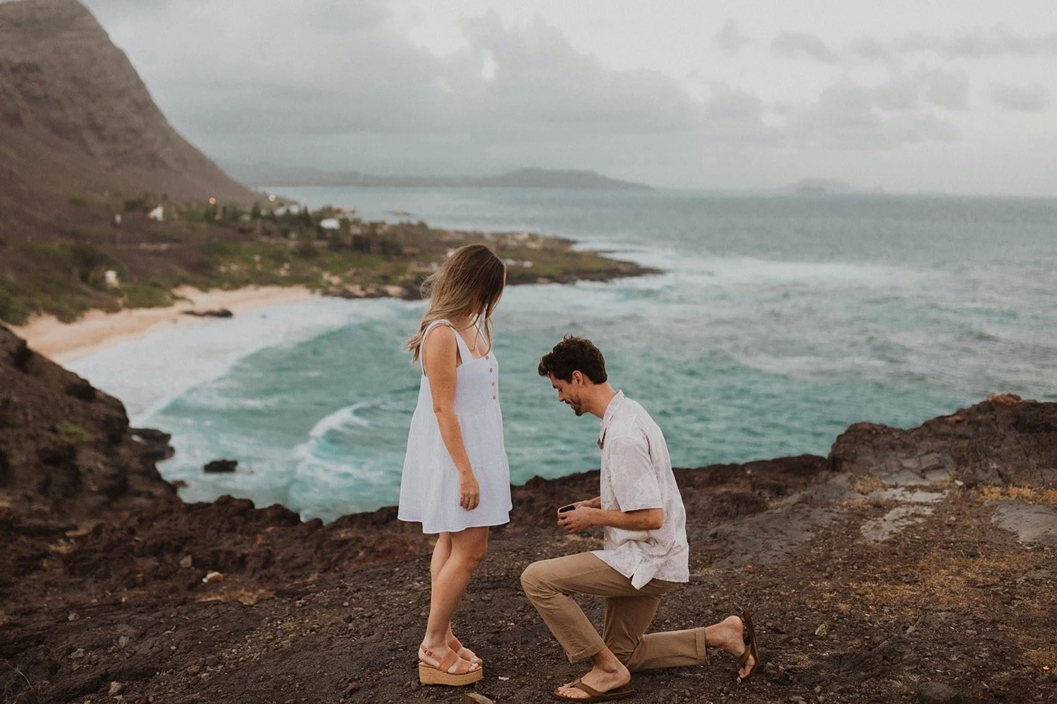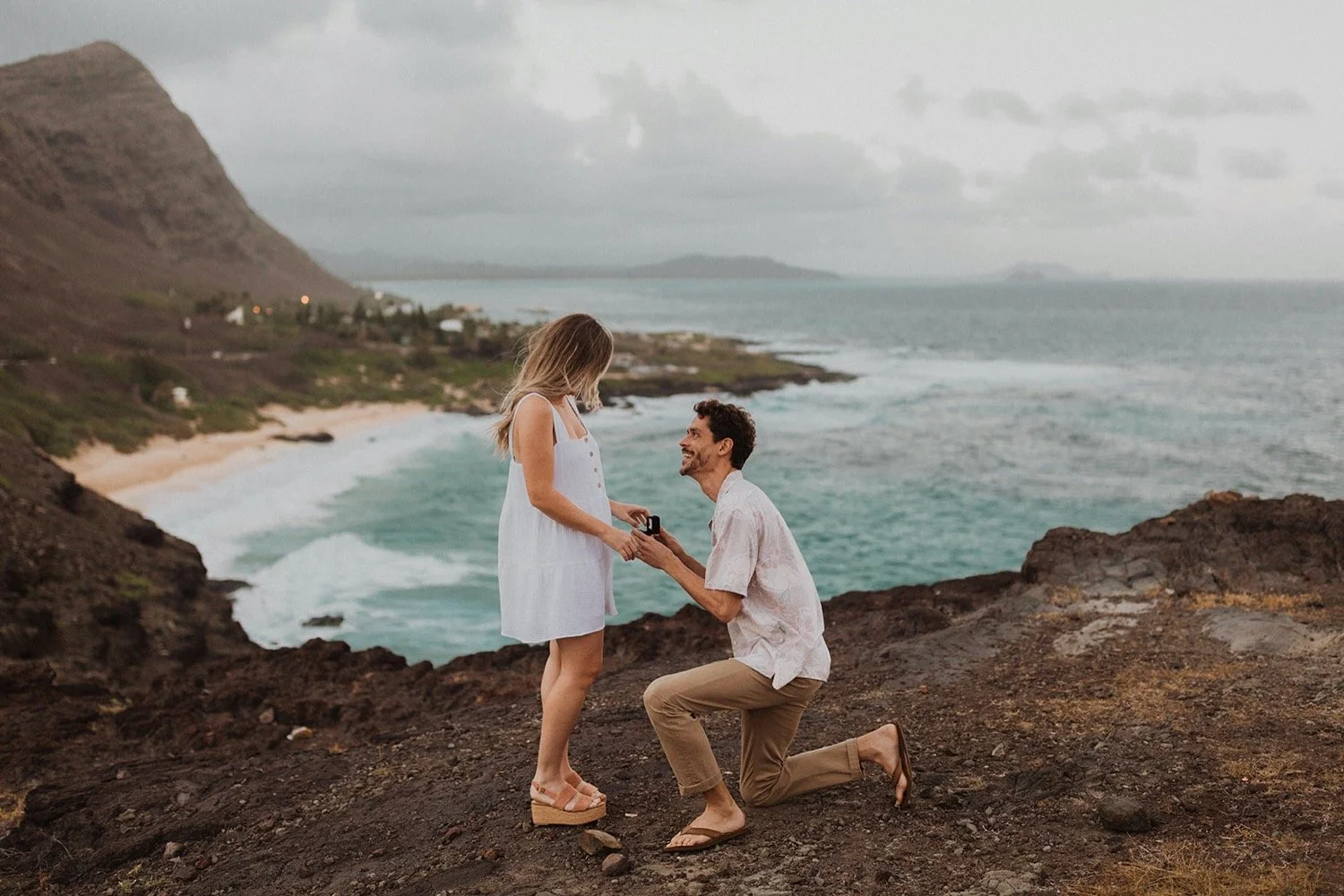 We decided to do the surprise proposal at one of my favorite lookout spots in Hawaii. It is on the East side of Oahu and has the best views of the beautiful blue ocean. This spot also looks out on the city where they live and has a gorgeous view of the island and coastline.