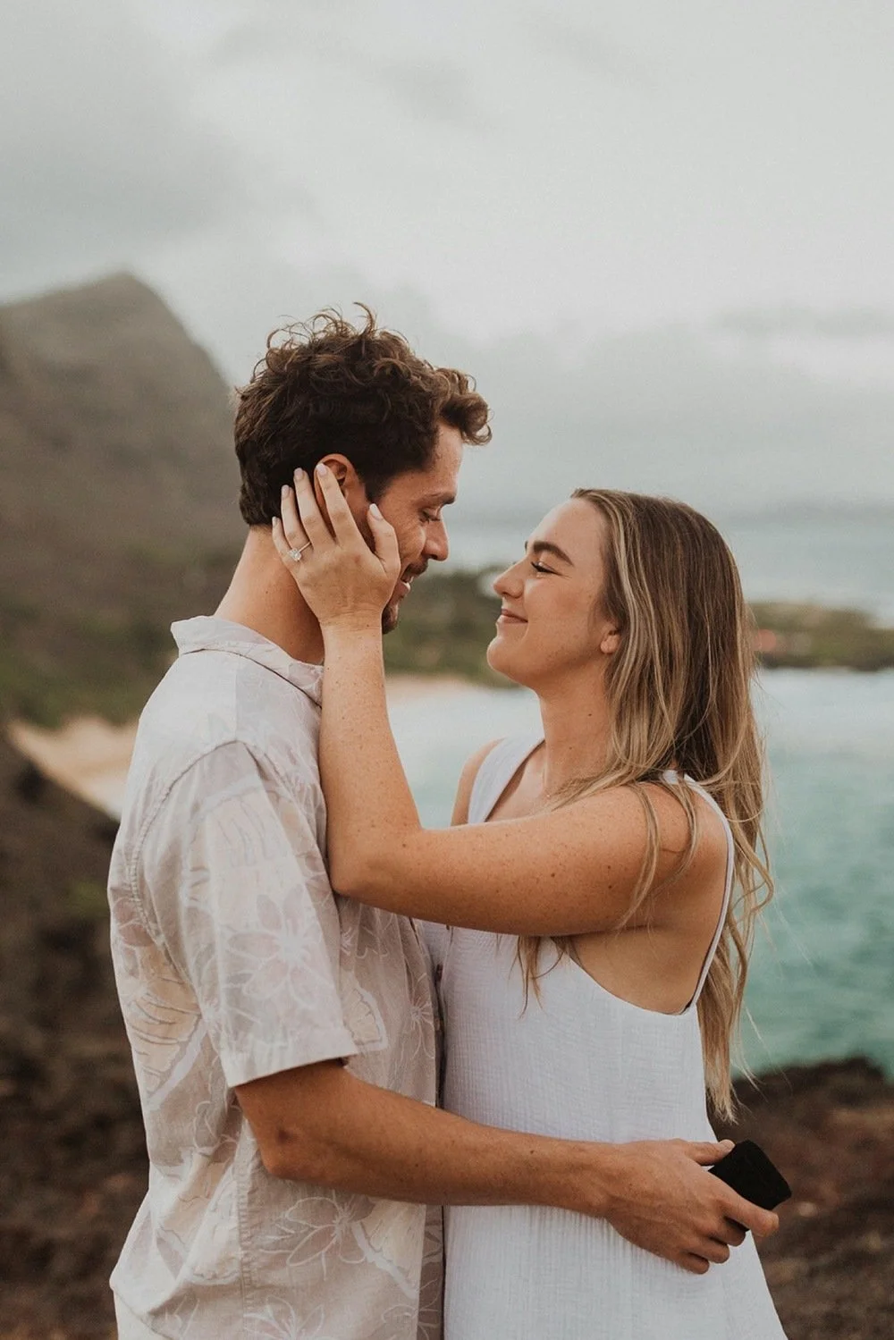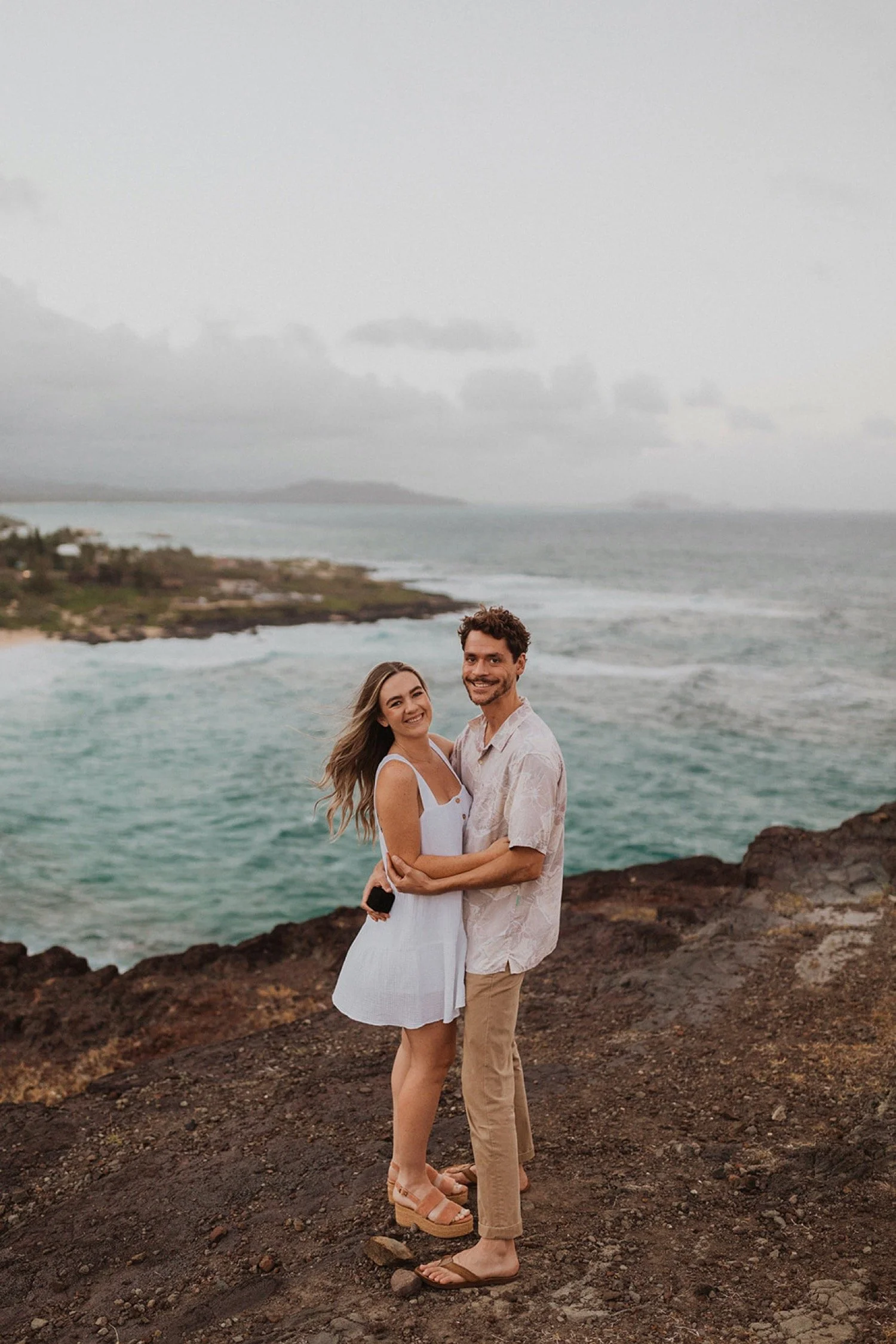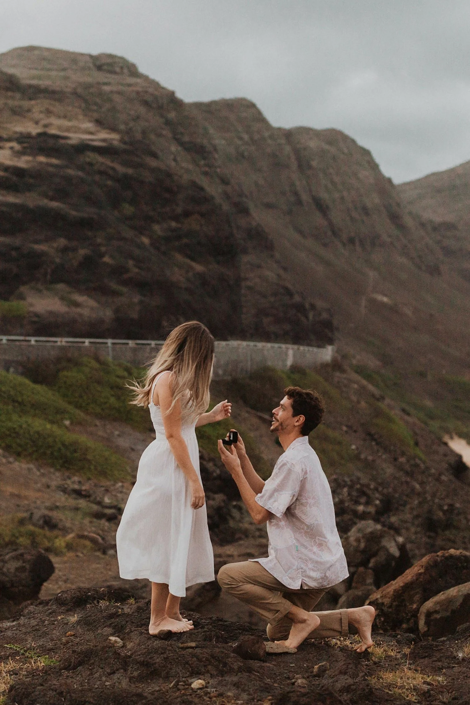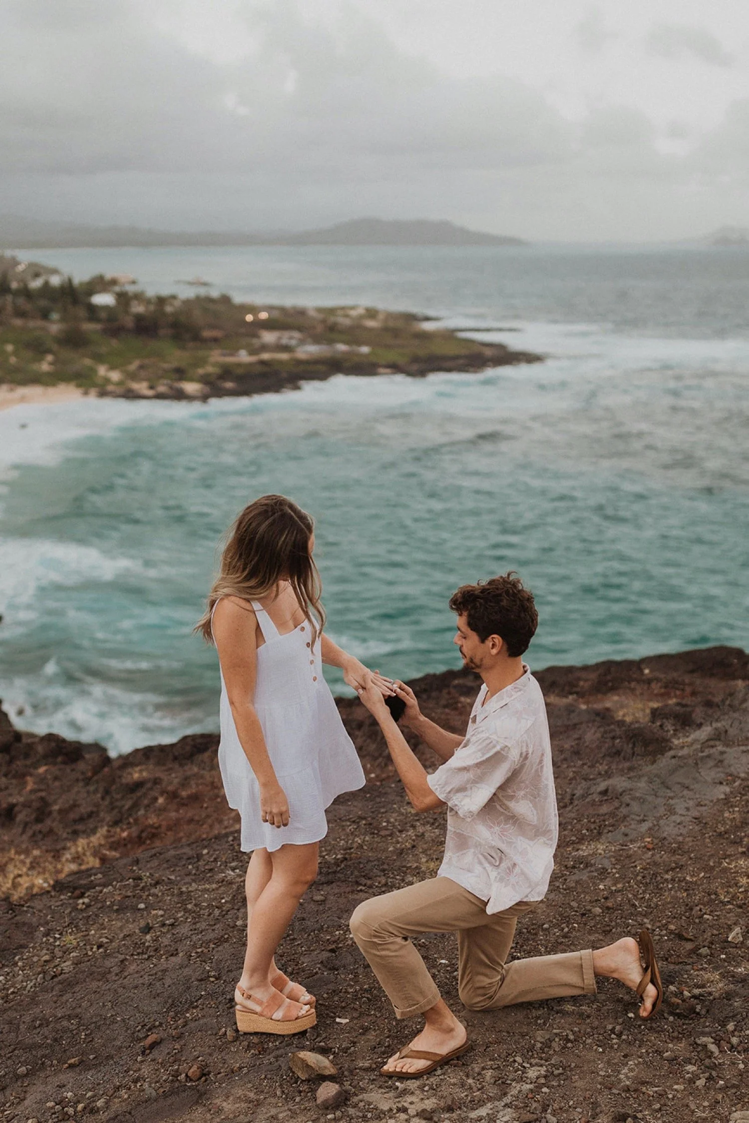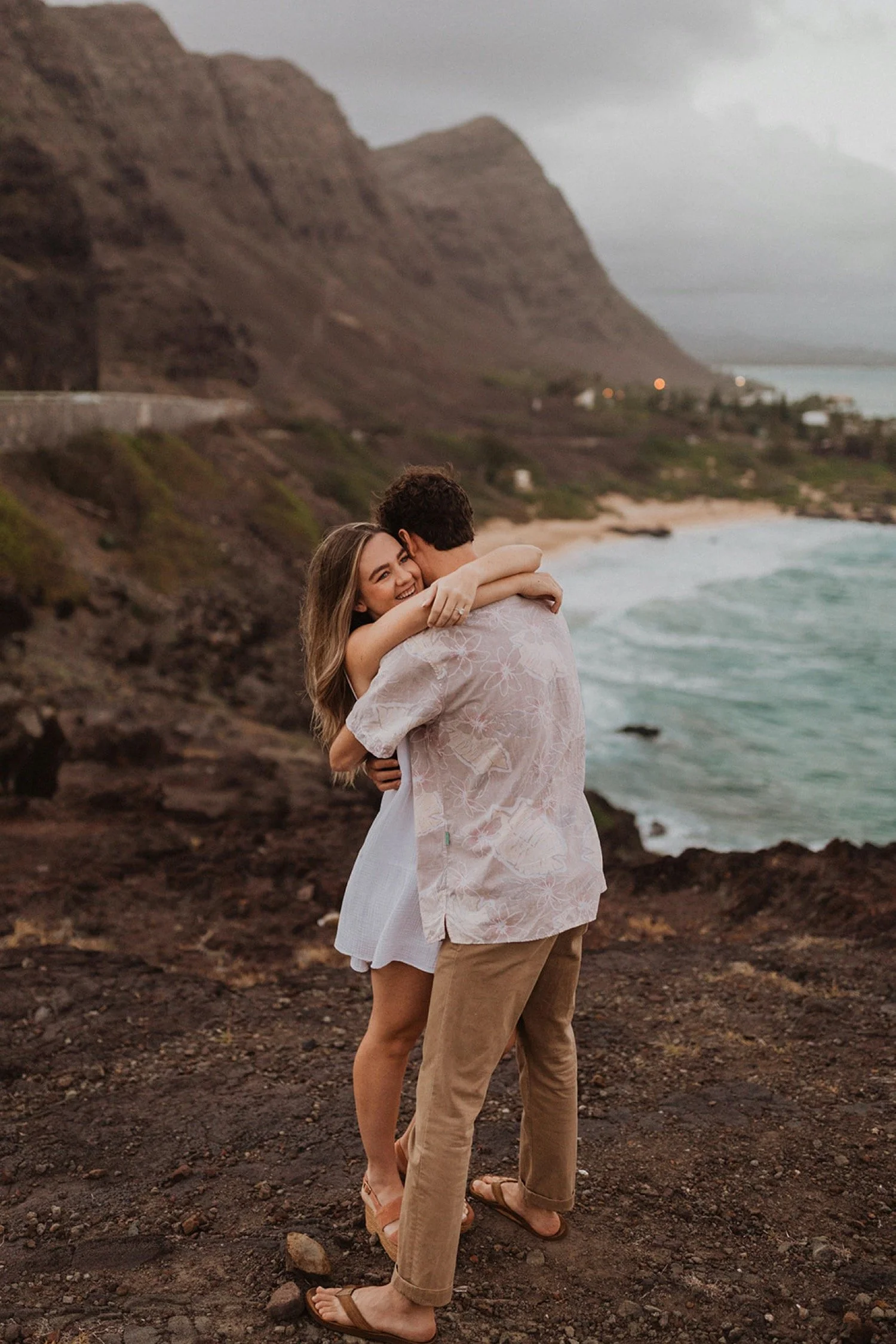 We decided to do the surprise proposal at one of my favorite lookout spots in Hawaii. It is on the East side of Oahu and has the best views of the beautiful blue ocean. This spot also looks out on the city where they live and has a gorgeous view of the island and coastline.