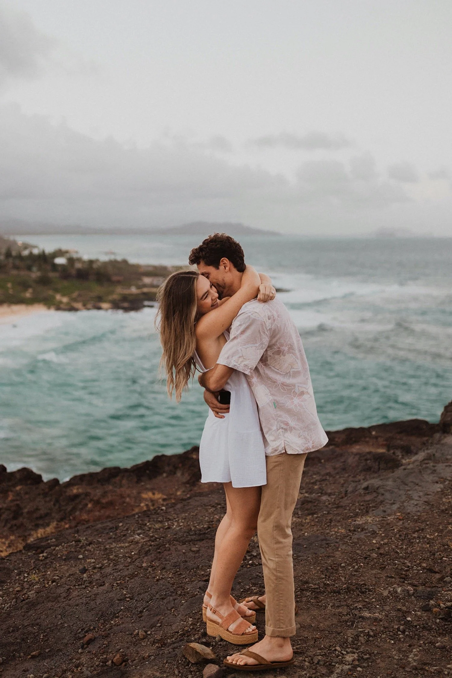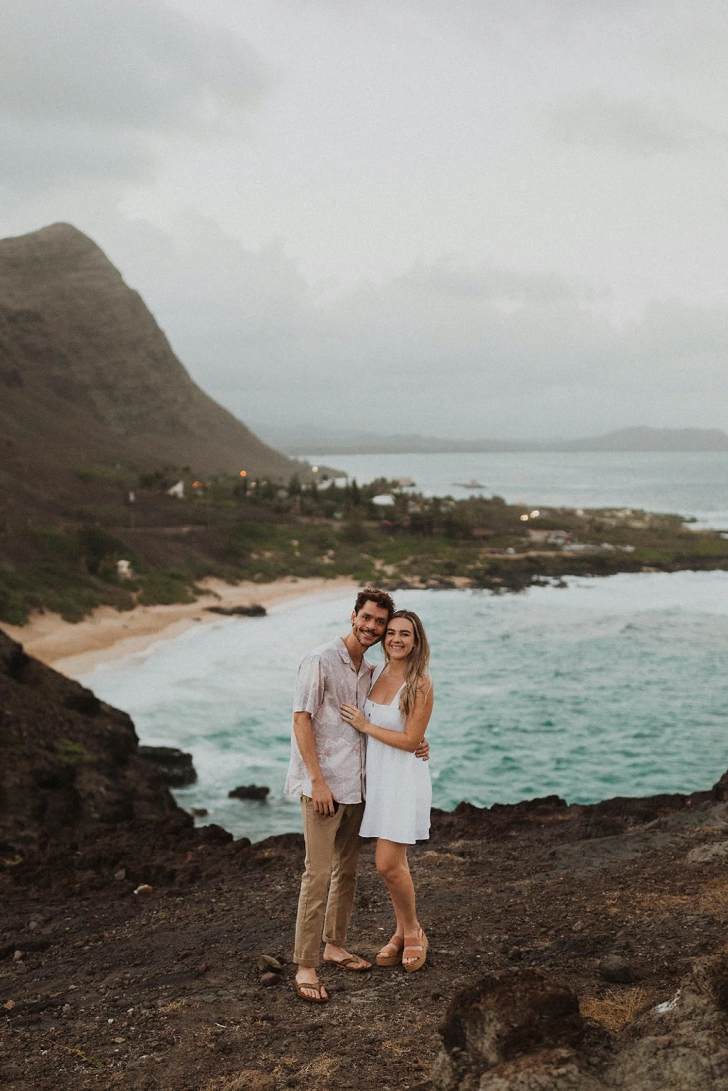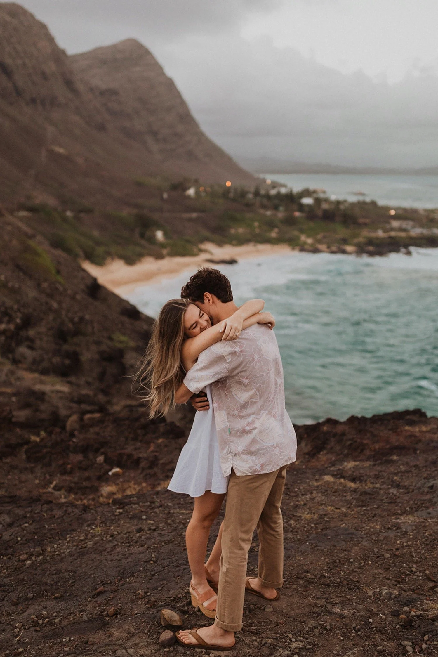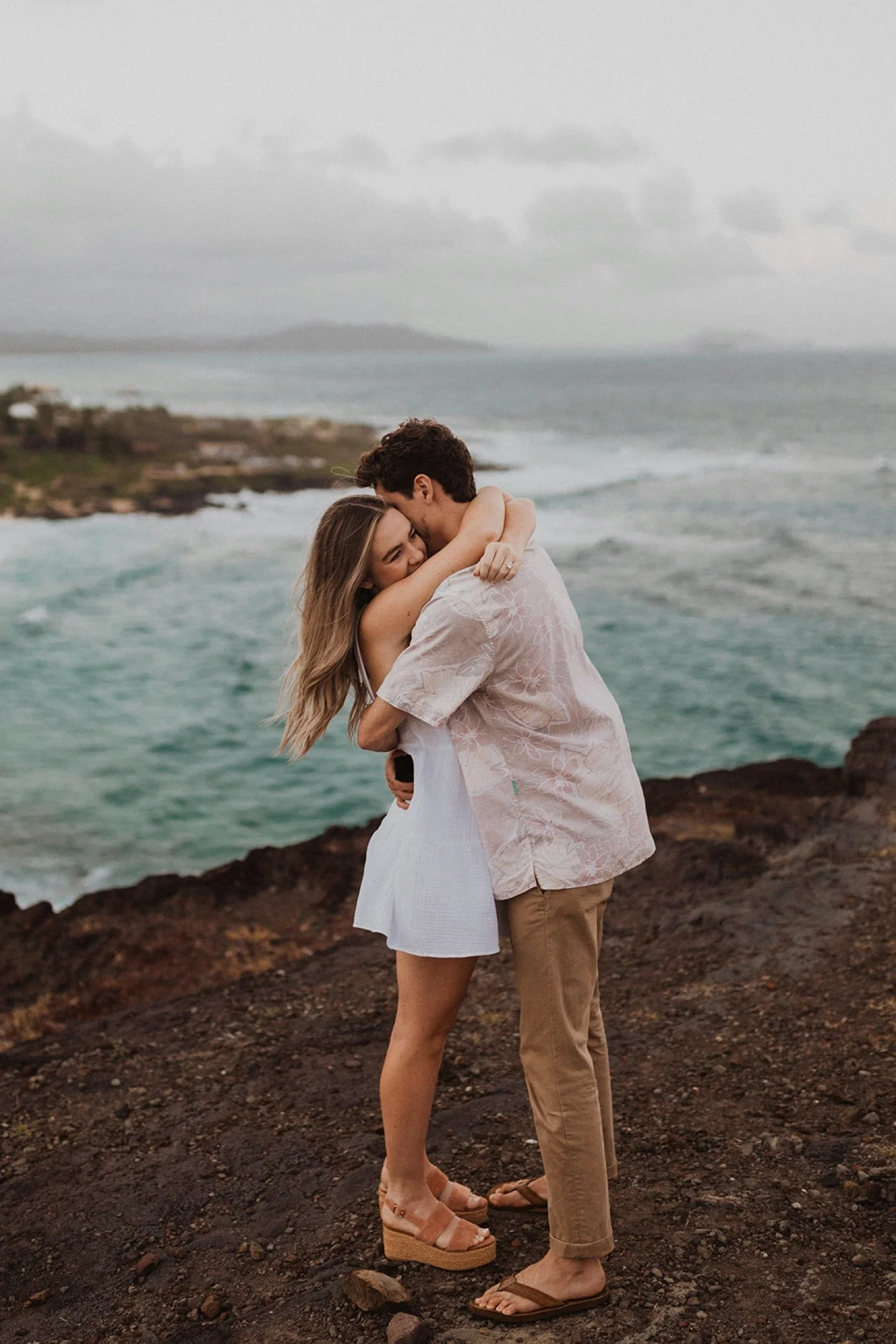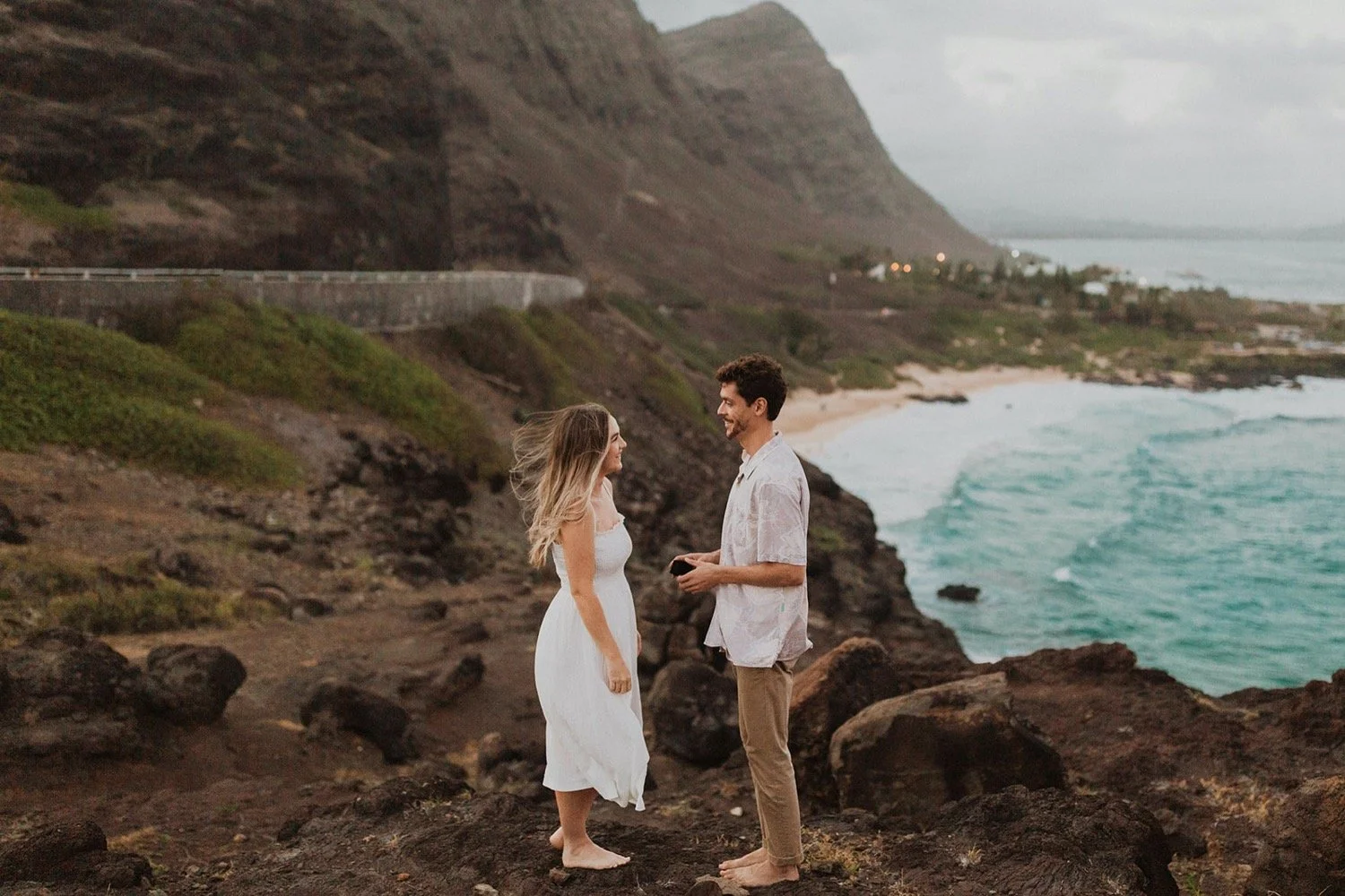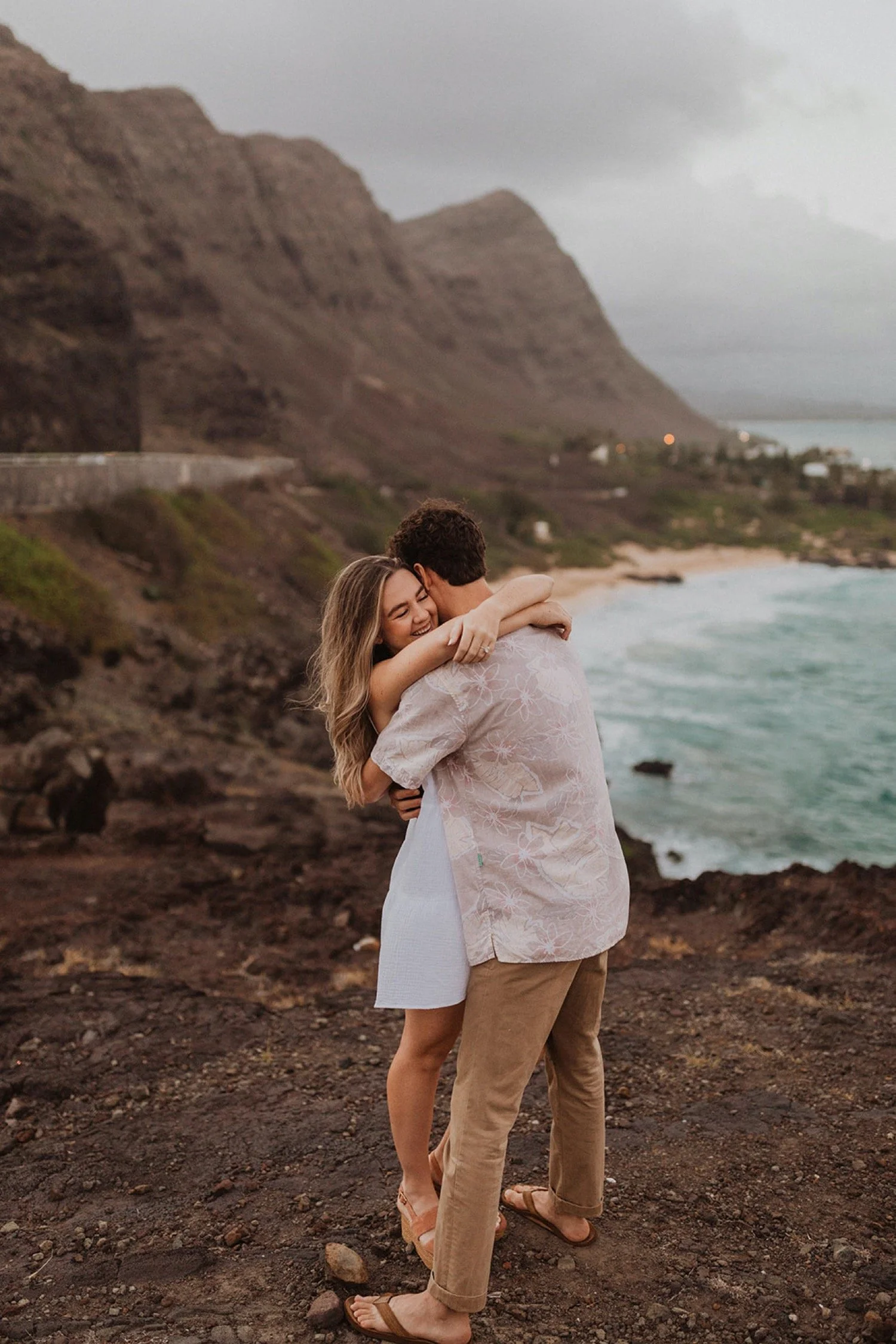 We decided to do the surprise proposal at one of my favorite lookout spots in Hawaii. It is on the East side of Oahu and has the best views of the beautiful blue ocean. This spot also looks out on the city where they live and has a gorgeous view of the island and coastline.