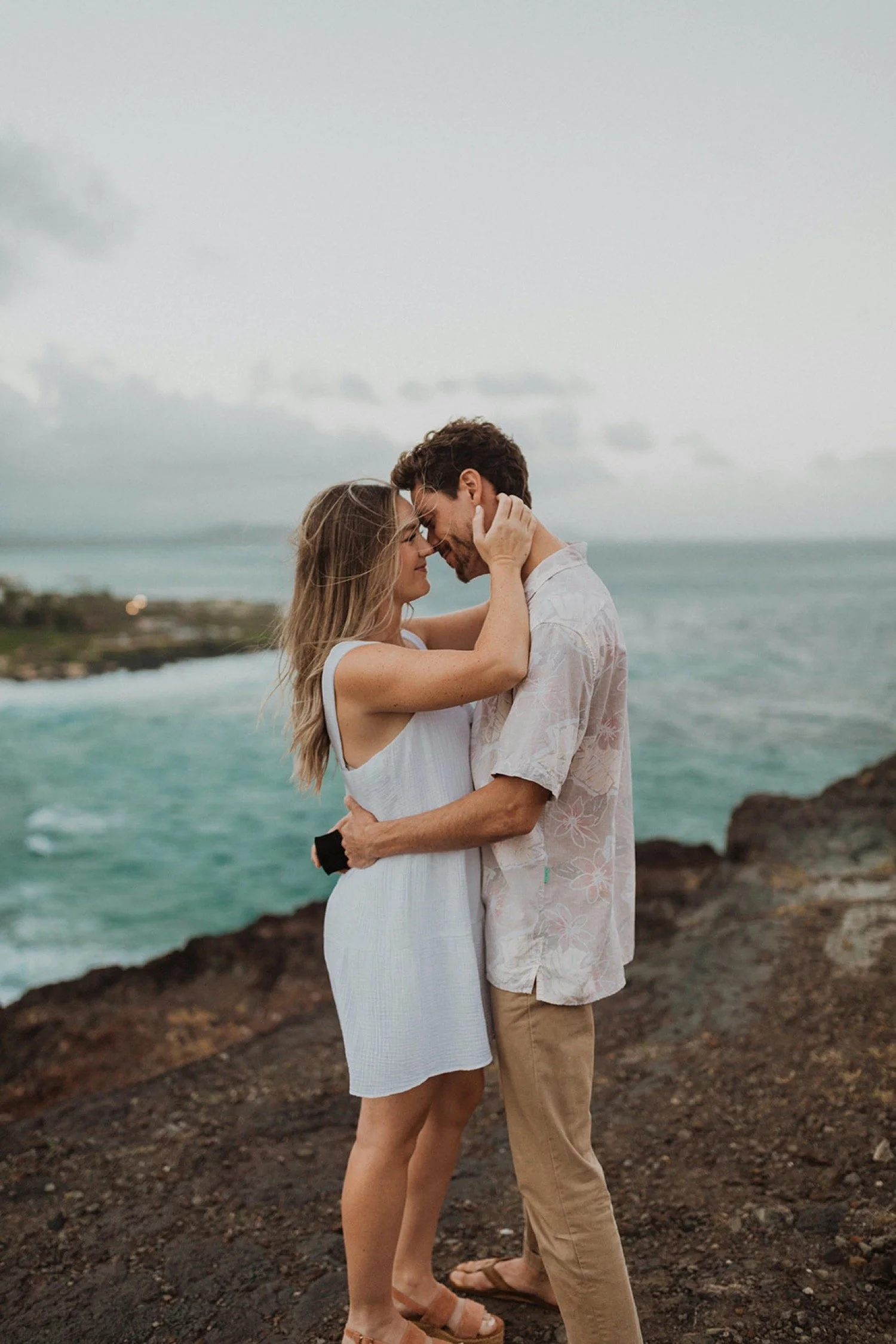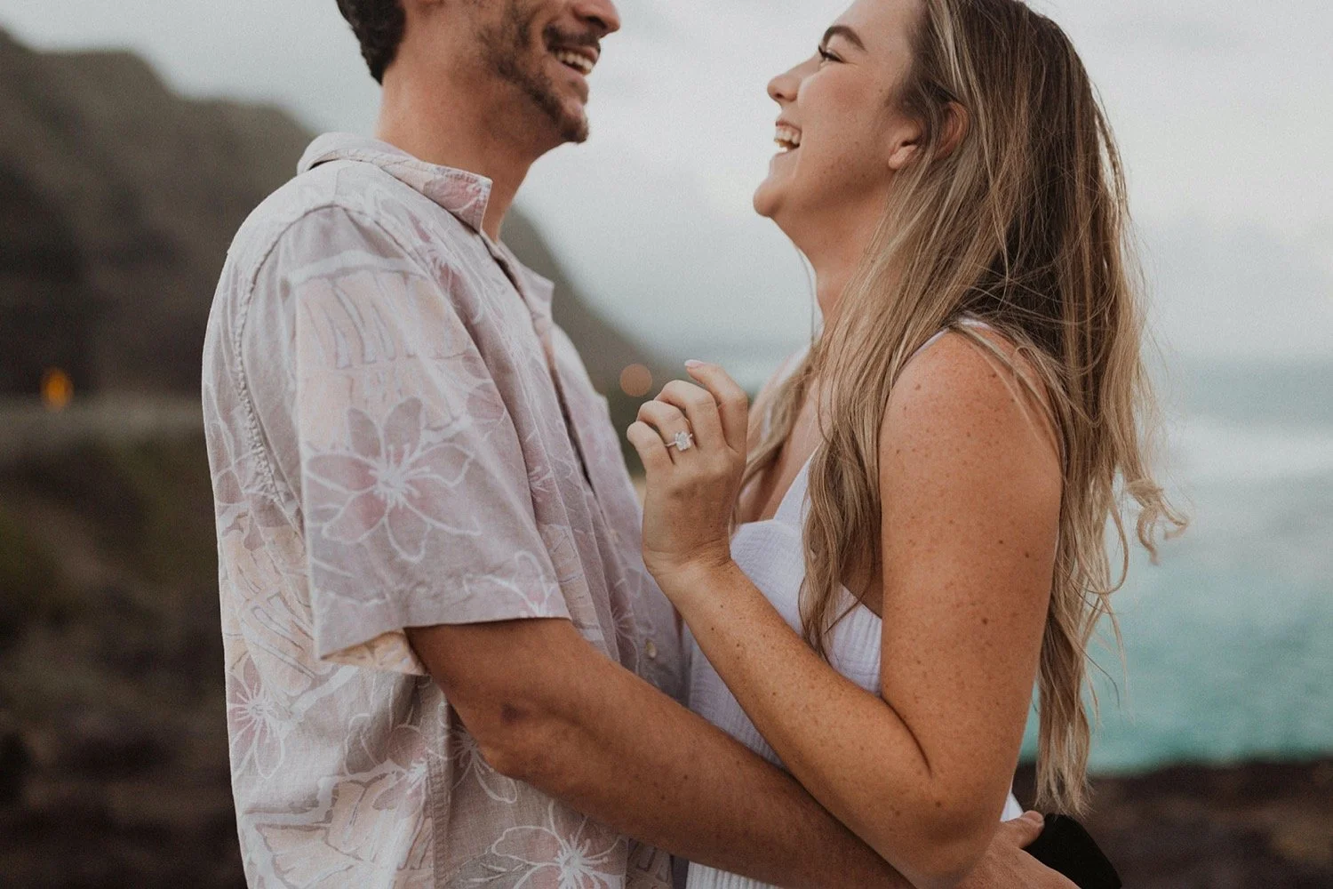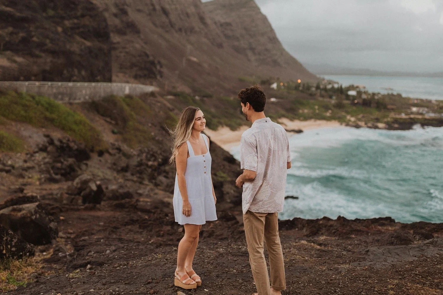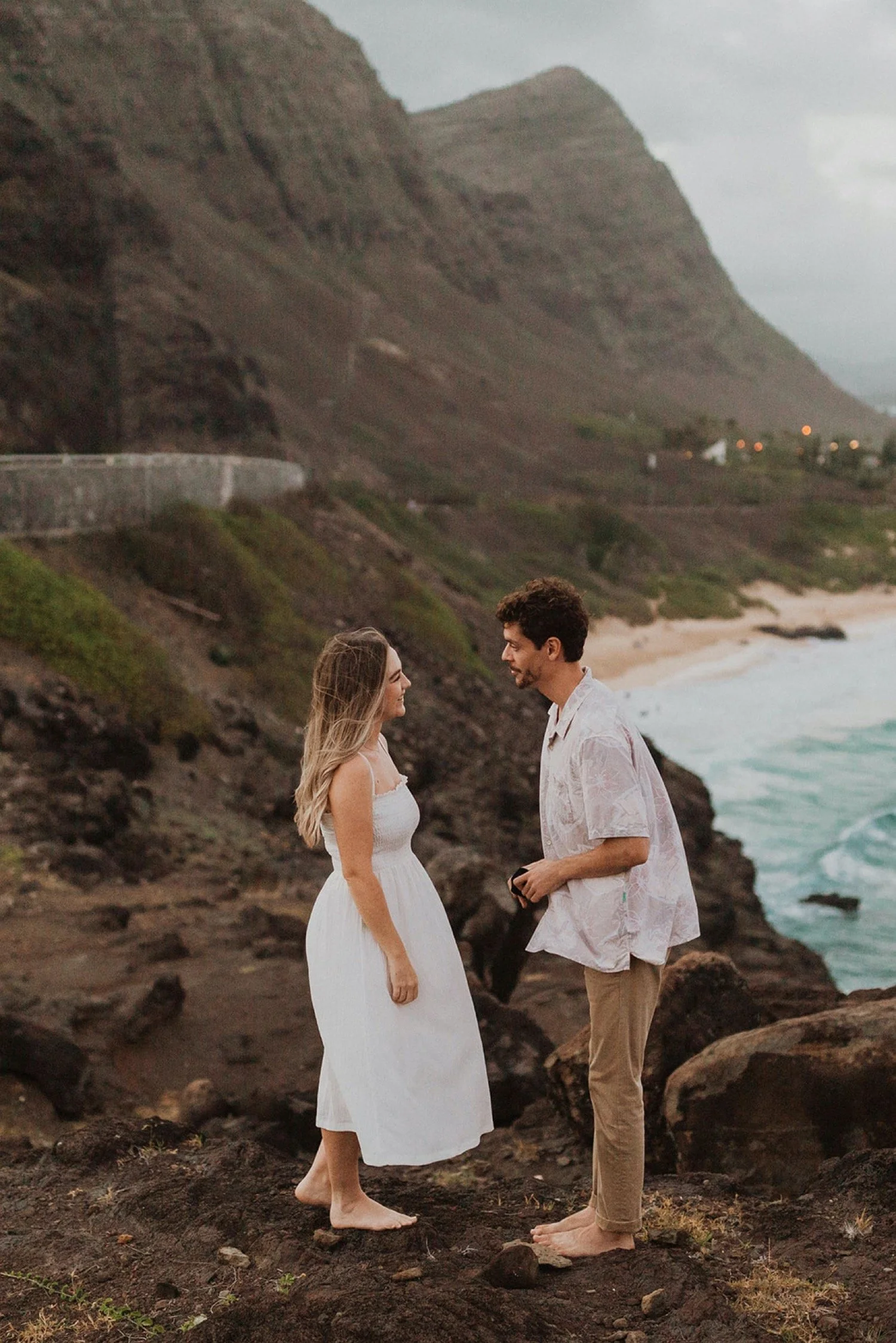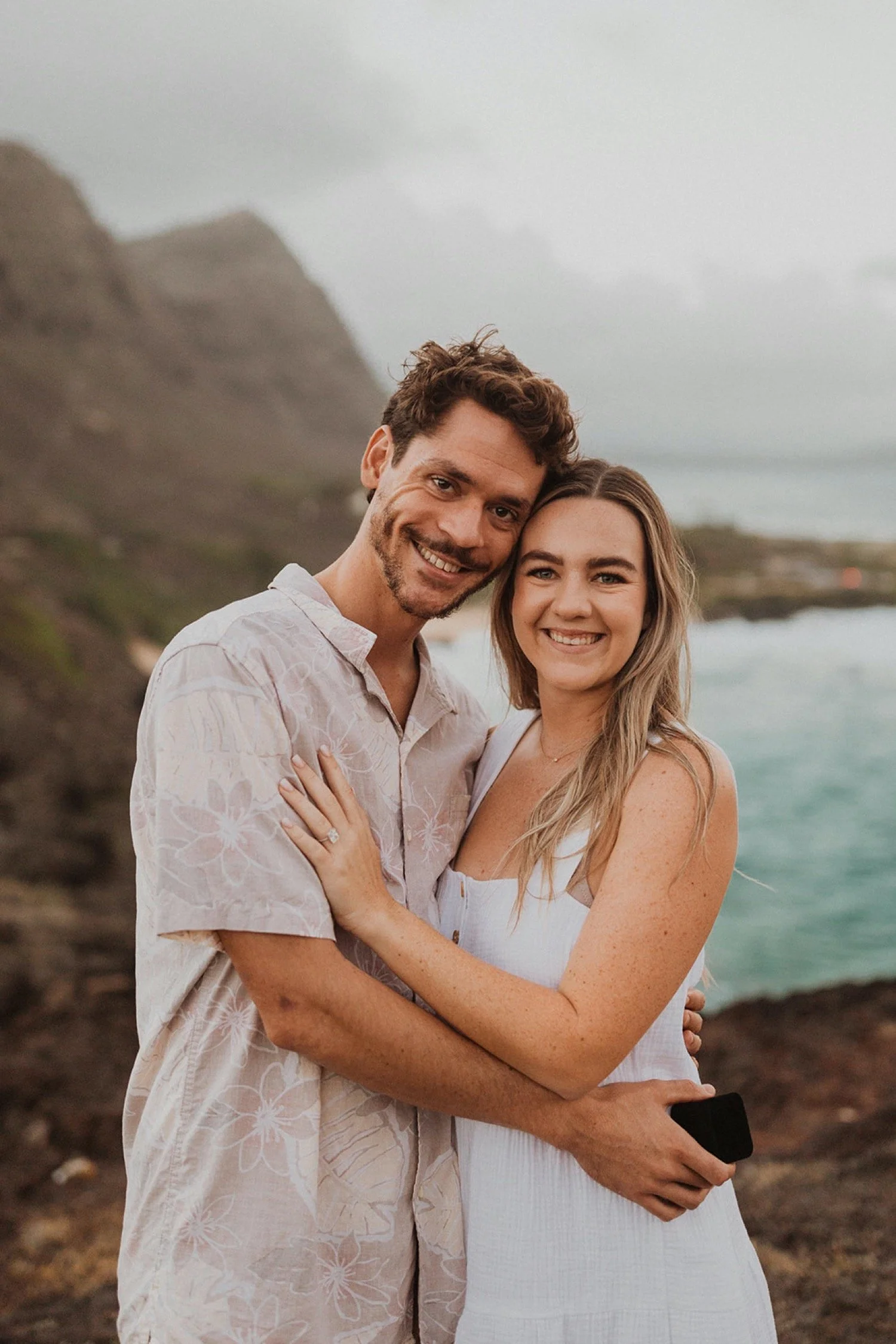 We decided to do the surprise proposal at one of my favorite lookout spots in Hawaii. It is on the East side of Oahu and has the best views of the beautiful blue ocean. This spot also looks out on the city where they live and has a gorgeous view of the island and coastline.