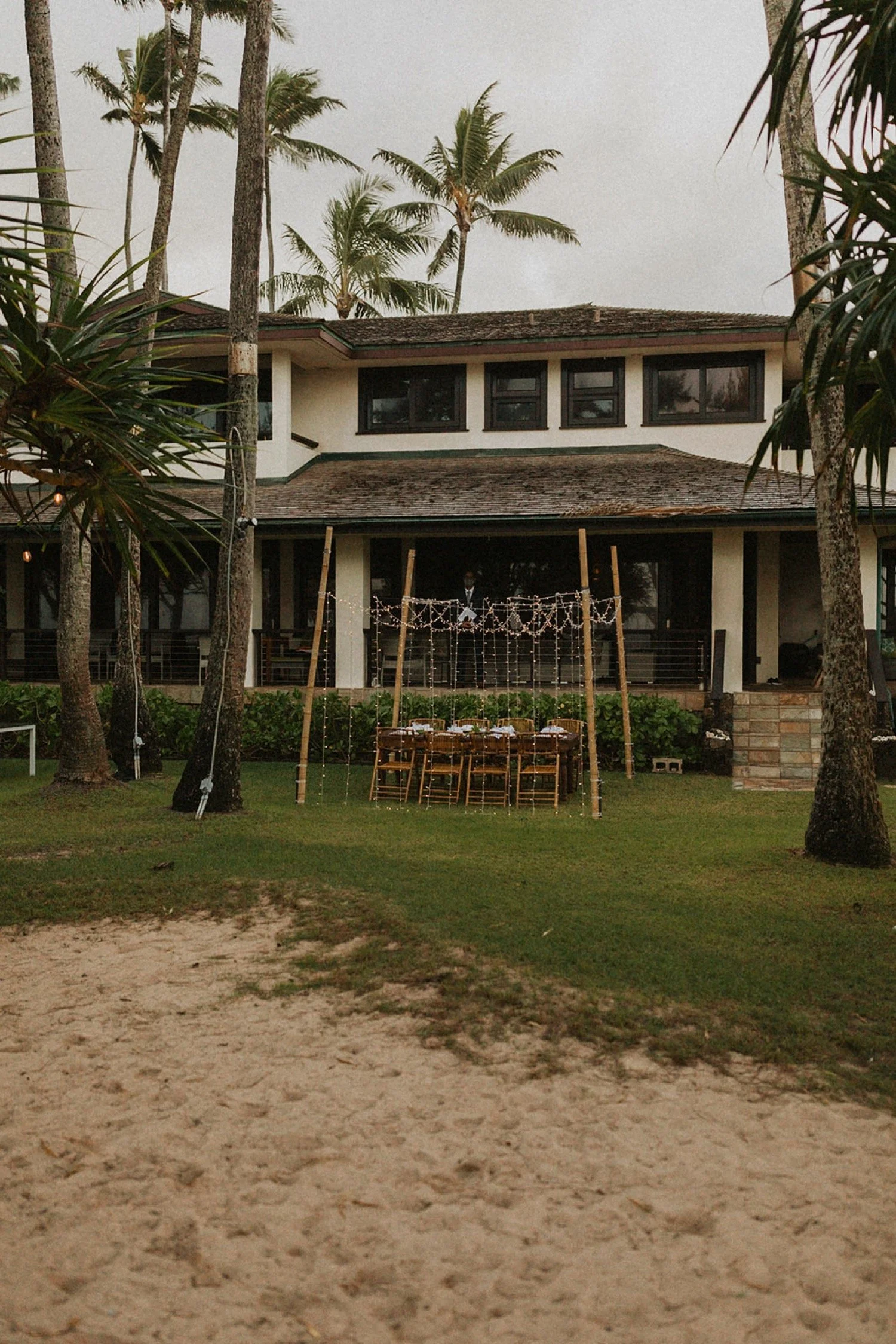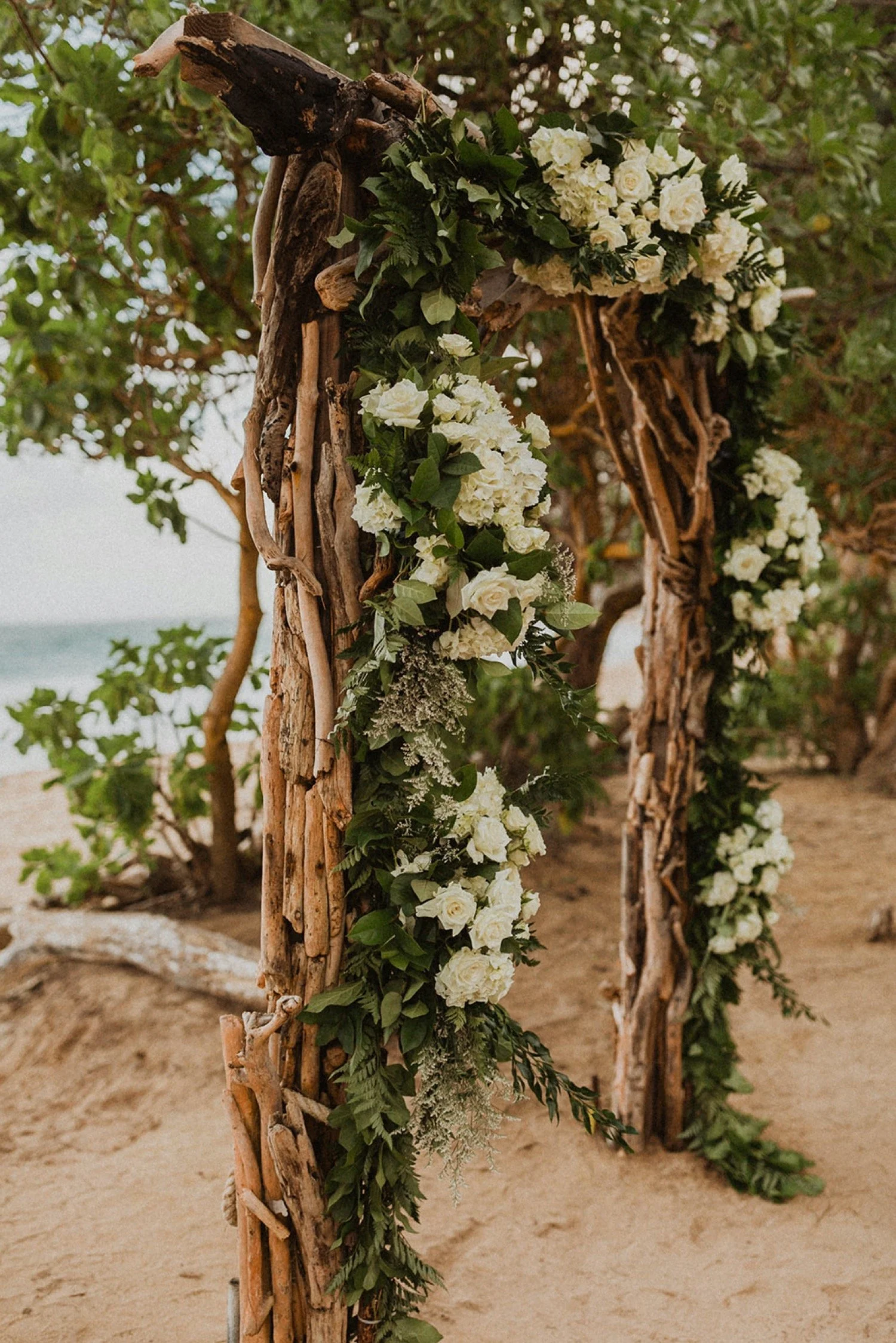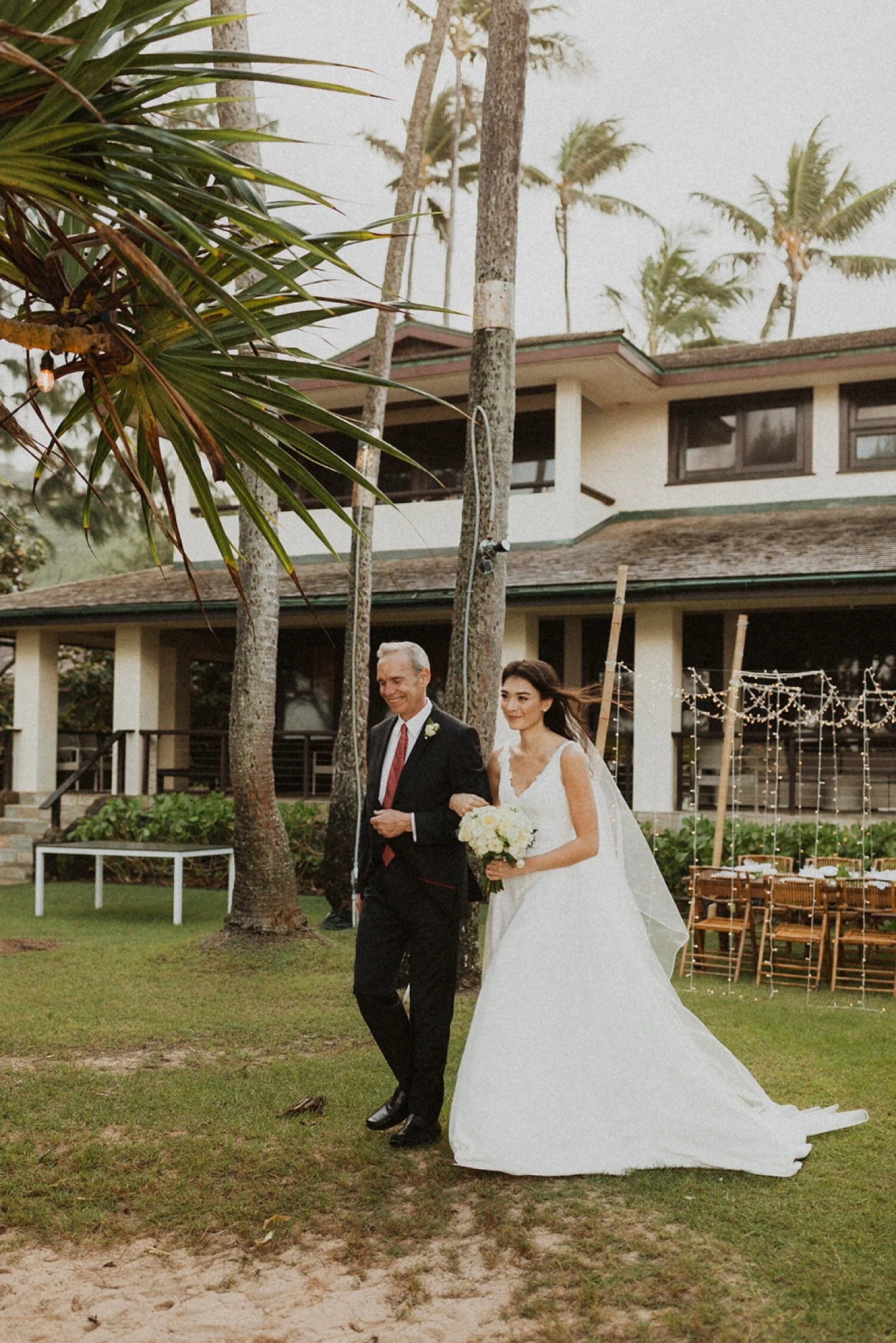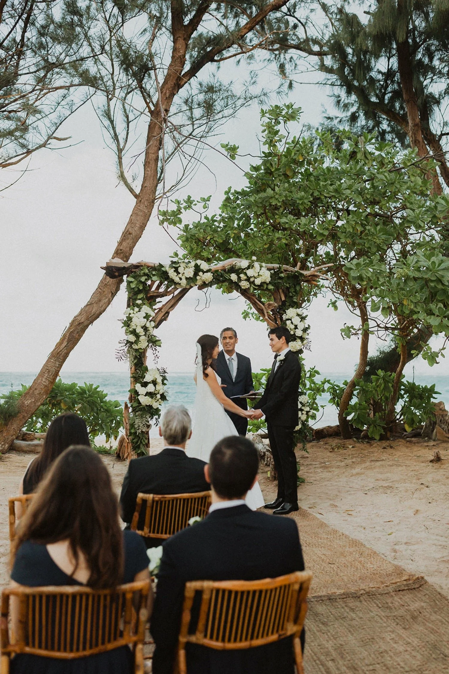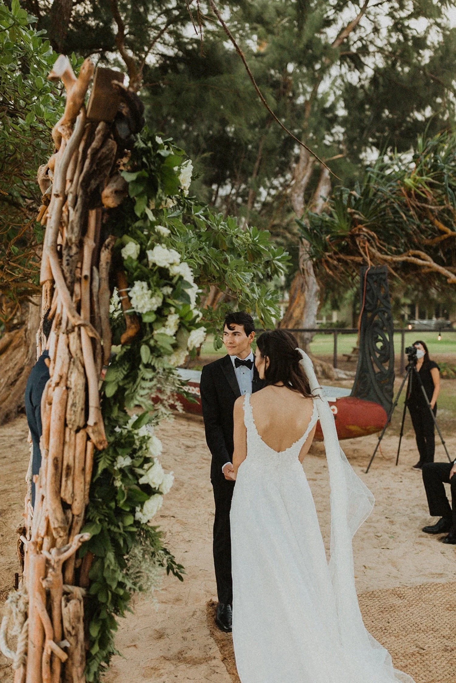 The ceremony was set up in the backyard of the private estate. It was right on the water’s edge and had the prettiest views of the blue Hawaiian ocean. They said the sweetest vows in front of a stunning driftwood floral wedding arch and things got emotional. Kyle and Jessica have been together for over 6 years so being able to witness them commit forever together was so special.