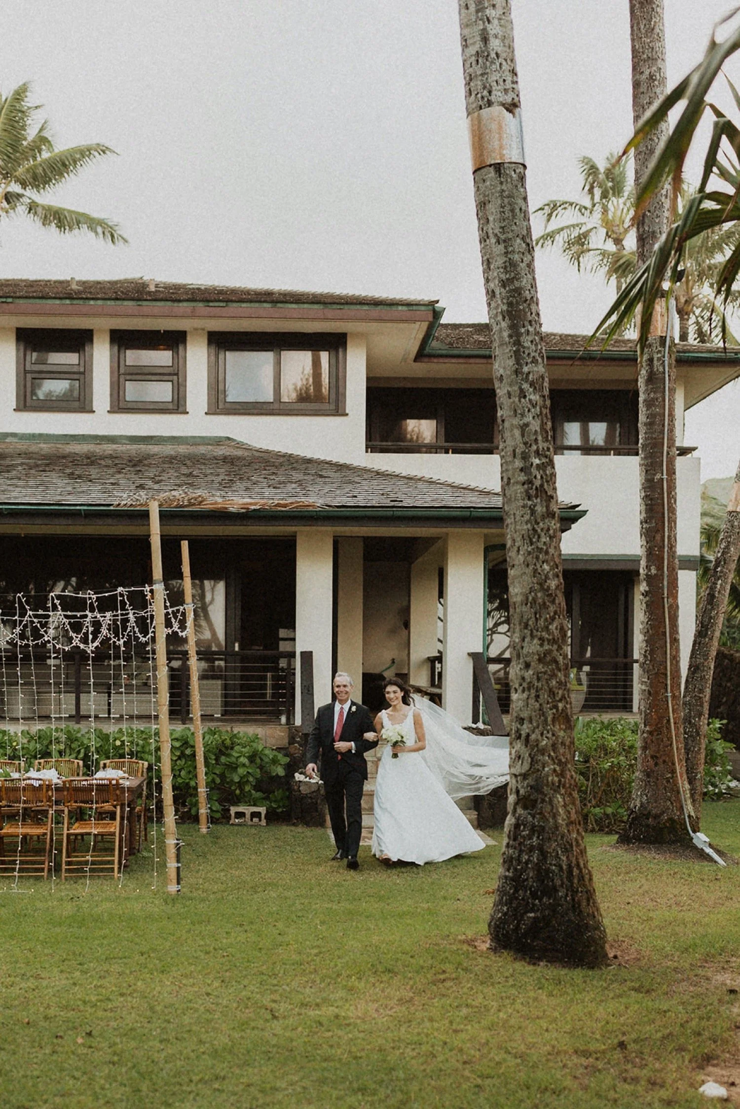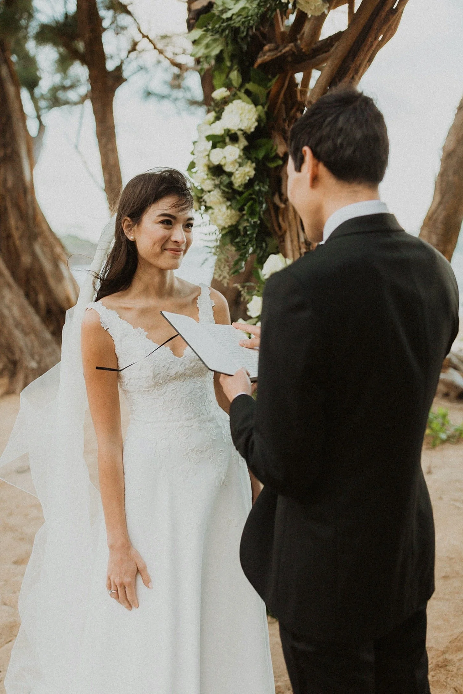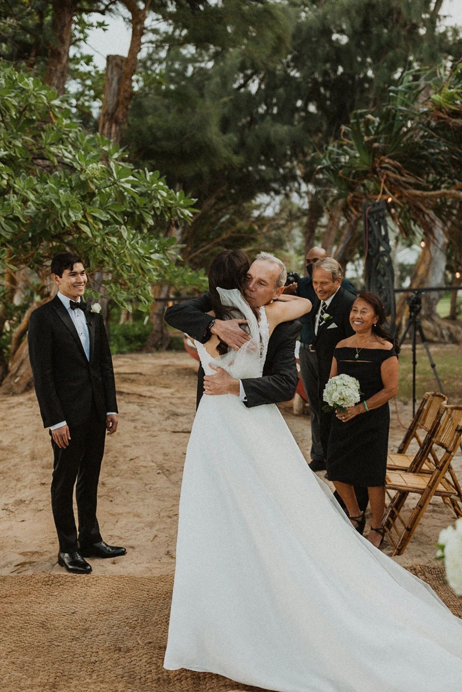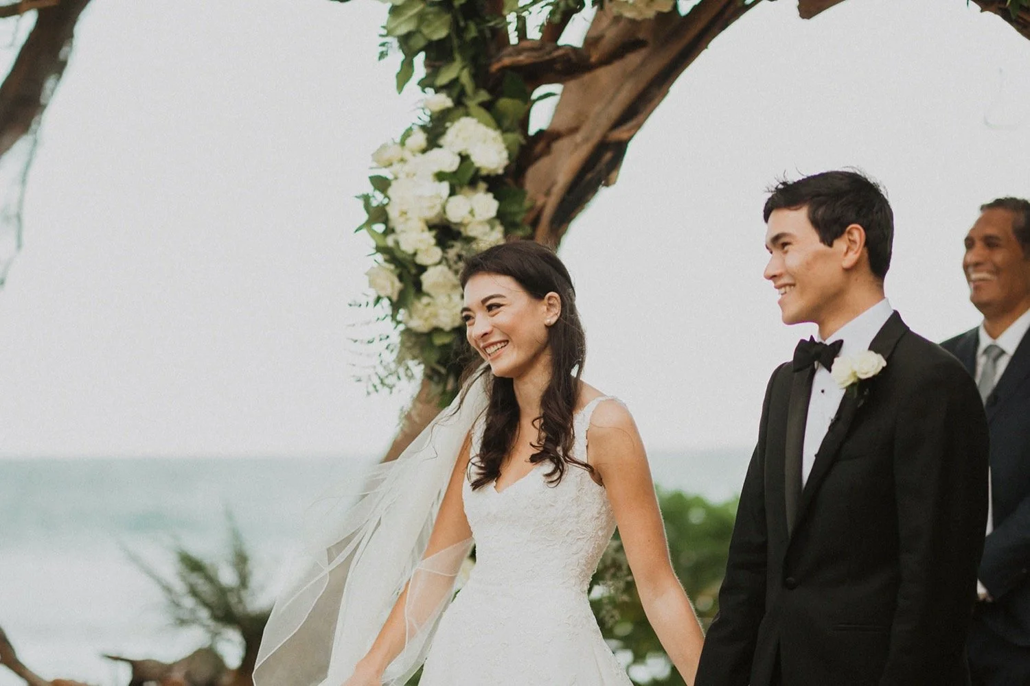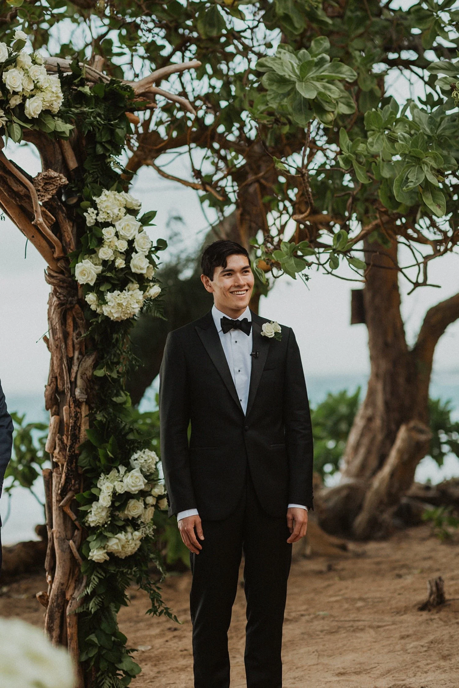 The ceremony was set up in the backyard of the private estate. It was right on the water’s edge and had the prettiest views of the blue Hawaiian ocean. They said the sweetest vows in front of a stunning driftwood floral wedding arch and things got emotional. Kyle and Jessica have been together for over 6 years so being able to witness them commit forever together was so special.