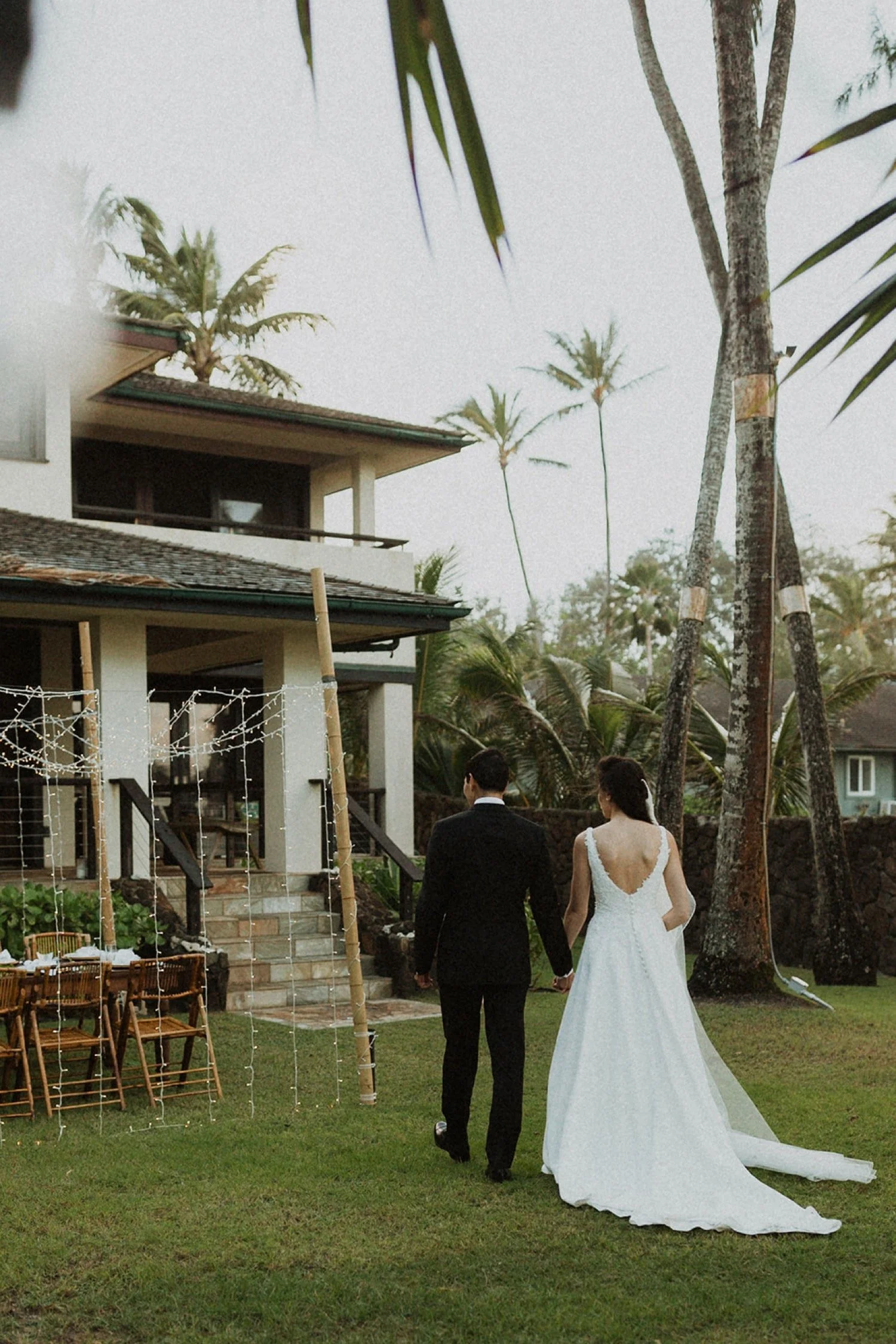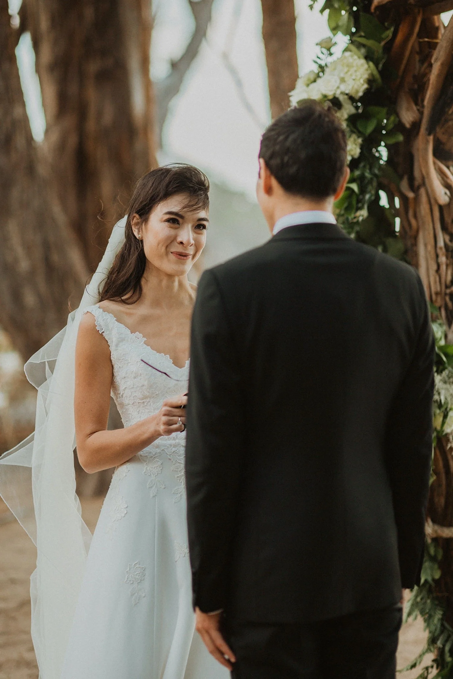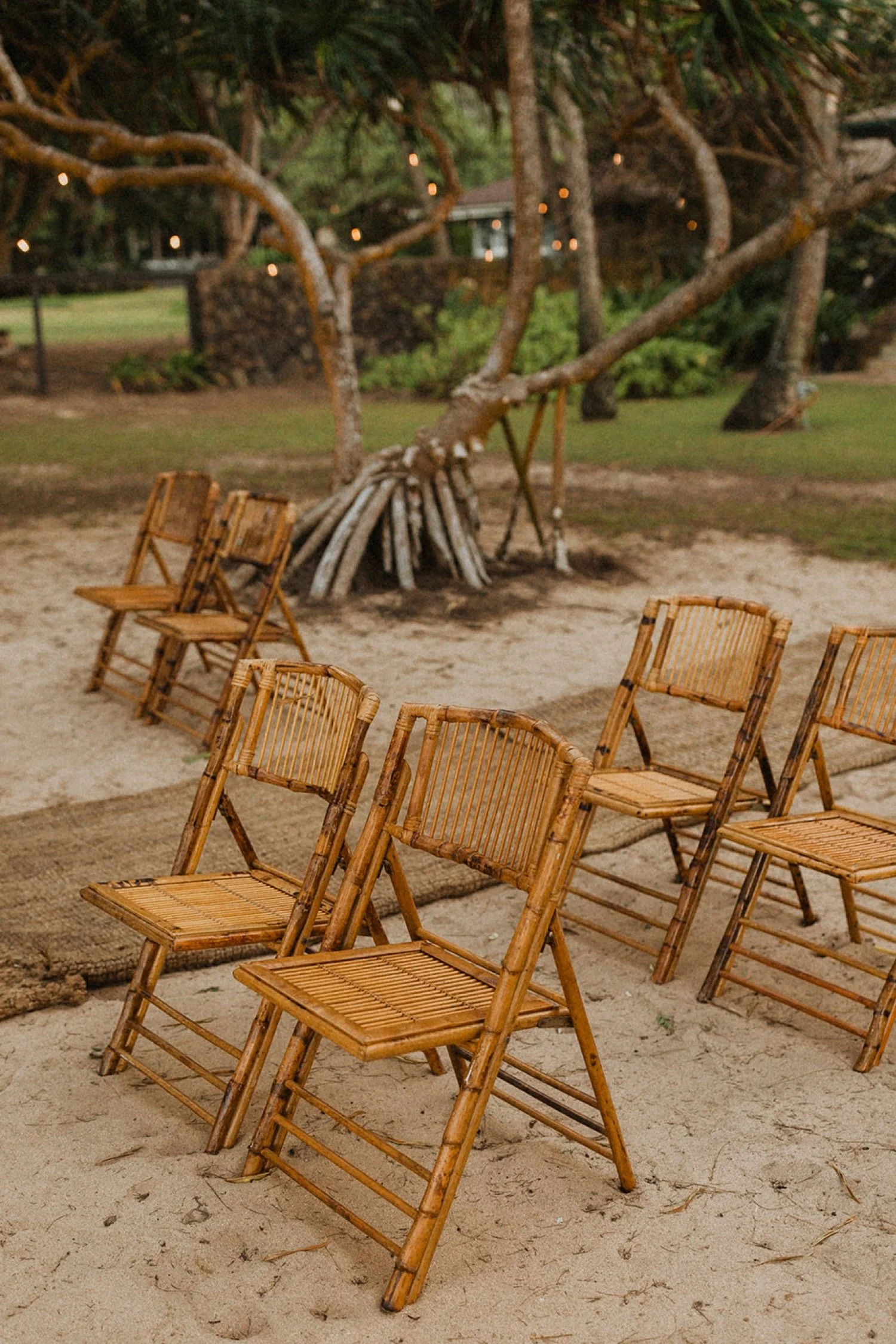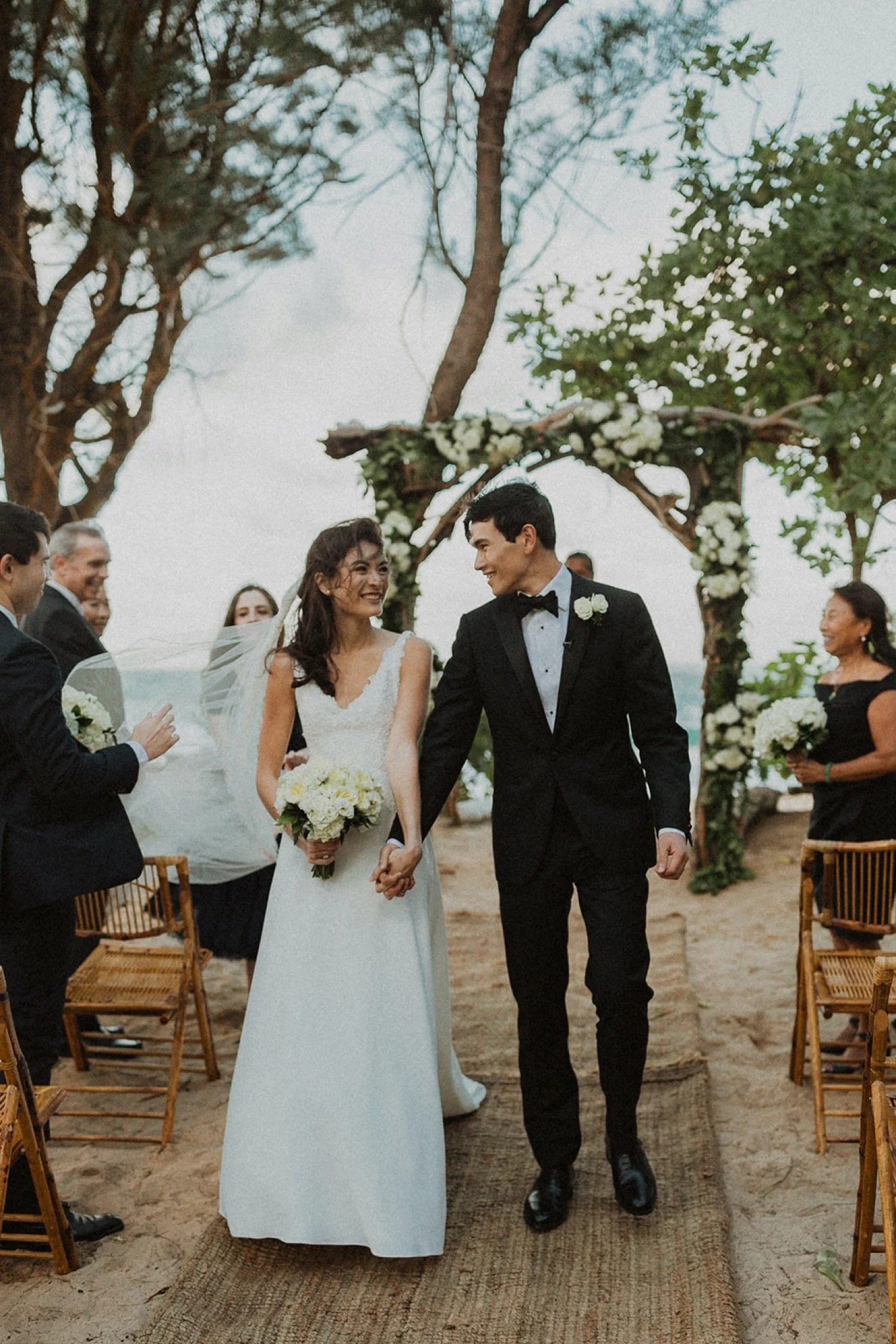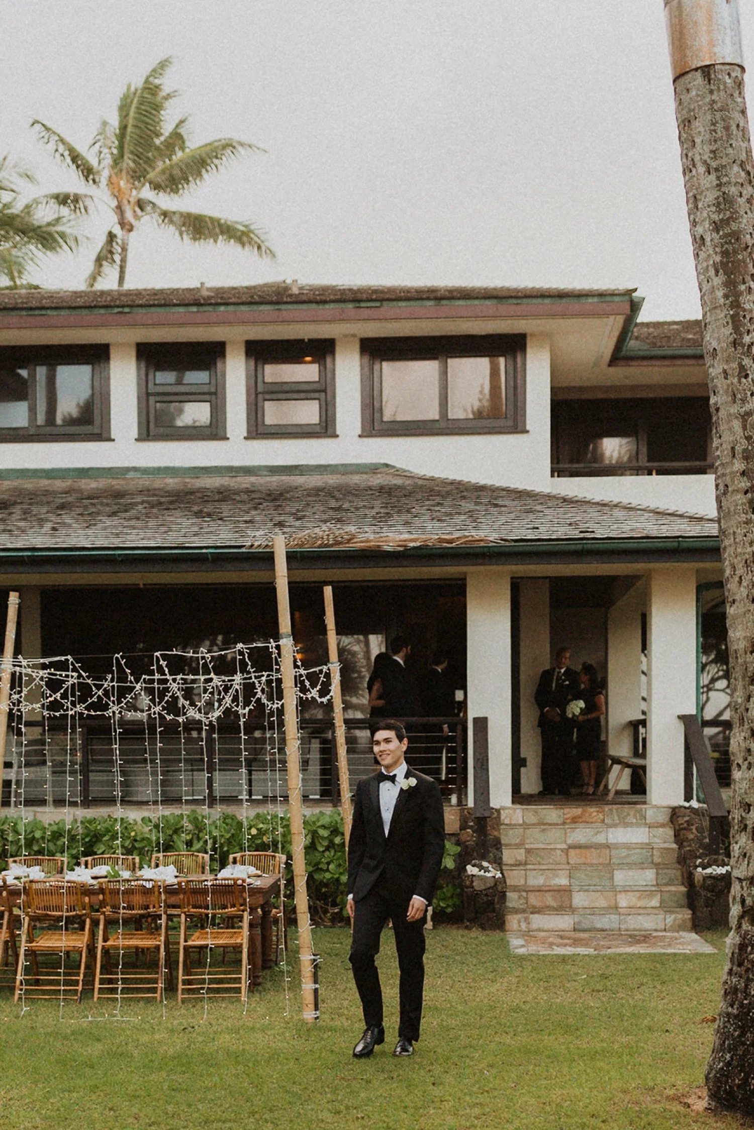 The ceremony was set up in the backyard of the private estate. It was right on the water’s edge and had the prettiest views of the blue Hawaiian ocean. They said the sweetest vows in front of a stunning driftwood floral wedding arch and things got emotional. Kyle and Jessica have been together for over 6 years so being able to witness them commit forever together was so special.