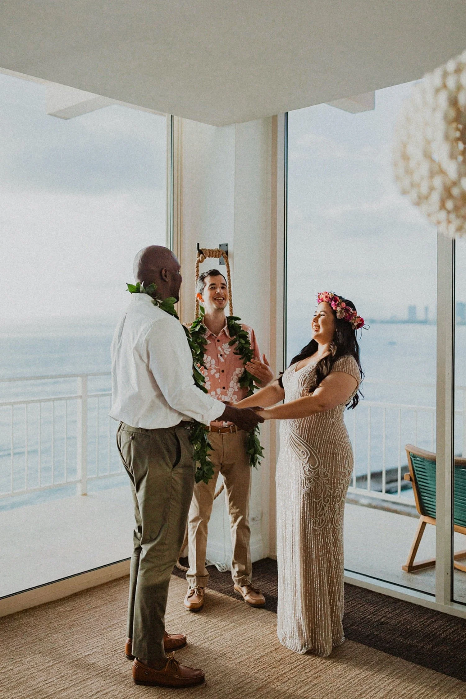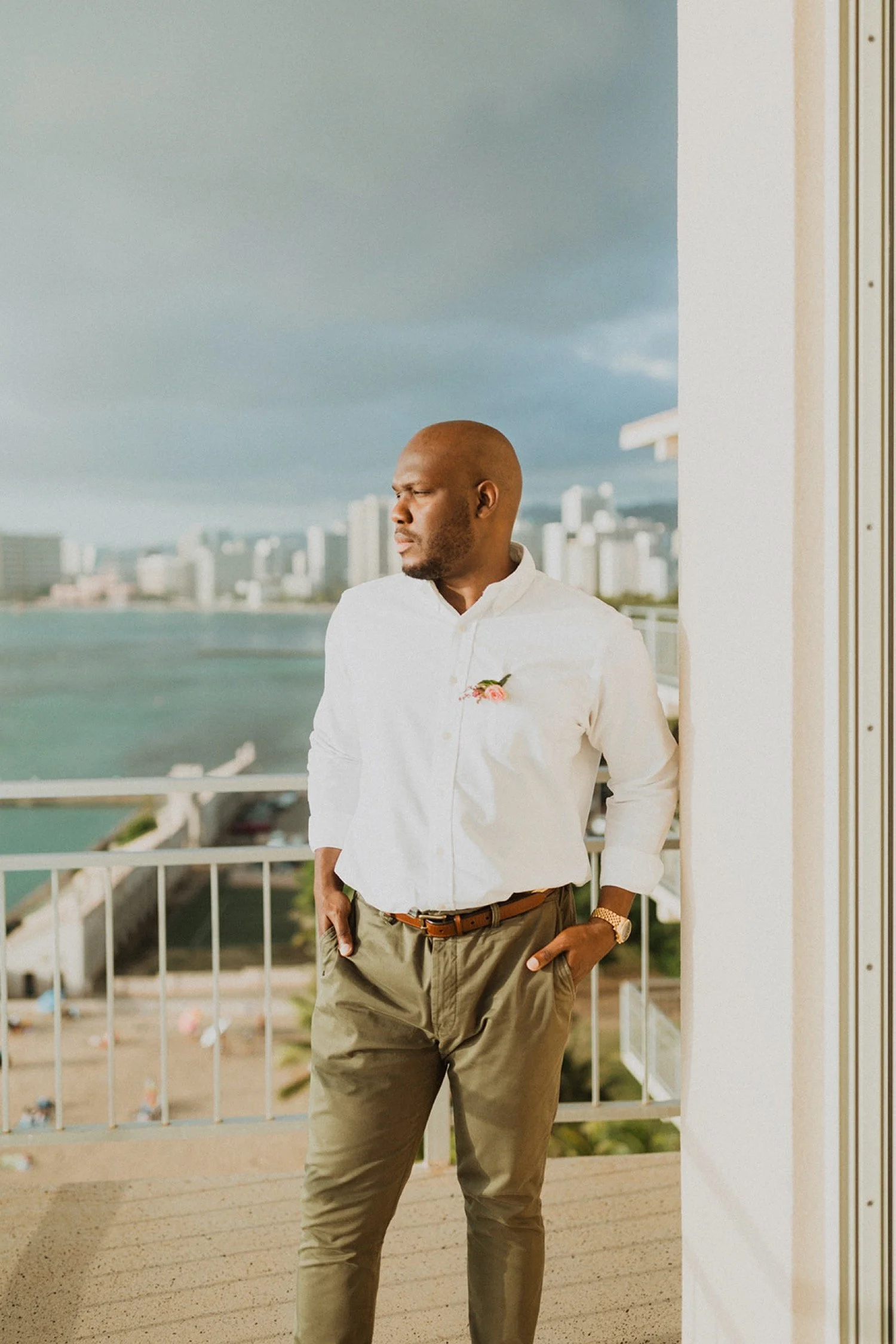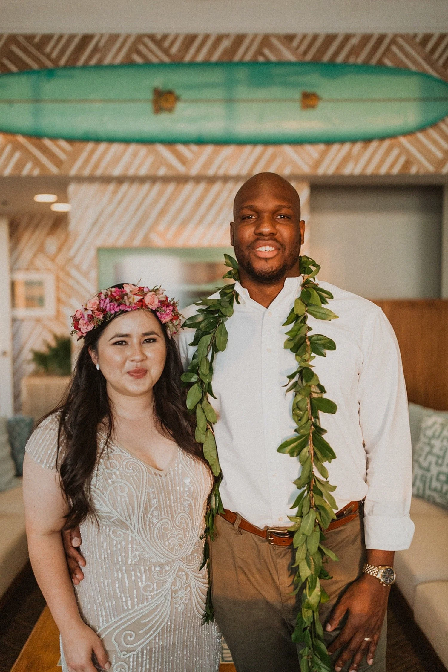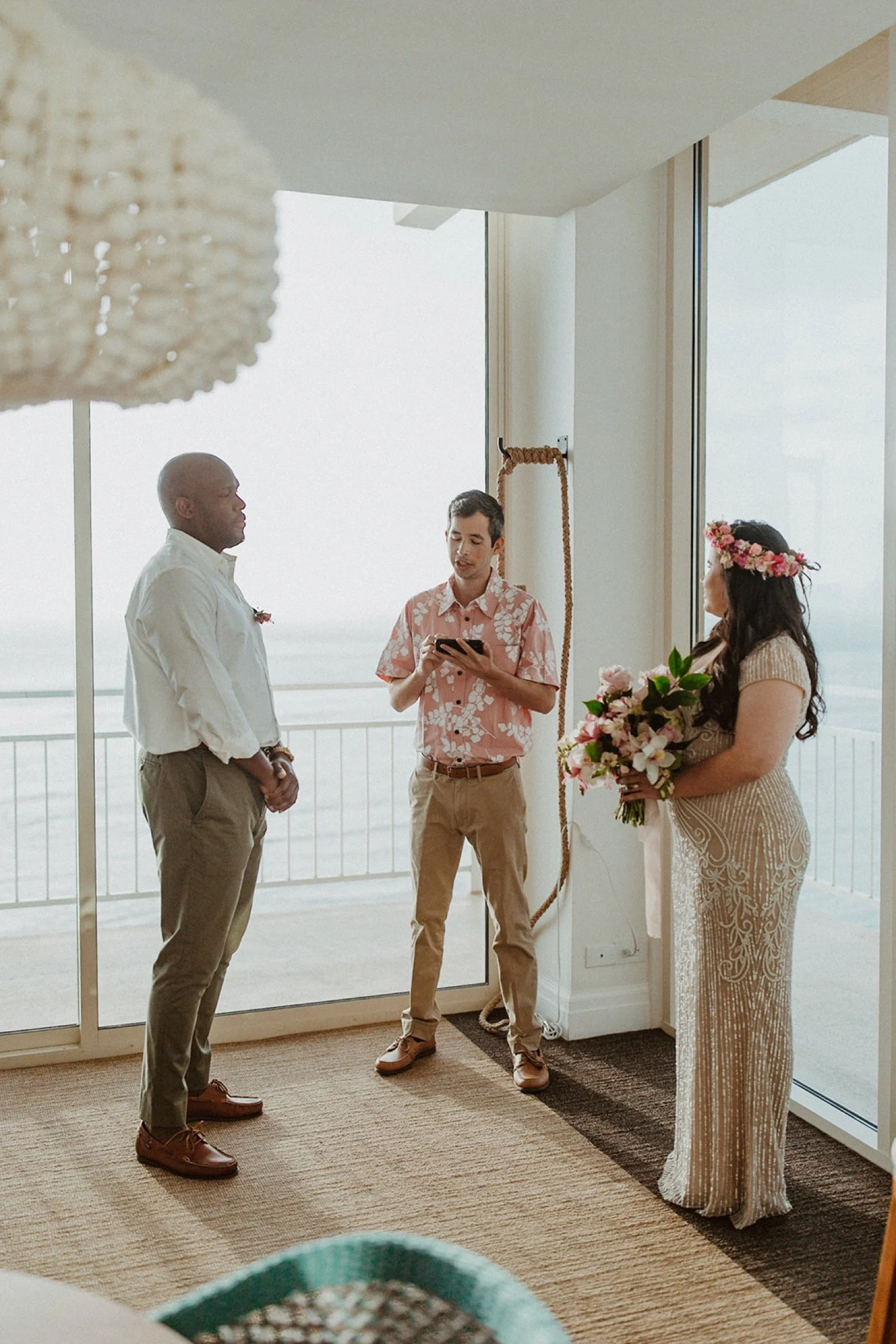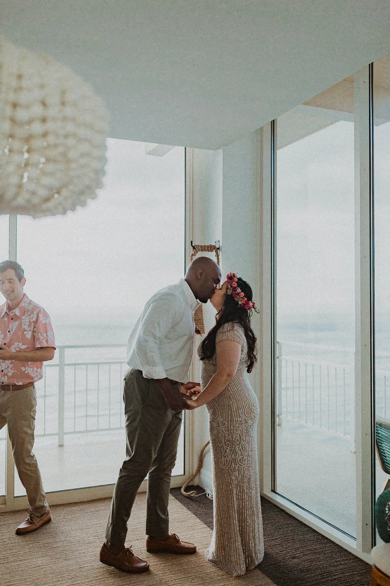 This was my first time ever shooting a hotel room wedding and I loved it so much! Kaimana Beach hotel was the most GORGEOUS place to hold this elopement! This is a brand new renovated hotel on the edge of Waikiki. The suite that Keron and Emily got married in was just stunning. The balcony and large windows had views of Waikiki Beach and the iconic Diamond Head. I was so obsessed with this hotel, and there were so many little spots that were perfect for photos! Every single detail at this hotel room was throughout perfectly and gave that Hawaii tropical vibe. The modern tropical details and decor, the gallery wall, and the palm leaf wallpaper made this hotel so much fun to shoot at and the perfect place for an Intimate Hotel room wedding.