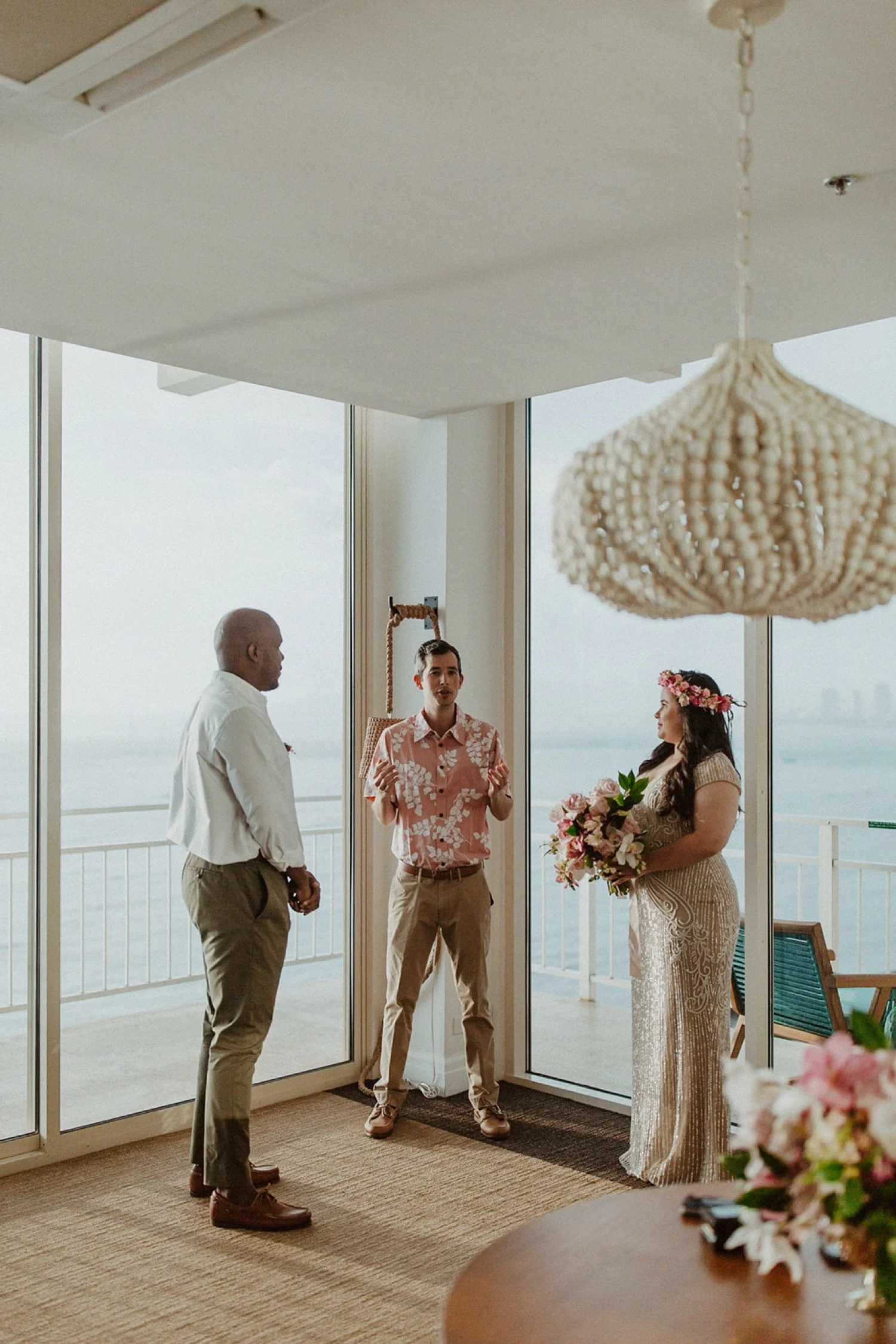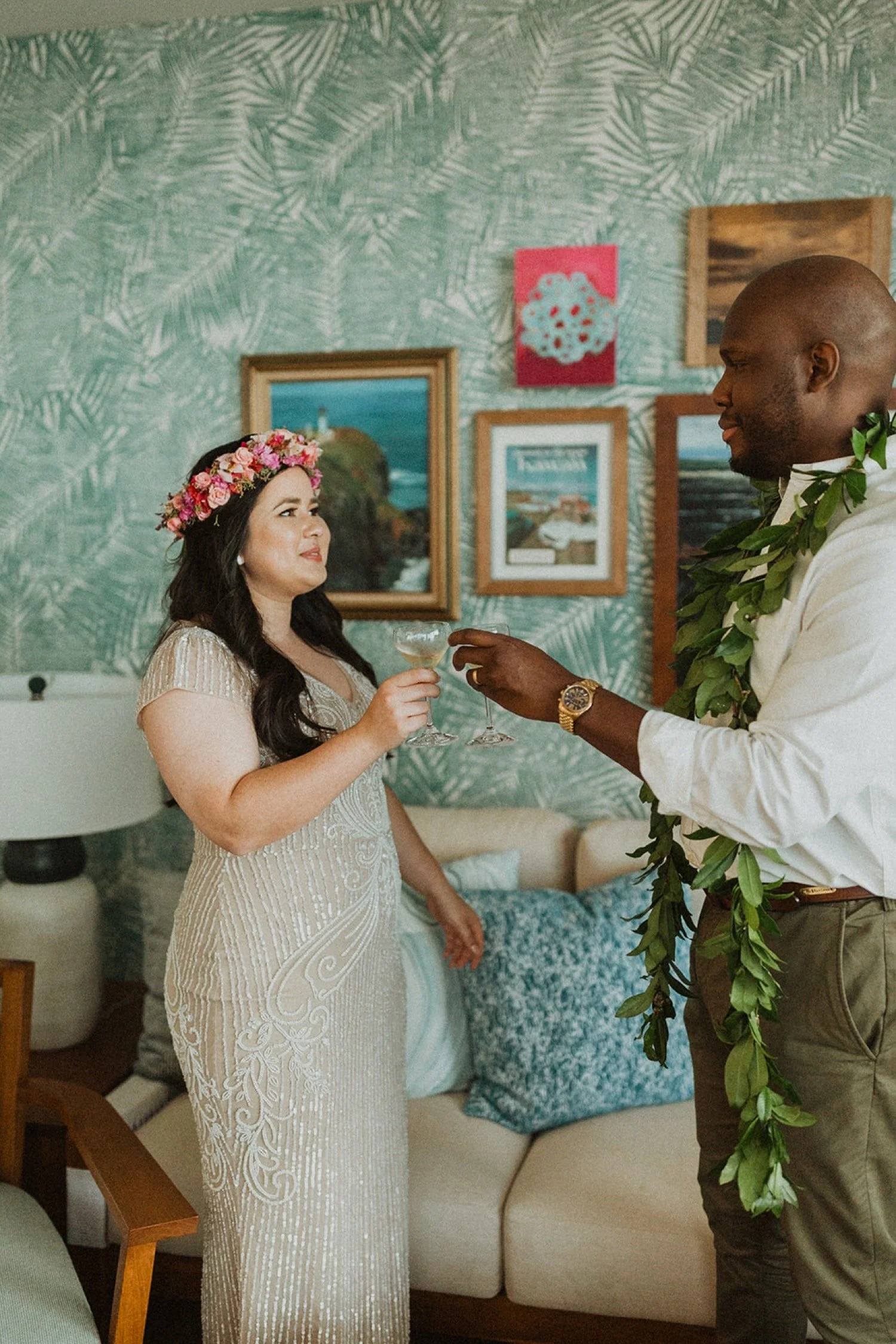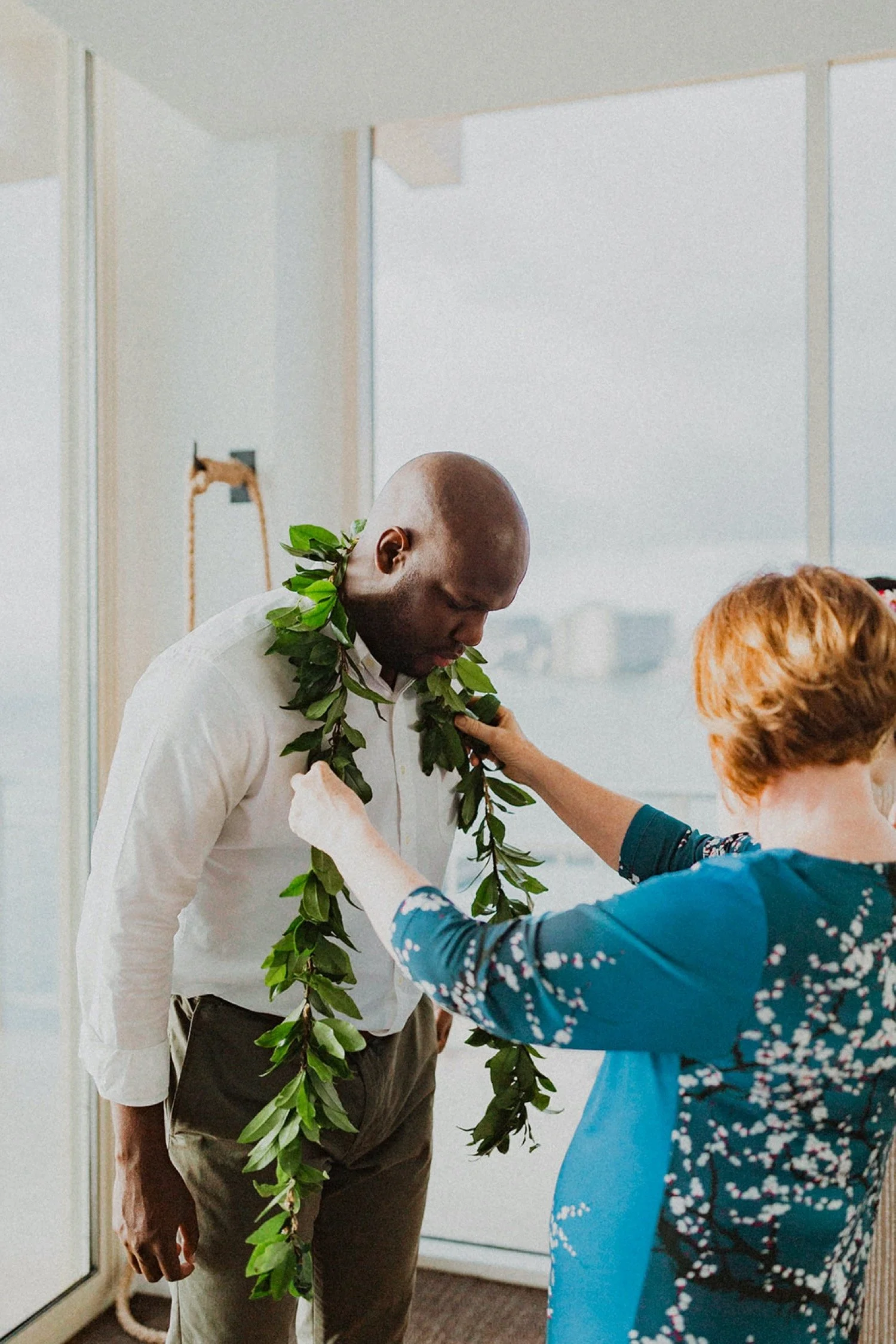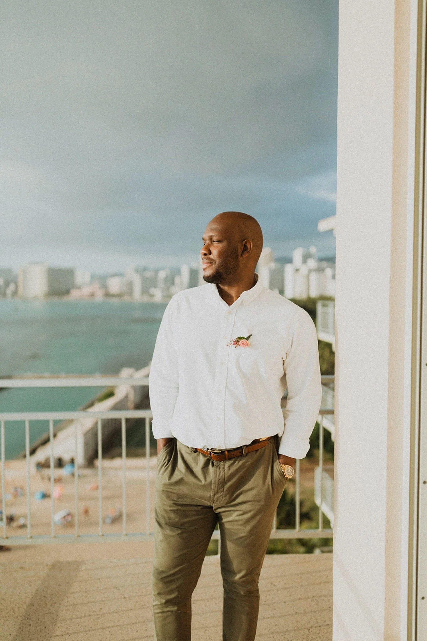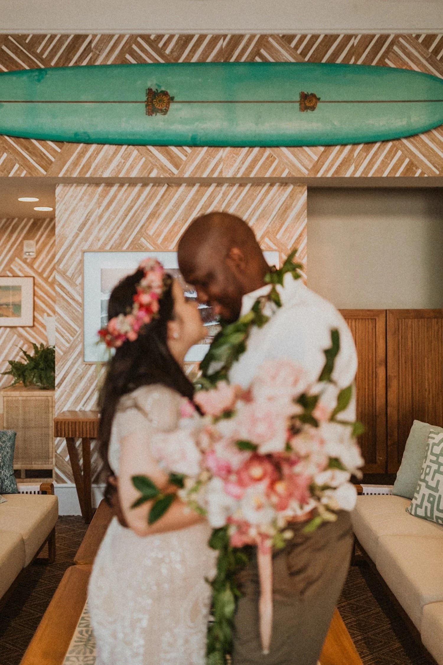 This was my first time ever shooting a hotel room wedding and I loved it so much! Kaimana Beach hotel was the most GORGEOUS place to hold this elopement! This is a brand new renovated hotel on the edge of Waikiki. The suite that Keron and Emily got married in was just stunning. The balcony and large windows had views of Waikiki Beach and the iconic Diamond Head. I was so obsessed with this hotel, and there were so many little spots that were perfect for photos! Every single detail at this hotel room was throughout perfectly and gave that Hawaii tropical vibe. The modern tropical details and decor, the gallery wall, and the palm leaf wallpaper made this hotel so much fun to shoot at and the perfect place for an Intimate Hotel room wedding.
