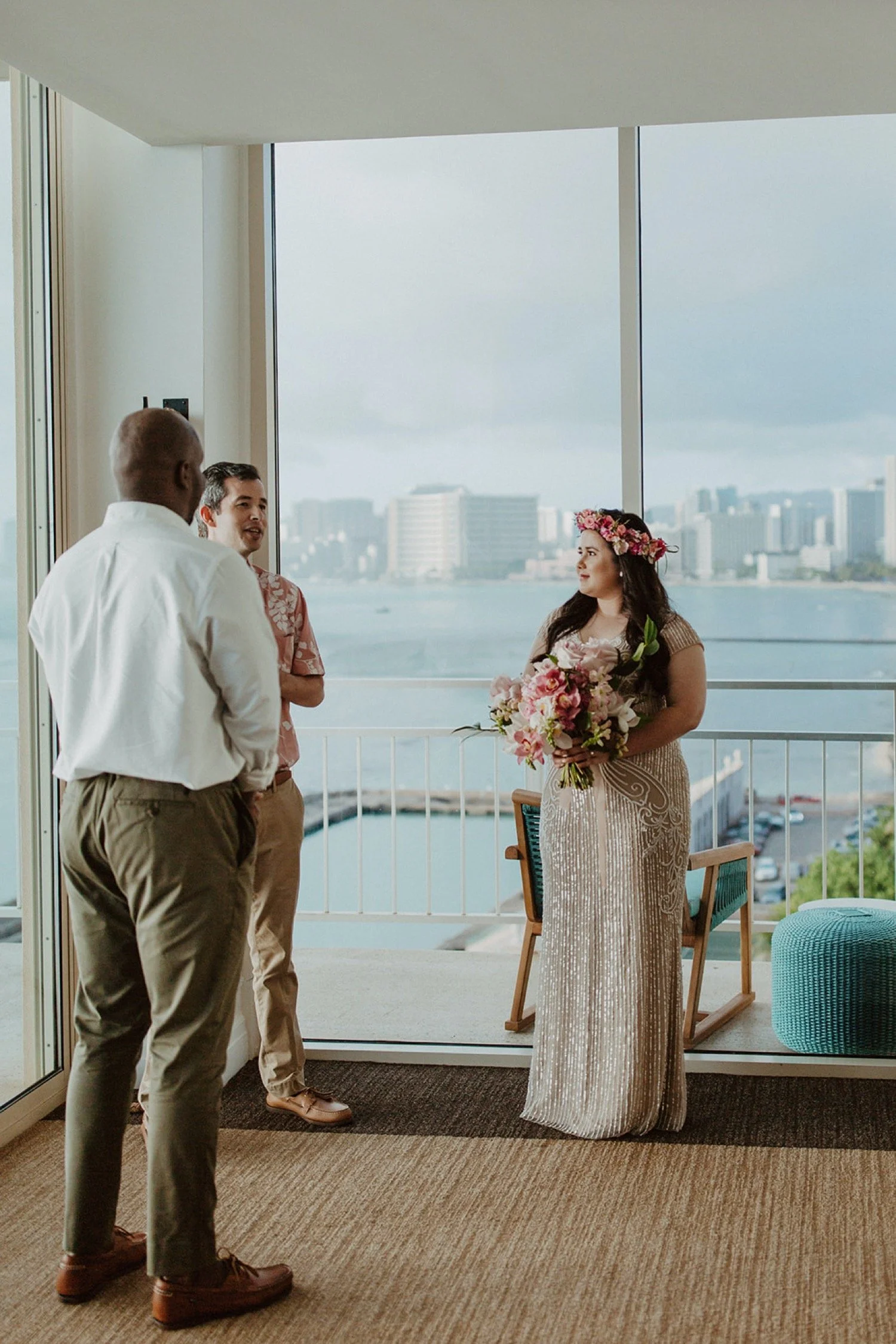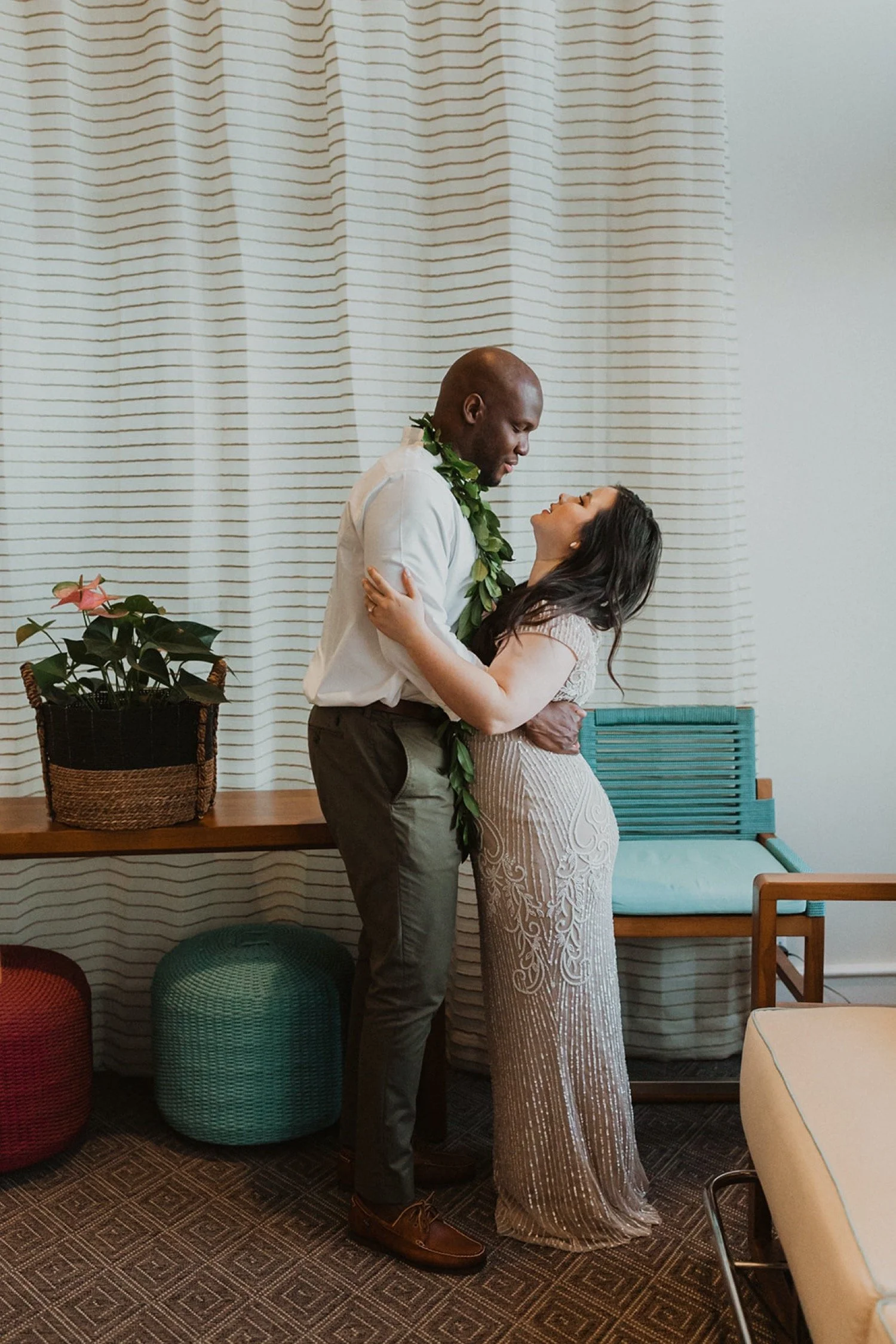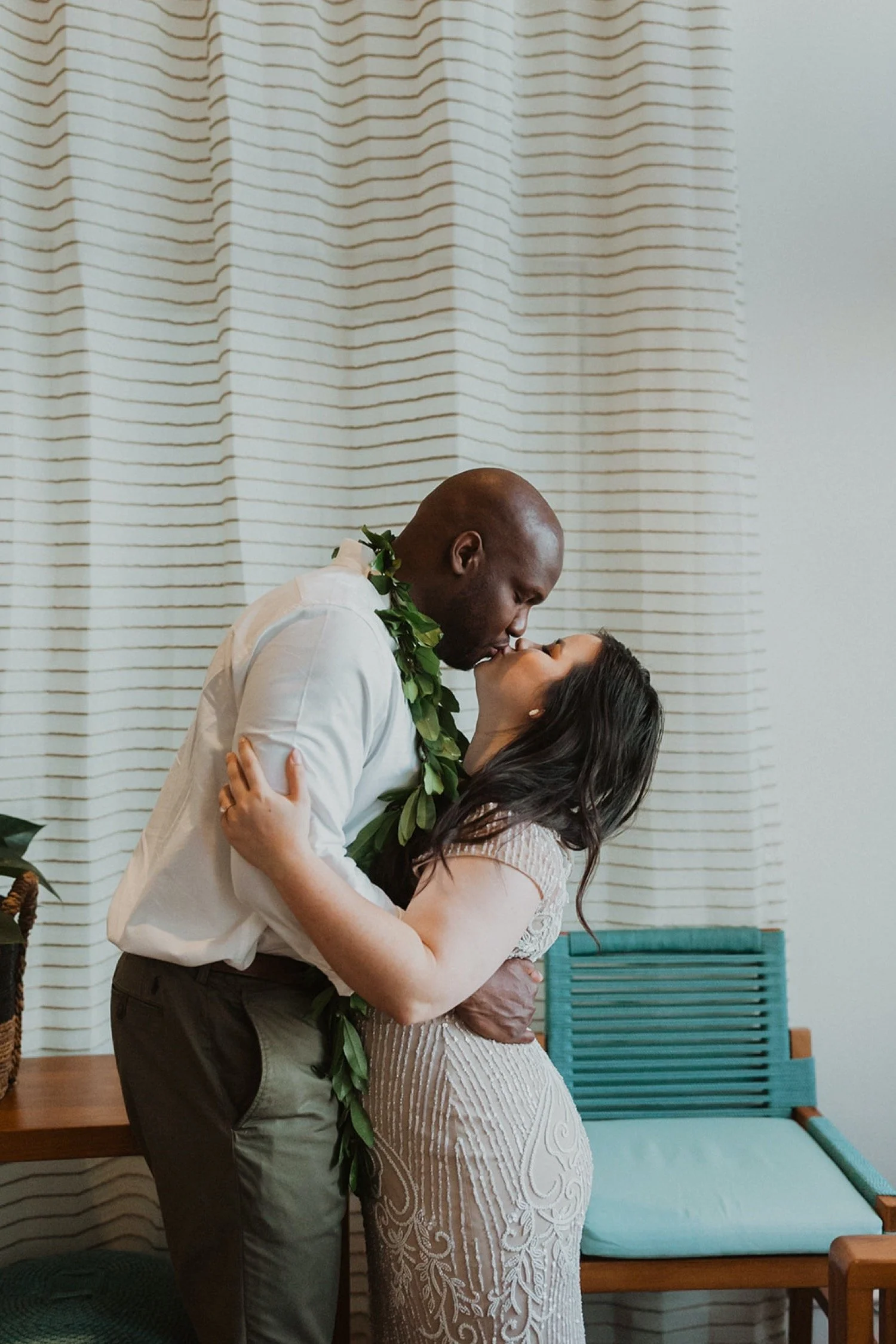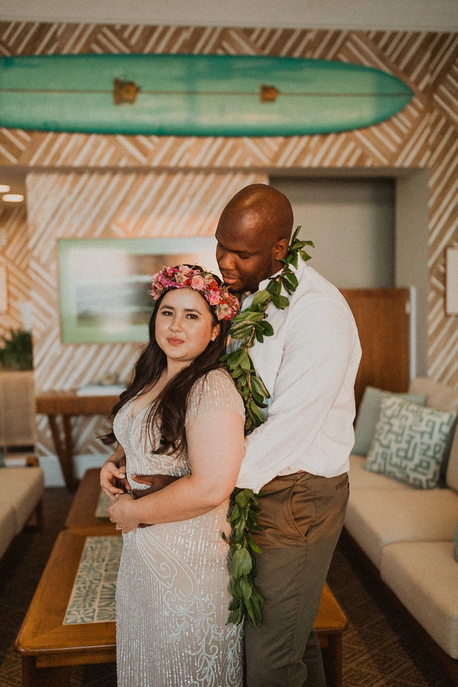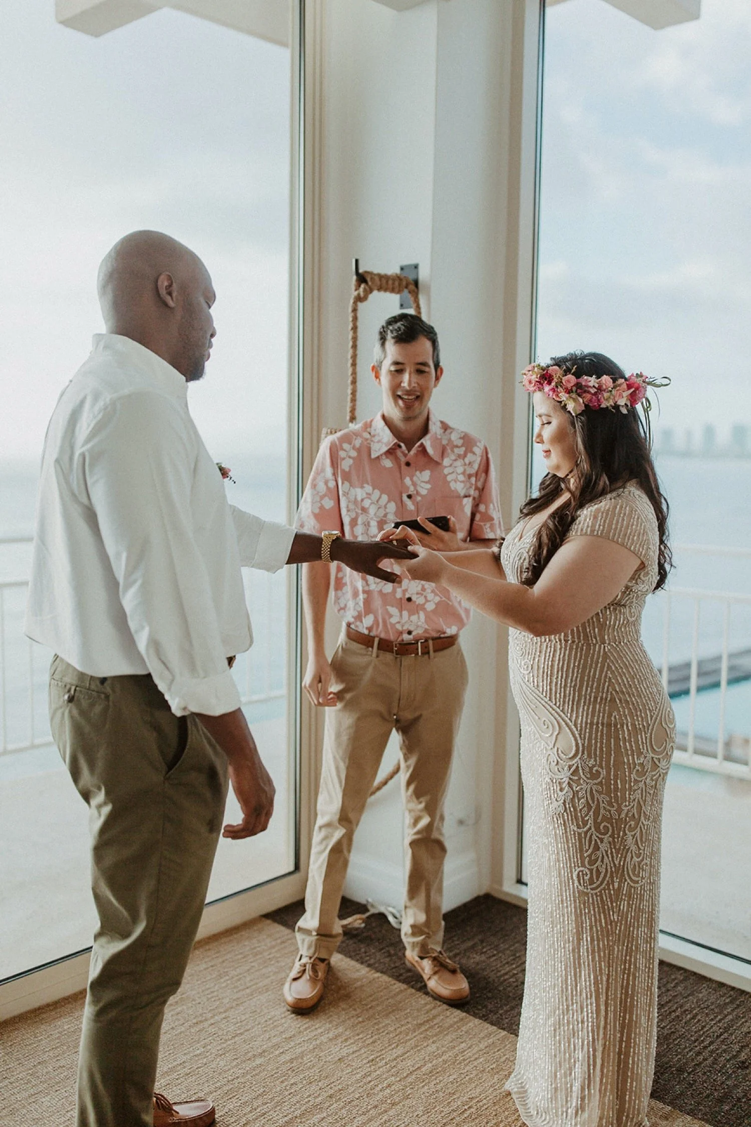This was my first time ever shooting a hotel room wedding and I loved it so much! Kaimana Beach hotel was the most GORGEOUS place to hold this elopement! This is a brand new renovated hotel on the edge of Waikiki. The suite that Keron and Emily got married in was just stunning. The balcony and large windows had views of Waikiki Beach and the iconic Diamond Head. I was so obsessed with this hotel, and there were so many little spots that were perfect for photos! Every single detail at this hotel room was throughout perfectly and gave that Hawaii tropical vibe. The modern tropical details and decor, the gallery wall, and the palm leaf wallpaper made this hotel so much fun to shoot at and the perfect place for an Intimate Hotel room wedding.