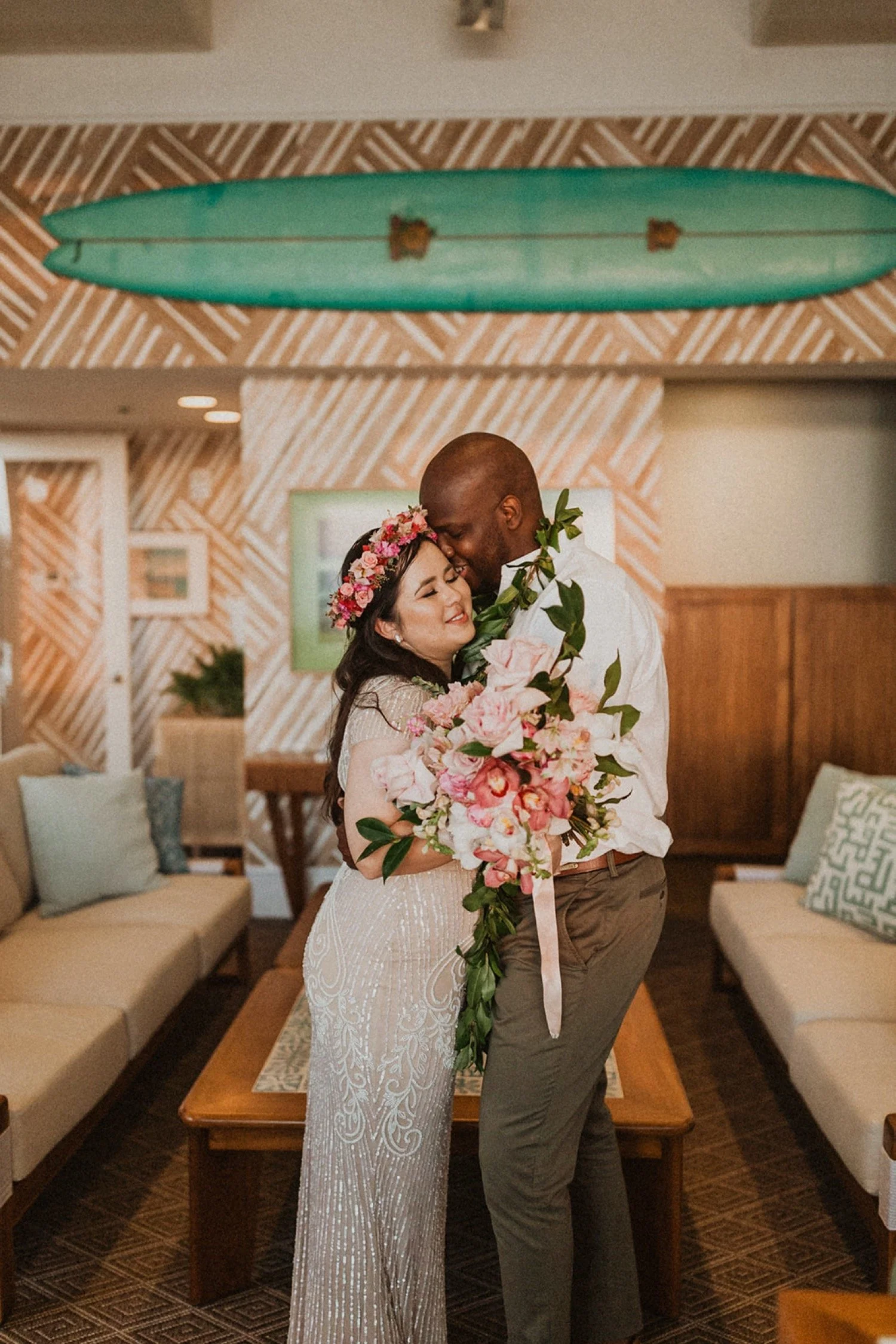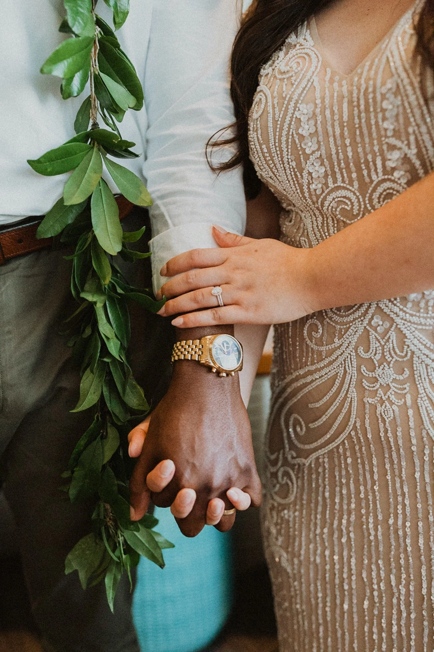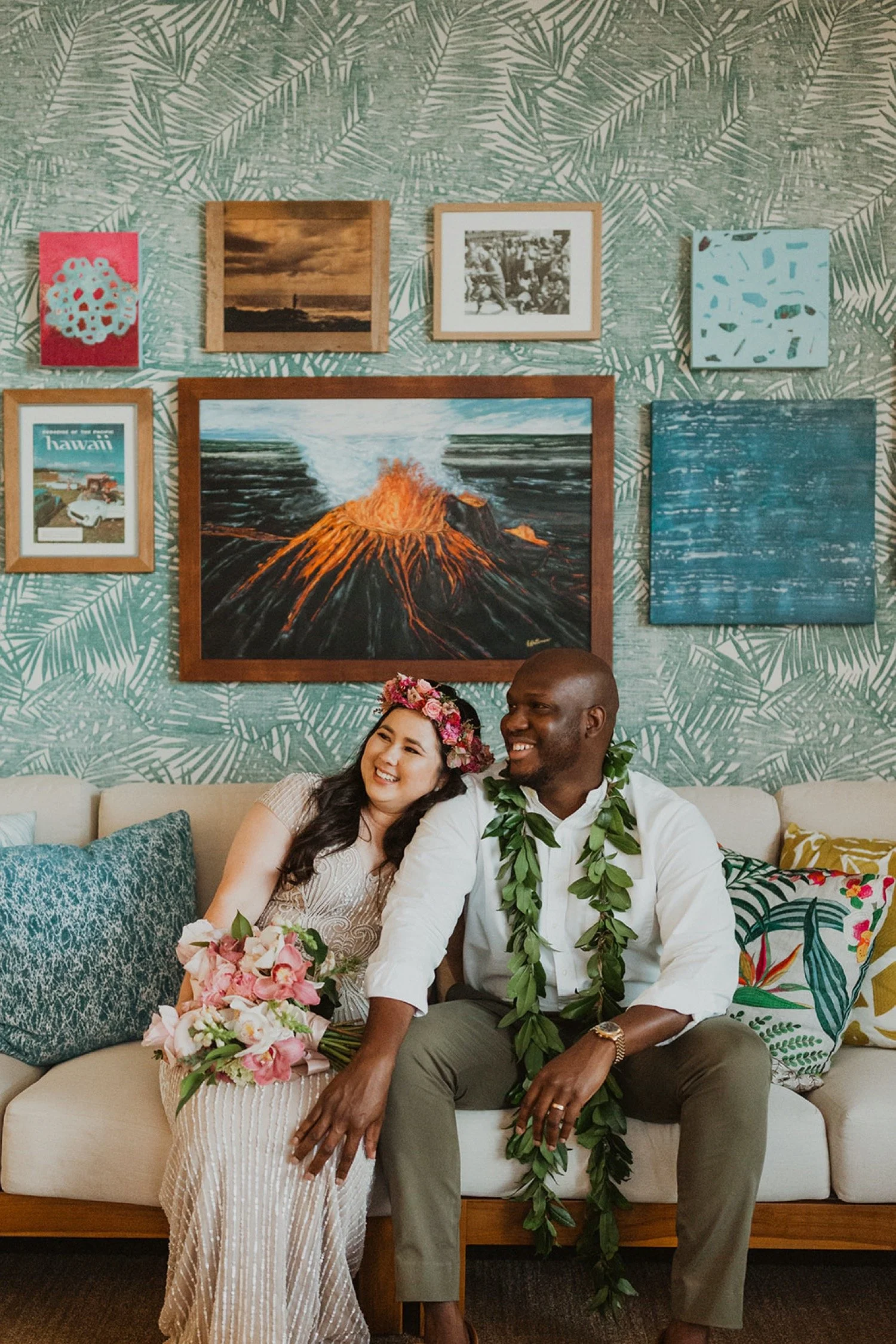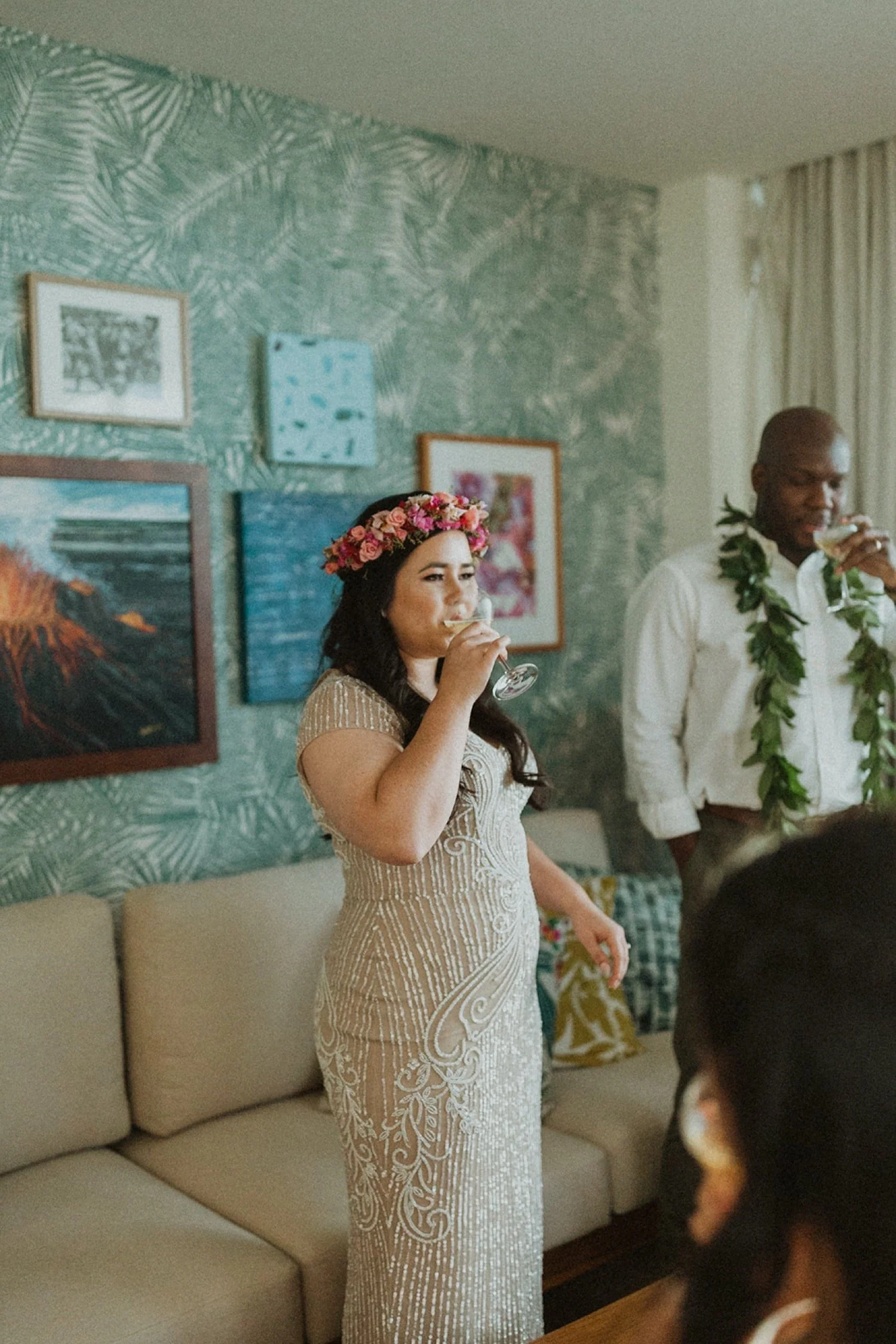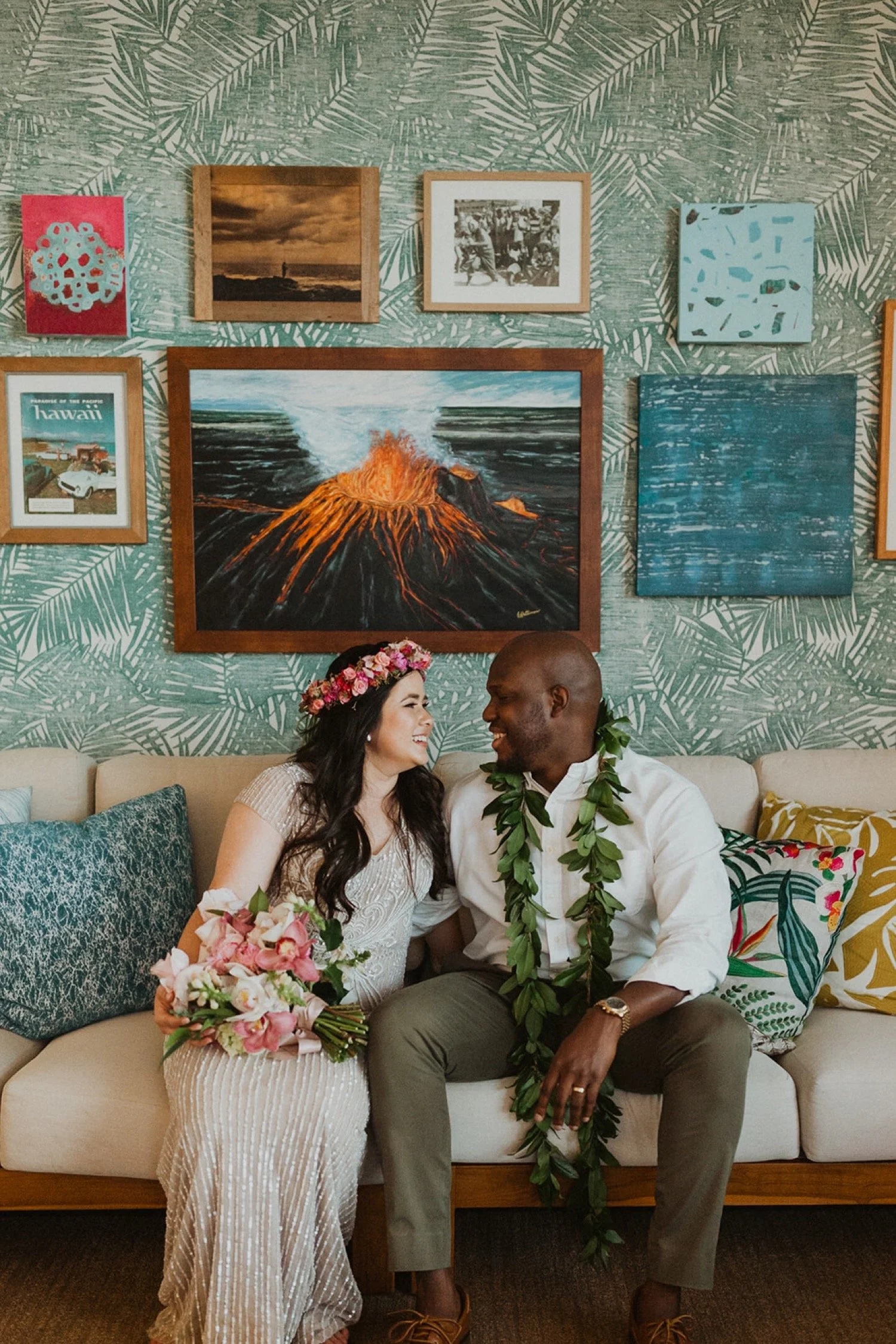 This was my first time ever shooting a hotel room wedding and I loved it so much! Kaimana Beach hotel was the most GORGEOUS place to hold this elopement! This is a brand new renovated hotel on the edge of Waikiki. The suite that Keron and Emily got married in was just stunning. The balcony and large windows had views of Waikiki Beach and the iconic Diamond Head. I was so obsessed with this hotel, and there were so many little spots that were perfect for photos! Every single detail at this hotel room was throughout perfectly and gave that Hawaii tropical vibe. The modern tropical details and decor, the gallery wall, and the palm leaf wallpaper made this hotel so much fun to shoot at and the perfect place for an Intimate Hotel room wedding.