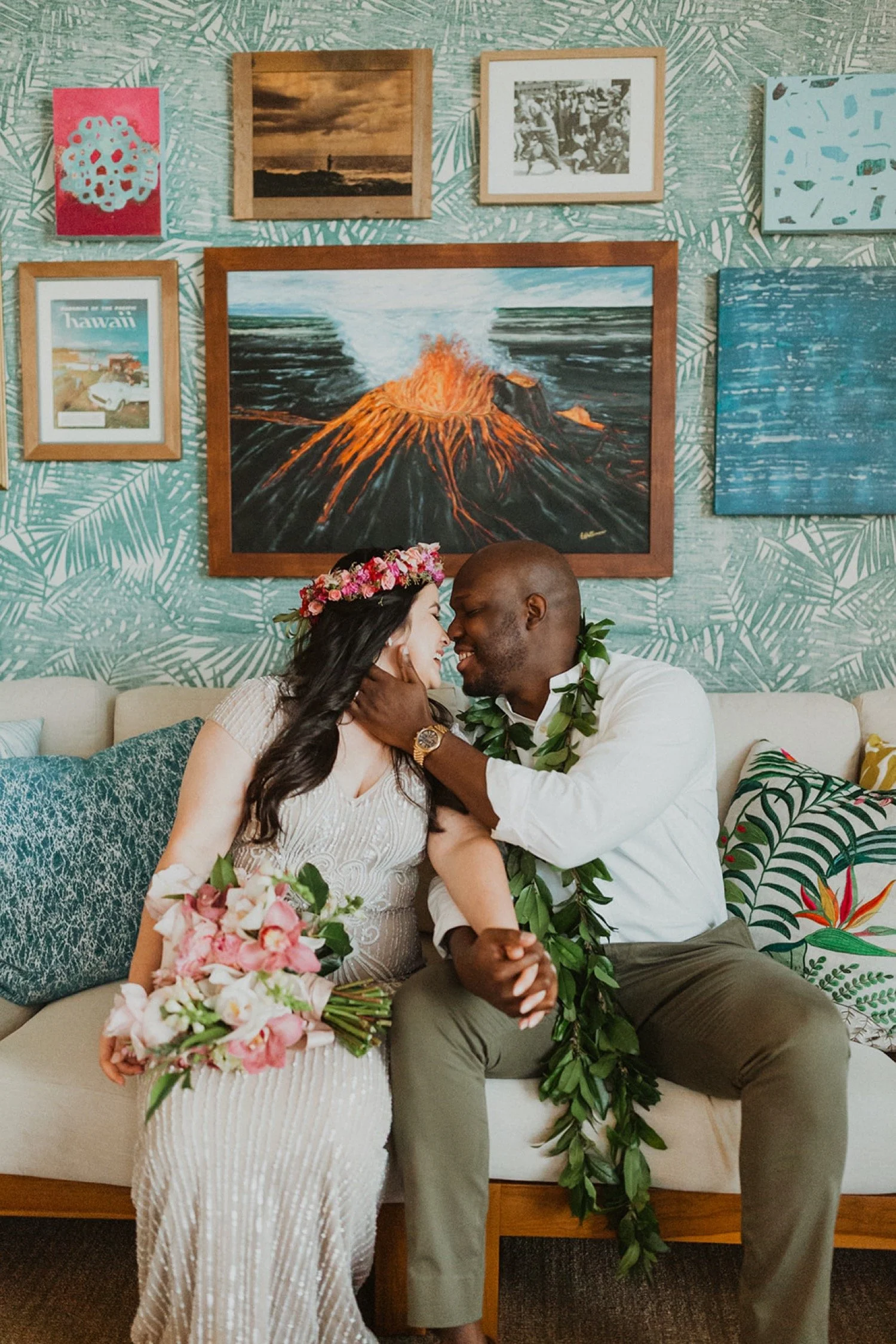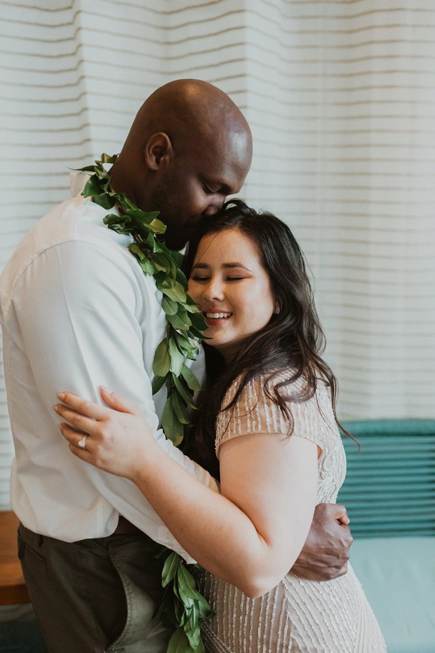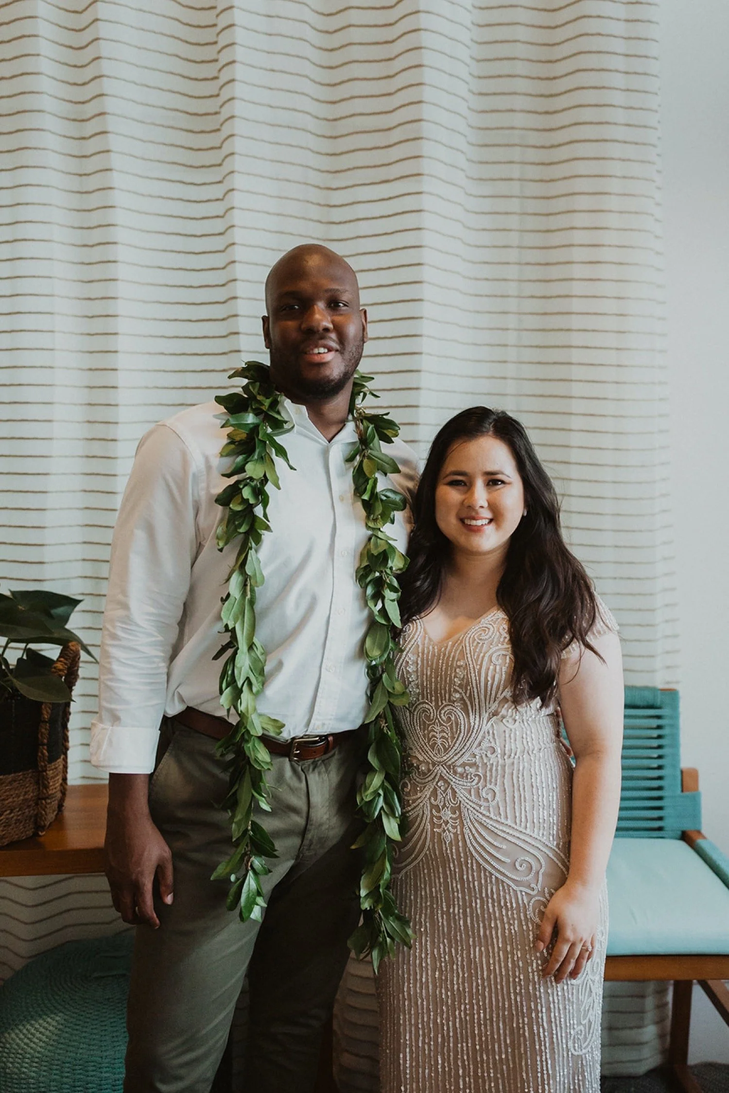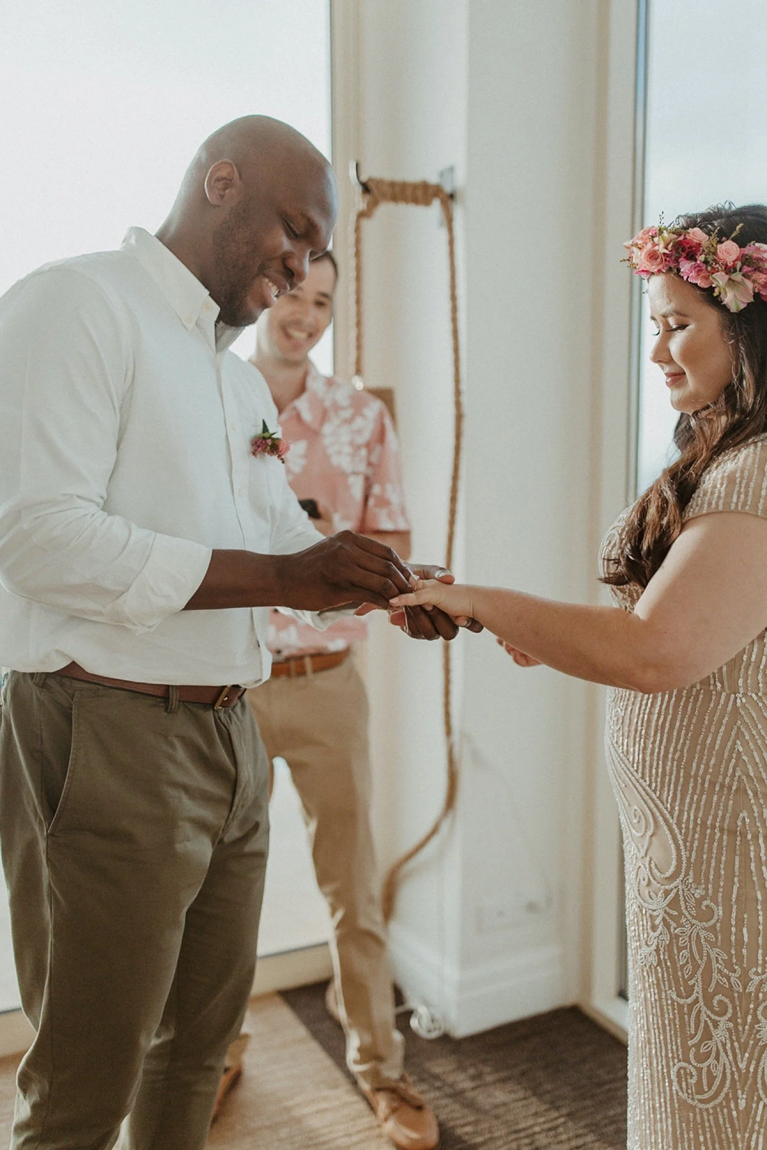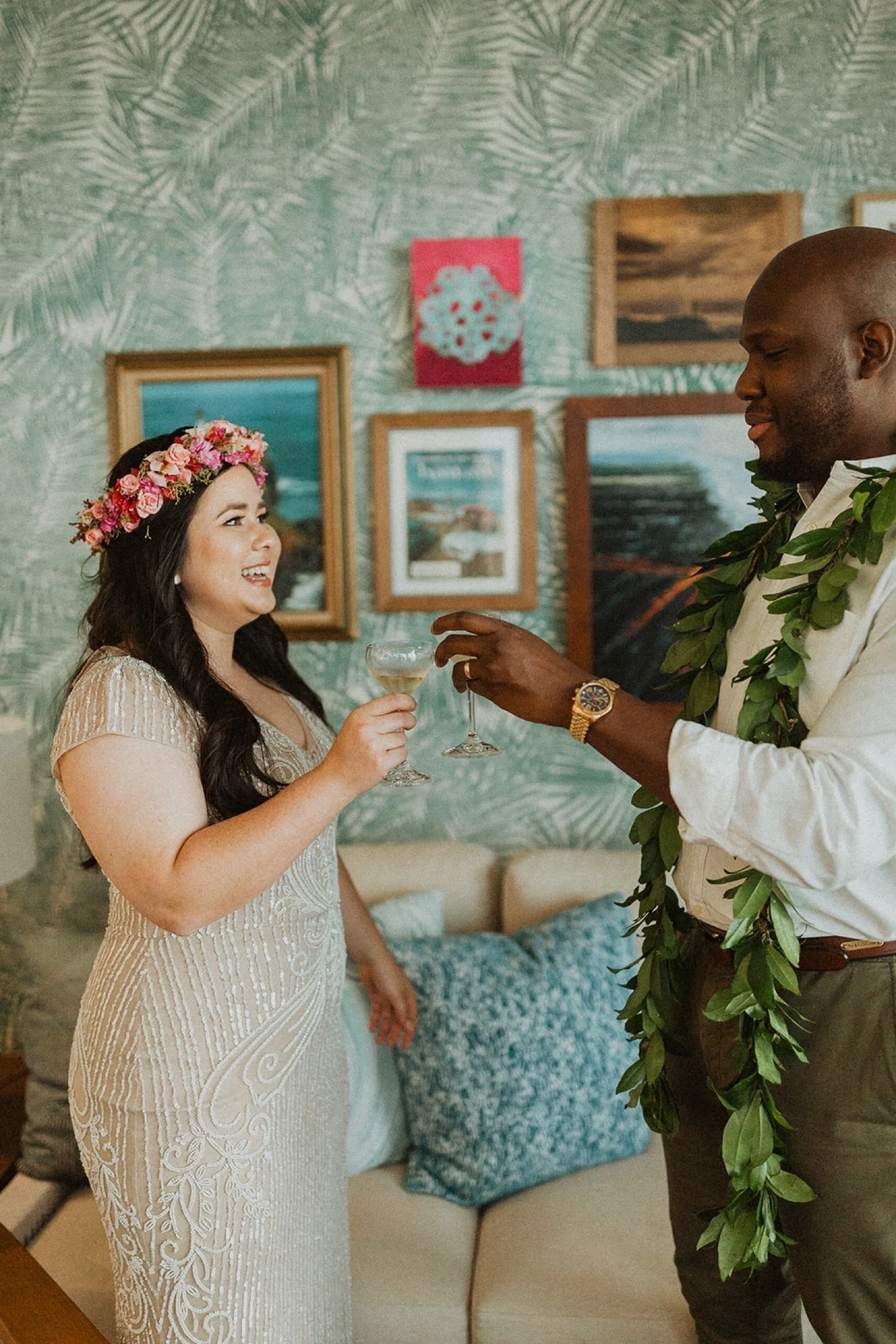 This was my first time ever shooting a hotel room wedding and I loved it so much! Kaimana Beach hotel was the most GORGEOUS place to hold this elopement! This is a brand new renovated hotel on the edge of Waikiki. The suite that Keron and Emily got married in was just stunning. The balcony and large windows had views of Waikiki Beach and the iconic Diamond Head. I was so obsessed with this hotel, and there were so many little spots that were perfect for photos! Every single detail at this hotel room was throughout perfectly and gave that Hawaii tropical vibe. The modern tropical details and decor, the gallery wall, and the palm leaf wallpaper made this hotel so much fun to shoot at and the perfect place for an Intimate Hotel room wedding.