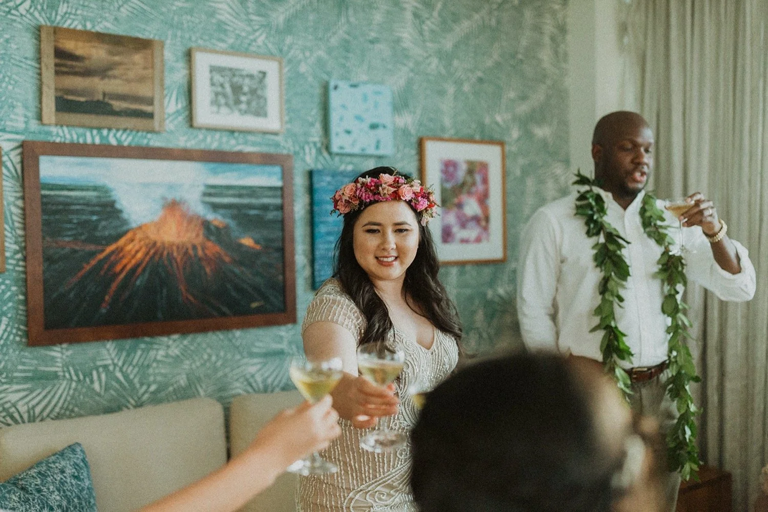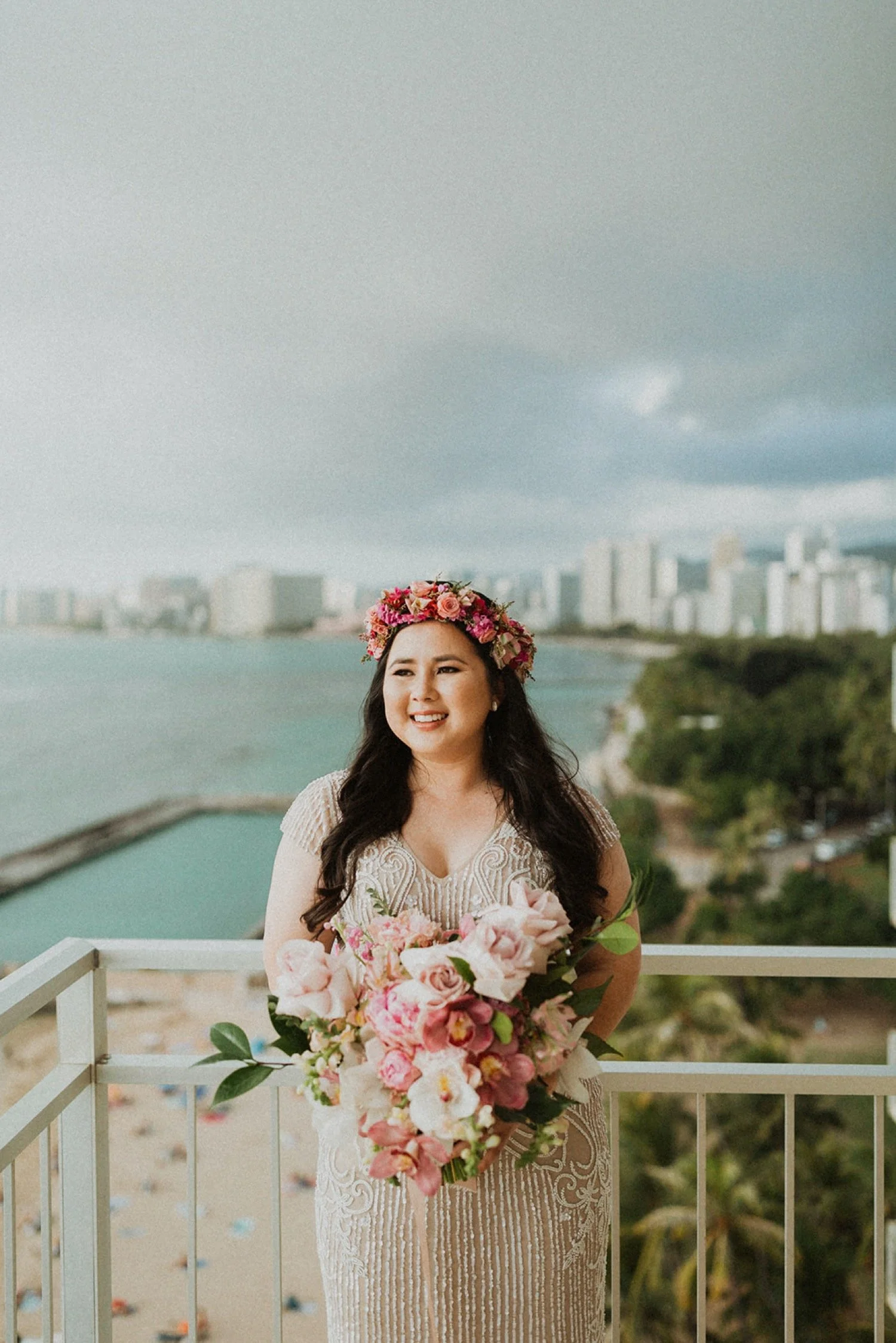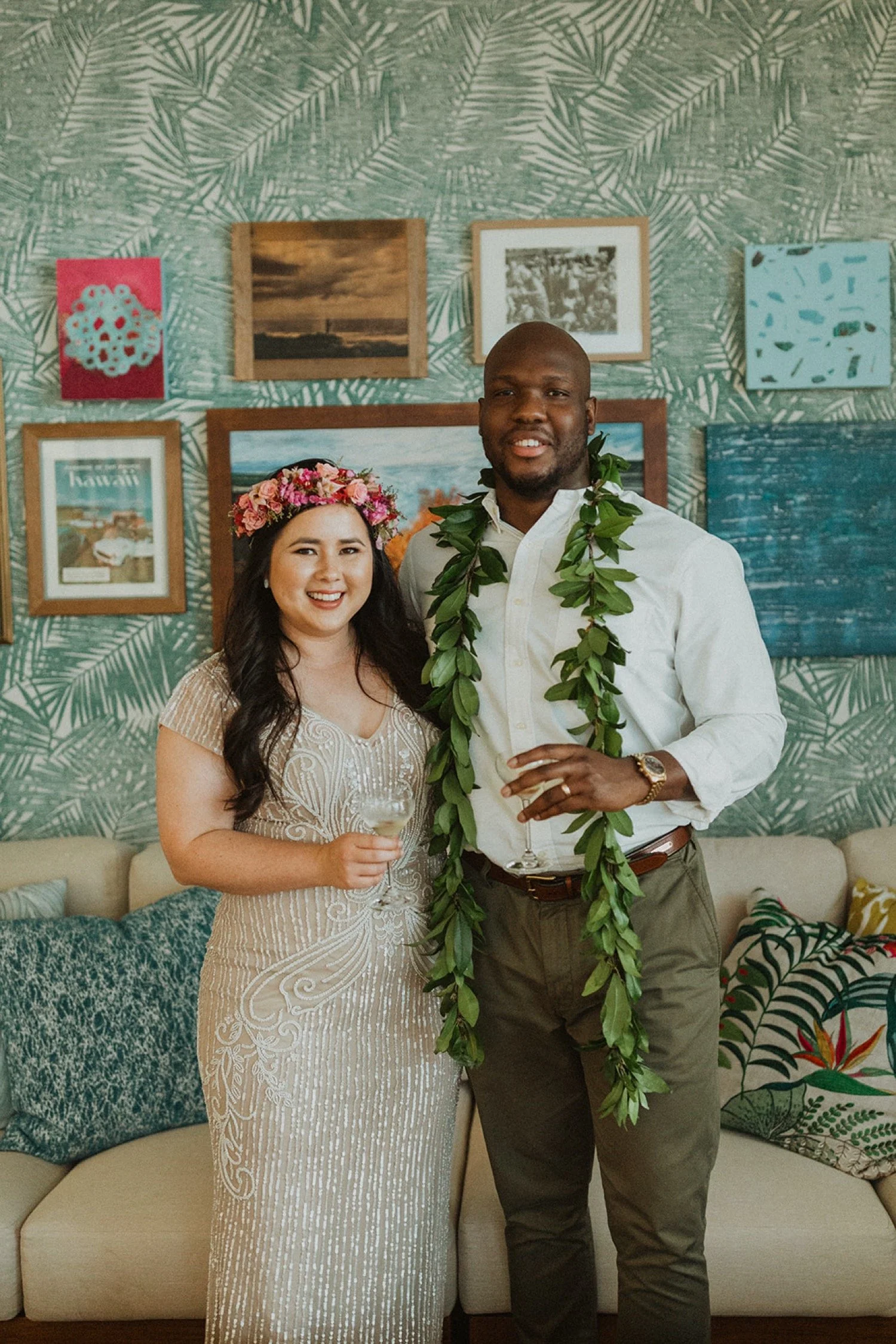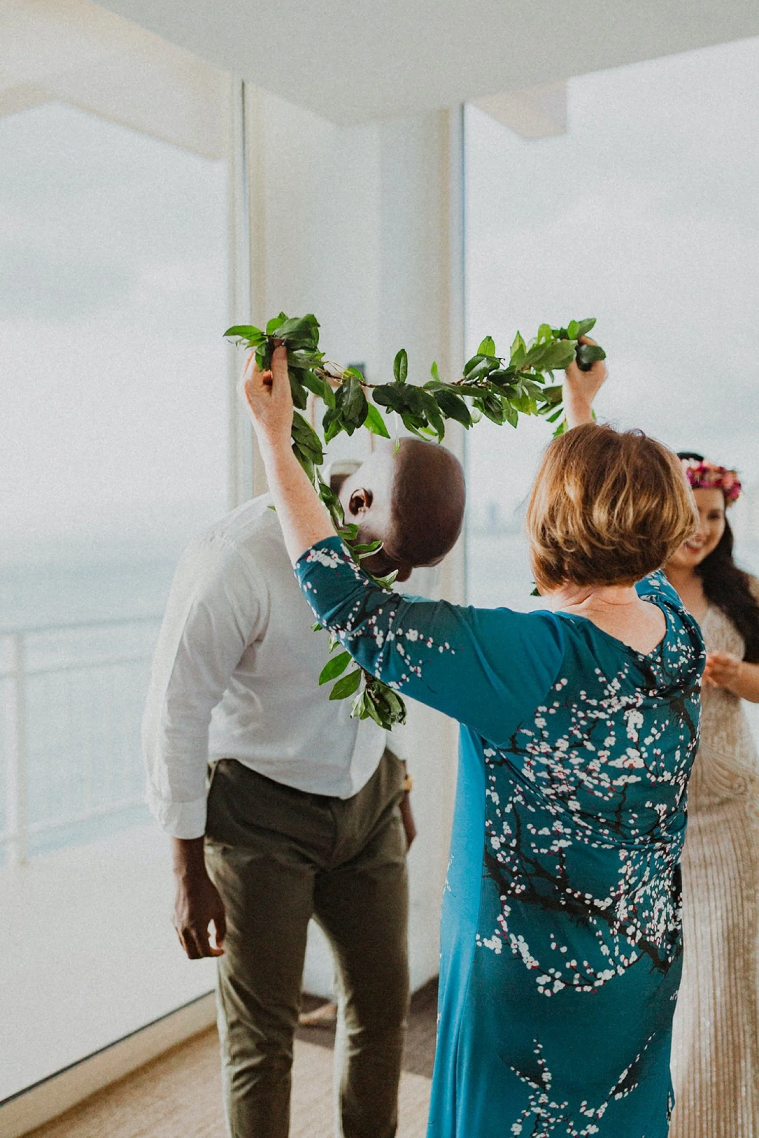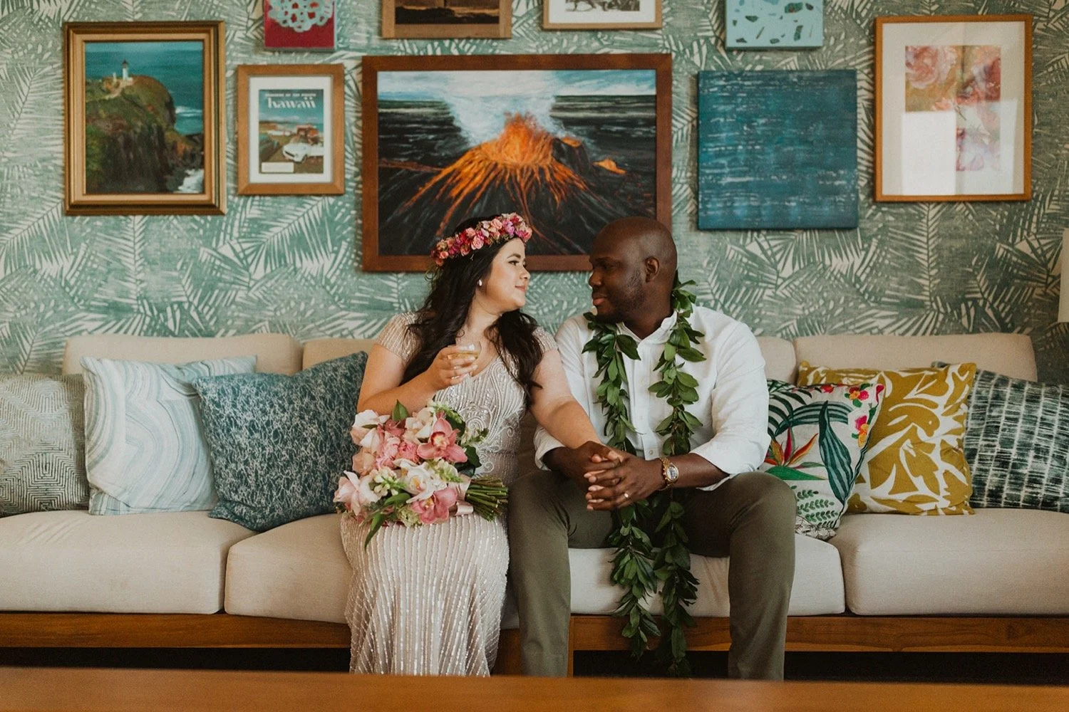 This was my first time ever shooting a hotel room wedding and I loved it so much! Kaimana Beach hotel was the most GORGEOUS place to hold this elopement! This is a brand new renovated hotel on the edge of Waikiki. The suite that Keron and Emily got married in was just stunning. The balcony and large windows had views of Waikiki Beach and the iconic Diamond Head. I was so obsessed with this hotel, and there were so many little spots that were perfect for photos! Every single detail at this hotel room was throughout perfectly and gave that Hawaii tropical vibe. The modern tropical details and decor, the gallery wall, and the palm leaf wallpaper made this hotel so much fun to shoot at and the perfect place for an Intimate Hotel room wedding.