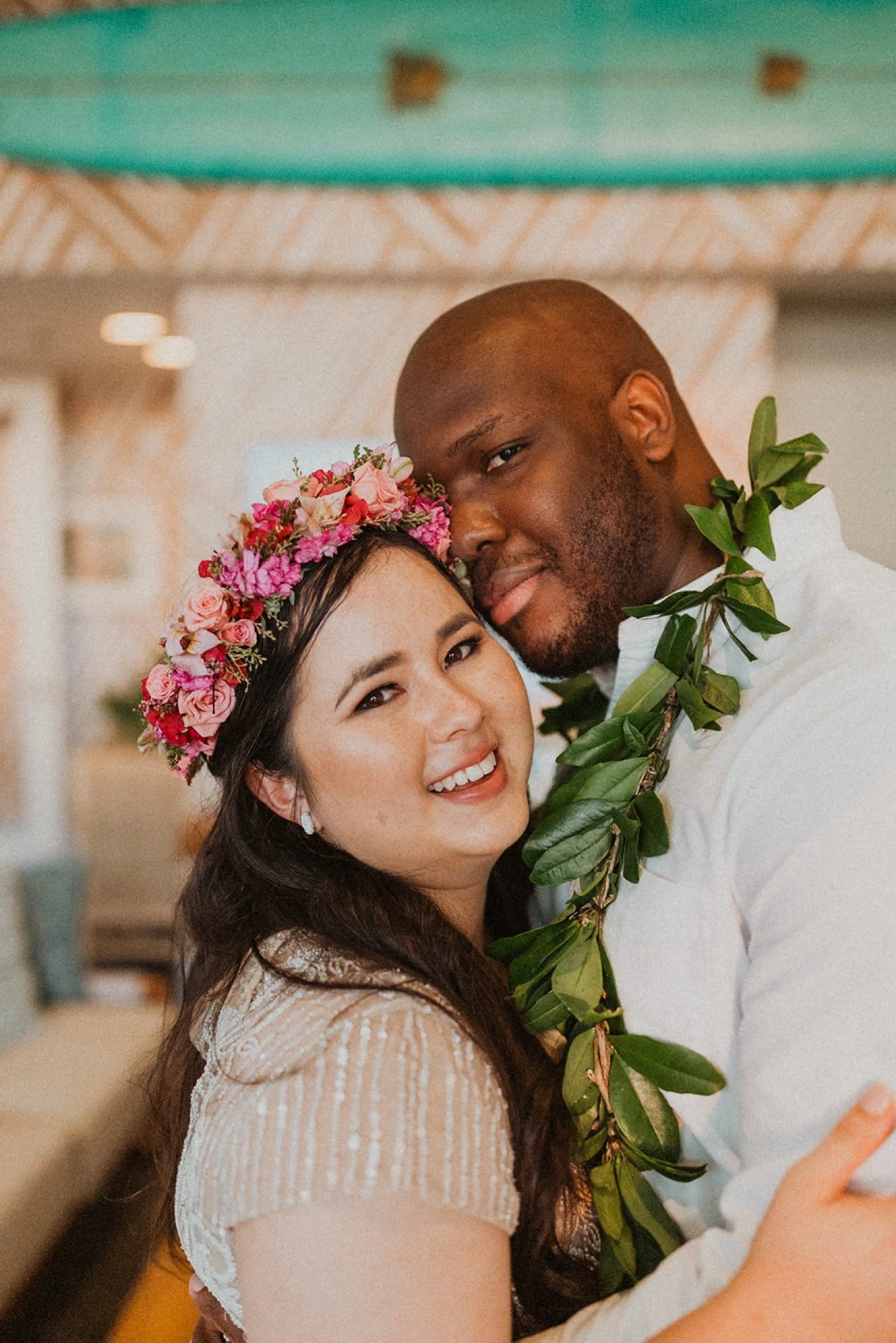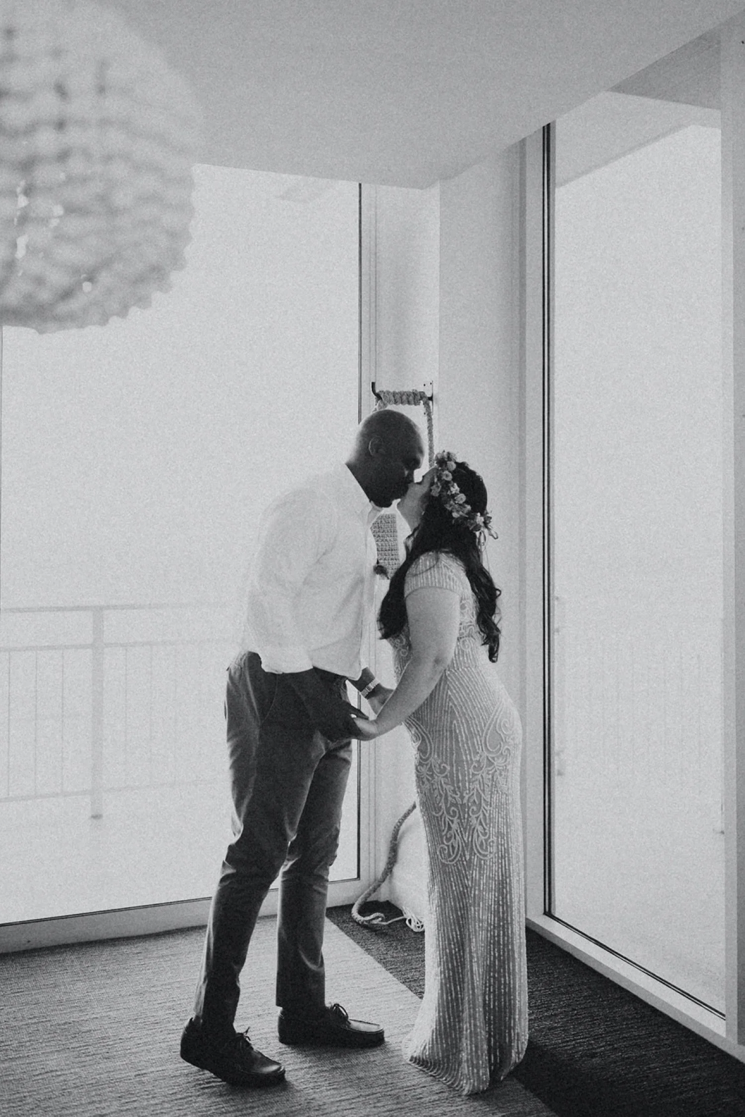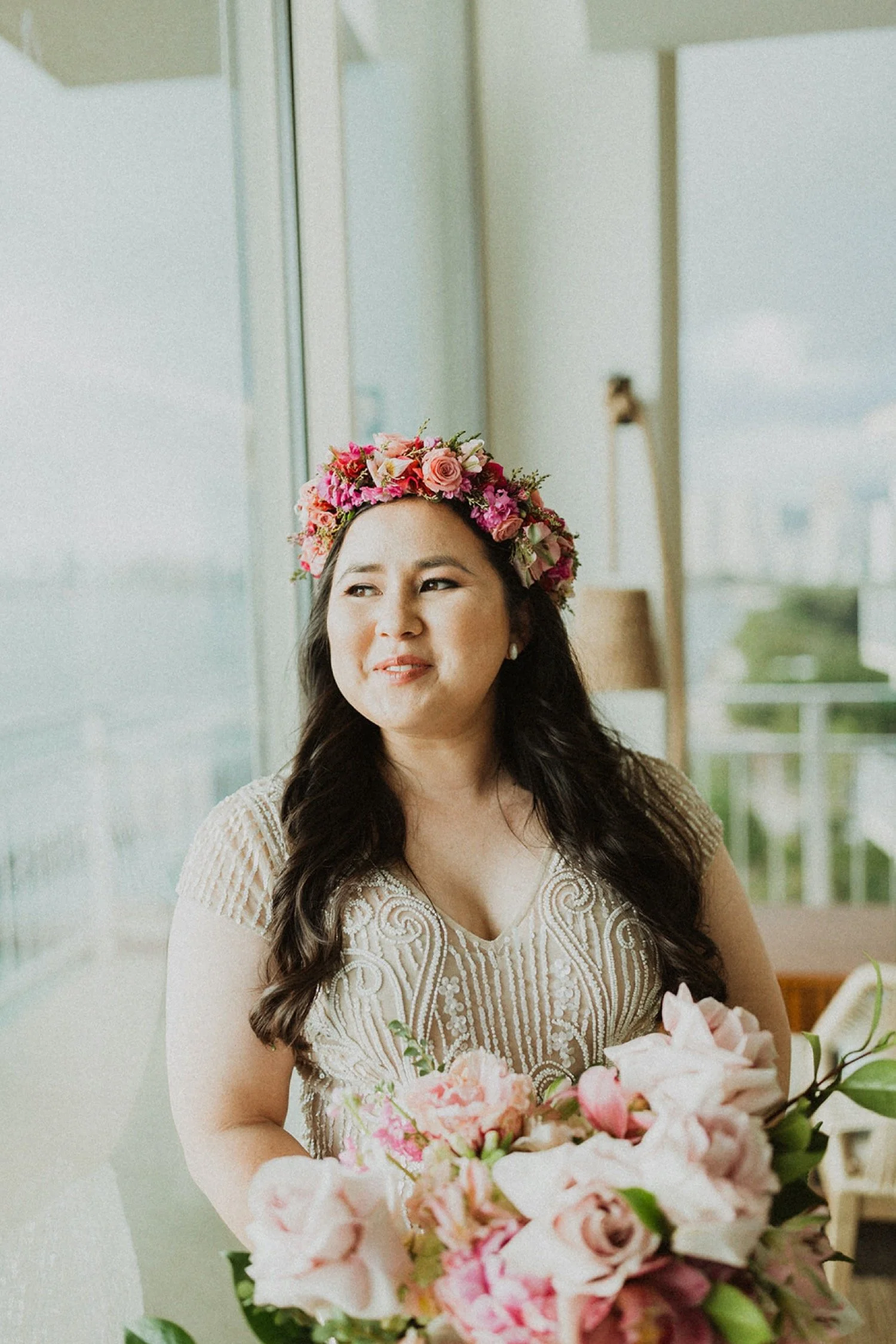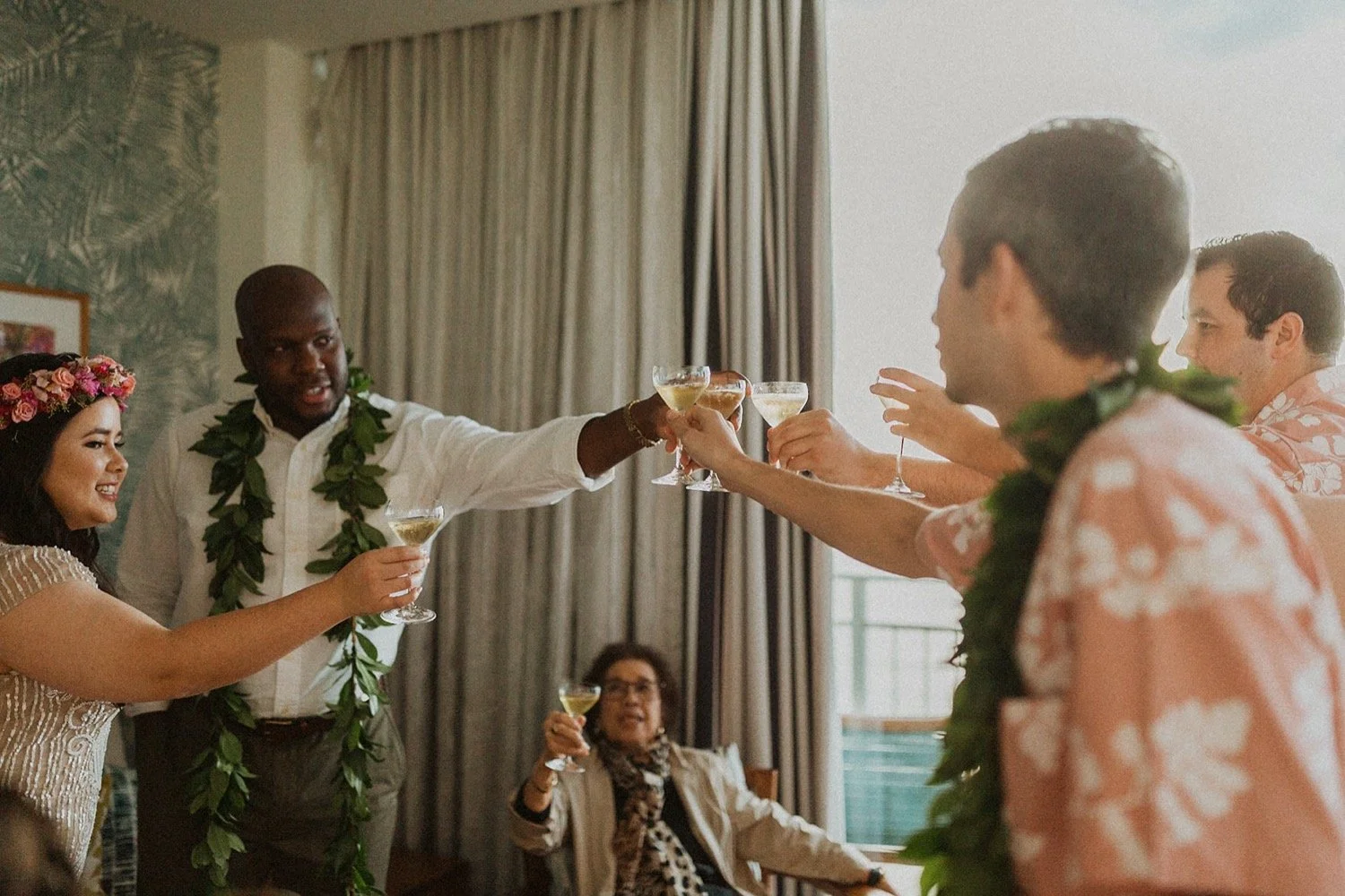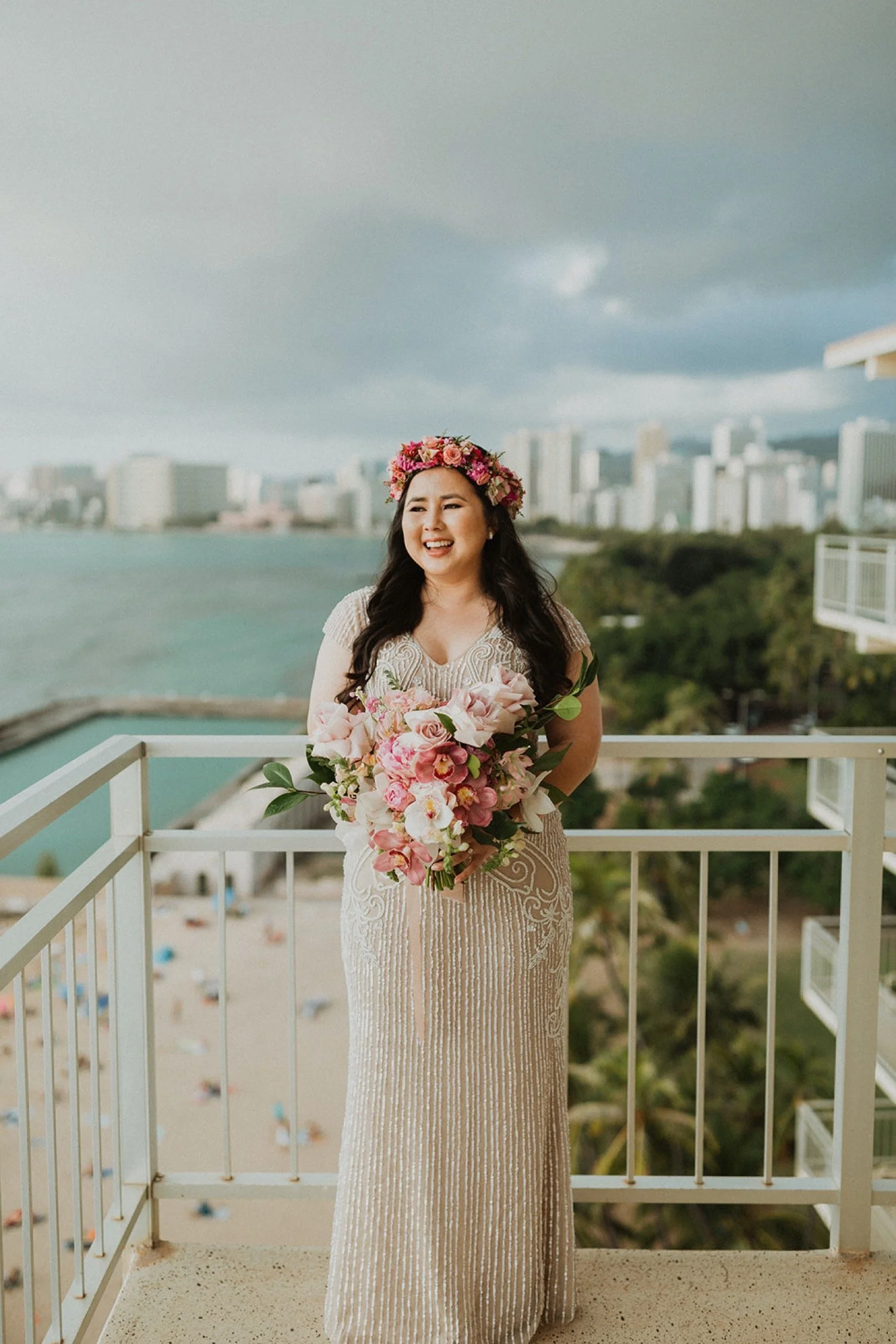 This was my first time ever shooting a hotel room wedding and I loved it so much! Kaimana Beach hotel was the most GORGEOUS place to hold this elopement! This is a brand new renovated hotel on the edge of Waikiki. The suite that Keron and Emily got married in was just stunning. The balcony and large windows had views of Waikiki Beach and the iconic Diamond Head. I was so obsessed with this hotel, and there were so many little spots that were perfect for photos! Every single detail at this hotel room was throughout perfectly and gave that Hawaii tropical vibe. The modern tropical details and decor, the gallery wall, and the palm leaf wallpaper made this hotel so much fun to shoot at and the perfect place for an Intimate Hotel room wedding.