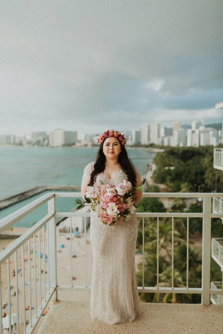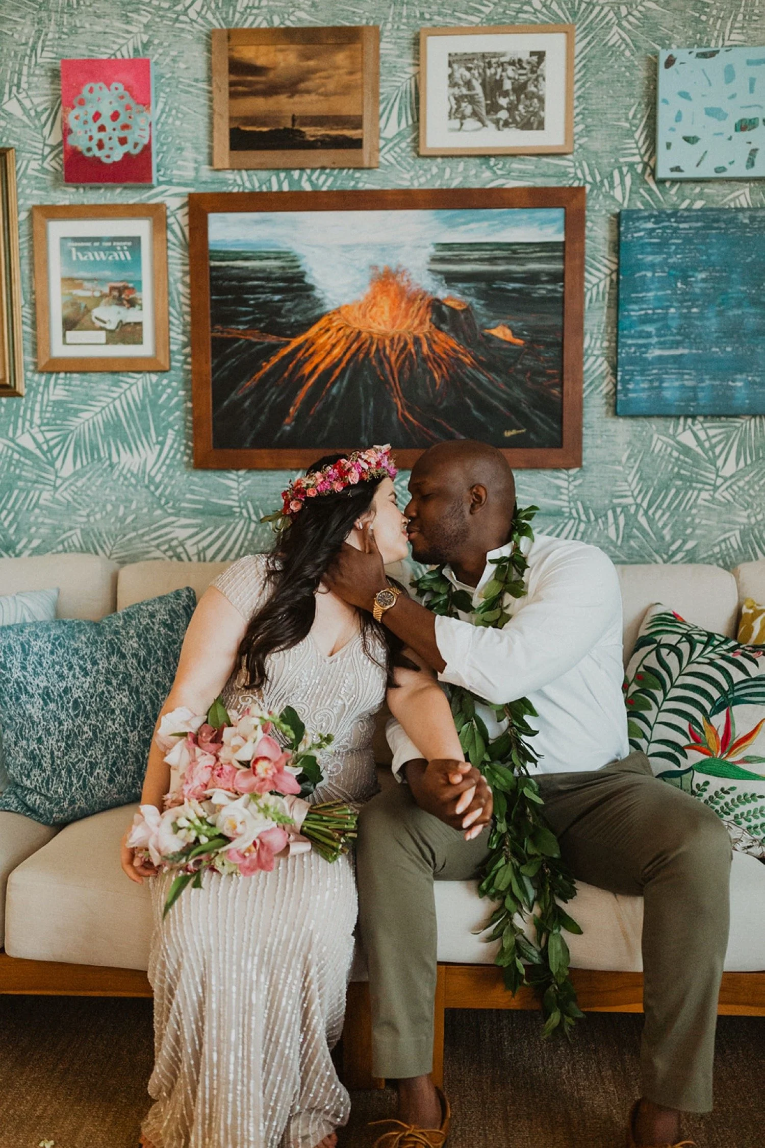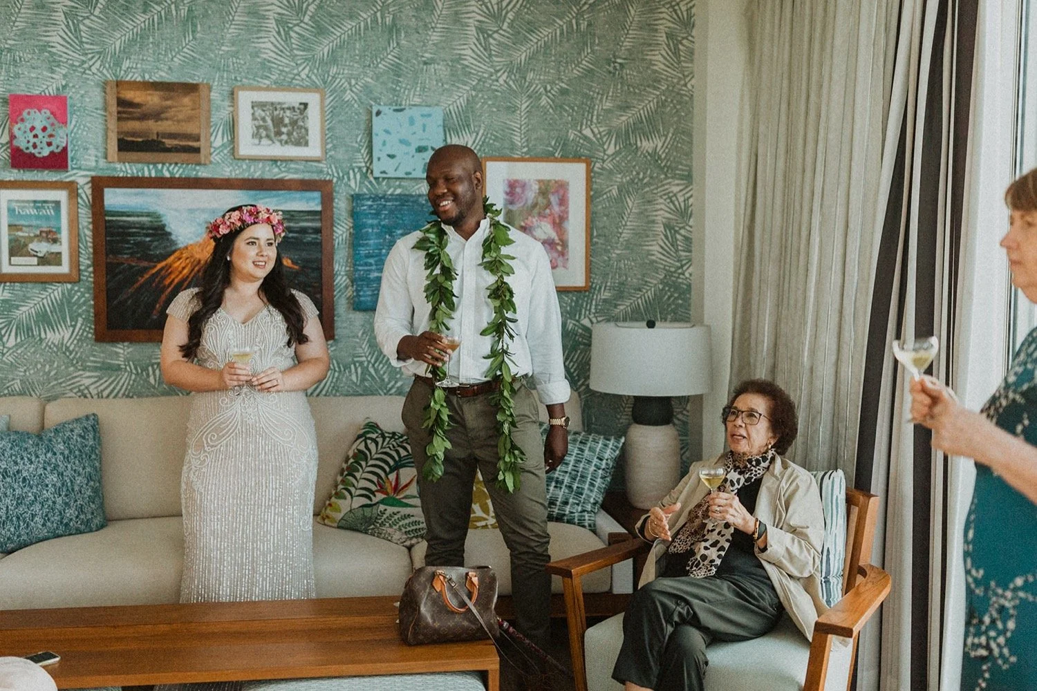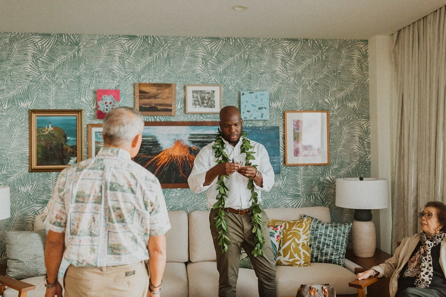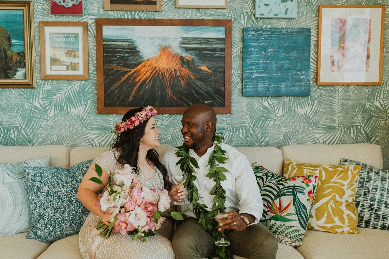 This was my first time ever shooting a hotel room wedding and I loved it so much! Kaimana Beach hotel was the most GORGEOUS place to hold this elopement! This is a brand new renovated hotel on the edge of Waikiki. The suite that Keron and Emily got married in was just stunning. The balcony and large windows had views of Waikiki Beach and the iconic Diamond Head. I was so obsessed with this hotel, and there were so many little spots that were perfect for photos! Every single detail at this hotel room was throughout perfectly and gave that Hawaii tropical vibe. The modern tropical details and decor, the gallery wall, and the palm leaf wallpaper made this hotel so much fun to shoot at and the perfect place for an Intimate Hotel room wedding.