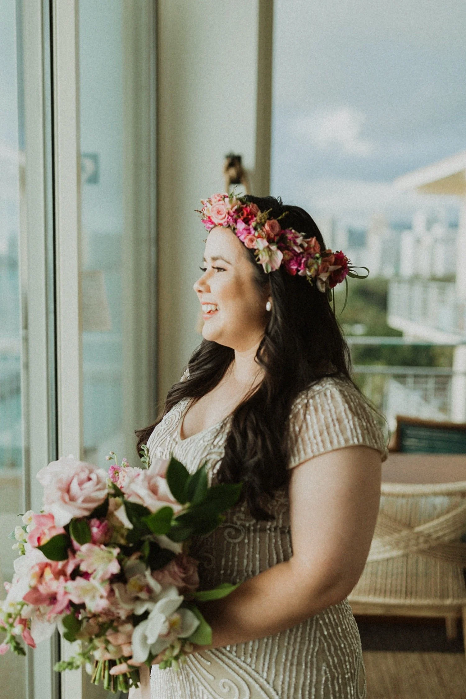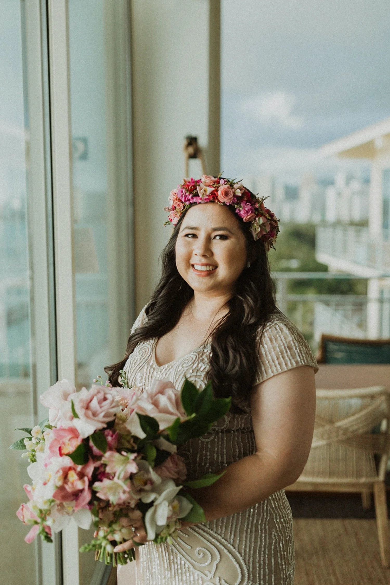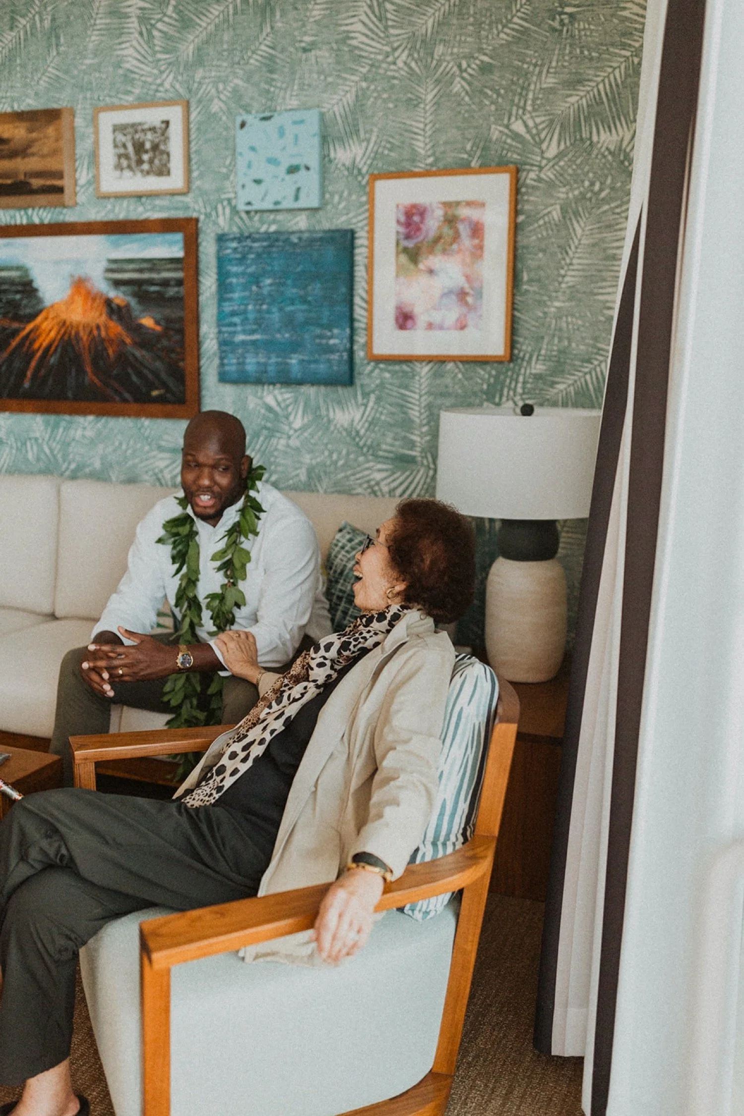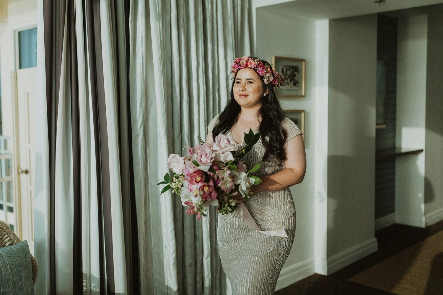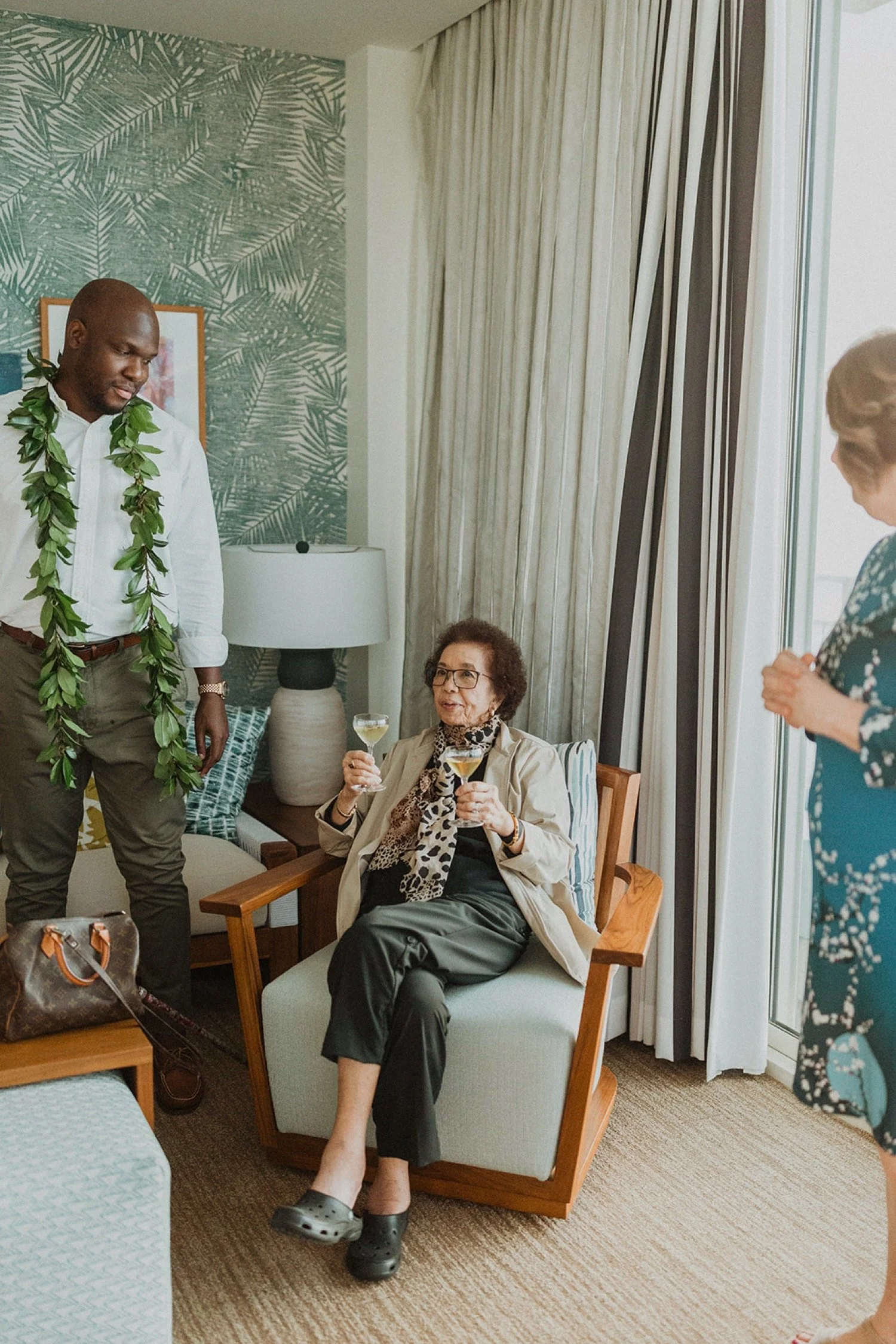 This was my first time ever shooting a hotel room wedding and I loved it so much! Kaimana Beach hotel was the most GORGEOUS place to hold this elopement! This is a brand new renovated hotel on the edge of Waikiki. The suite that Keron and Emily got married in was just stunning. The balcony and large windows had views of Waikiki Beach and the iconic Diamond Head. I was so obsessed with this hotel, and there were so many little spots that were perfect for photos! Every single detail at this hotel room was throughout perfectly and gave that Hawaii tropical vibe. The modern tropical details and decor, the gallery wall, and the palm leaf wallpaper made this hotel so much fun to shoot at and the perfect place for an Intimate Hotel room wedding.