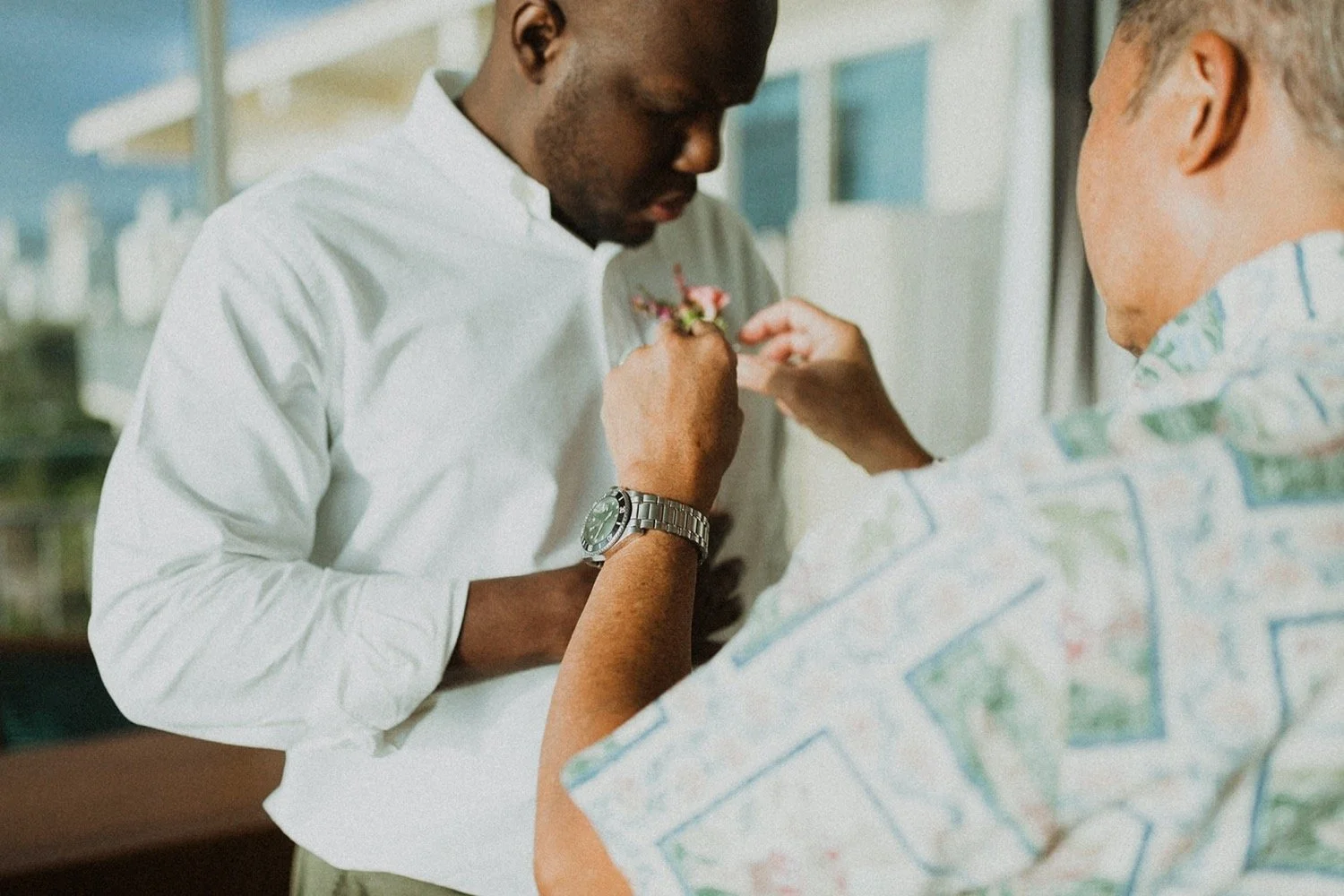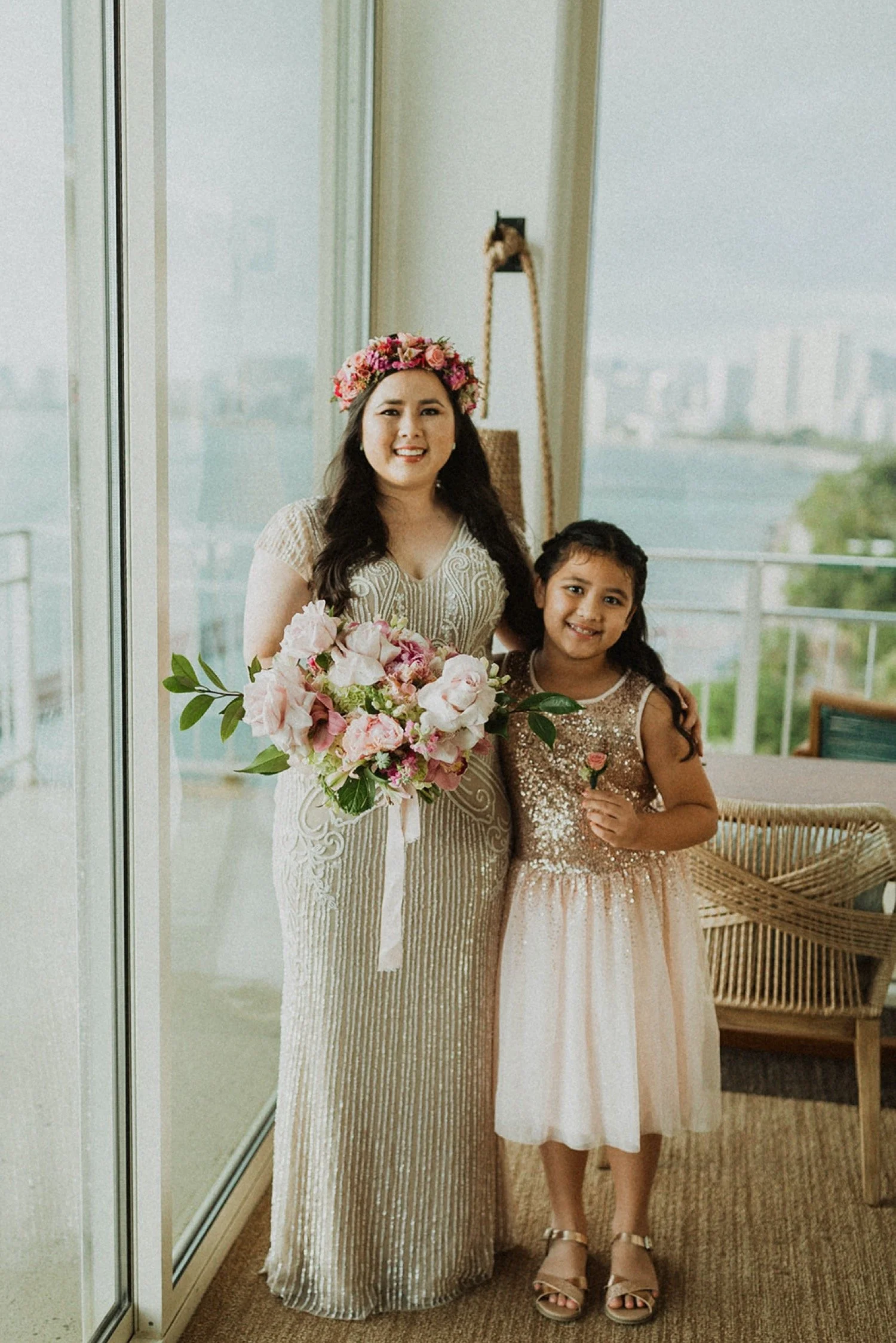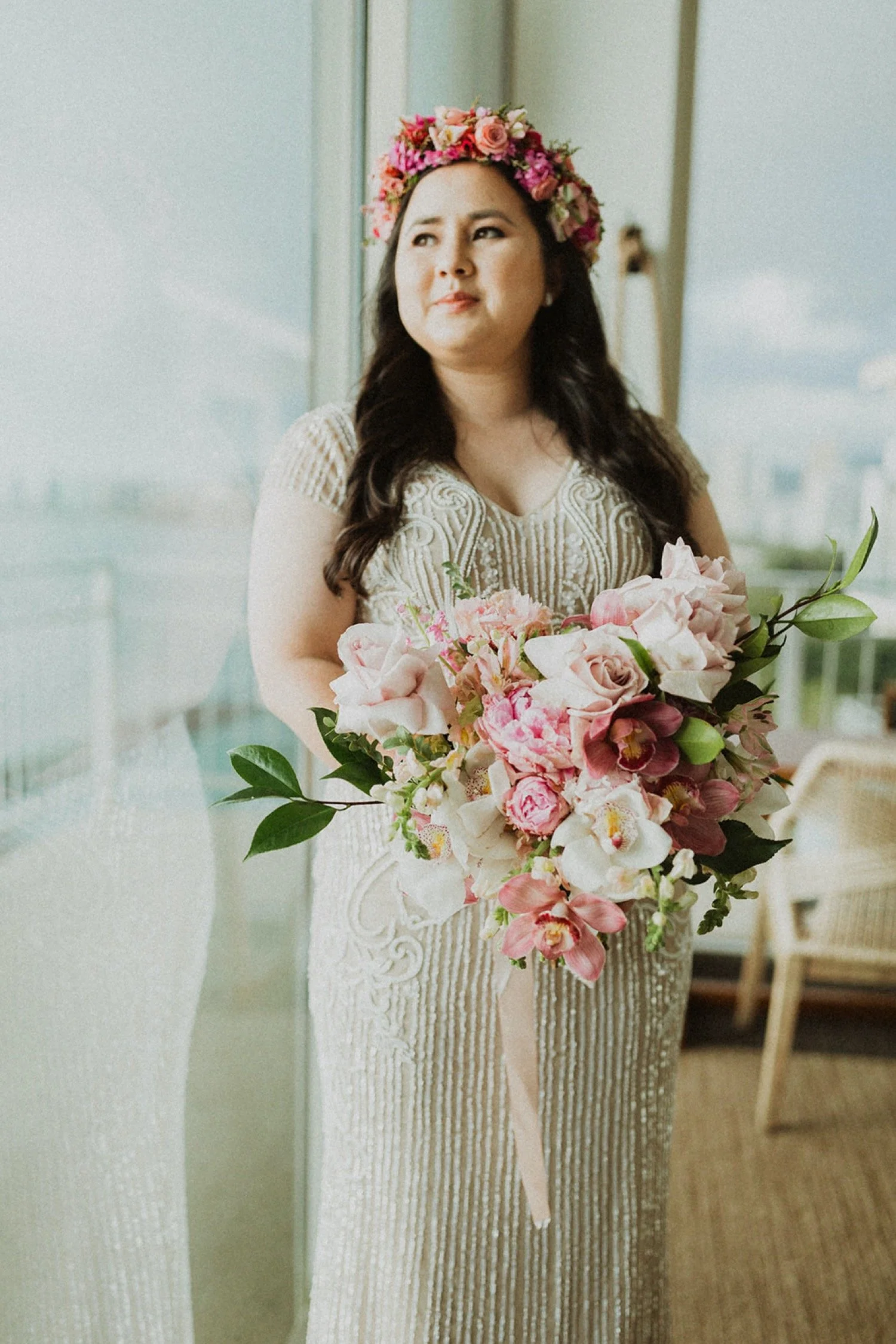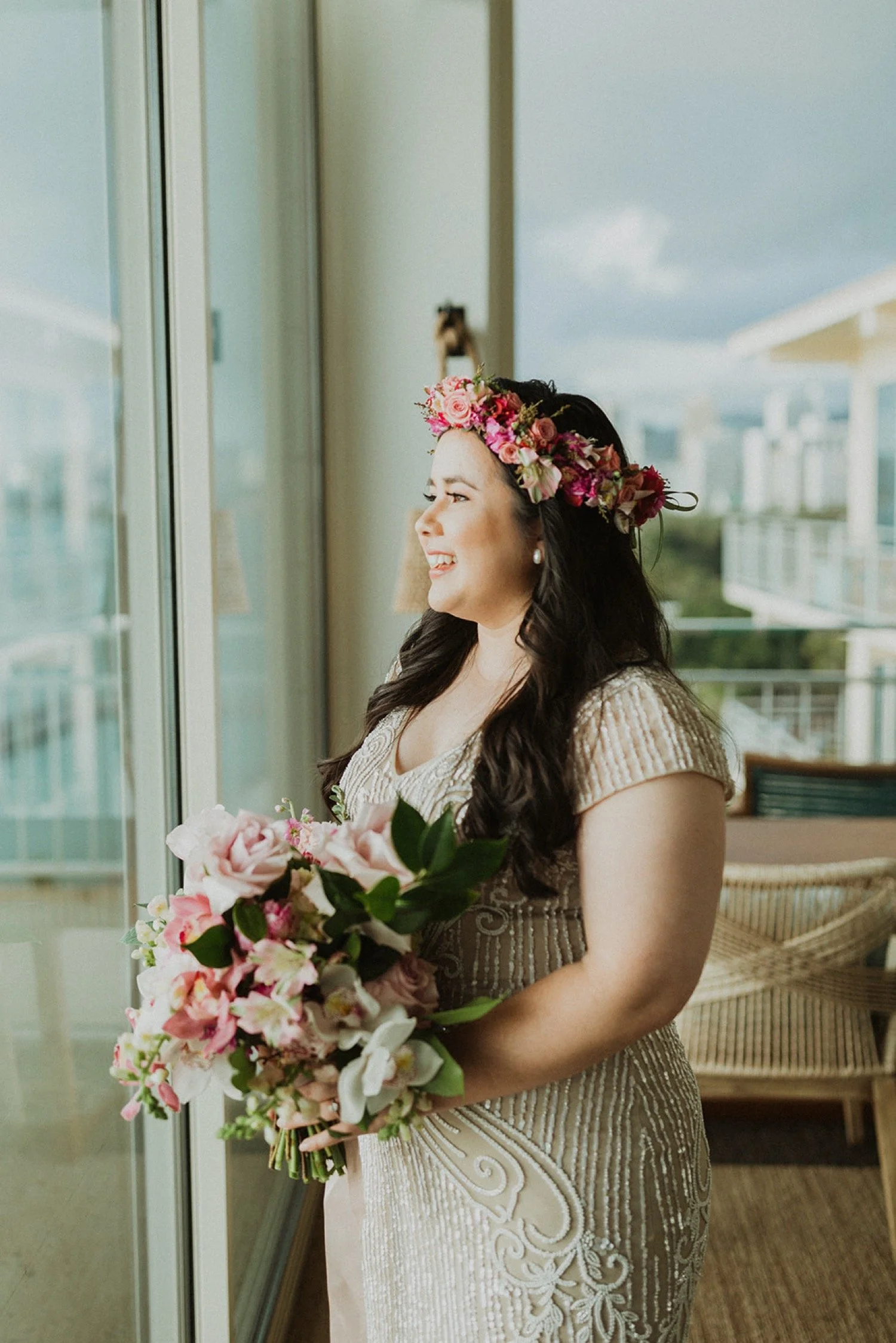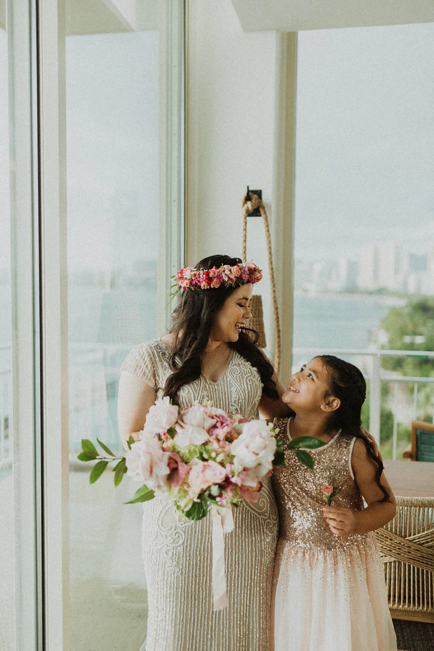 This was my first time ever shooting a hotel room wedding and I loved it so much! Kaimana Beach hotel was the most GORGEOUS place to hold this elopement! This is a brand new renovated hotel on the edge of Waikiki. The suite that Keron and Emily got married in was just stunning. The balcony and large windows had views of Waikiki Beach and the iconic Diamond Head. I was so obsessed with this hotel, and there were so many little spots that were perfect for photos! Every single detail at this hotel room was throughout perfectly and gave that Hawaii tropical vibe. The modern tropical details and decor, the gallery wall, and the palm leaf wallpaper made this hotel so much fun to shoot at and the perfect place for an Intimate Hotel room wedding.