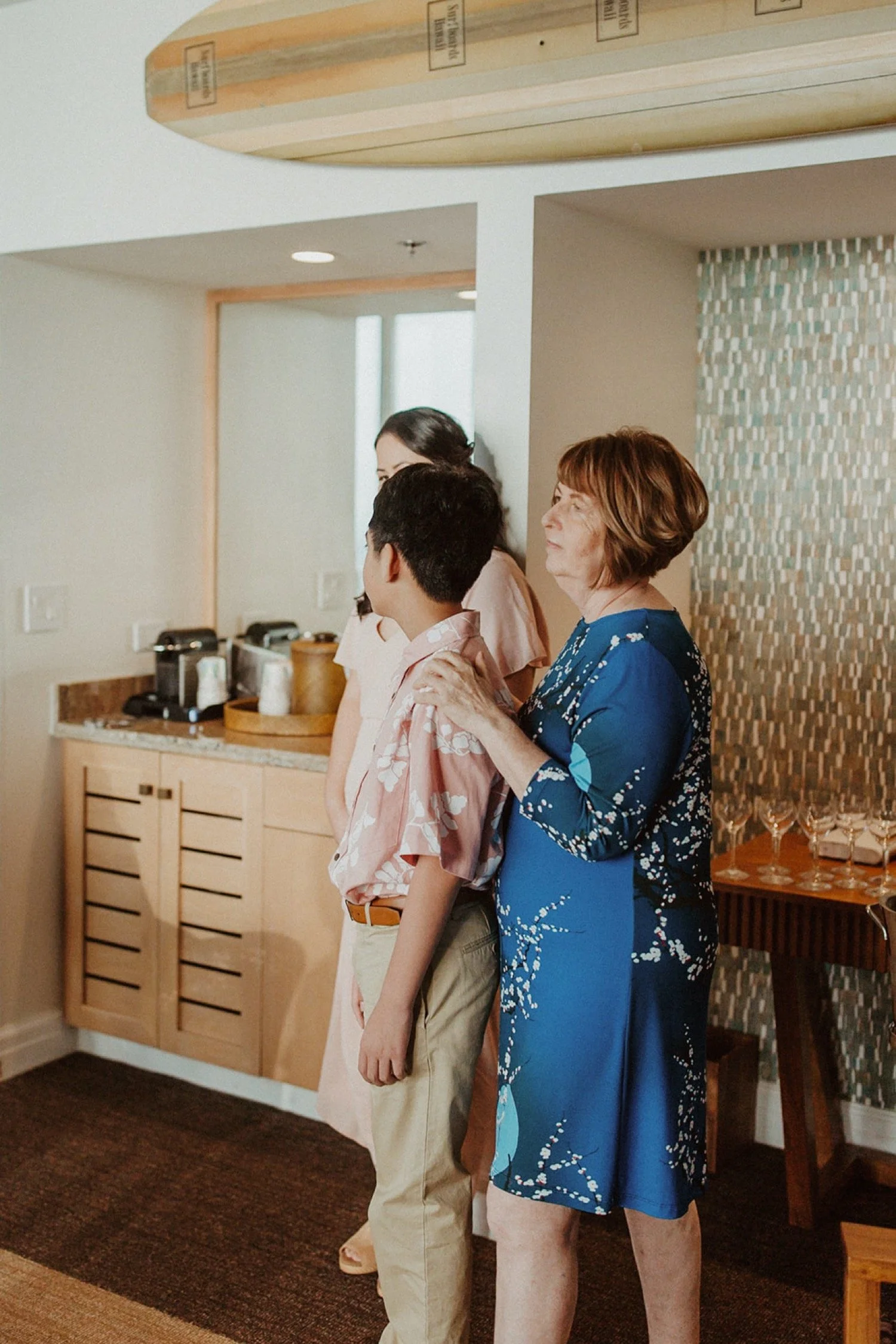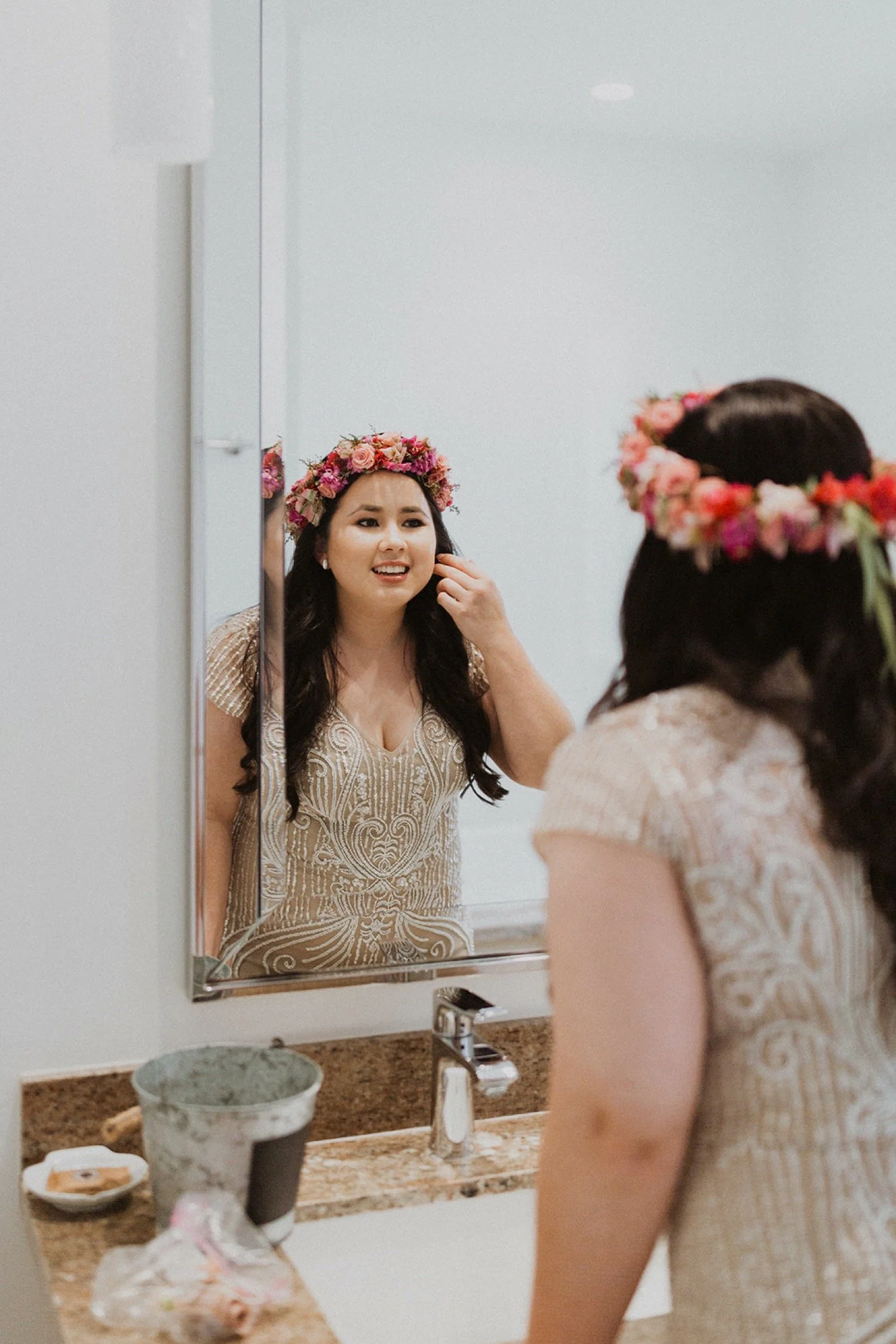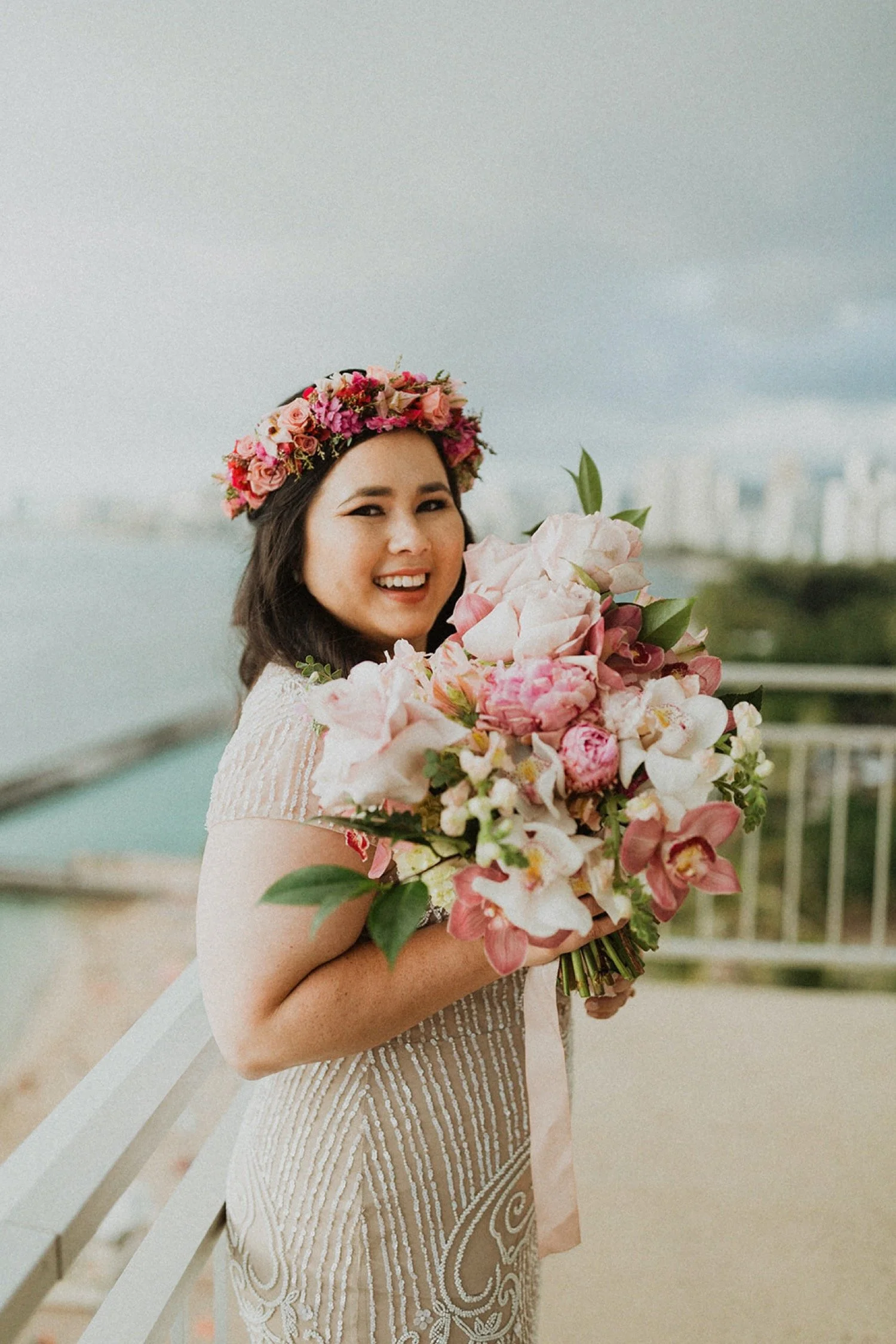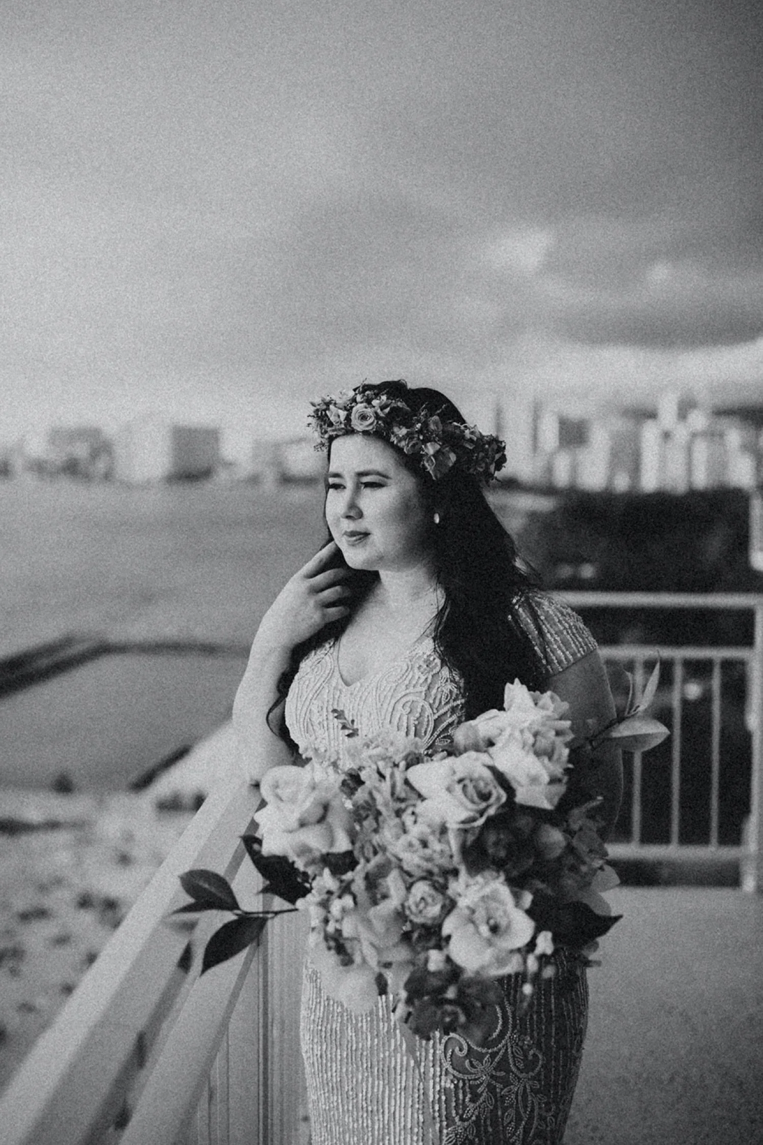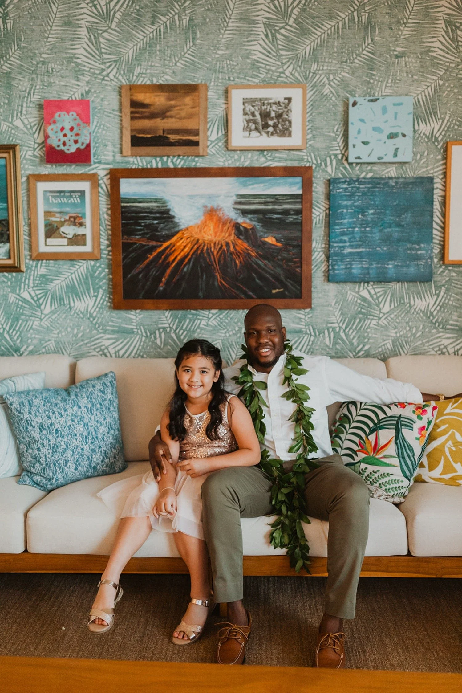 This was my first time ever shooting a hotel room wedding and I loved it so much! Kaimana Beach hotel was the most GORGEOUS place to hold this elopement! This is a brand new renovated hotel on the edge of Waikiki. The suite that Keron and Emily got married in was just stunning. The balcony and large windows had views of Waikiki Beach and the iconic Diamond Head. I was so obsessed with this hotel, and there were so many little spots that were perfect for photos! Every single detail at this hotel room was throughout perfectly and gave that Hawaii tropical vibe. The modern tropical details and decor, the gallery wall, and the palm leaf wallpaper made this hotel so much fun to shoot at and the perfect place for an Intimate Hotel room wedding.