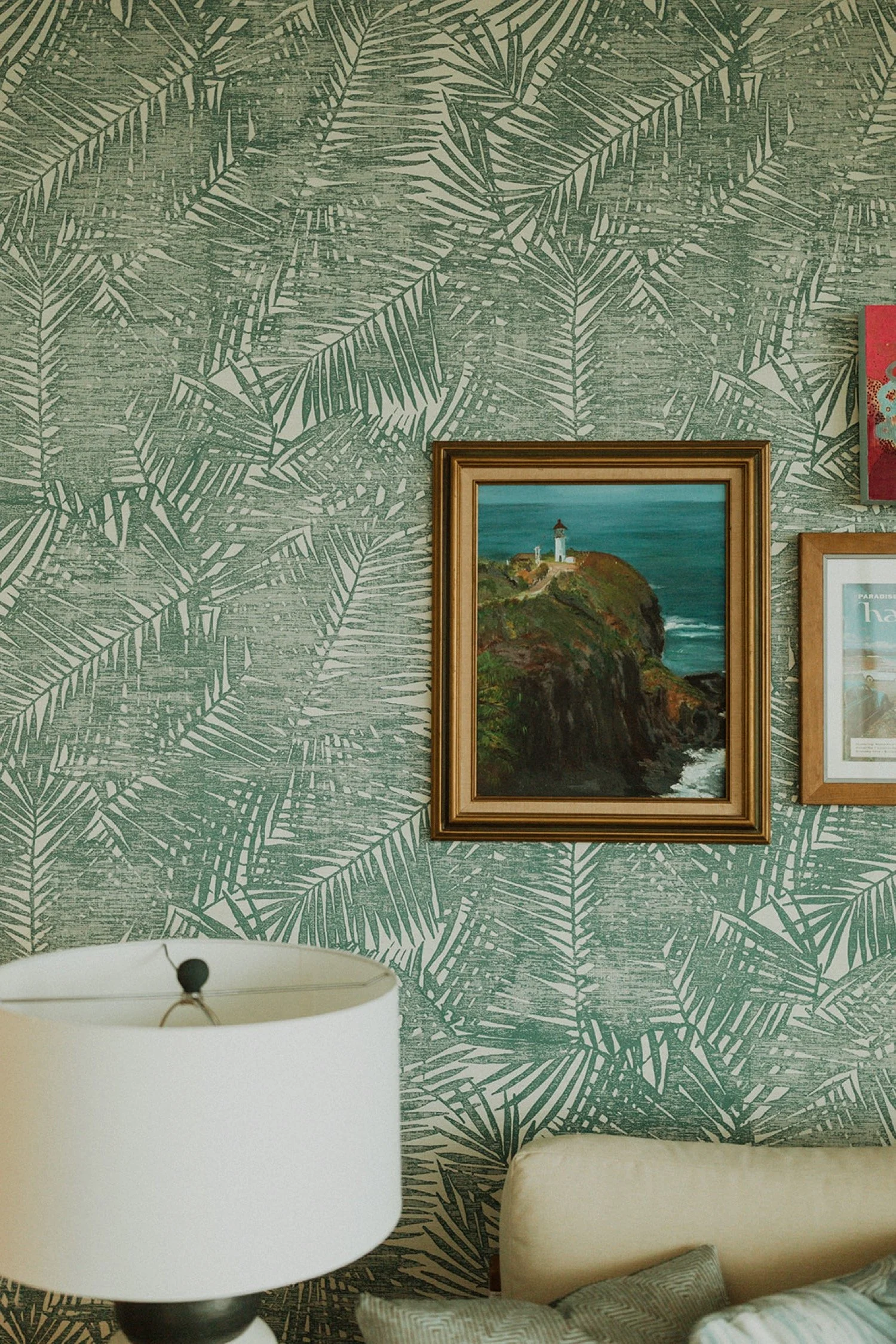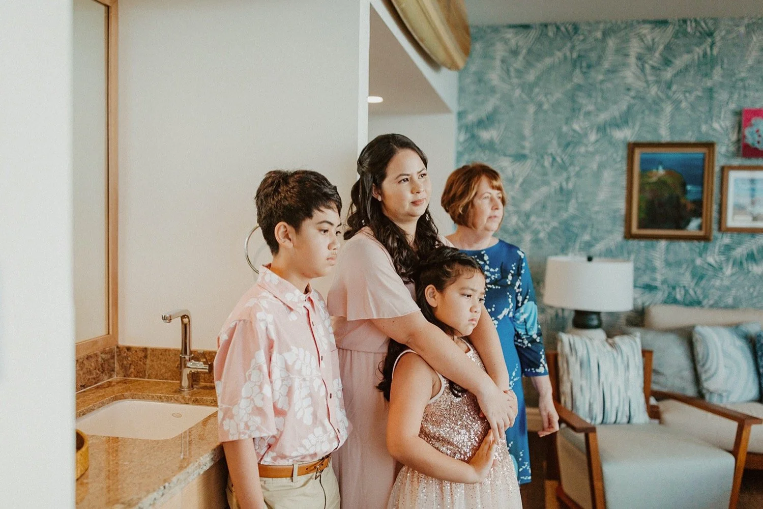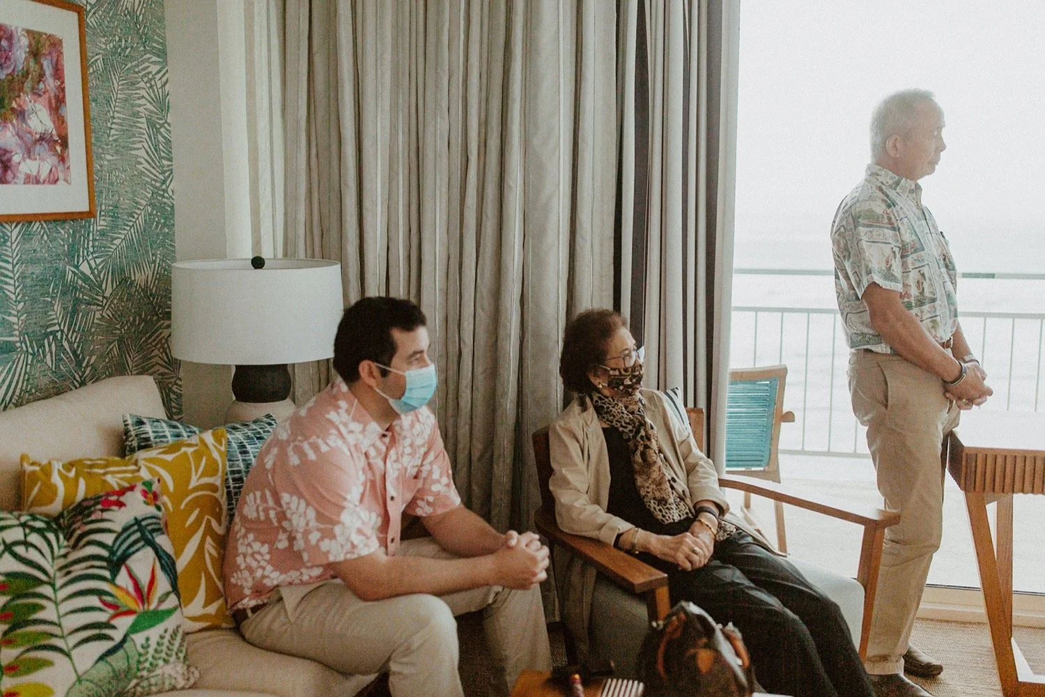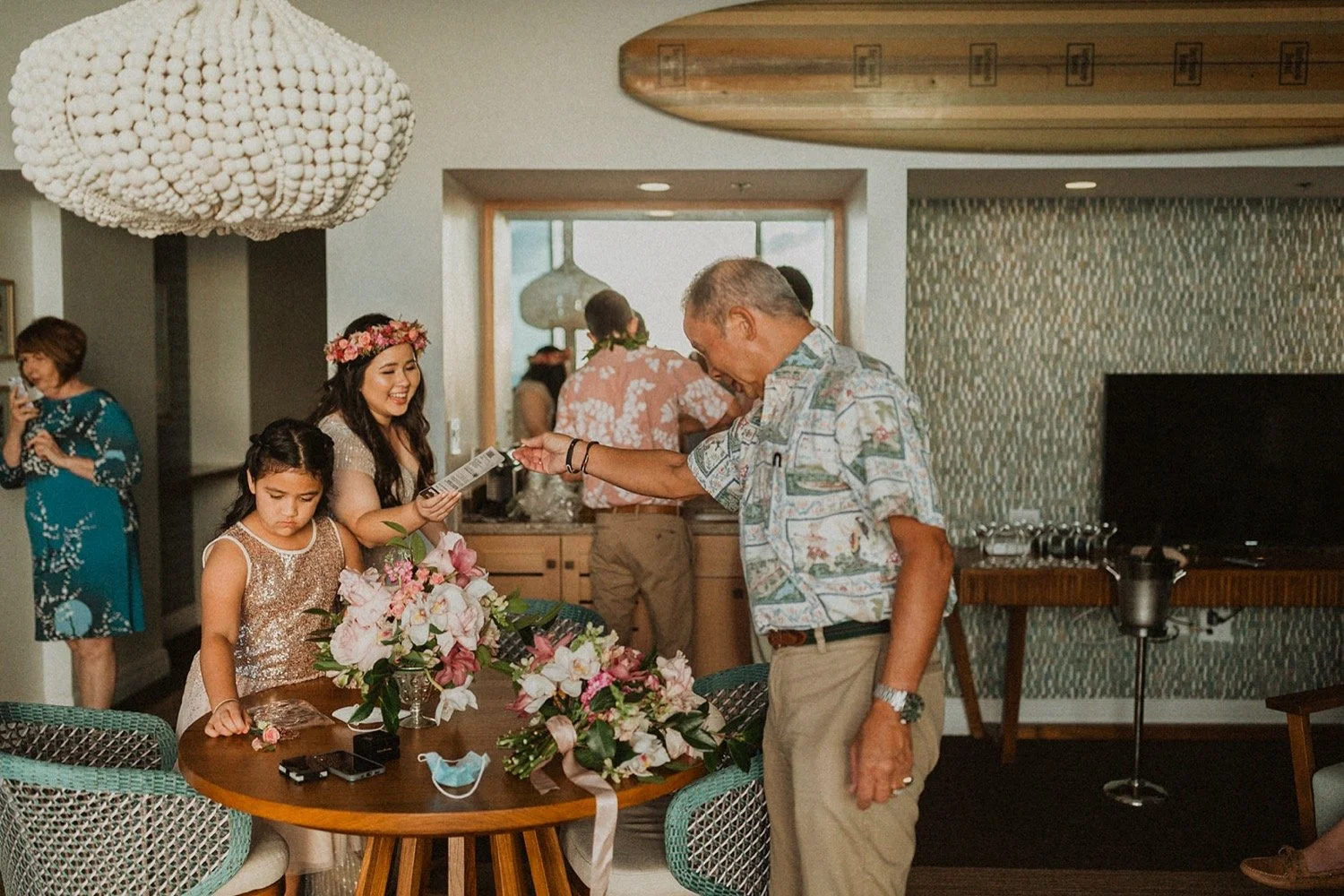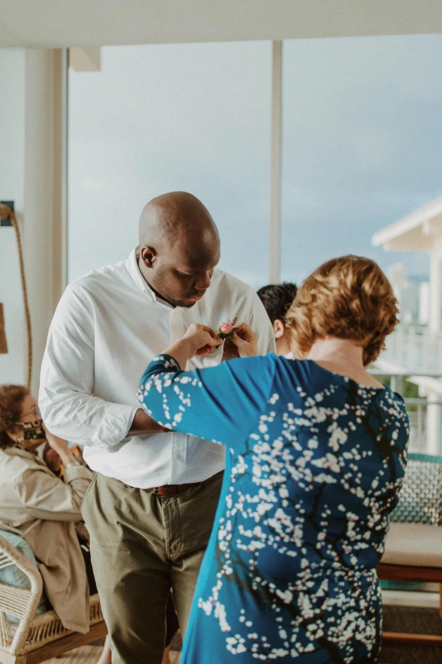 This was my first time ever shooting a hotel room wedding and I loved it so much! Kaimana Beach hotel was the most GORGEOUS place to hold this elopement! This is a brand new renovated hotel on the edge of Waikiki. The suite that Keron and Emily got married in was just stunning. The balcony and large windows had views of Waikiki Beach and the iconic Diamond Head. I was so obsessed with this hotel, and there were so many little spots that were perfect for photos! Every single detail at this hotel room was throughout perfectly and gave that Hawaii tropical vibe. The modern tropical details and decor, the gallery wall, and the palm leaf wallpaper made this hotel so much fun to shoot at and the perfect place for an Intimate Hotel room wedding.
