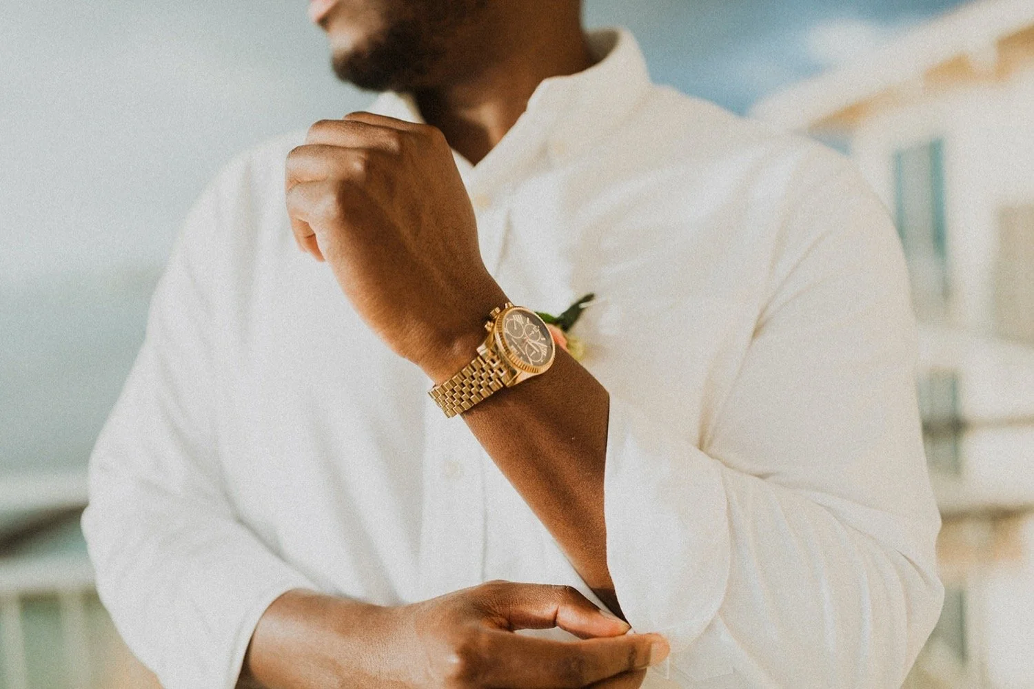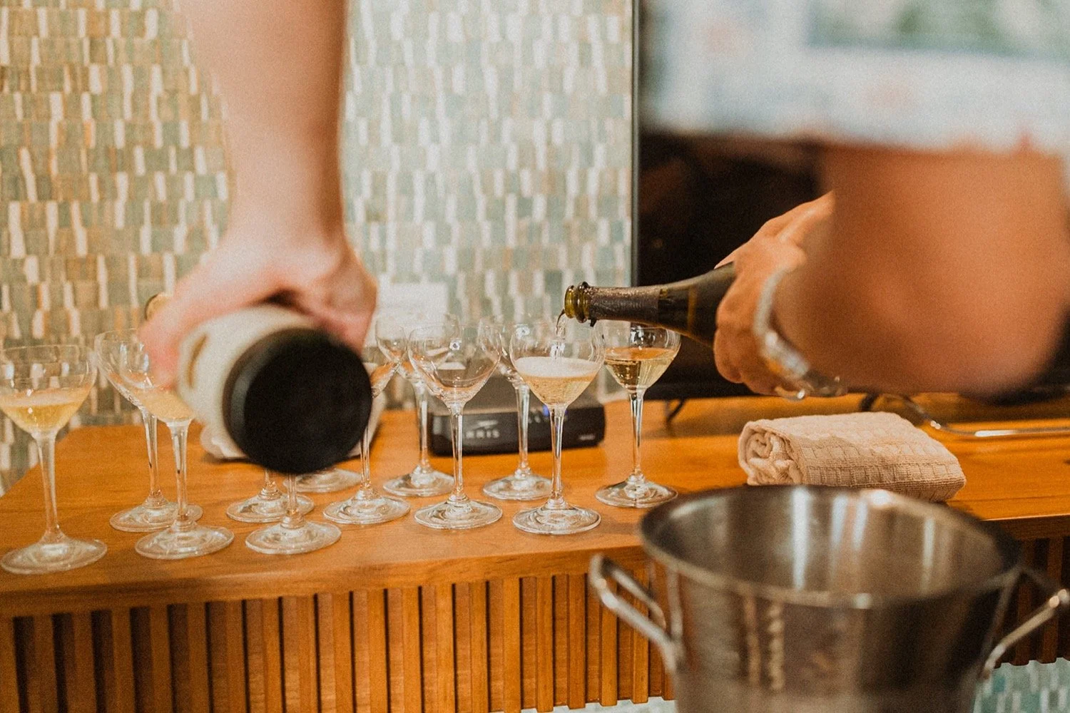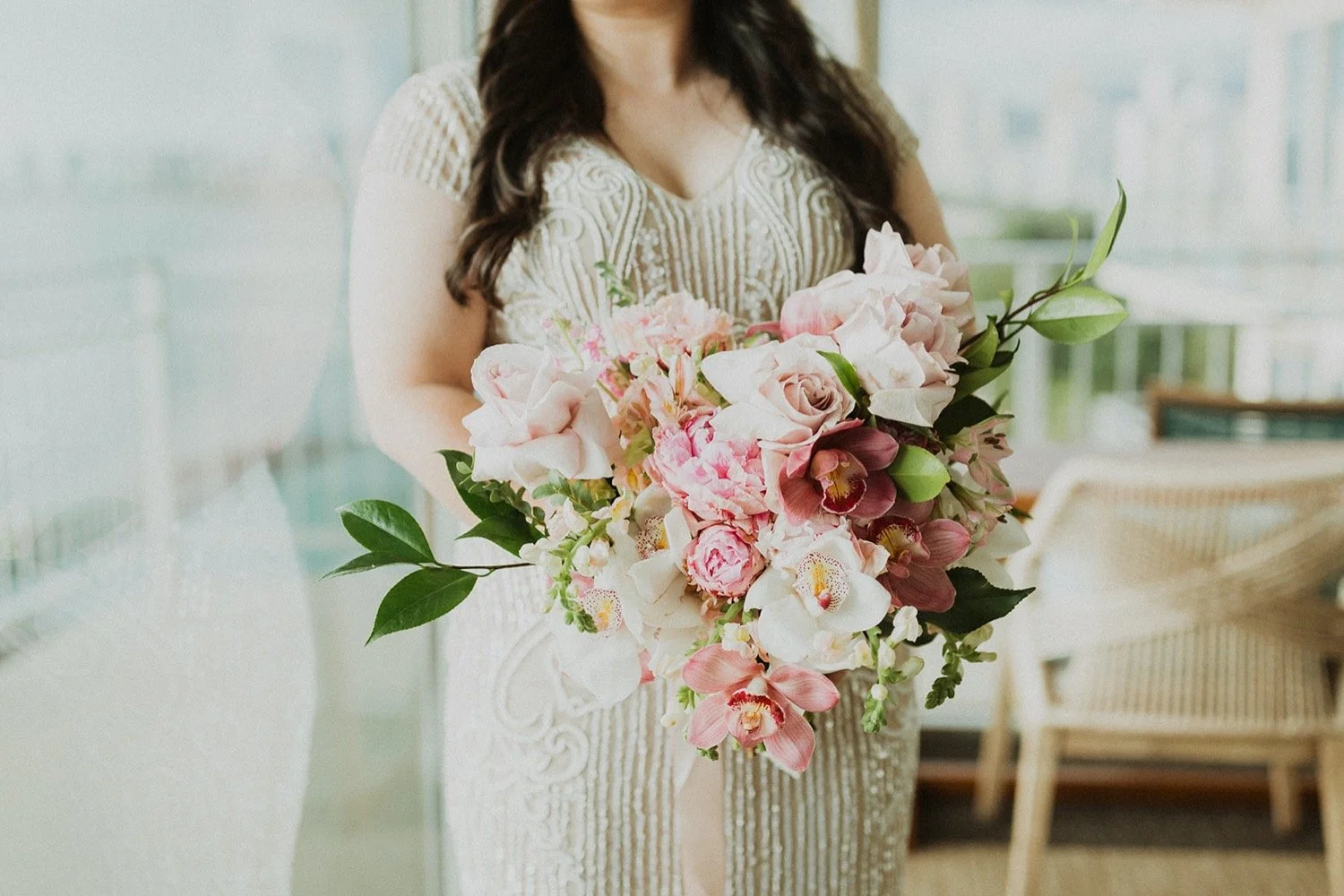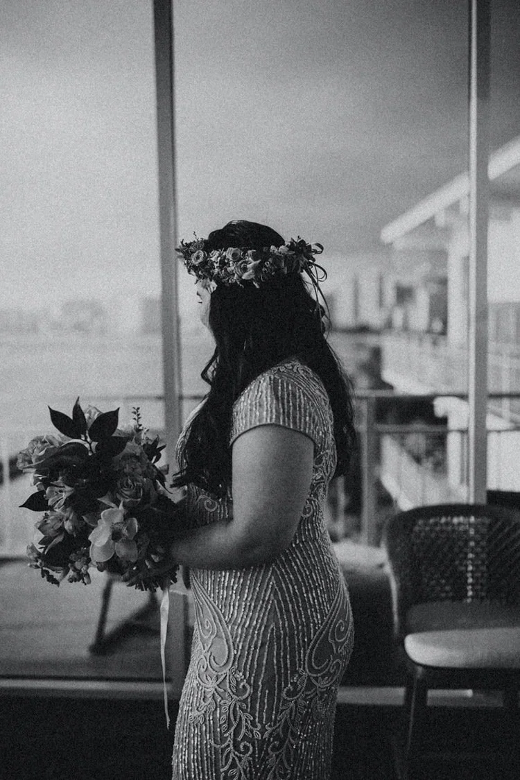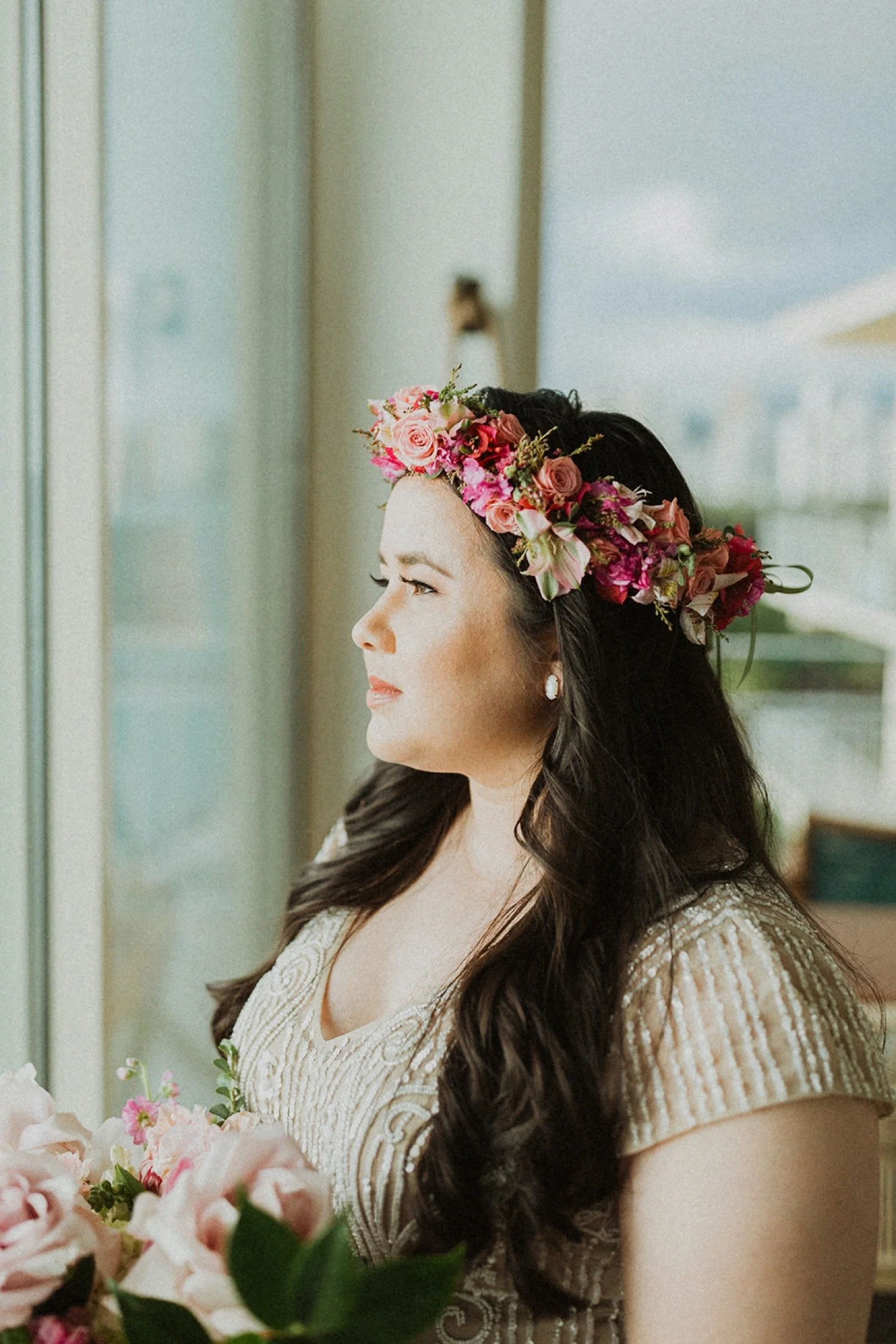 This was my first time ever shooting a hotel room wedding and I loved it so much! Kaimana Beach hotel was the most GORGEOUS place to hold this elopement! This is a brand new renovated hotel on the edge of Waikiki. The suite that Keron and Emily got married in was just stunning. The balcony and large windows had views of Waikiki Beach and the iconic Diamond Head. I was so obsessed with this hotel, and there were so many little spots that were perfect for photos! Every single detail at this hotel room was throughout perfectly and gave that Hawaii tropical vibe. The modern tropical details and decor, the gallery wall, and the palm leaf wallpaper made this hotel so much fun to shoot at and the perfect place for an Intimate Hotel room wedding.